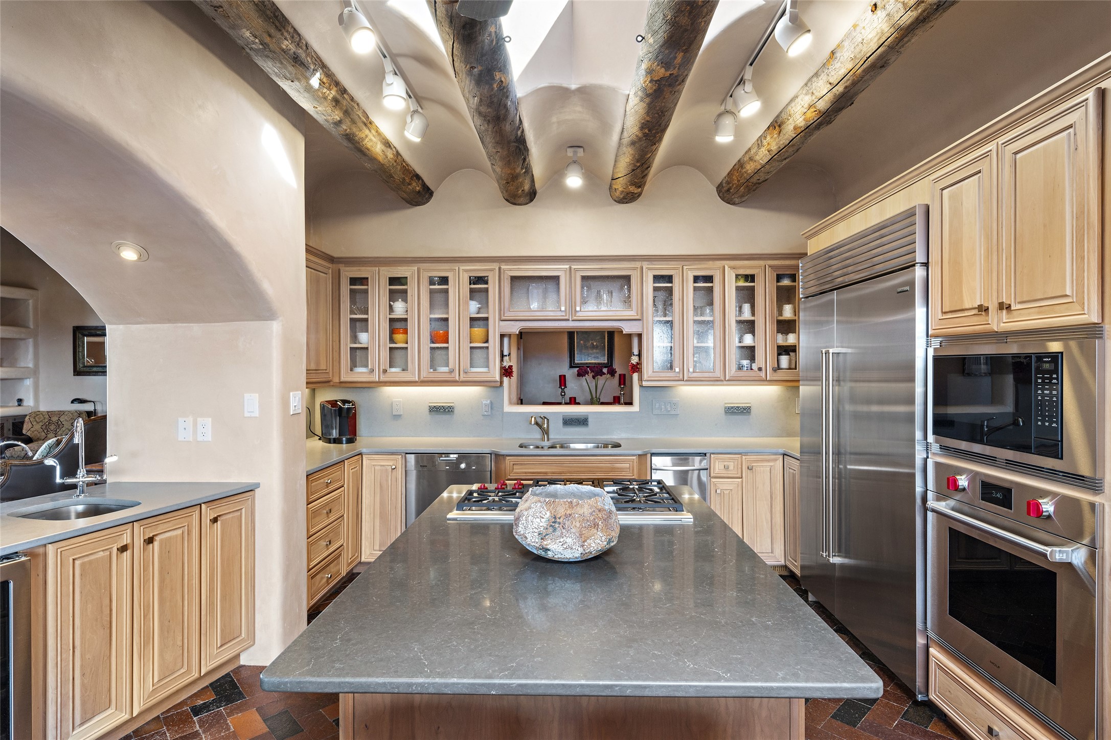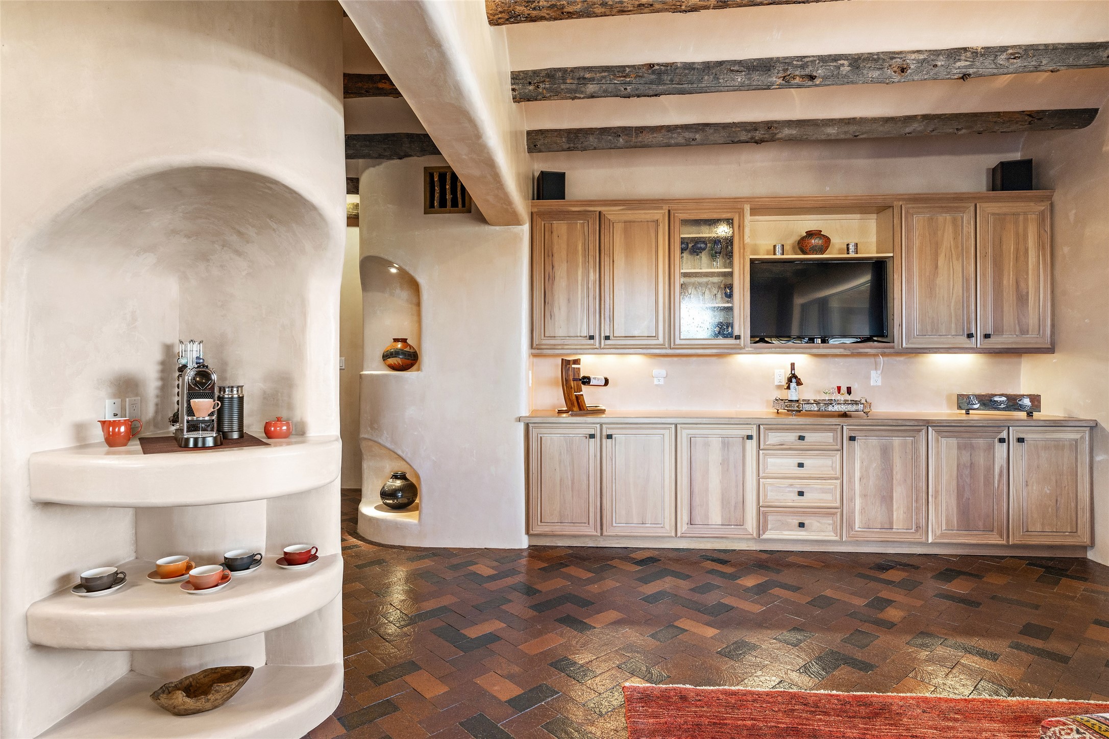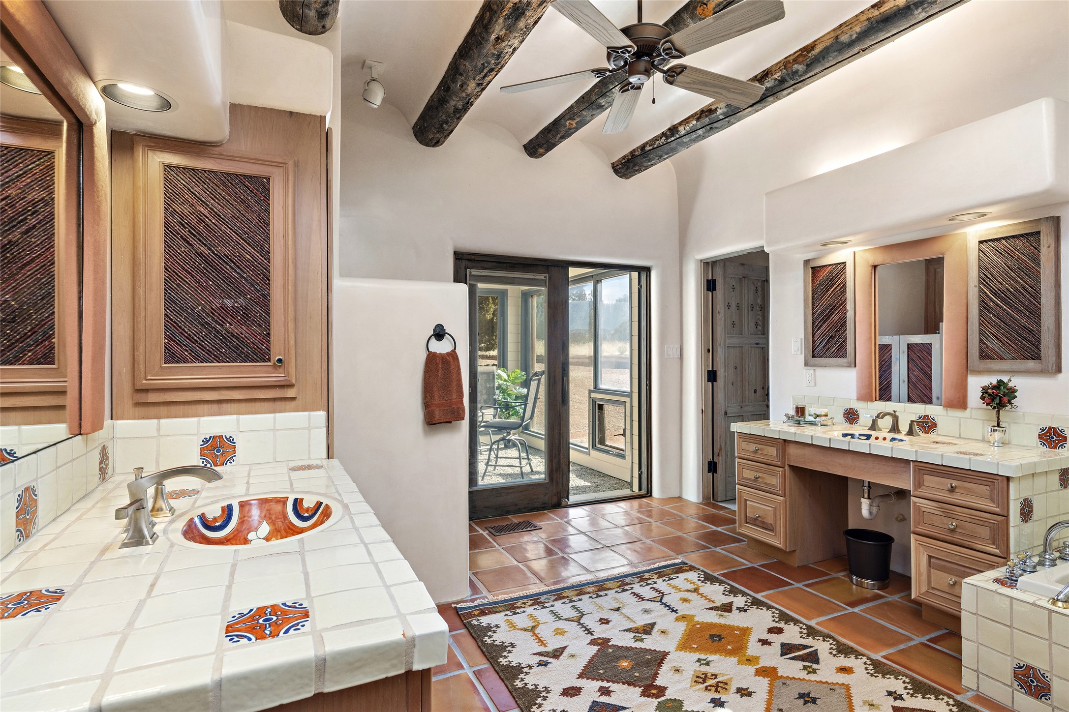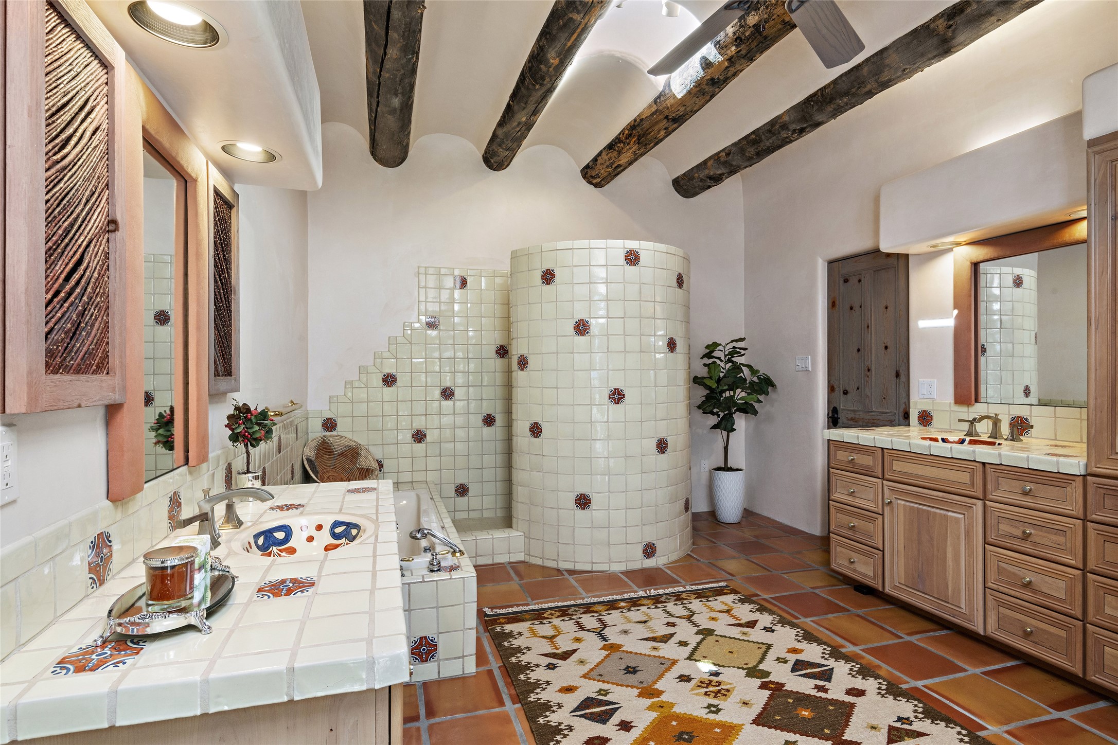This Las Campanas Estates III property is not only located directly across from the lake and 3rd and 4th fairway of the Sunrise Golf Course but is situated to enjoy spectacular views of the Sangre de Cristo and Jemez Mountains. A 2-acre parcel allows for both privacy and plenty of green space around the 4,436 sq. ft. floor plan. Pumice Crete construction allows for massively thick walls and brings a stateliness to the overall design concept. 18 ft. diamond plaster walls support sweeping archways at the threshold of entries to the various living areas. Massive vigas form intervals between the variations in ceiling design used throughout the home - including latillas, coves and wood planks. Master tri-color brickwork inlaid in a herringbone pattern is one of several customizations influenced by regional architecture. Others include built-in Sombraje cabinetry, kiva fireplaces, and nicho-styled ledges and shelving. Numerous skylights, extra-large windows and glass-paneled doors facilitate the maximum absorption of the brilliant New Mexico light and the area's superb views. Recent upgrades include the installation of high-speed broadband cable, Smart home and Nexia remote-controlled features, a new roof with a 12 yr. warranty, new UV glass skylights, new Stucco work, a new aluminum and glass paneled garage door, recent high end appliances and extensive landscaping. Truly a showcase home offering comfort and luxury in a highly desirable and secure community.