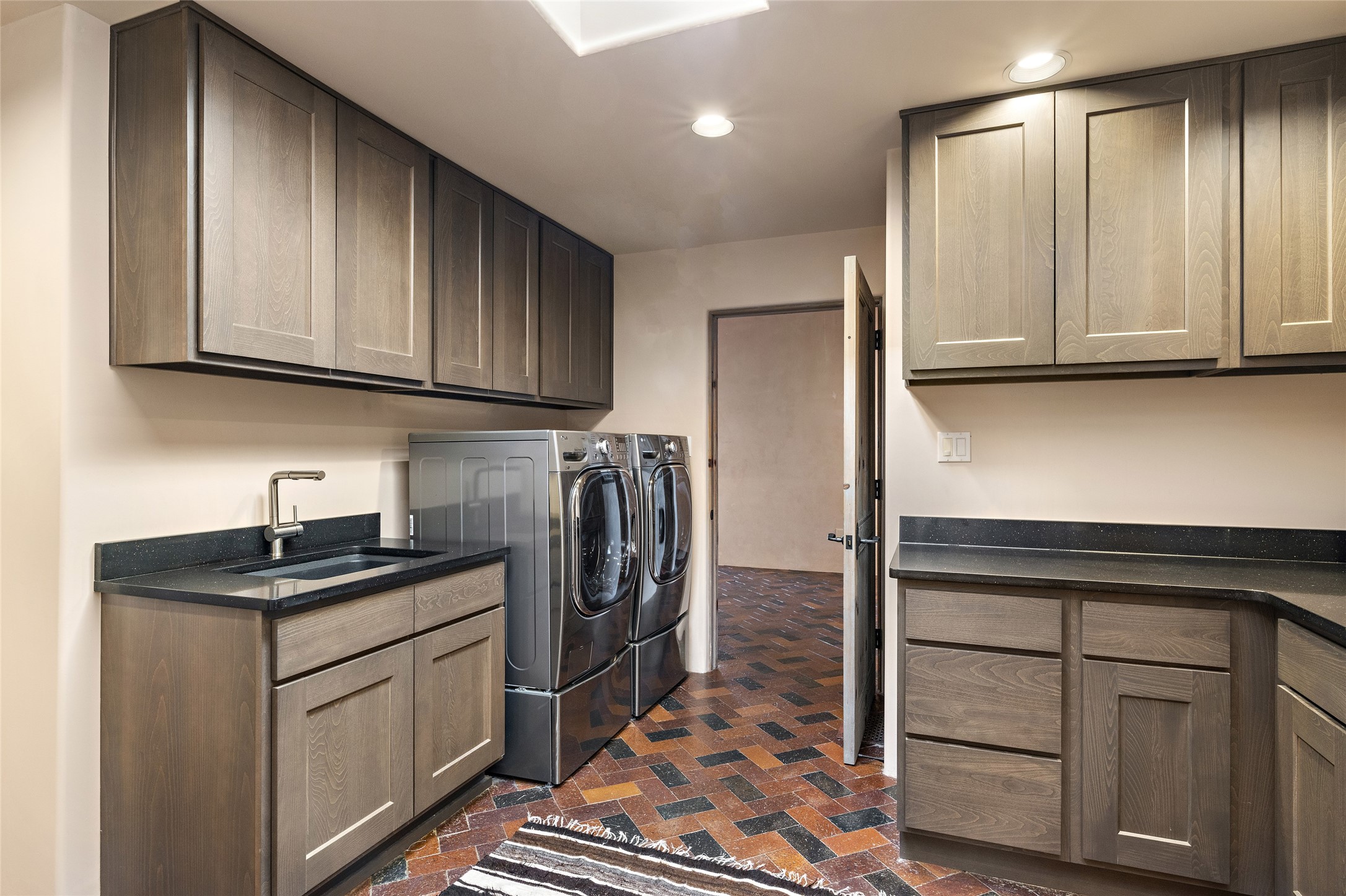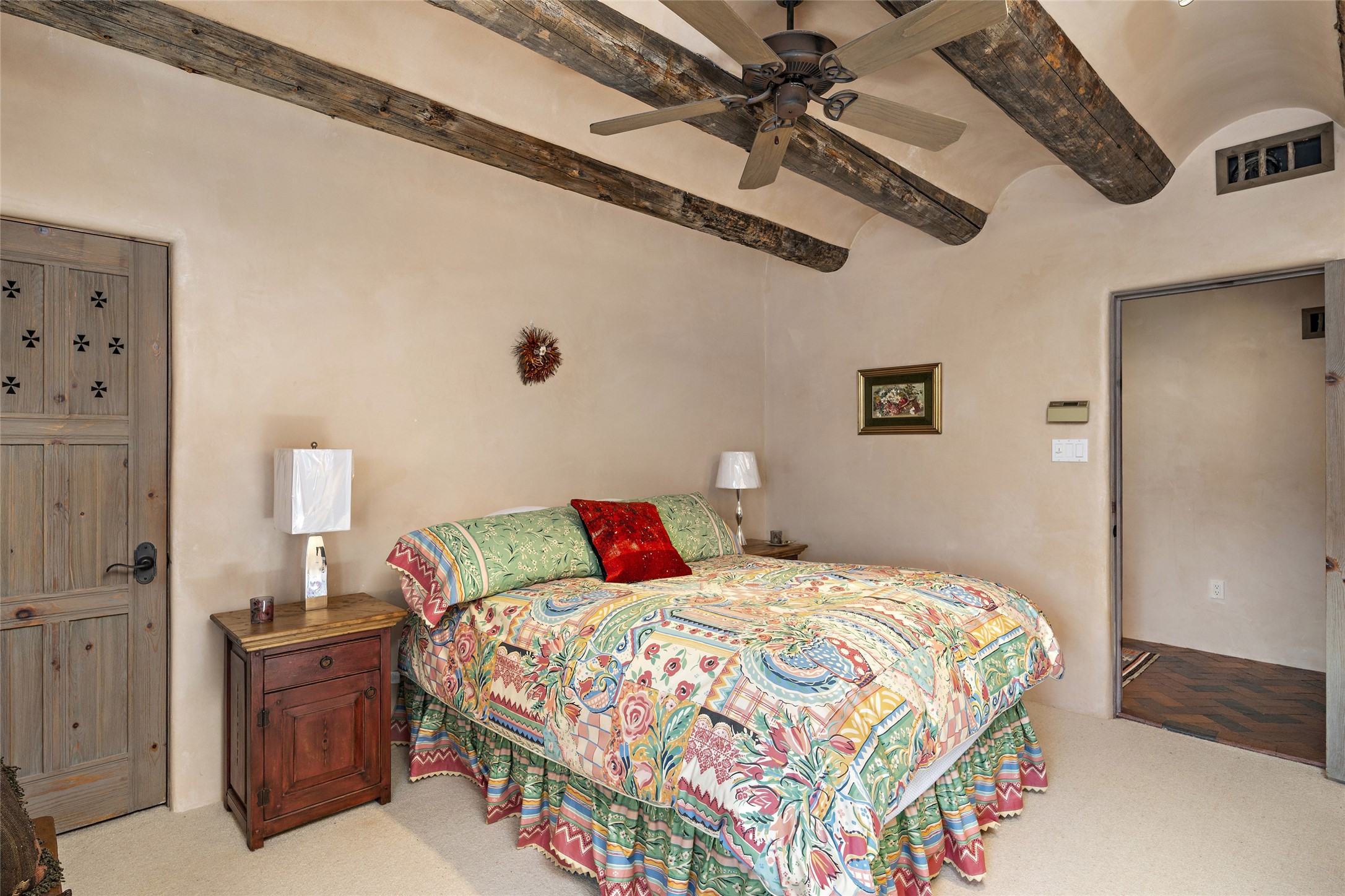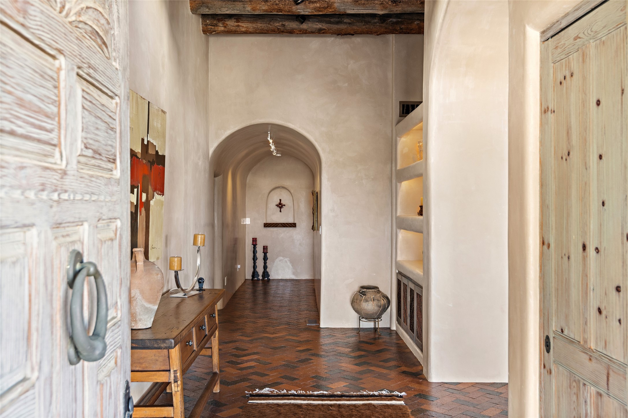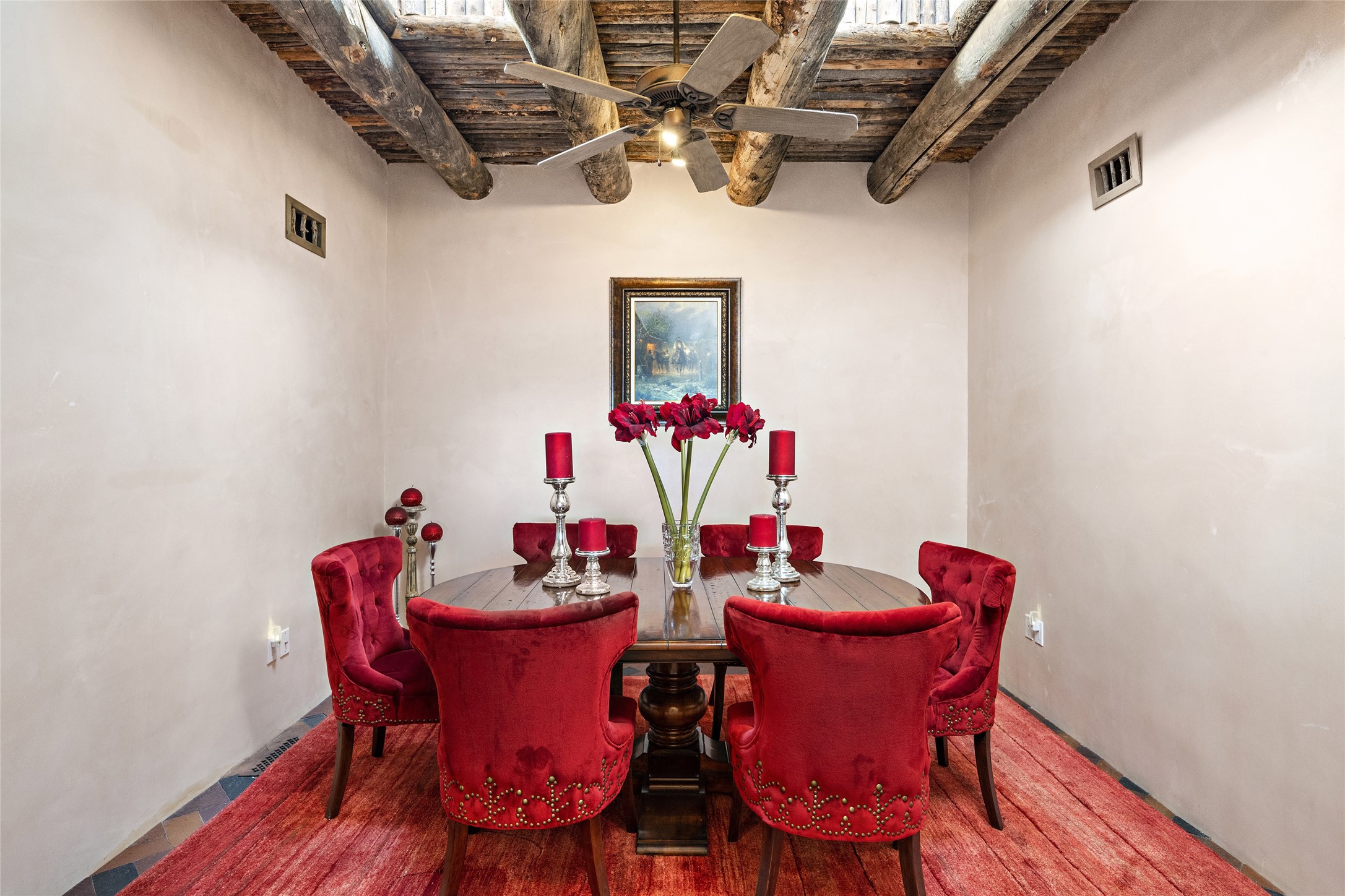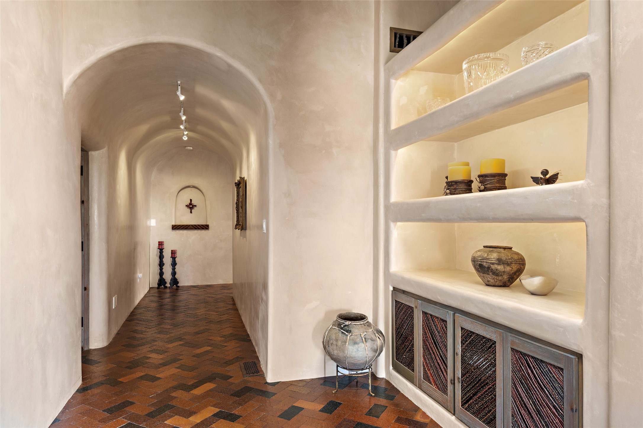 This Las Campanas Estates III property is not only located directly across from the lake and 3rd and 4th fairway of the Sunrise Golf Course but is situated to enjoy spectacular views of the Sangre de Cristo and Jemez Mountains. A 2-acre parcel allows for both privacy and plenty of green space around the 4,436 sq. ft. floor plan. Pumice Crete construction allows for massively thick walls and brings a stateliness to the overall design concept. 18 ft. diamond plaster walls support sweeping archways at the threshold of entries to the various living areas. Massive vigas form intervals between the variations in ceiling design used throughout the home - including latillas, coves and wood planks. Master tri-color brickwork inlaid in a herringbone pattern is one of several customizations influenced by regional architecture. Others include built-in Sombraje cabinetry, kiva fireplaces, and nicho-styled ledges and shelving. Numerous skylights, extra-large windows and glass-paneled doors facilitate the maximum absorption of the brilliant New Mexico light and the area's superb views. Recent upgrades include the installation of high-speed broadband cable, Smart home and Nexia remote-controlled features, a new roof with a 12 yr. warranty, new UV glass skylights, new Stucco work, a new aluminum and glass paneled garage door, recent high end appliances and extensive landscaping. Truly a showcase home offering comfort and luxury in a highly desirable and secure community.