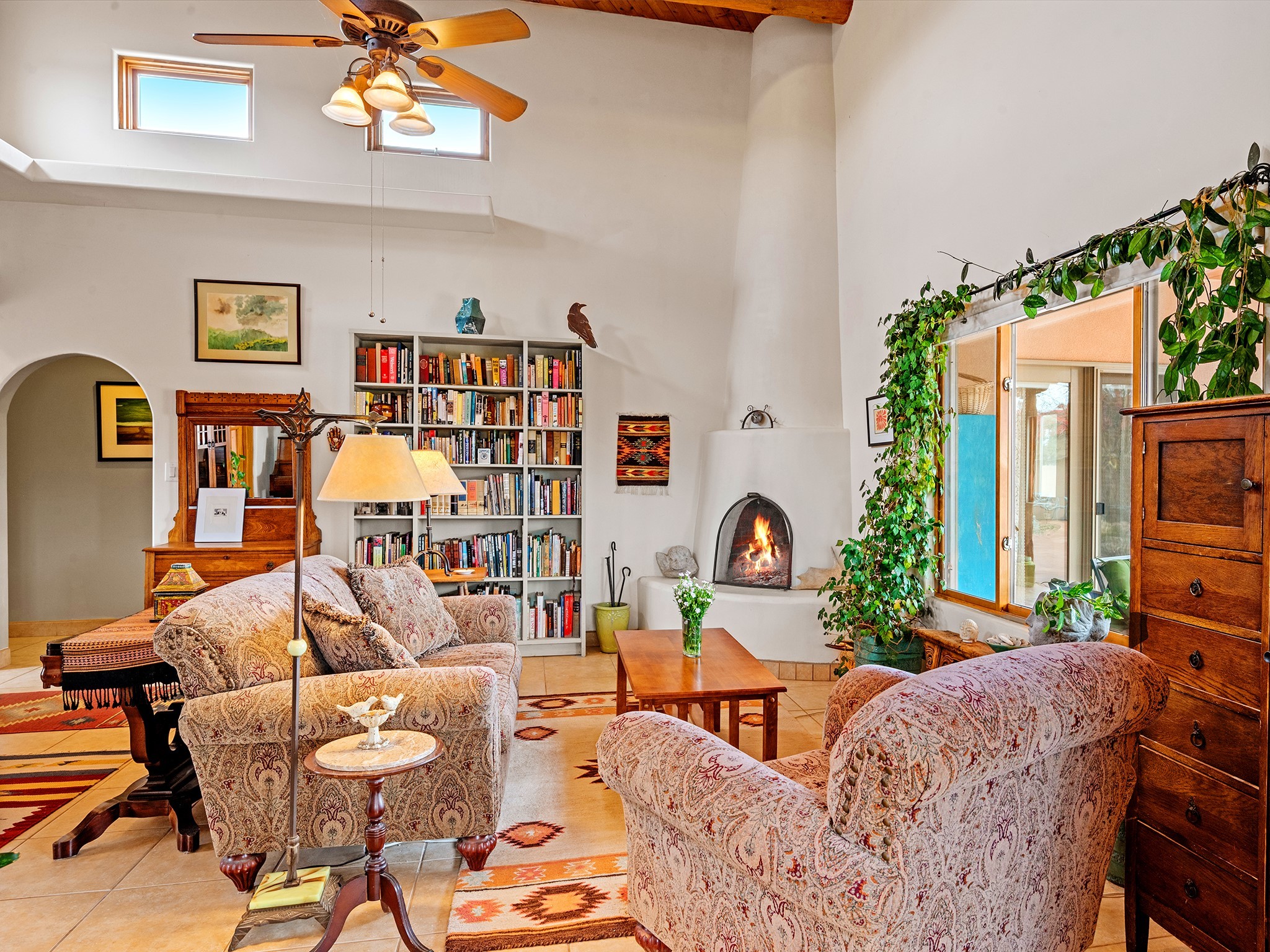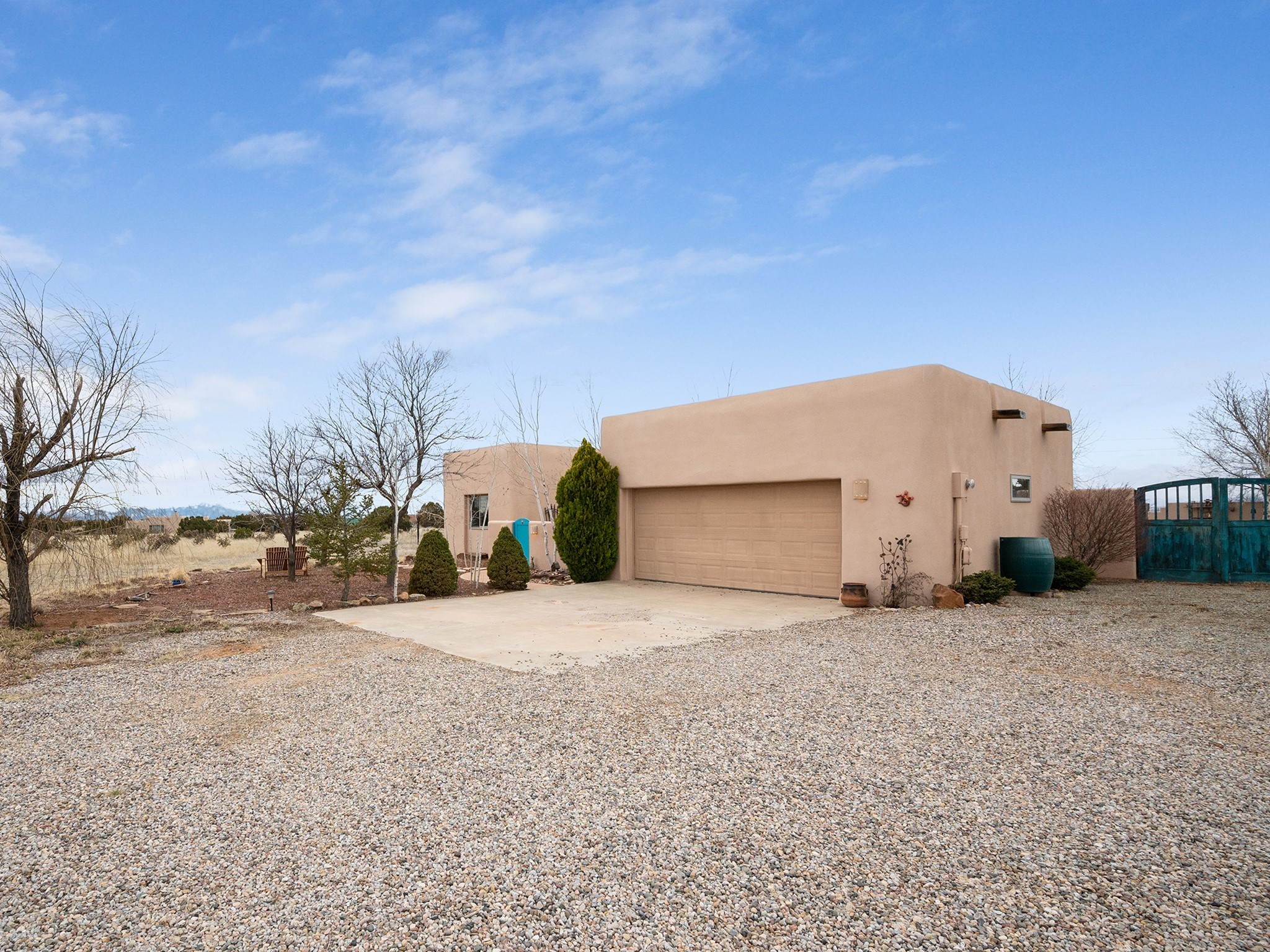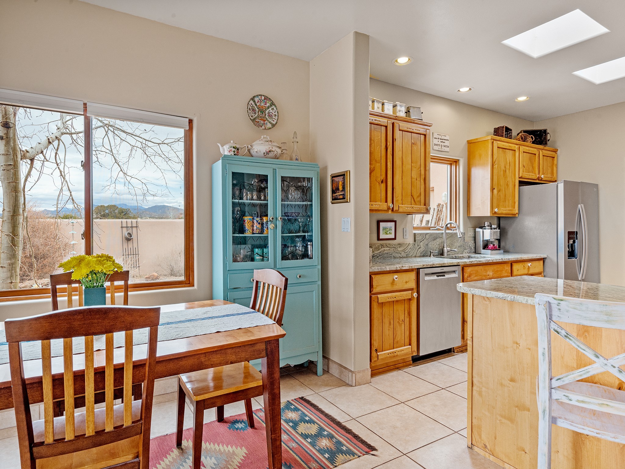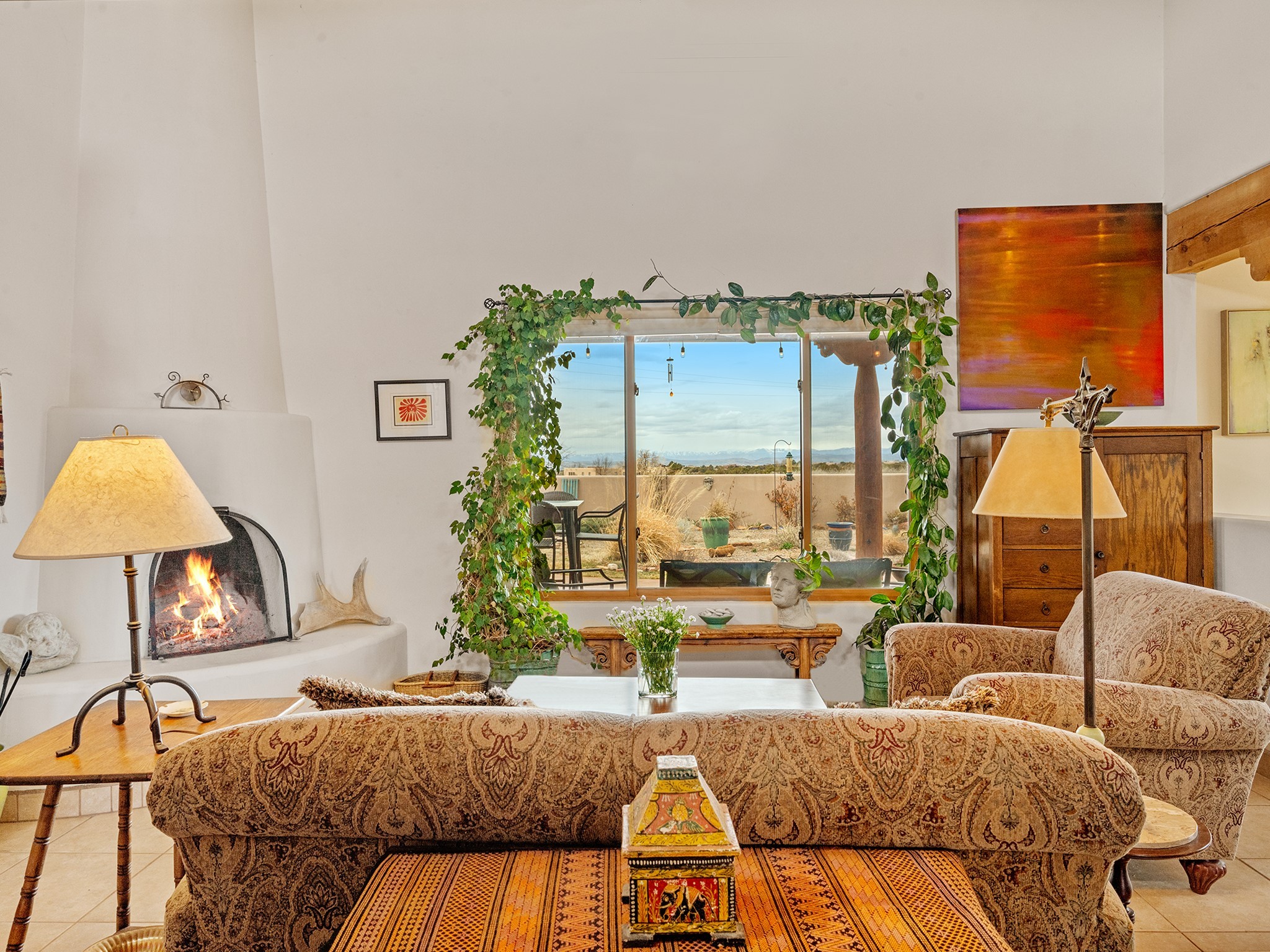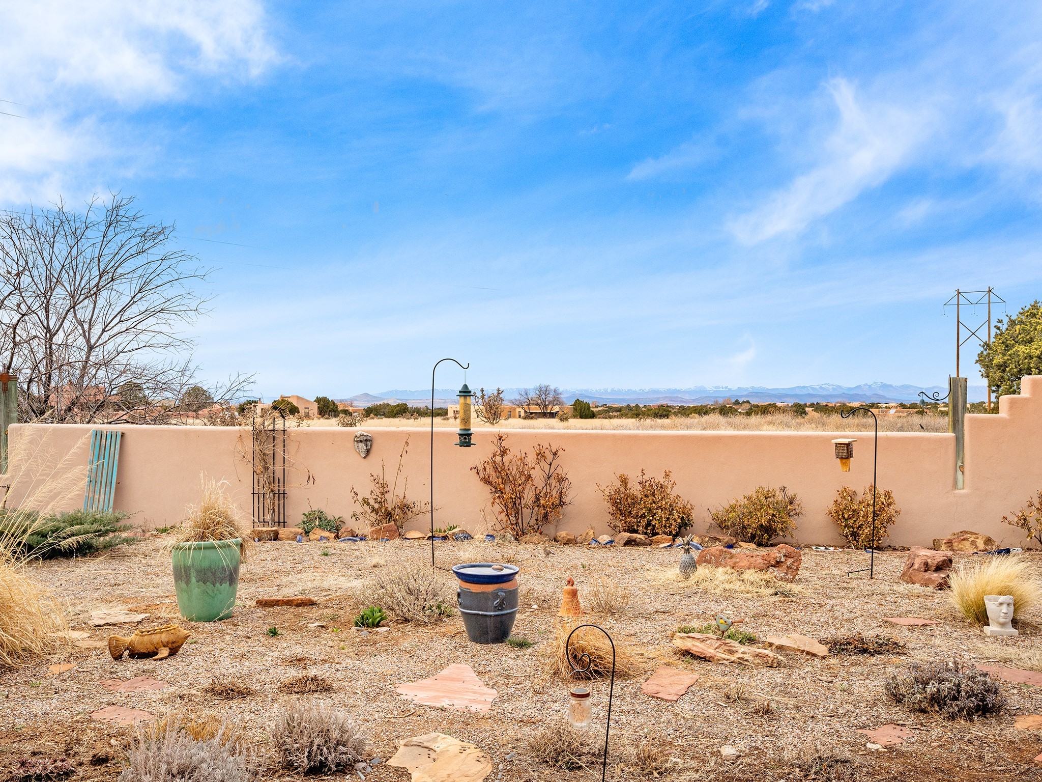 Absolute Eldorado charmer with magnificent mountain views in all directions! This thoughtfully laid out, single level 1800 +/- square feet, 3BD-2BA home is sited perfectly to capture surrounding views of the Jemez, Sandia and Sangre mountain ranges. The living room's high ceilings, sophisticated built-in bookcase, classic vigas, cozy wood burning kiva fireplace, and large picture windows make it the perfect space to soak in long-range views. A set of french doors leads to a very functional media room or office just off the main living space. Connected to the living room is a bright dining area with access to the back portal and yard. The kitchen is full of recent improvements including granite countertops, Blanco sink, newer refrigerator (2021) and dishwasher (2020). All three bedrooms are nicely separated on a long hallway on the opposite side of the living room. The primary suite is spacious and bright, and once again, features spectacular views out all windows and glass doors. Two walk-in closets with built-in shelving connect the primary bedroom to the ensuite bathroom. Down the hall are two nicely sized guest bedrooms and a full bathroom. The backyard is an oasis of its own. Plenty of covered patio space makes for a very comfortable outdoor entertainment, dining and lounging area almost year-round. Gorgeous native plants and bushes fill the walled-in backyard. Spectacular sunsets and beautiful summer blooms await!