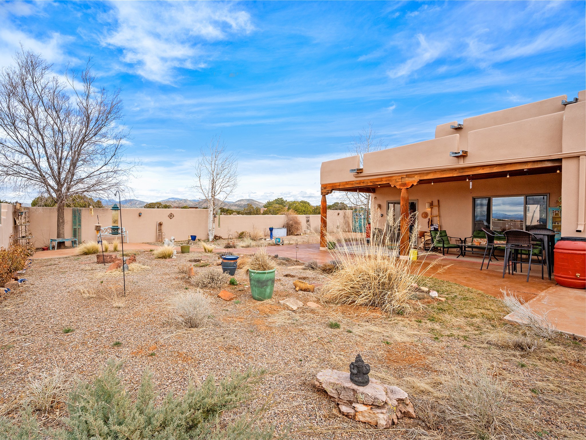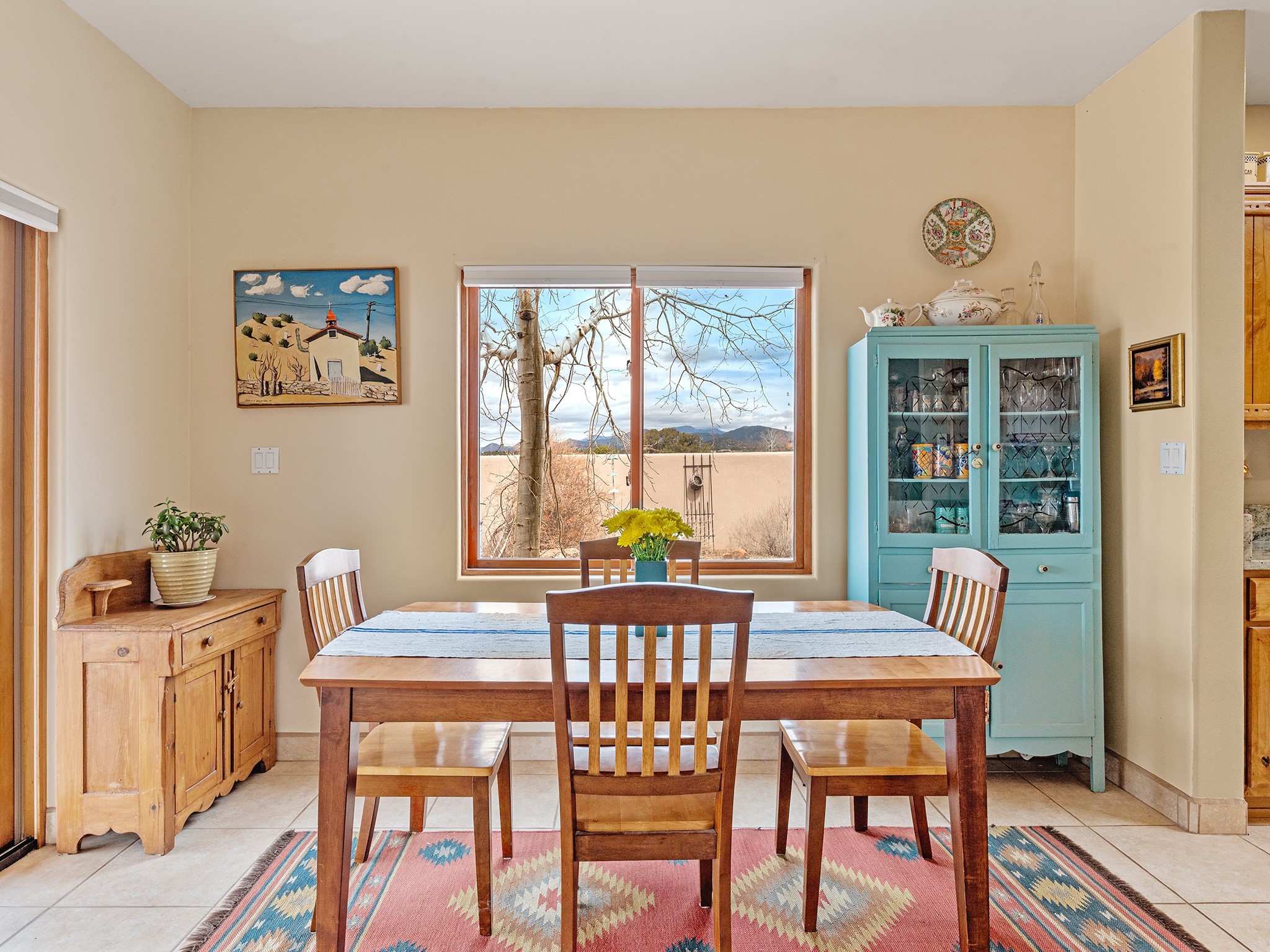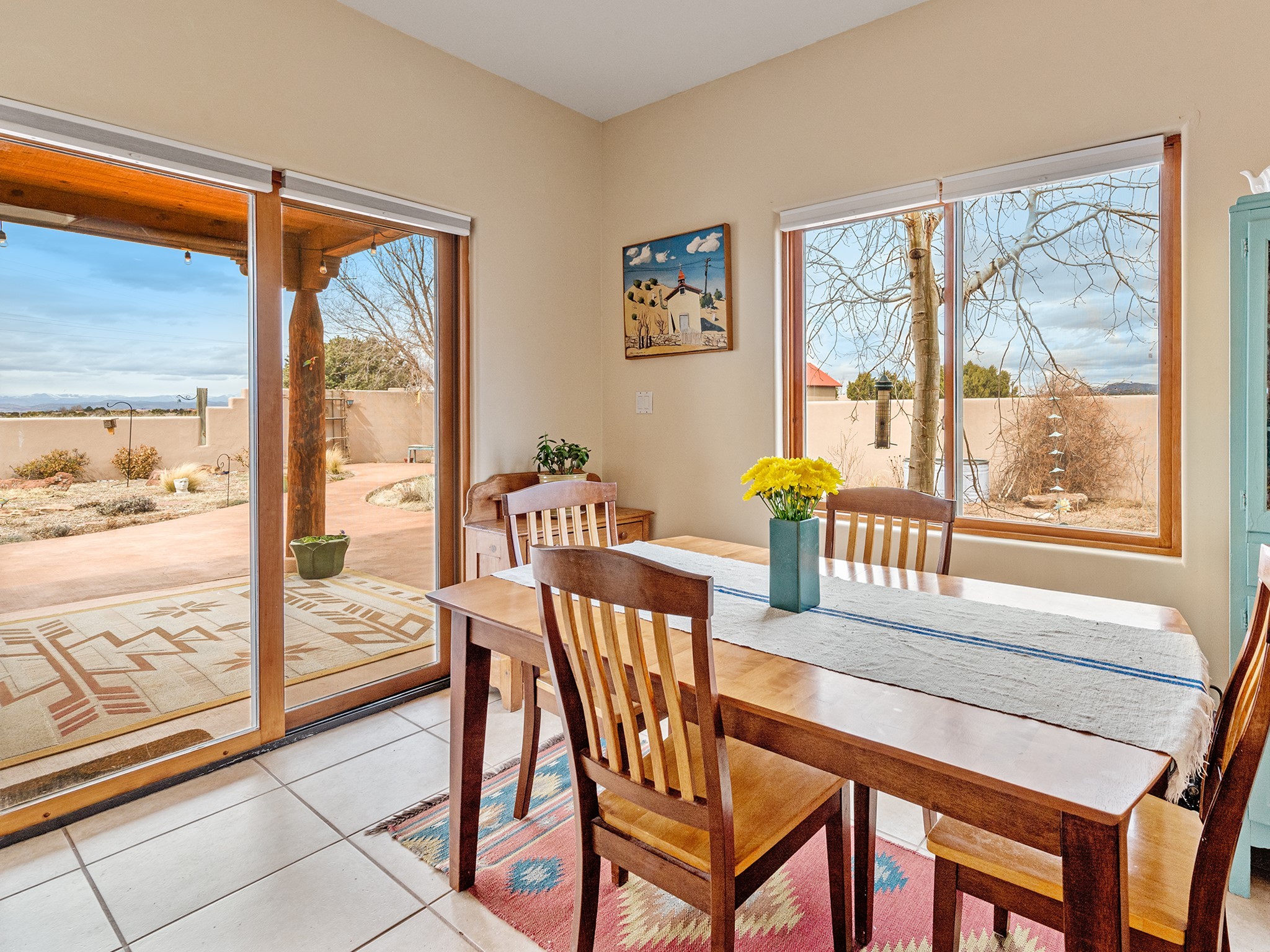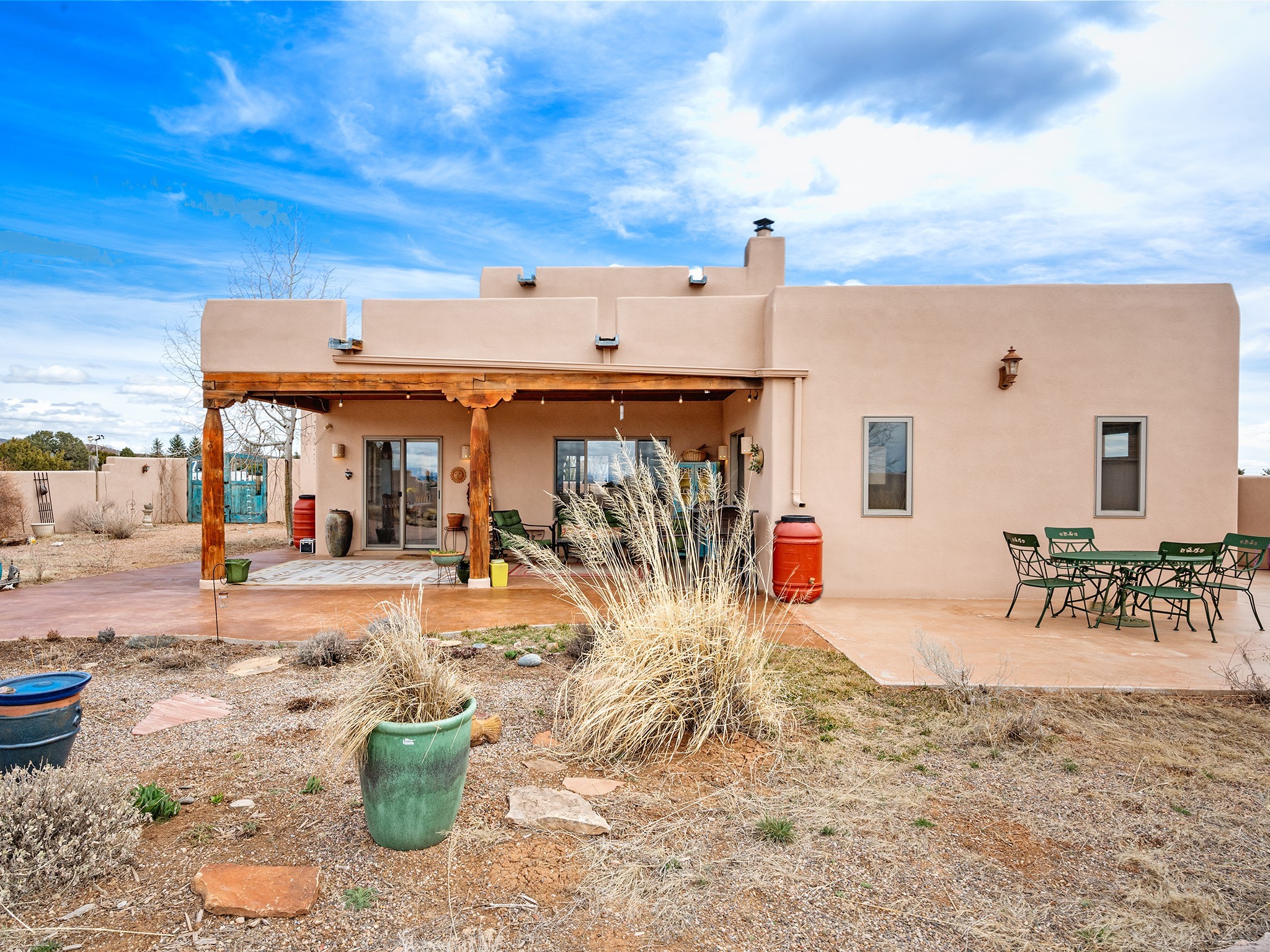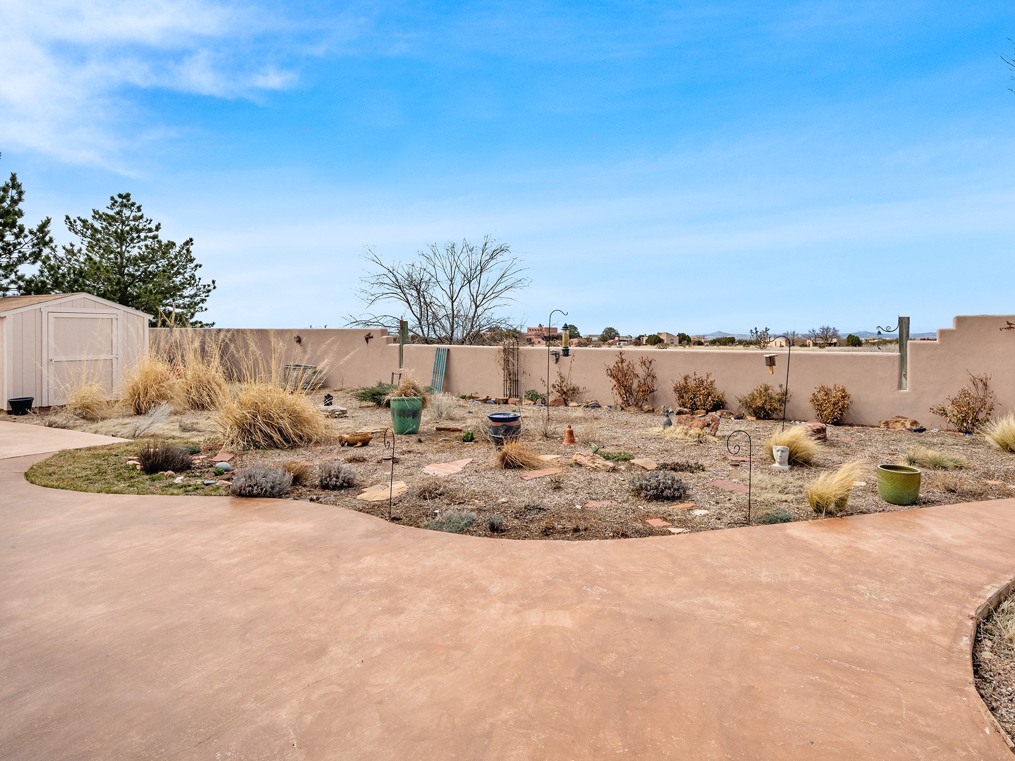 Absolute Eldorado charmer with magnificent mountain views in all directions! This thoughtfully laid out, single level 1800 +/- square feet, 3BD-2BA home is sited perfectly to capture surrounding views of the Jemez, Sandia and Sangre mountain ranges. The living room's high ceilings, sophisticated built-in bookcase, classic vigas, cozy wood burning kiva fireplace, and large picture windows make it the perfect space to soak in long-range views. A set of french doors leads to a very functional media room or office just off the main living space. Connected to the living room is a bright dining area with access to the back portal and yard. The kitchen is full of recent improvements including granite countertops, Blanco sink, newer refrigerator (2021) and dishwasher (2020). All three bedrooms are nicely separated on a long hallway on the opposite side of the living room. The primary suite is spacious and bright, and once again, features spectacular views out all windows and glass doors. Two walk-in closets with built-in shelving connect the primary bedroom to the ensuite bathroom. Down the hall are two nicely sized guest bedrooms and a full bathroom. The backyard is an oasis of its own. Plenty of covered patio space makes for a very comfortable outdoor entertainment, dining and lounging area almost year-round. Gorgeous native plants and bushes fill the walled-in backyard. Spectacular sunsets and beautiful summer blooms await!