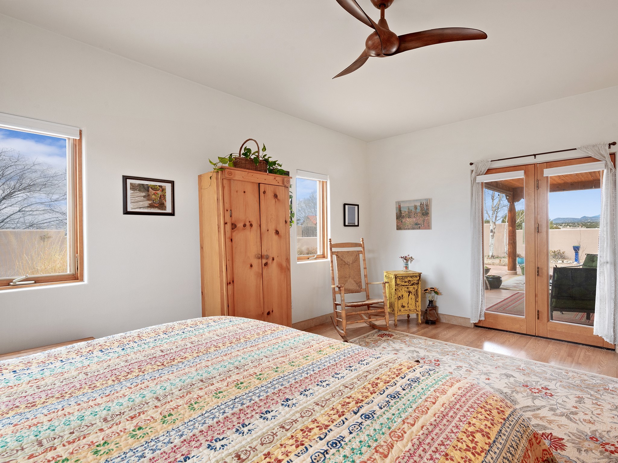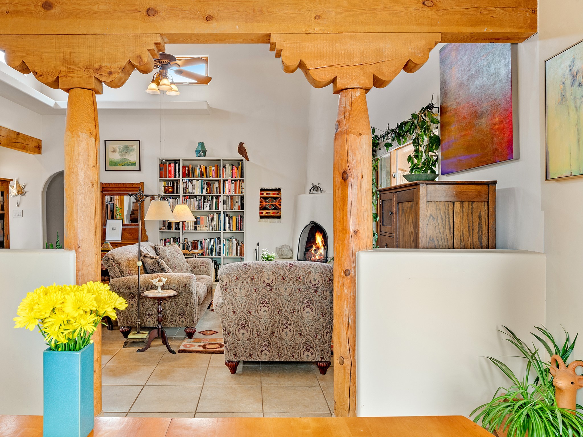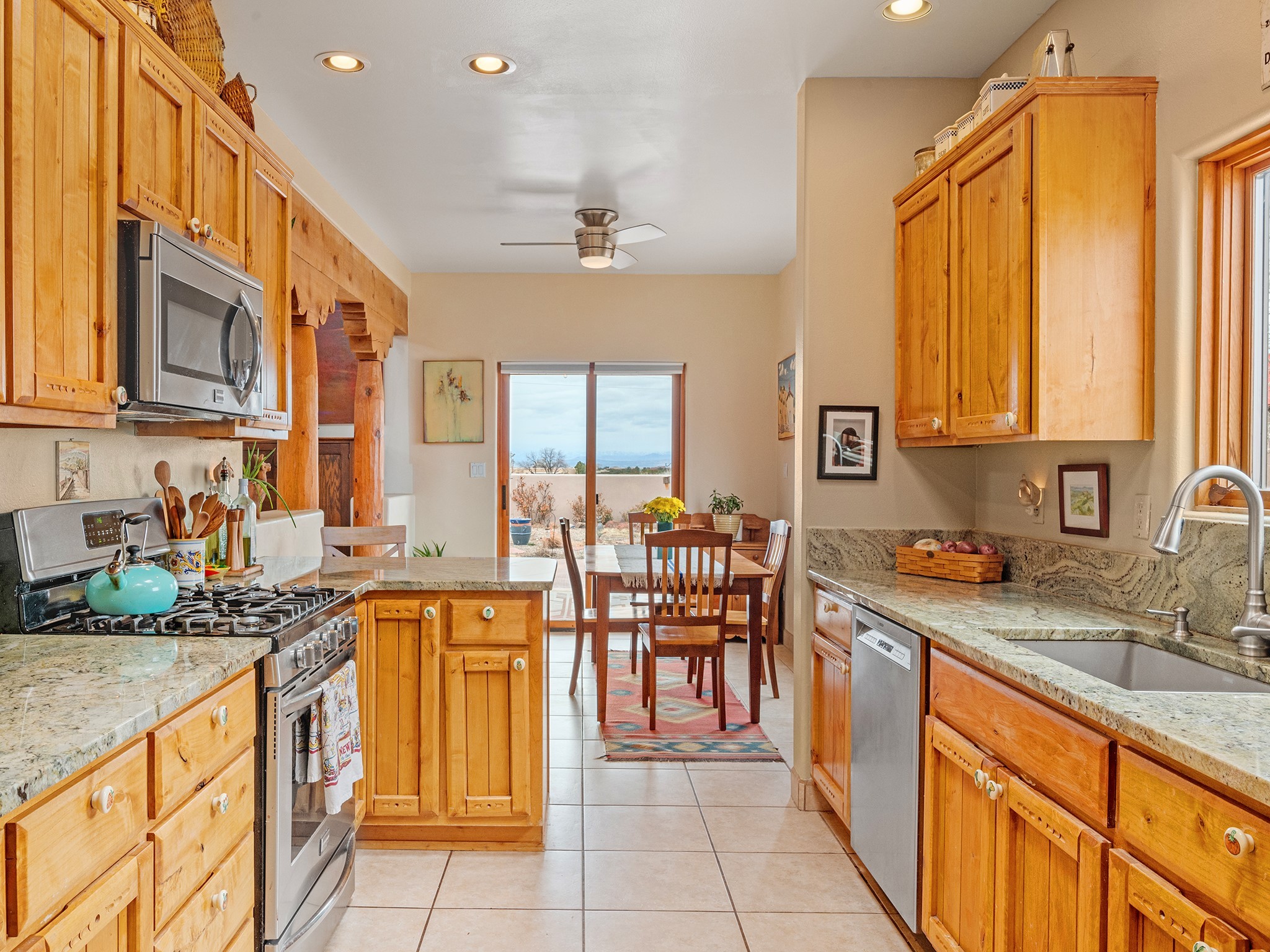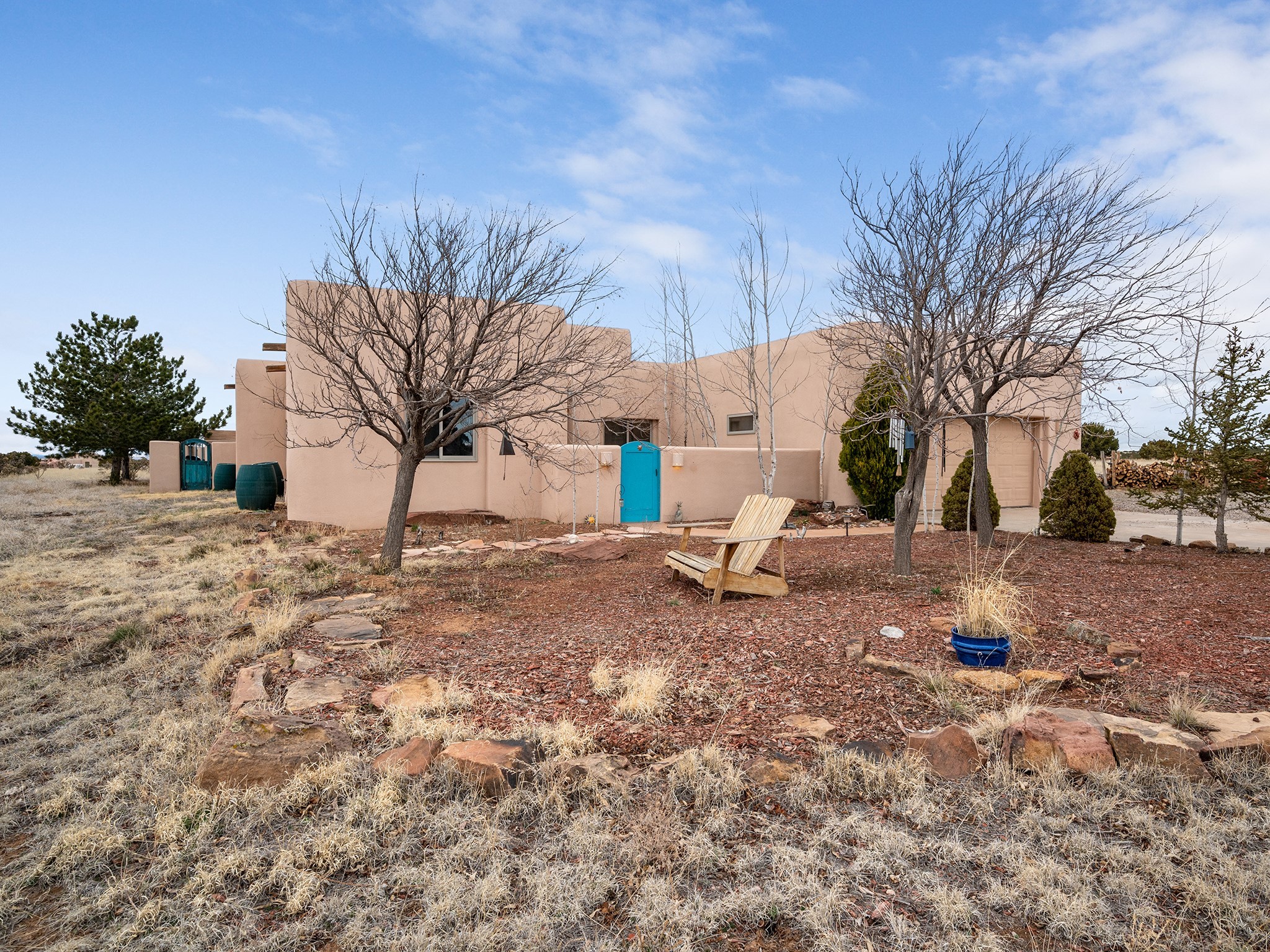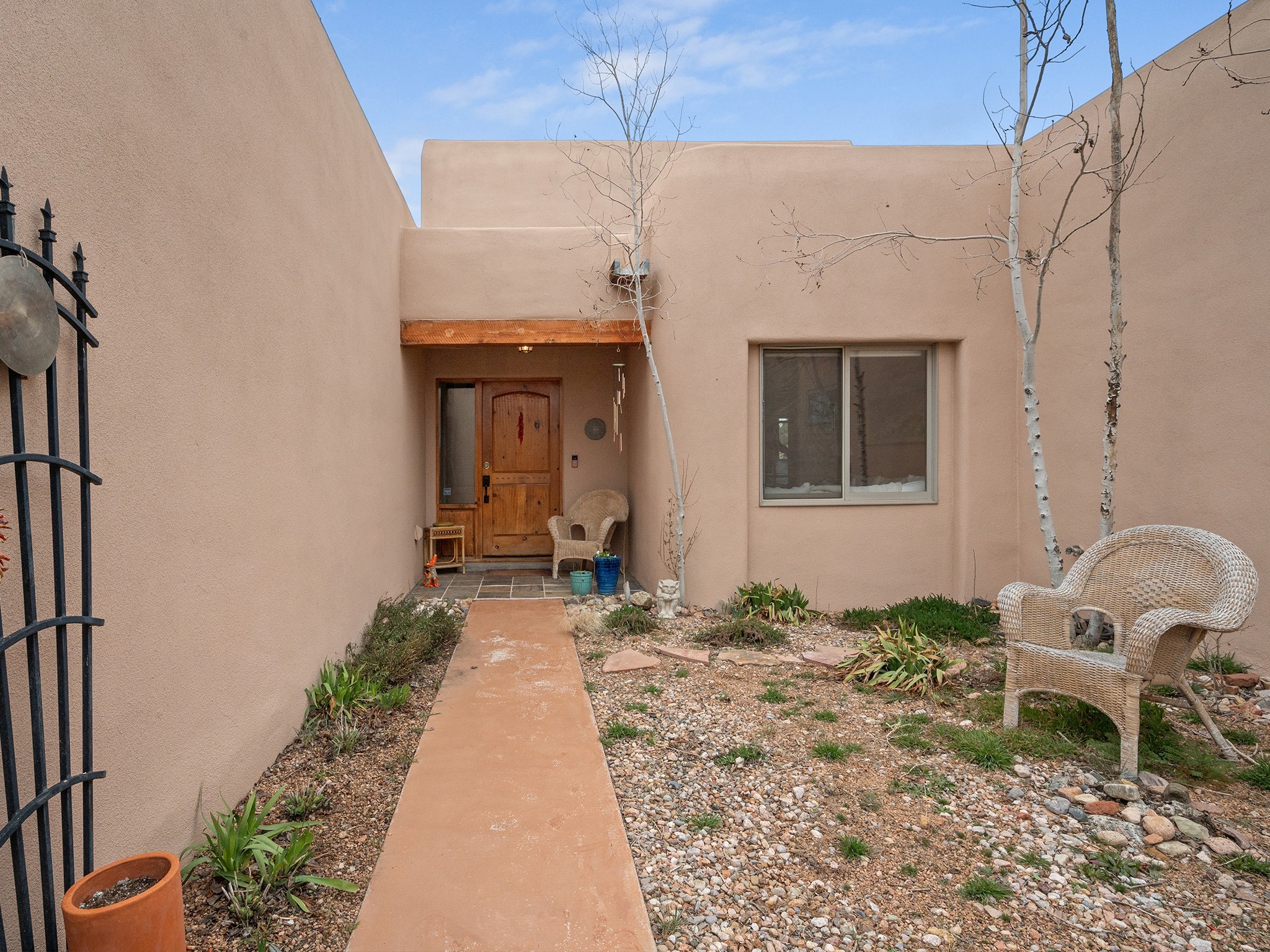 Absolute Eldorado charmer with magnificent mountain views in all directions! This thoughtfully laid out, single level 1800 +/- square feet, 3BD-2BA home is sited perfectly to capture surrounding views of the Jemez, Sandia and Sangre mountain ranges. The living room's high ceilings, sophisticated built-in bookcase, classic vigas, cozy wood burning kiva fireplace, and large picture windows make it the perfect space to soak in long-range views. A set of french doors leads to a very functional media room or office just off the main living space. Connected to the living room is a bright dining area with access to the back portal and yard. The kitchen is full of recent improvements including granite countertops, Blanco sink, newer refrigerator (2021) and dishwasher (2020). All three bedrooms are nicely separated on a long hallway on the opposite side of the living room. The primary suite is spacious and bright, and once again, features spectacular views out all windows and glass doors. Two walk-in closets with built-in shelving connect the primary bedroom to the ensuite bathroom. Down the hall are two nicely sized guest bedrooms and a full bathroom. The backyard is an oasis of its own. Plenty of covered patio space makes for a very comfortable outdoor entertainment, dining and lounging area almost year-round. Gorgeous native plants and bushes fill the walled-in backyard. Spectacular sunsets and beautiful summer blooms await!