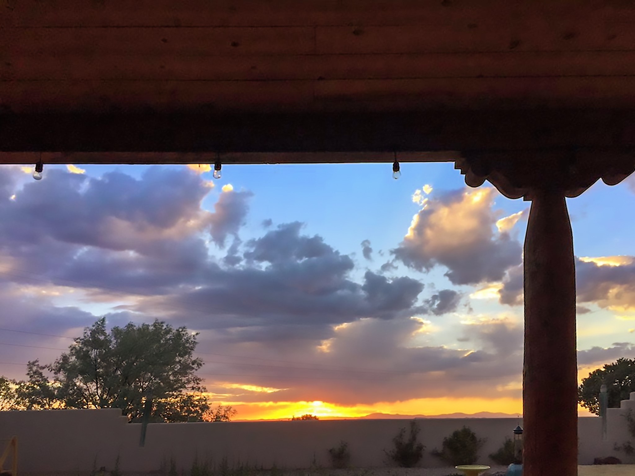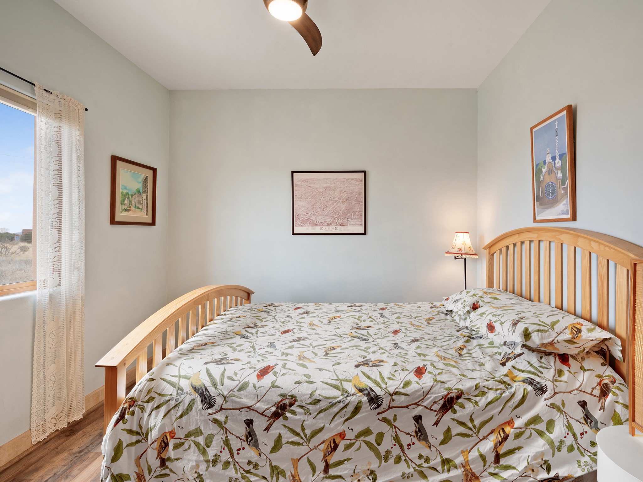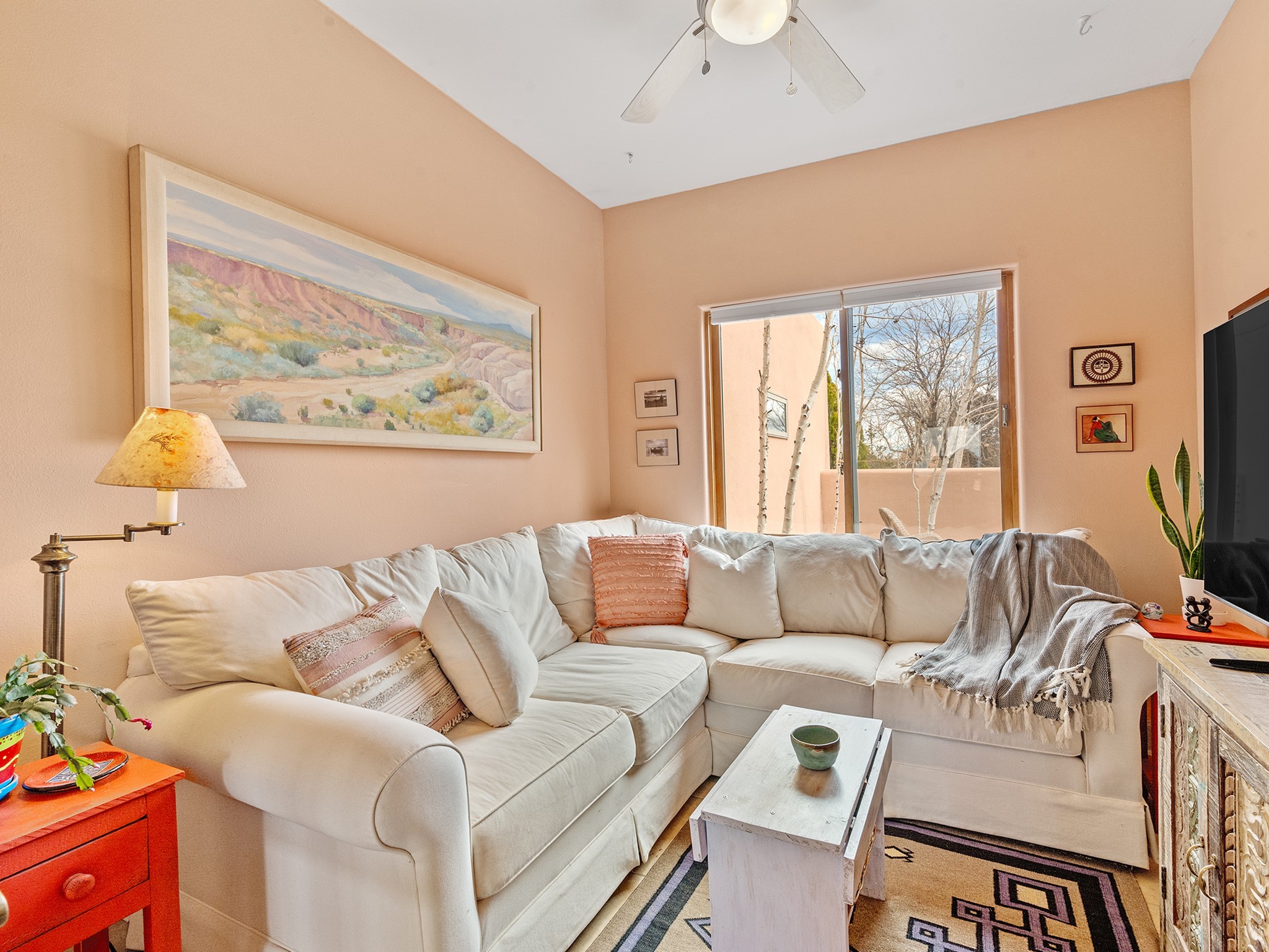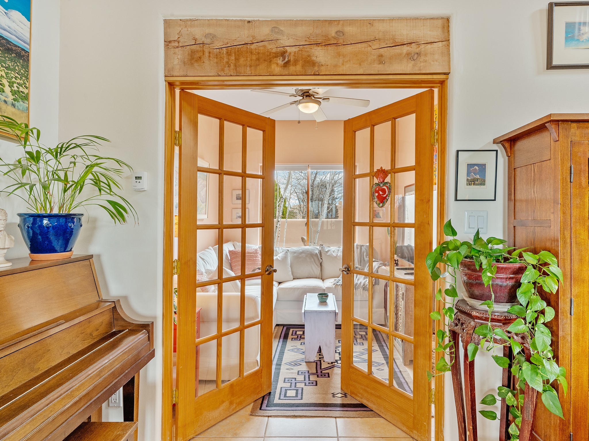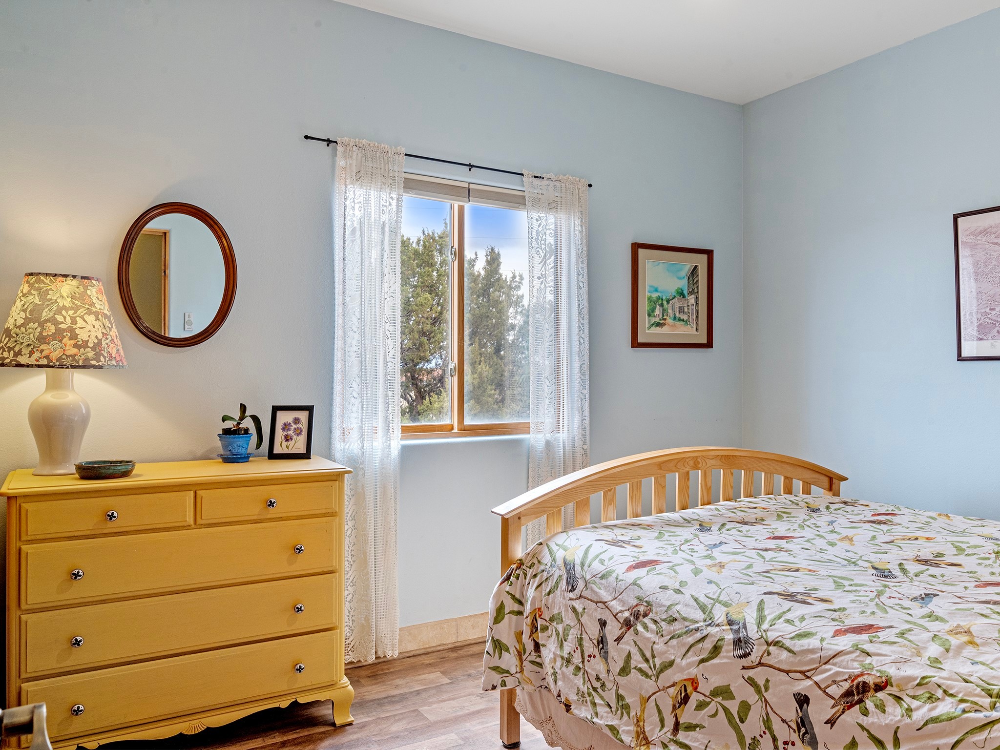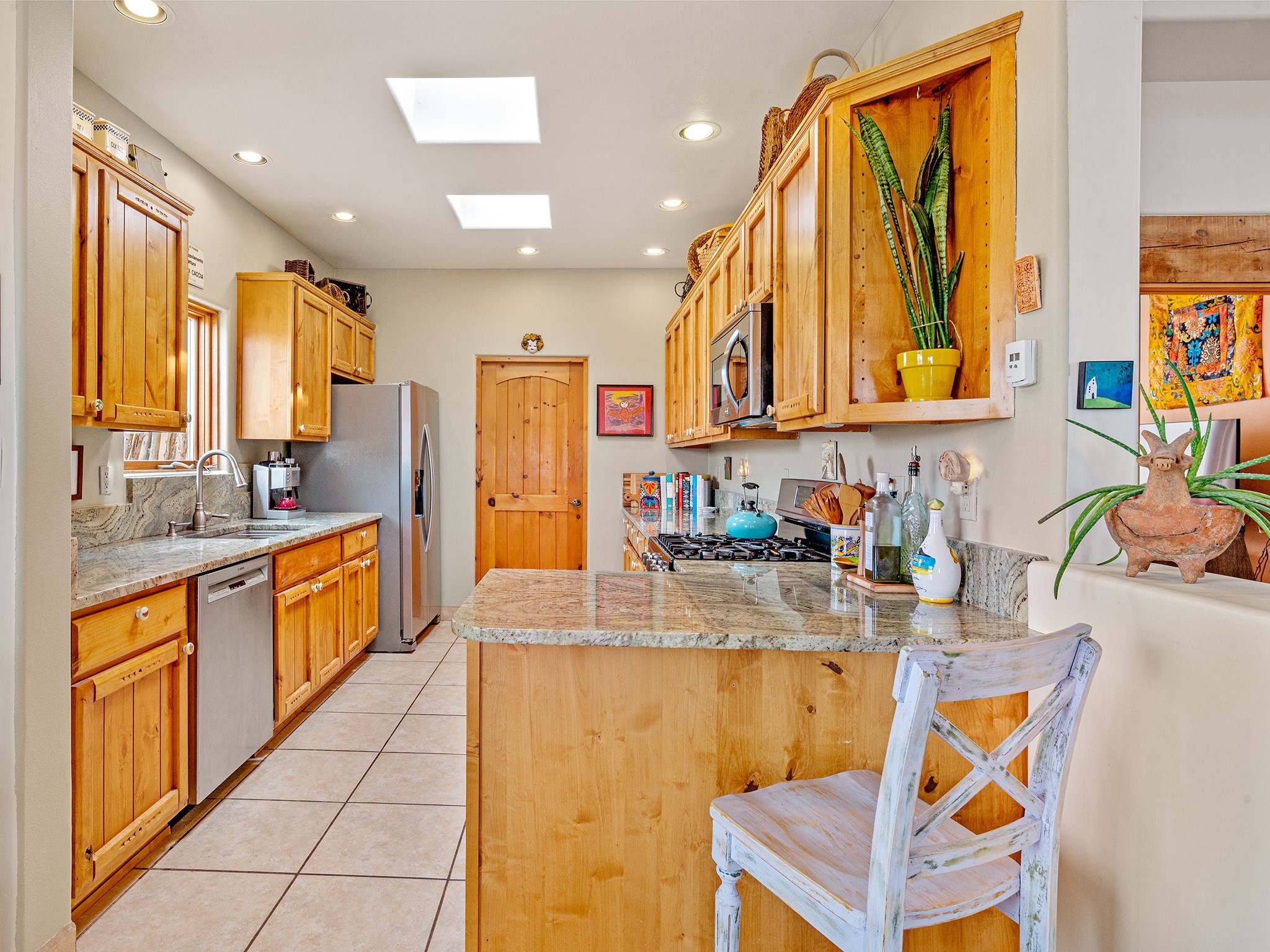 Absolute Eldorado charmer with magnificent mountain views in all directions! This thoughtfully laid out, single level 1800 +/- square feet, 3BD-2BA home is sited perfectly to capture surrounding views of the Jemez, Sandia and Sangre mountain ranges. The living room's high ceilings, sophisticated built-in bookcase, classic vigas, cozy wood burning kiva fireplace, and large picture windows make it the perfect space to soak in long-range views. A set of french doors leads to a very functional media room or office just off the main living space. Connected to the living room is a bright dining area with access to the back portal and yard. The kitchen is full of recent improvements including granite countertops, Blanco sink, newer refrigerator (2021) and dishwasher (2020). All three bedrooms are nicely separated on a long hallway on the opposite side of the living room. The primary suite is spacious and bright, and once again, features spectacular views out all windows and glass doors. Two walk-in closets with built-in shelving connect the primary bedroom to the ensuite bathroom. Down the hall are two nicely sized guest bedrooms and a full bathroom. The backyard is an oasis of its own. Plenty of covered patio space makes for a very comfortable outdoor entertainment, dining and lounging area almost year-round. Gorgeous native plants and bushes fill the walled-in backyard. Spectacular sunsets and beautiful summer blooms await!