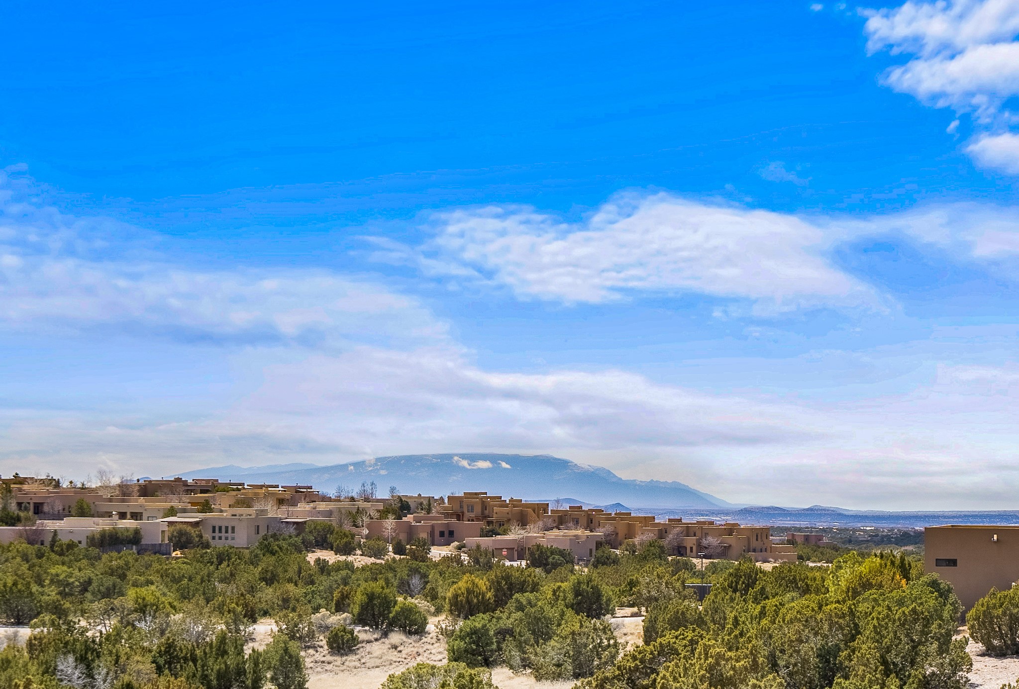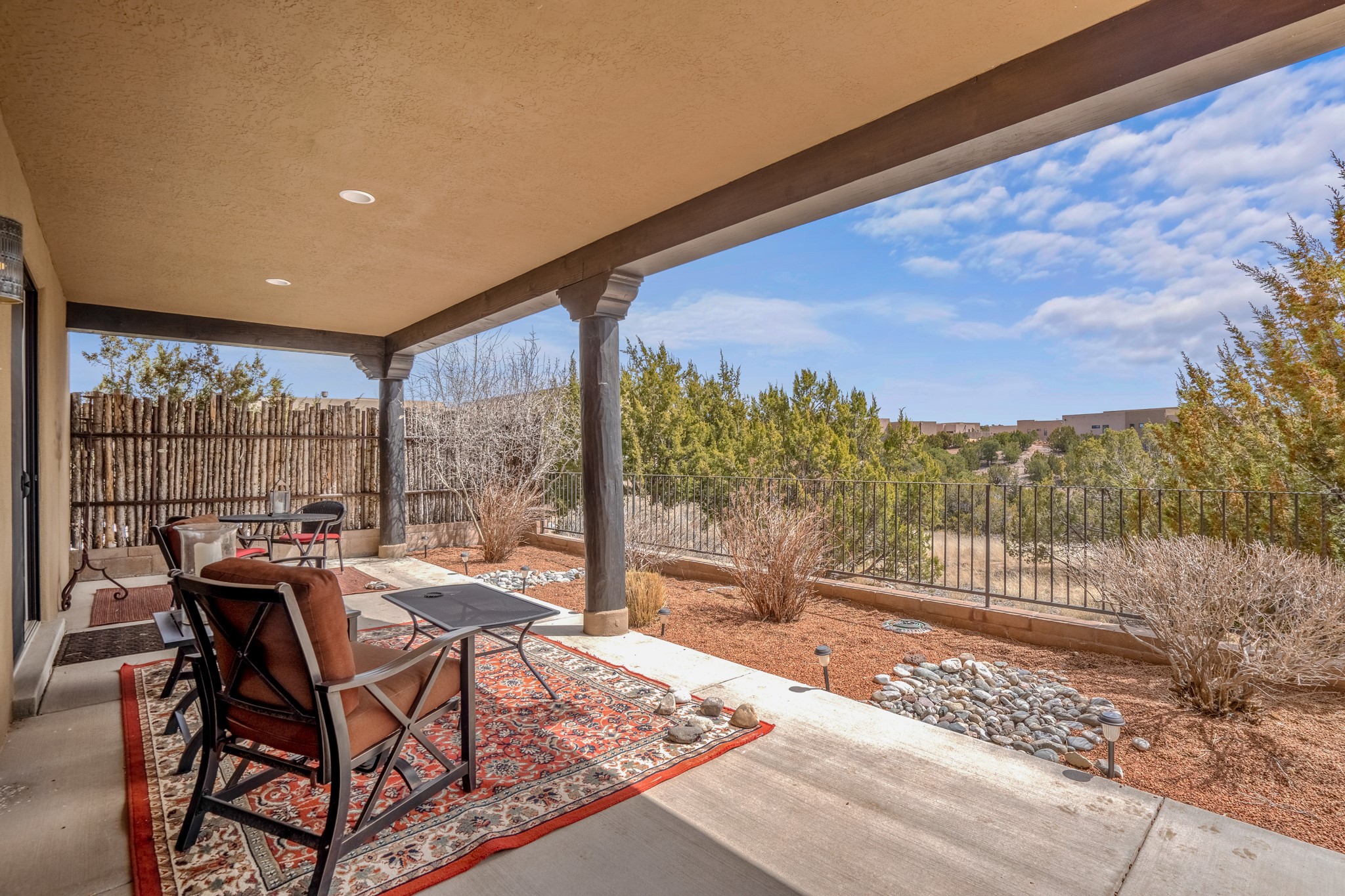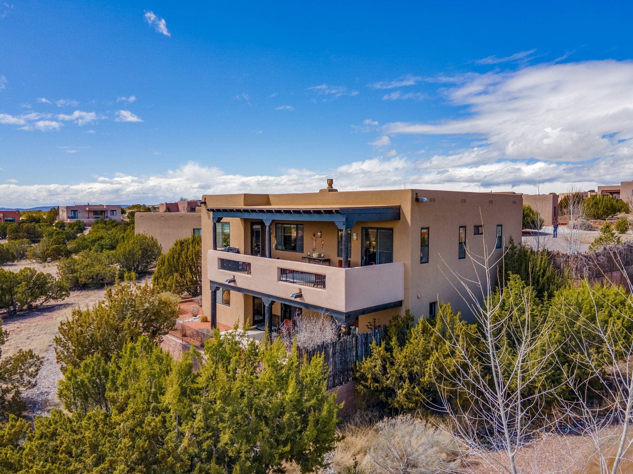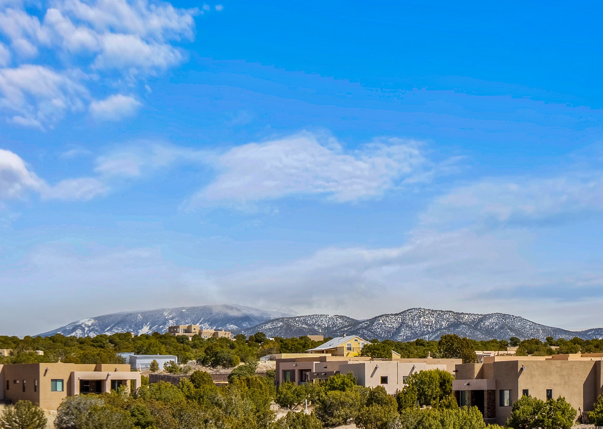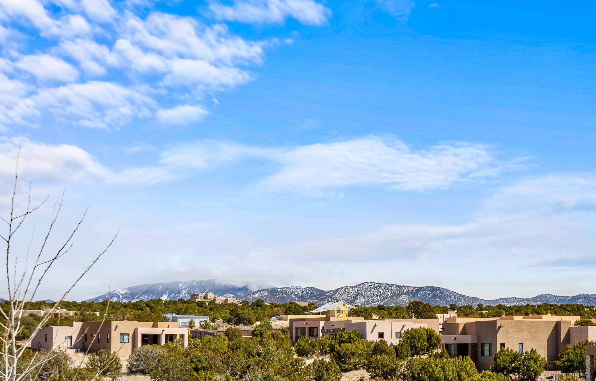 Located in the big-view neighborhood of Tessera on the west side of Santa Fe, this landscaped 3 bedroom, 4 bath home is move-in ready and is nicely situated at the end of a quiet cul de sac. At just under 2500 square feet of living space, this Aspen model floor plan provides plenty of room and privacy for you and your family and guests. The split-level design allows its owners to live on one level with the primary bedroom suite, the living/dining, kitchen, garage and a lovely, covered portal all on the entry level. Downstairs, you will find a large den or office space and two generously-sized bedrooms. Each has their own full bathroom as well as direct access to the rear patio/portal. The kitchen features a large island, stainless appliances, a generous pantry and bar seating. The main-level covered deck is an upgraded feature of this home with beautiful dark wood vigas, posts and string lighting. This space allows you to enjoy the outdoors day or evening with grand views of the Sangre de Cristo mountains. Other upgrades include beautiful grass-cloth window treatments throughout the home, engineered wood floors and paint colors with specialized lighting that accentuate your Santa Fe art collection. Built in 2015, this home is ready for its new owners to move right in. The Tessera subdivision offers walking trails, beautiful 360 degree views and a short 10 minute drive to town.