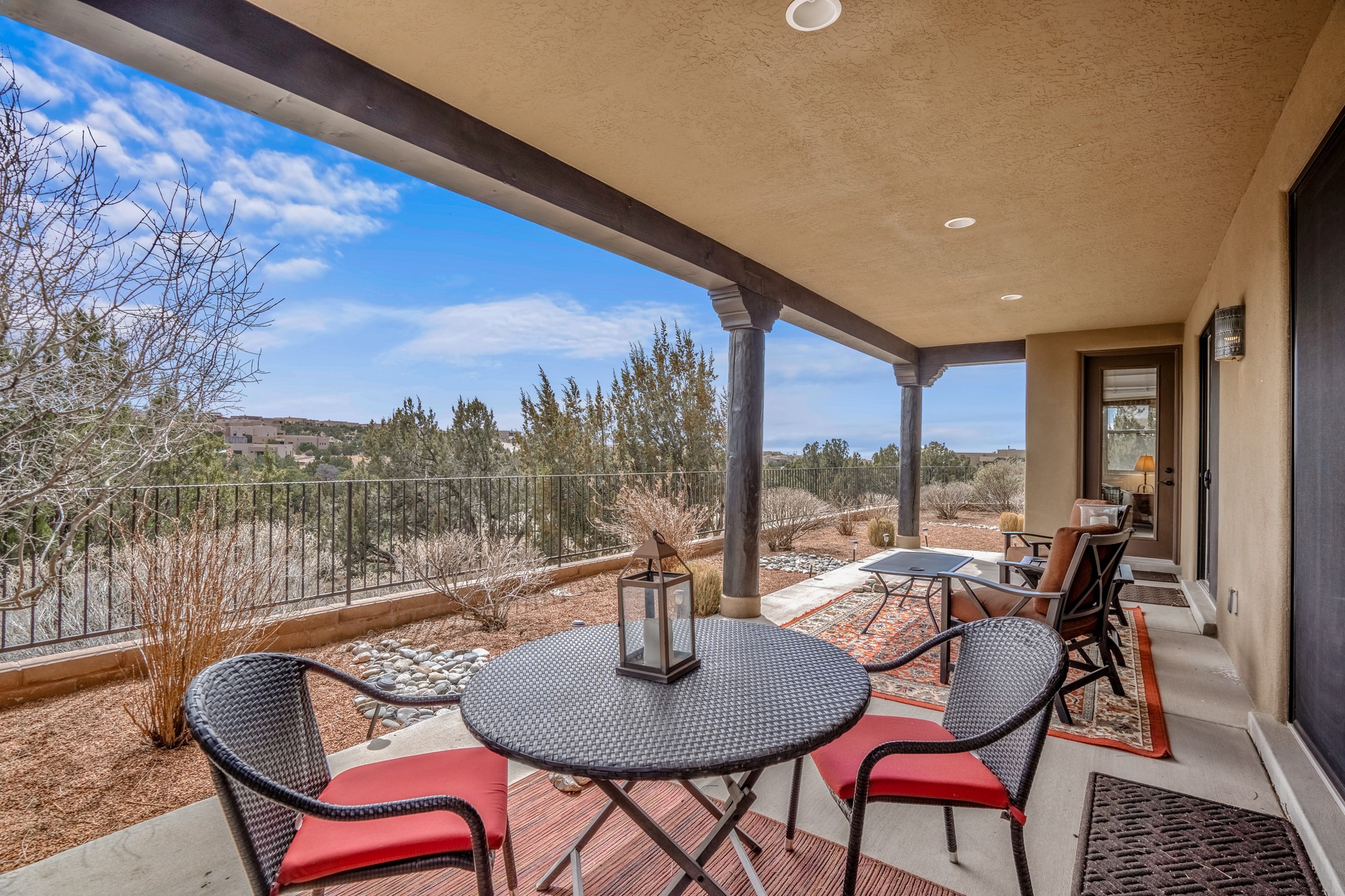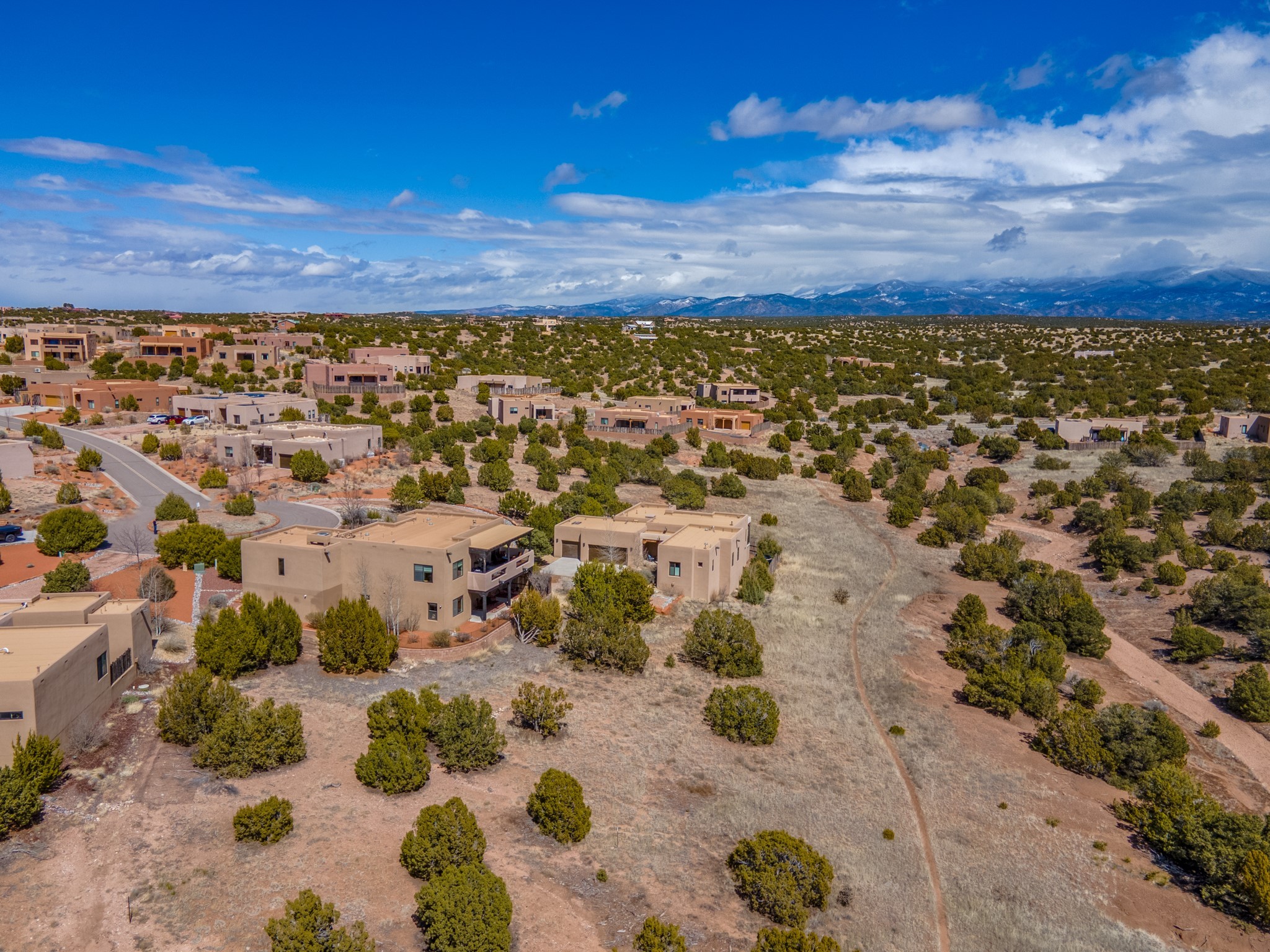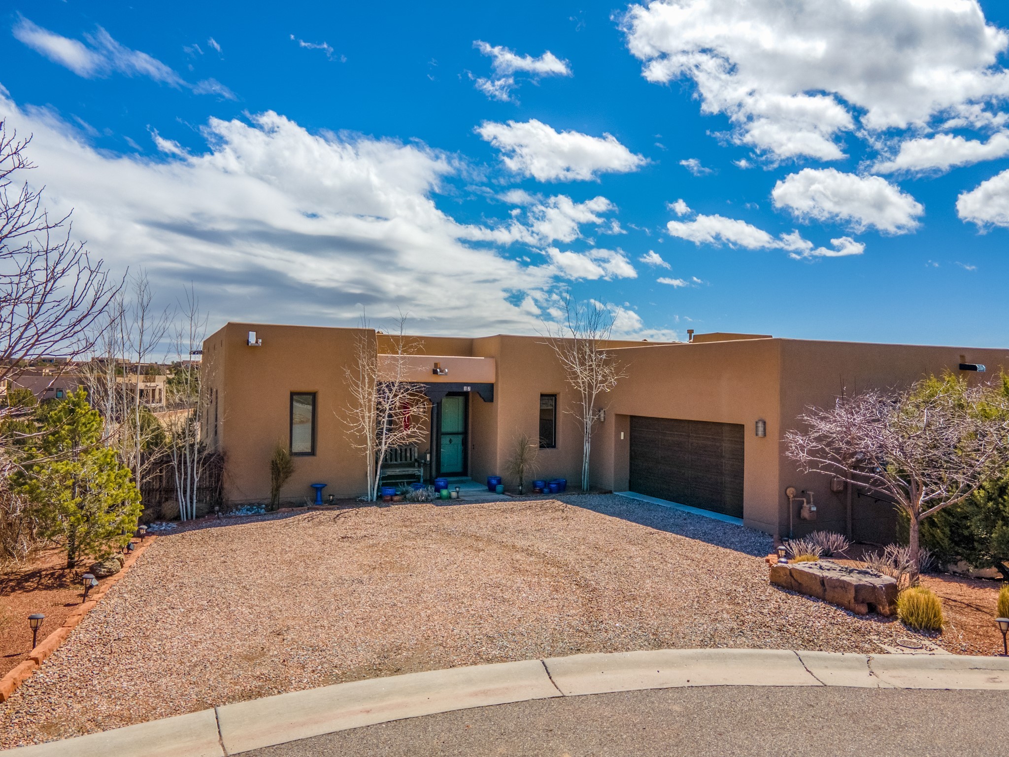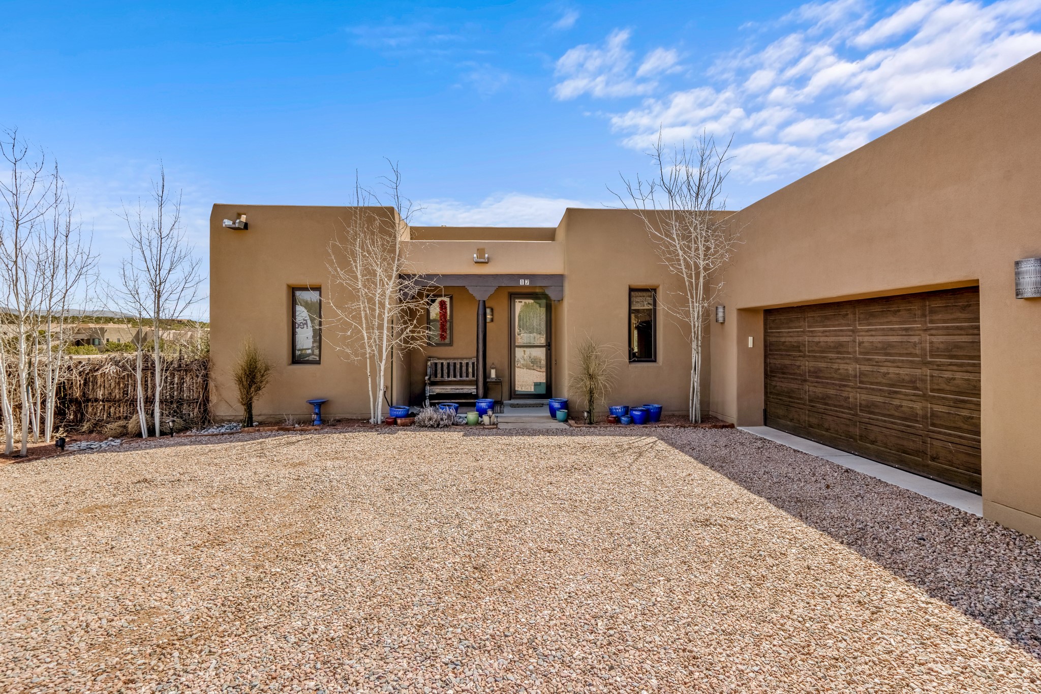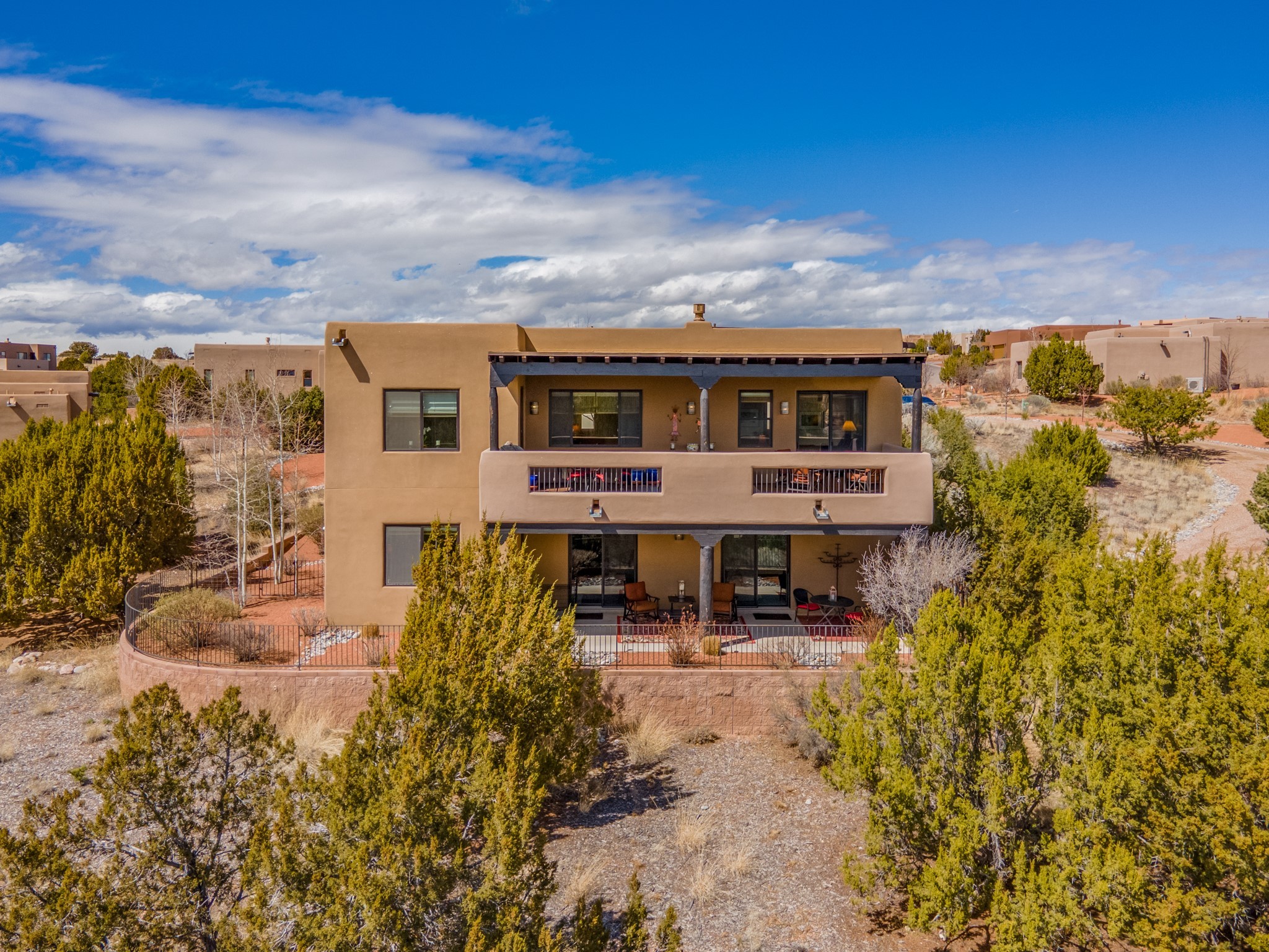 Located in the big-view neighborhood of Tessera on the west side of Santa Fe, this landscaped 3 bedroom, 4 bath home is move-in ready and is nicely situated at the end of a quiet cul de sac. At just under 2500 square feet of living space, this Aspen model floor plan provides plenty of room and privacy for you and your family and guests. The split-level design allows its owners to live on one level with the primary bedroom suite, the living/dining, kitchen, garage and a lovely, covered portal all on the entry level. Downstairs, you will find a large den or office space and two generously-sized bedrooms. Each has their own full bathroom as well as direct access to the rear patio/portal. The kitchen features a large island, stainless appliances, a generous pantry and bar seating. The main-level covered deck is an upgraded feature of this home with beautiful dark wood vigas, posts and string lighting. This space allows you to enjoy the outdoors day or evening with grand views of the Sangre de Cristo mountains. Other upgrades include beautiful grass-cloth window treatments throughout the home, engineered wood floors and paint colors with specialized lighting that accentuate your Santa Fe art collection. Built in 2015, this home is ready for its new owners to move right in. The Tessera subdivision offers walking trails, beautiful 360 degree views and a short 10 minute drive to town.