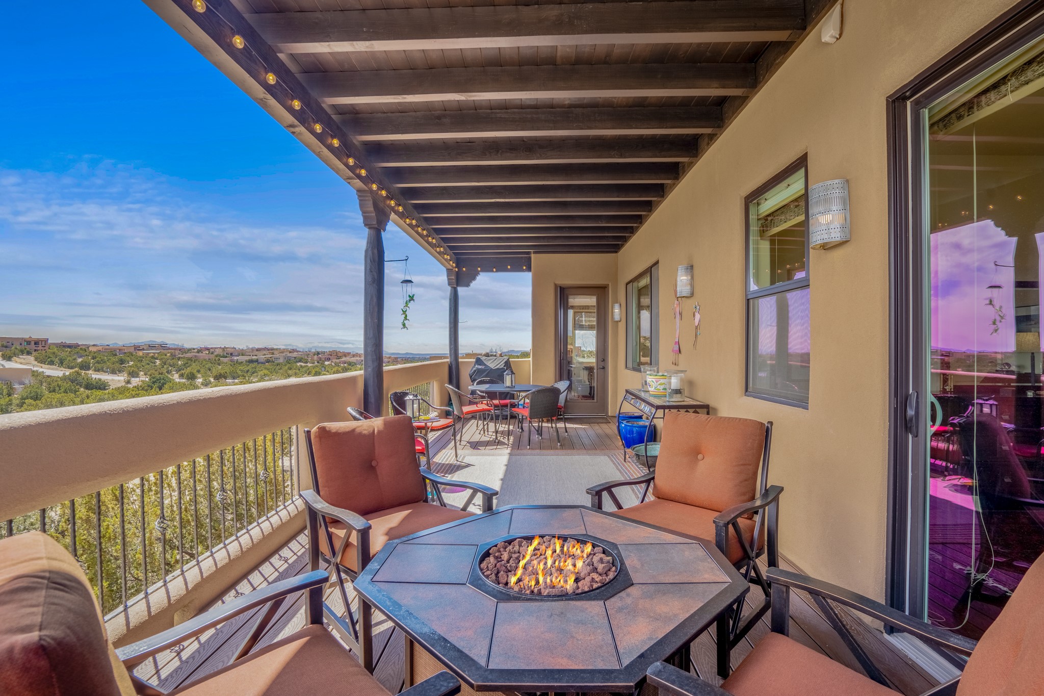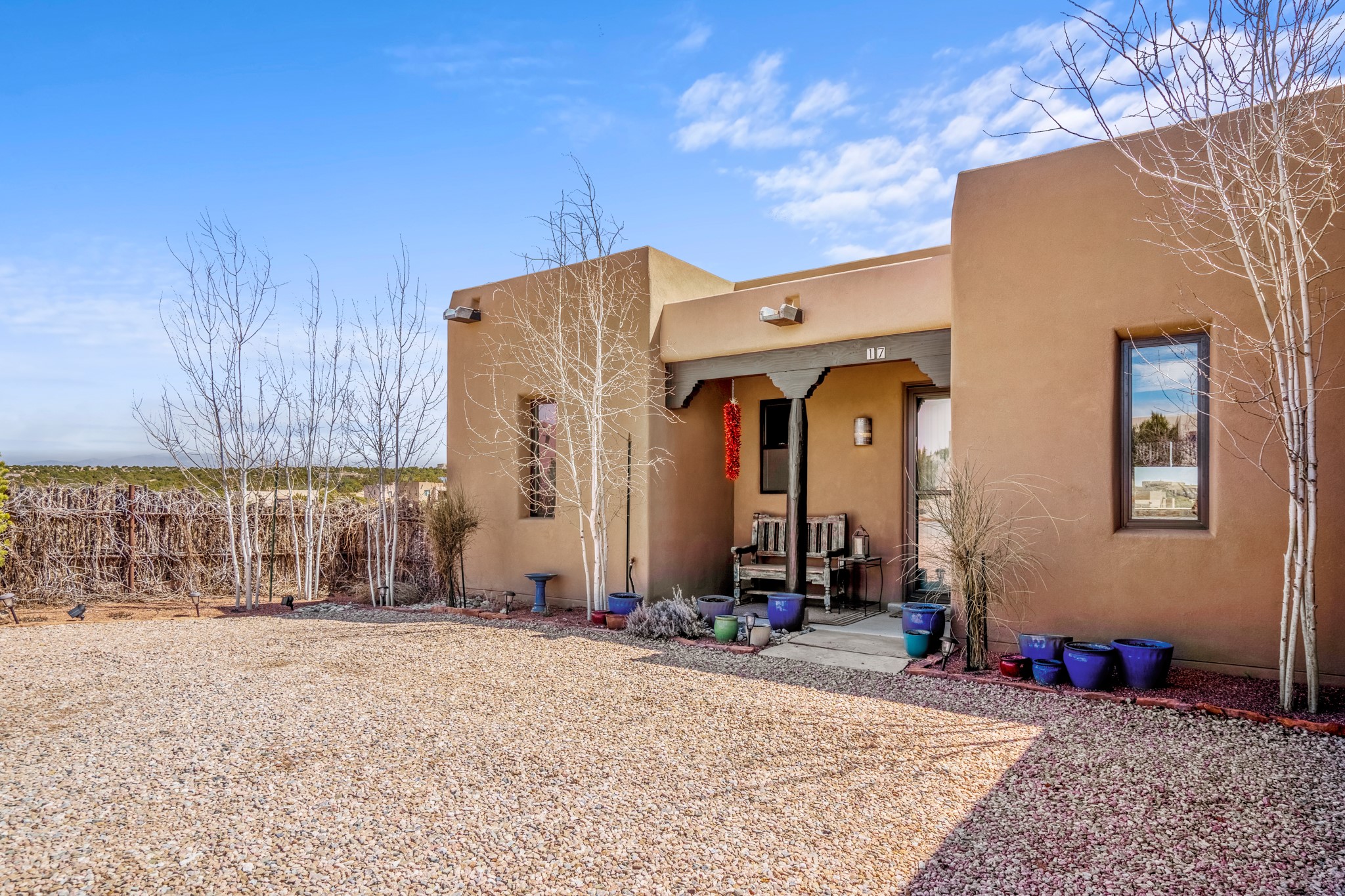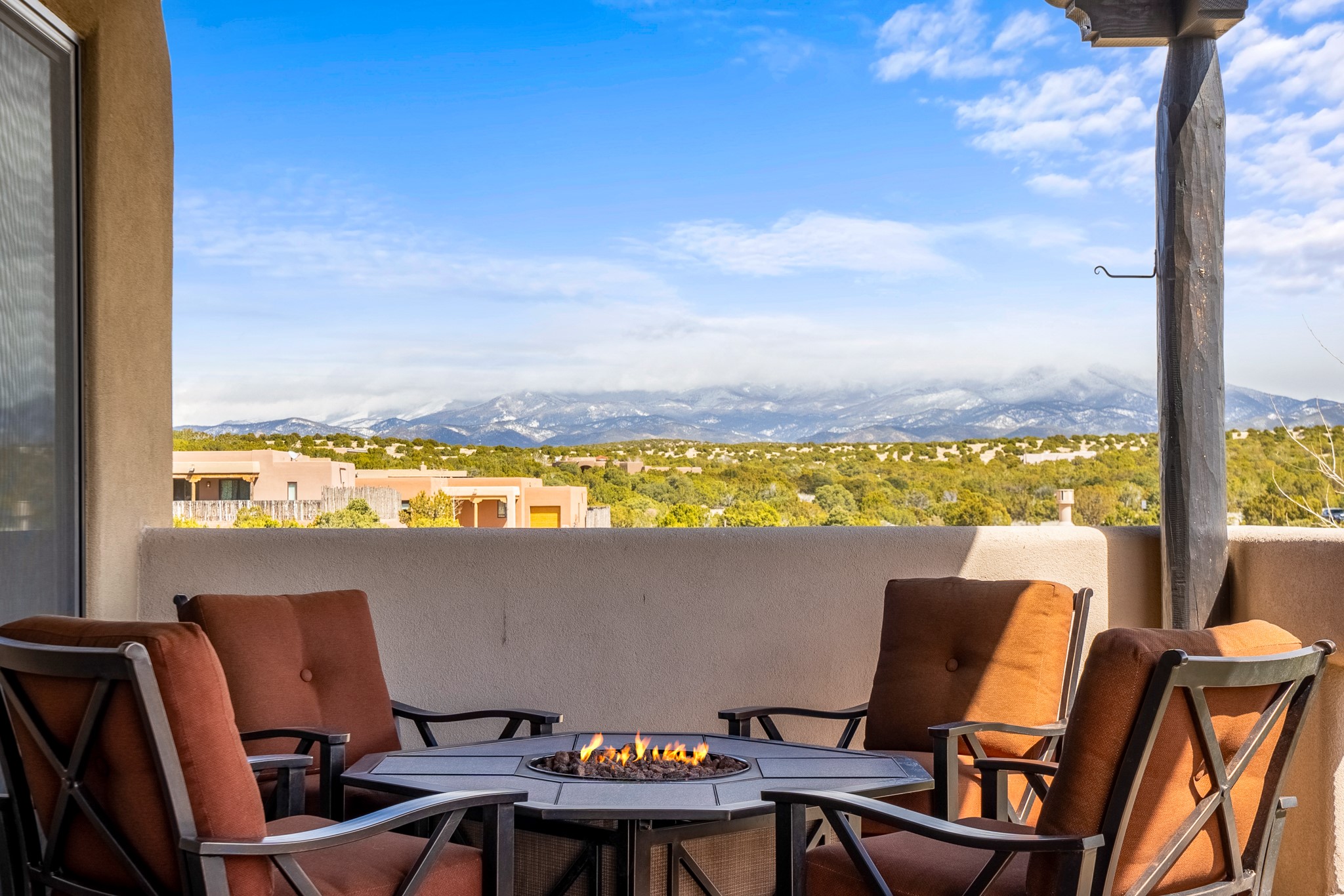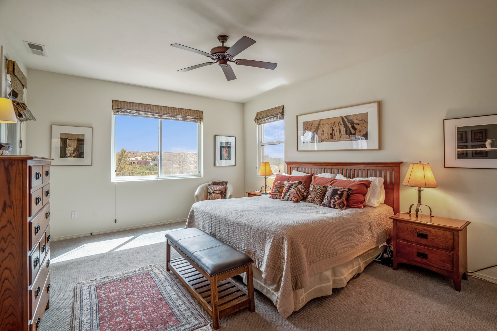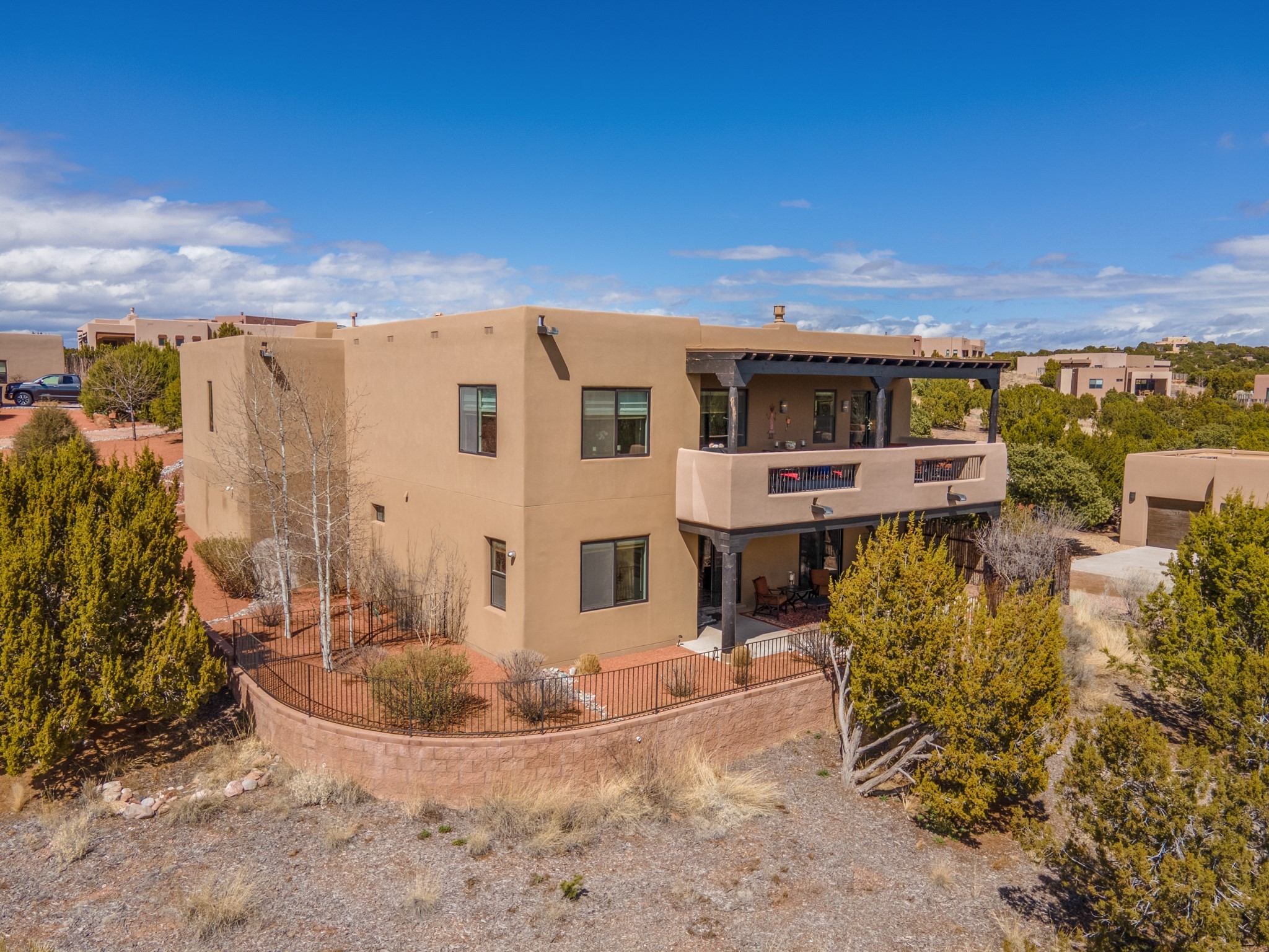 Located in the big-view neighborhood of Tessera on the west side of Santa Fe, this landscaped 3 bedroom, 4 bath home is move-in ready and is nicely situated at the end of a quiet cul de sac. At just under 2500 square feet of living space, this Aspen model floor plan provides plenty of room and privacy for you and your family and guests. The split-level design allows its owners to live on one level with the primary bedroom suite, the living/dining, kitchen, garage and a lovely, covered portal all on the entry level. Downstairs, you will find a large den or office space and two generously-sized bedrooms. Each has their own full bathroom as well as direct access to the rear patio/portal. The kitchen features a large island, stainless appliances, a generous pantry and bar seating. The main-level covered deck is an upgraded feature of this home with beautiful dark wood vigas, posts and string lighting. This space allows you to enjoy the outdoors day or evening with grand views of the Sangre de Cristo mountains. Other upgrades include beautiful grass-cloth window treatments throughout the home, engineered wood floors and paint colors with specialized lighting that accentuate your Santa Fe art collection. Built in 2015, this home is ready for its new owners to move right in. The Tessera subdivision offers walking trails, beautiful 360 degree views and a short 10 minute drive to town.