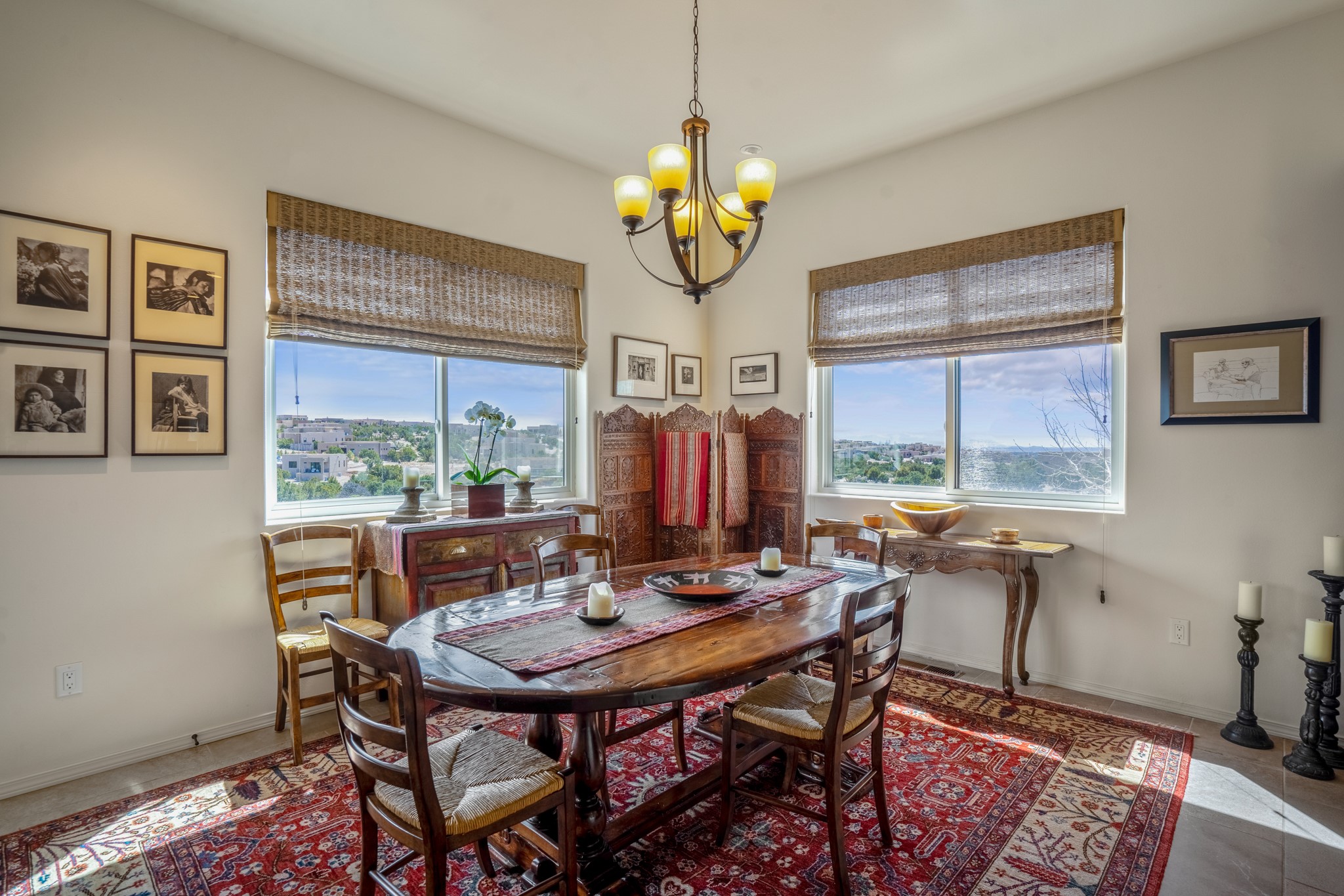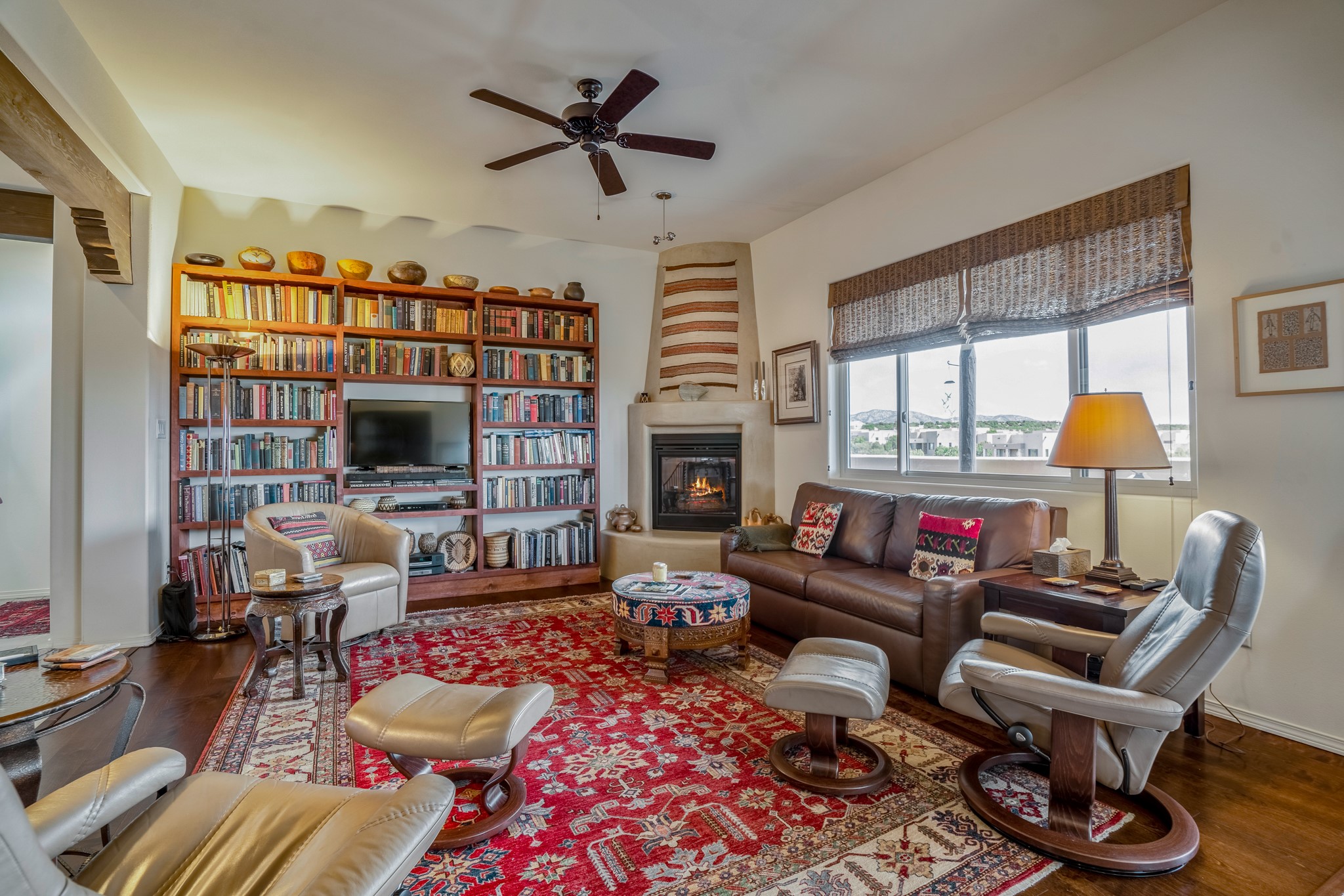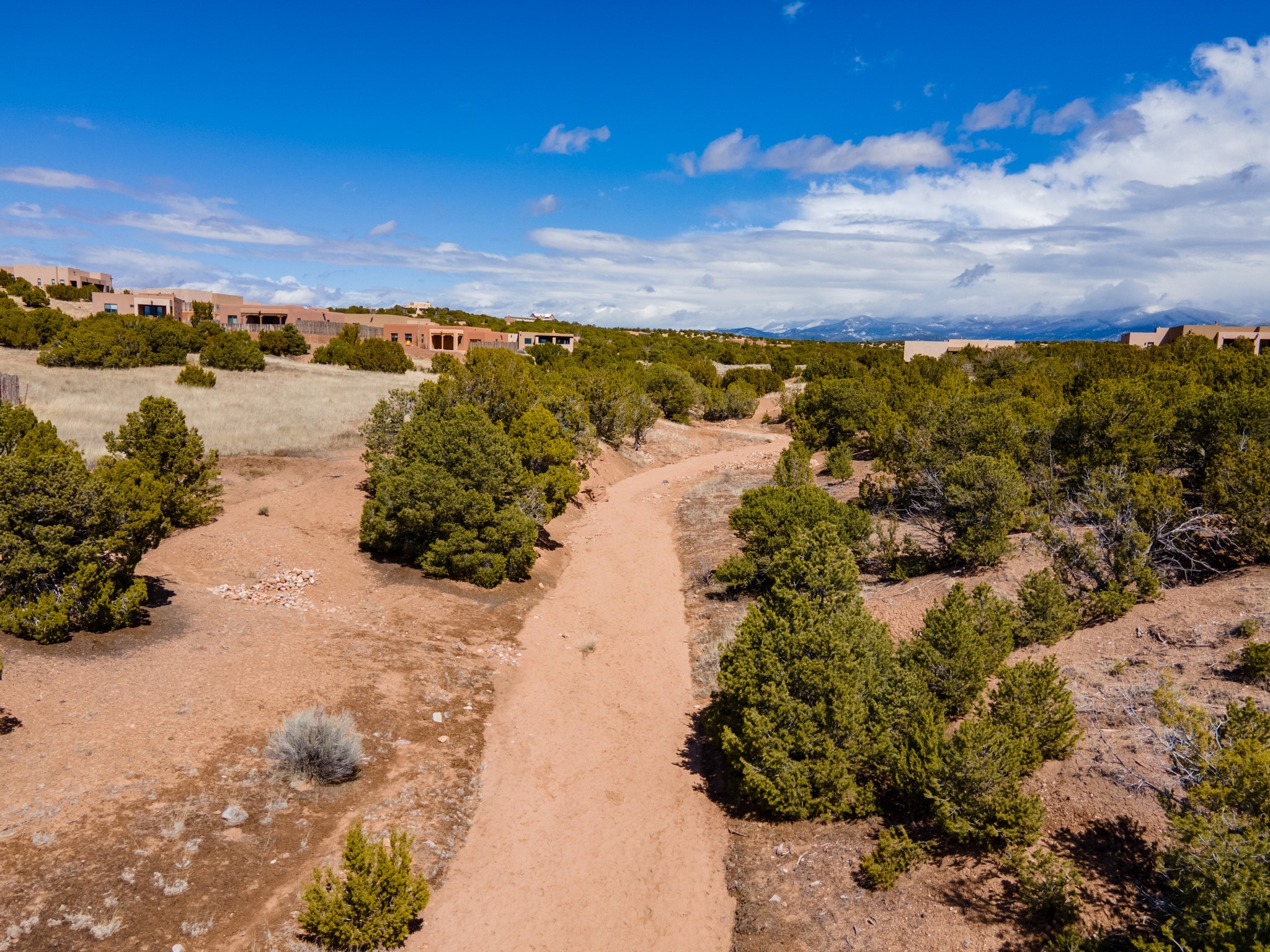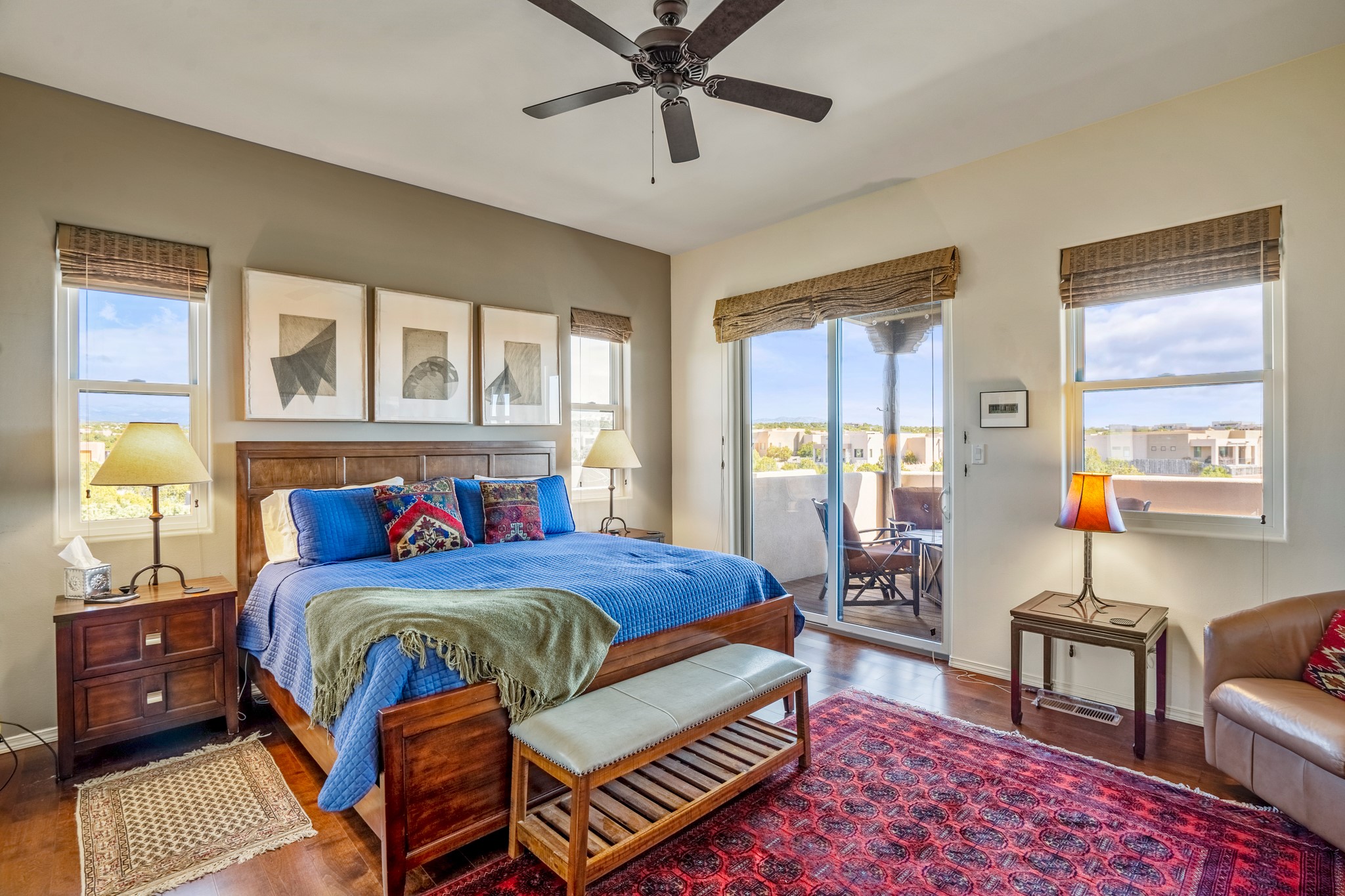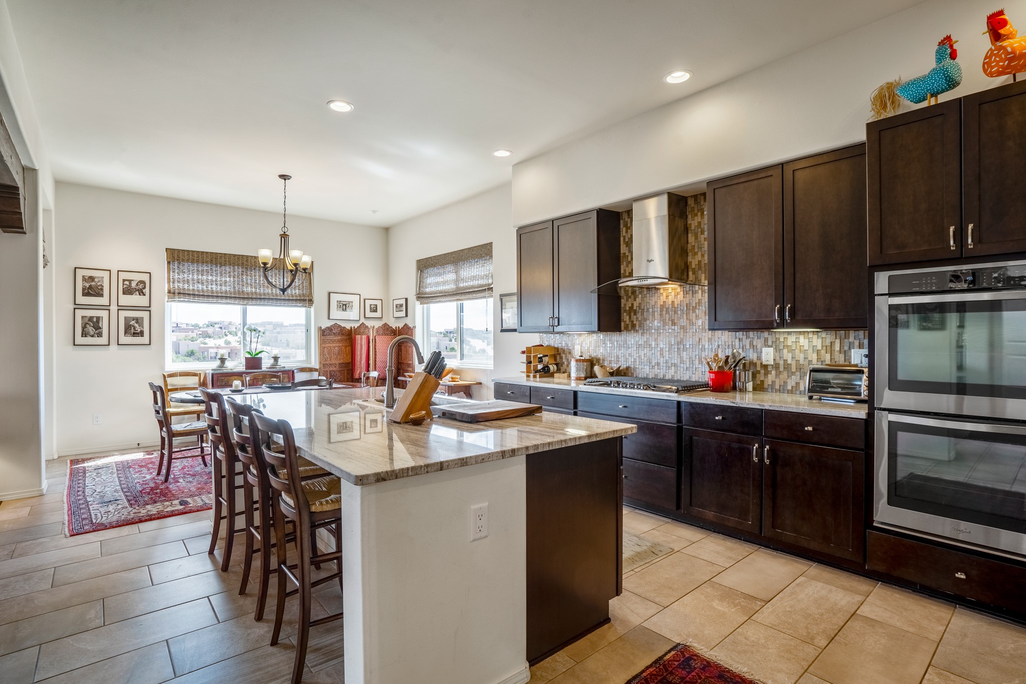 Located in the big-view neighborhood of Tessera on the west side of Santa Fe, this landscaped 3 bedroom, 4 bath home is move-in ready and is nicely situated at the end of a quiet cul de sac. At just under 2500 square feet of living space, this Aspen model floor plan provides plenty of room and privacy for you and your family and guests. The split-level design allows its owners to live on one level with the primary bedroom suite, the living/dining, kitchen, garage and a lovely, covered portal all on the entry level. Downstairs, you will find a large den or office space and two generously-sized bedrooms. Each has their own full bathroom as well as direct access to the rear patio/portal. The kitchen features a large island, stainless appliances, a generous pantry and bar seating. The main-level covered deck is an upgraded feature of this home with beautiful dark wood vigas, posts and string lighting. This space allows you to enjoy the outdoors day or evening with grand views of the Sangre de Cristo mountains. Other upgrades include beautiful grass-cloth window treatments throughout the home, engineered wood floors and paint colors with specialized lighting that accentuate your Santa Fe art collection. Built in 2015, this home is ready for its new owners to move right in. The Tessera subdivision offers walking trails, beautiful 360 degree views and a short 10 minute drive to town.