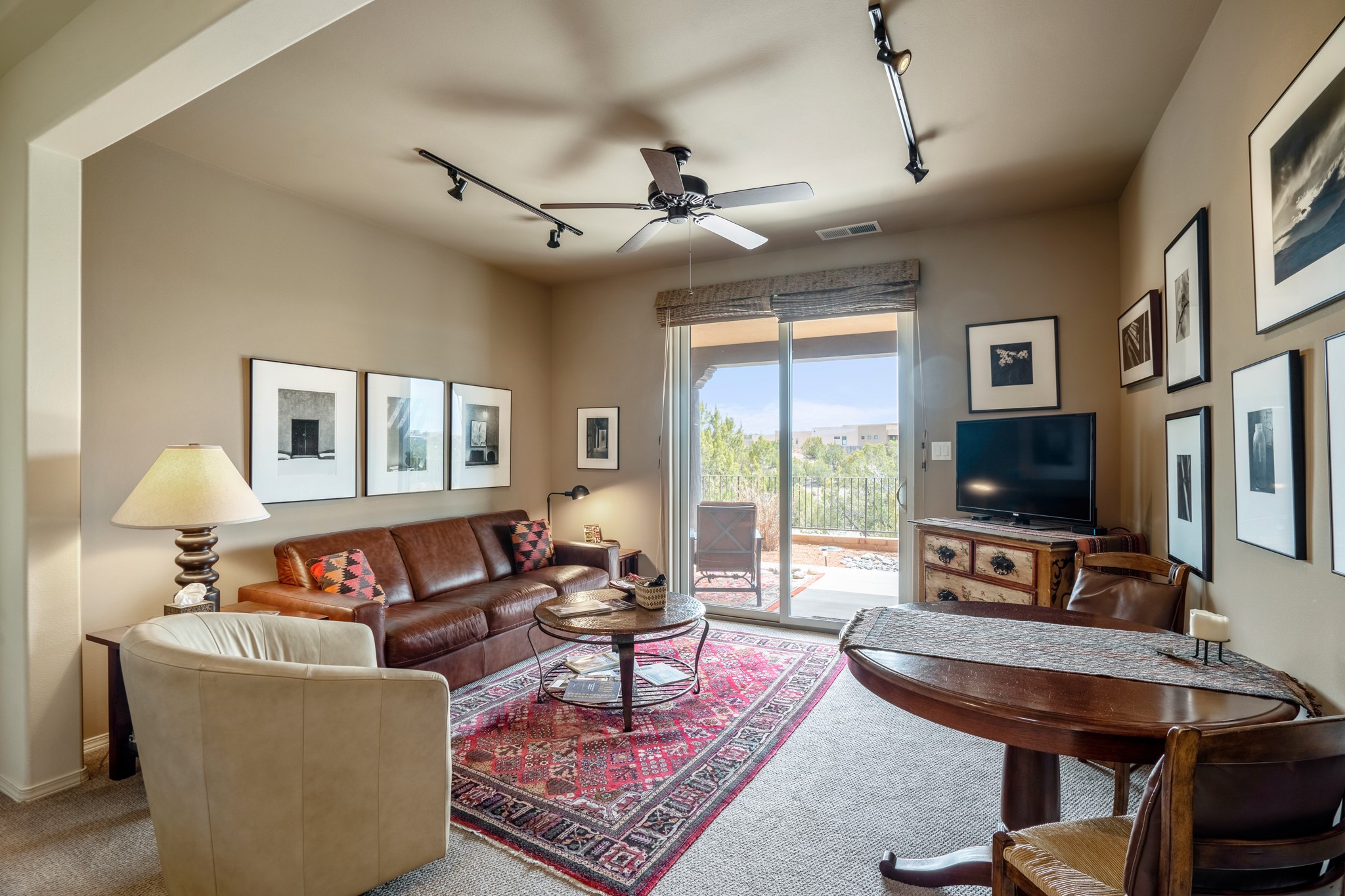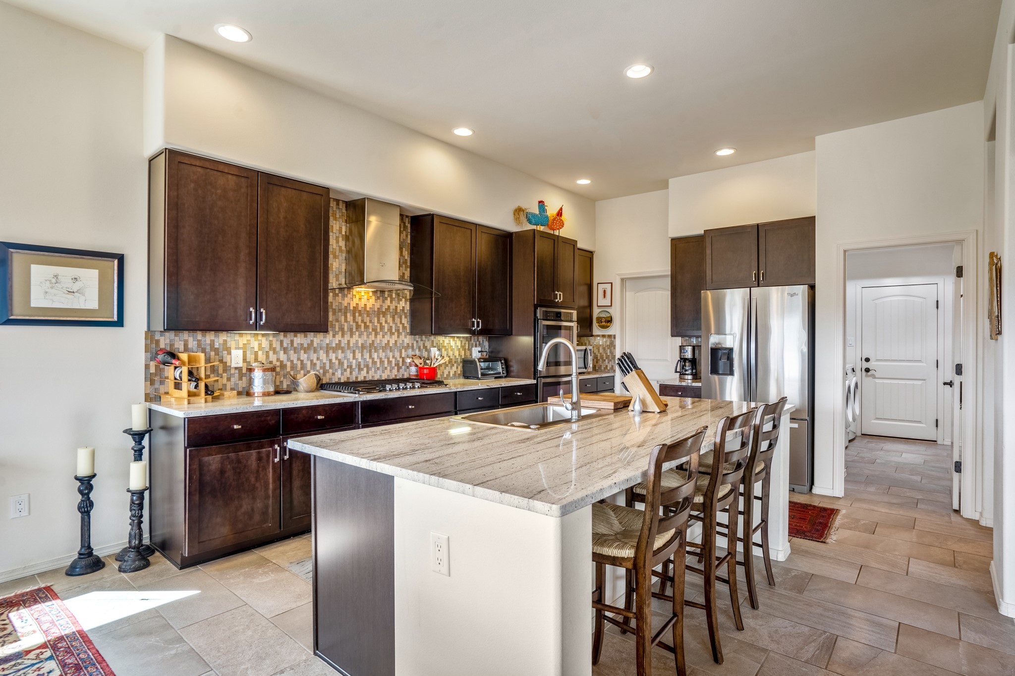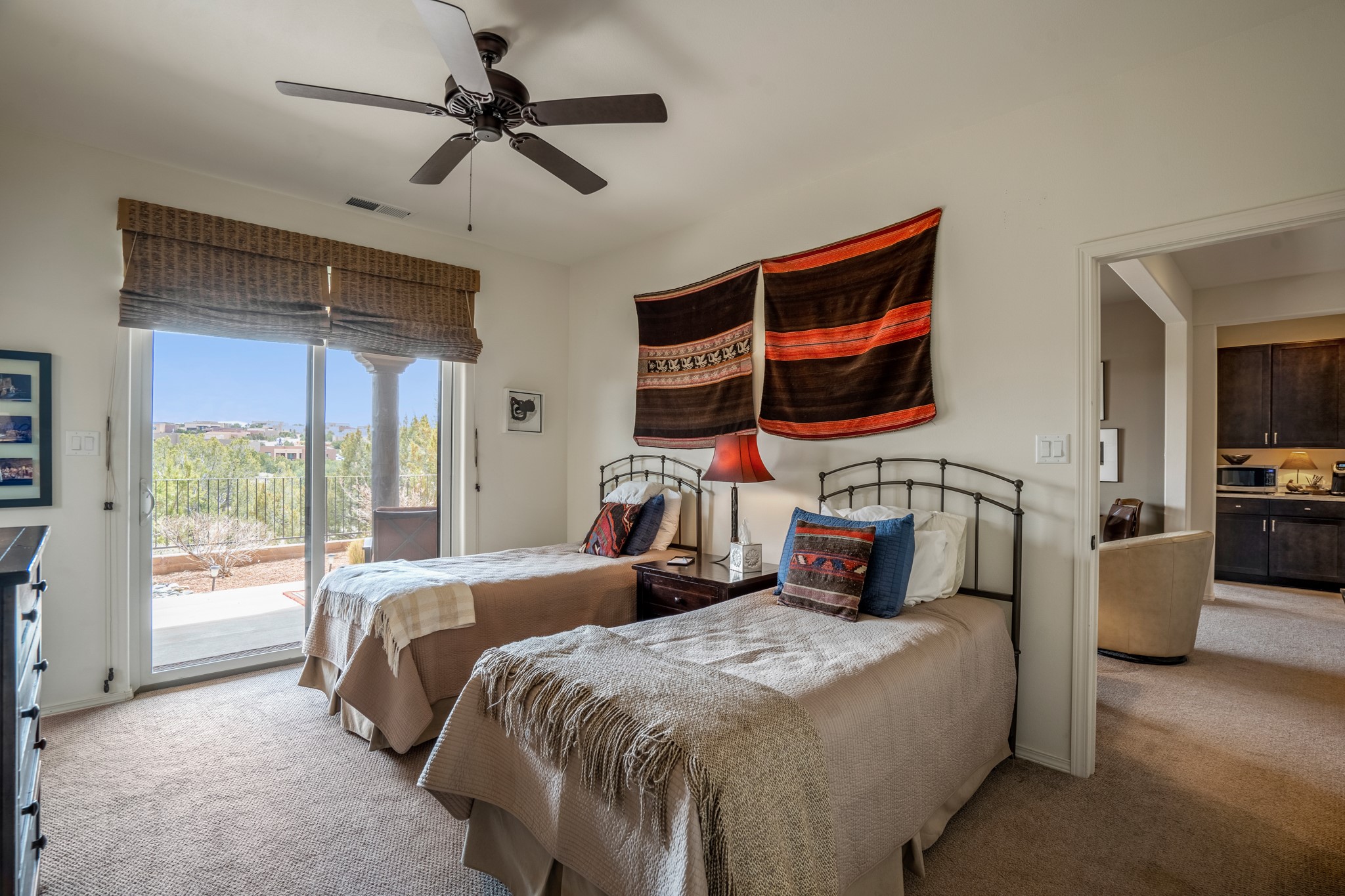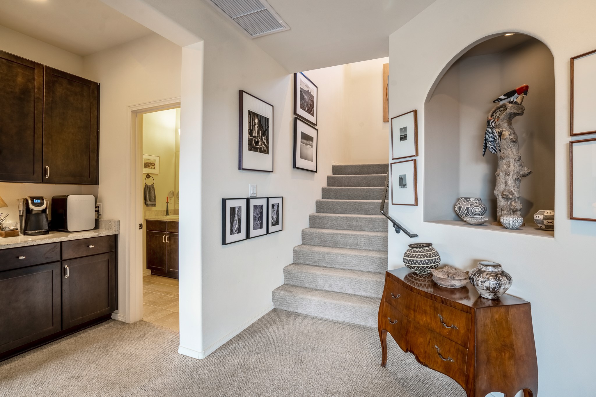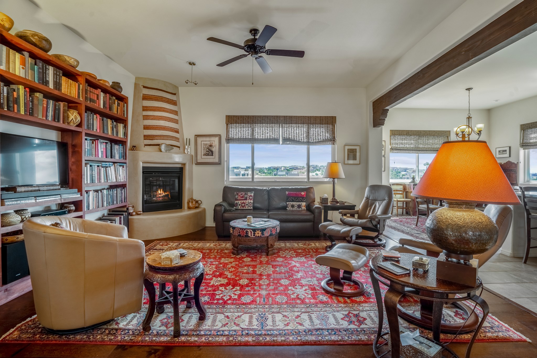 Located in the big-view neighborhood of Tessera on the west side of Santa Fe, this landscaped 3 bedroom, 4 bath home is move-in ready and is nicely situated at the end of a quiet cul de sac. At just under 2500 square feet of living space, this Aspen model floor plan provides plenty of room and privacy for you and your family and guests. The split-level design allows its owners to live on one level with the primary bedroom suite, the living/dining, kitchen, garage and a lovely, covered portal all on the entry level. Downstairs, you will find a large den or office space and two generously-sized bedrooms. Each has their own full bathroom as well as direct access to the rear patio/portal. The kitchen features a large island, stainless appliances, a generous pantry and bar seating. The main-level covered deck is an upgraded feature of this home with beautiful dark wood vigas, posts and string lighting. This space allows you to enjoy the outdoors day or evening with grand views of the Sangre de Cristo mountains. Other upgrades include beautiful grass-cloth window treatments throughout the home, engineered wood floors and paint colors with specialized lighting that accentuate your Santa Fe art collection. Built in 2015, this home is ready for its new owners to move right in. The Tessera subdivision offers walking trails, beautiful 360 degree views and a short 10 minute drive to town.
