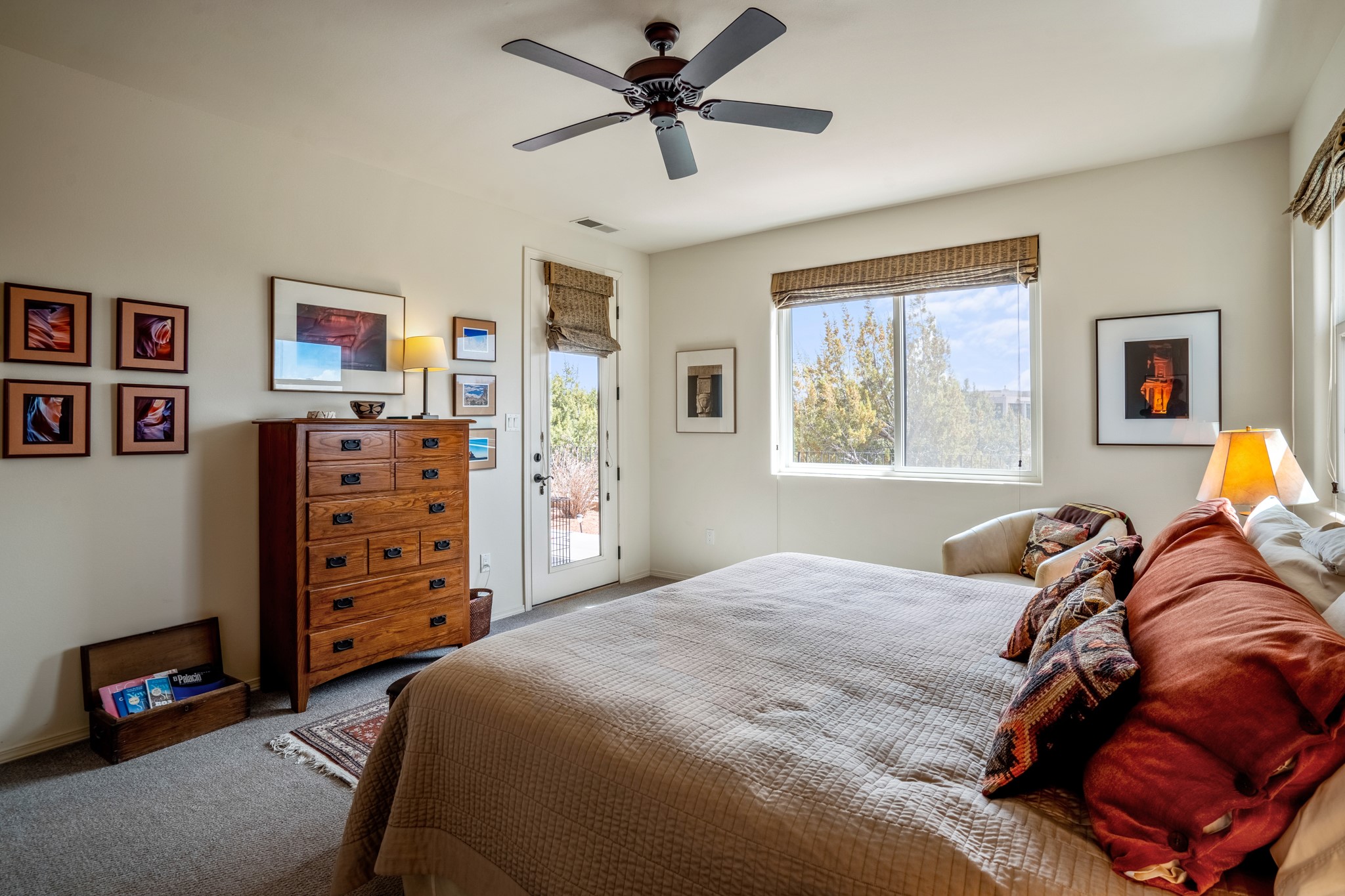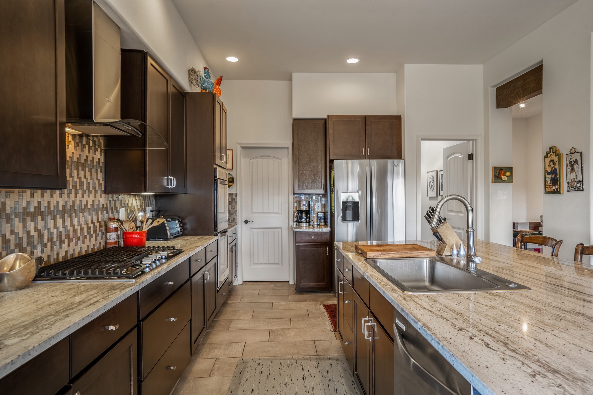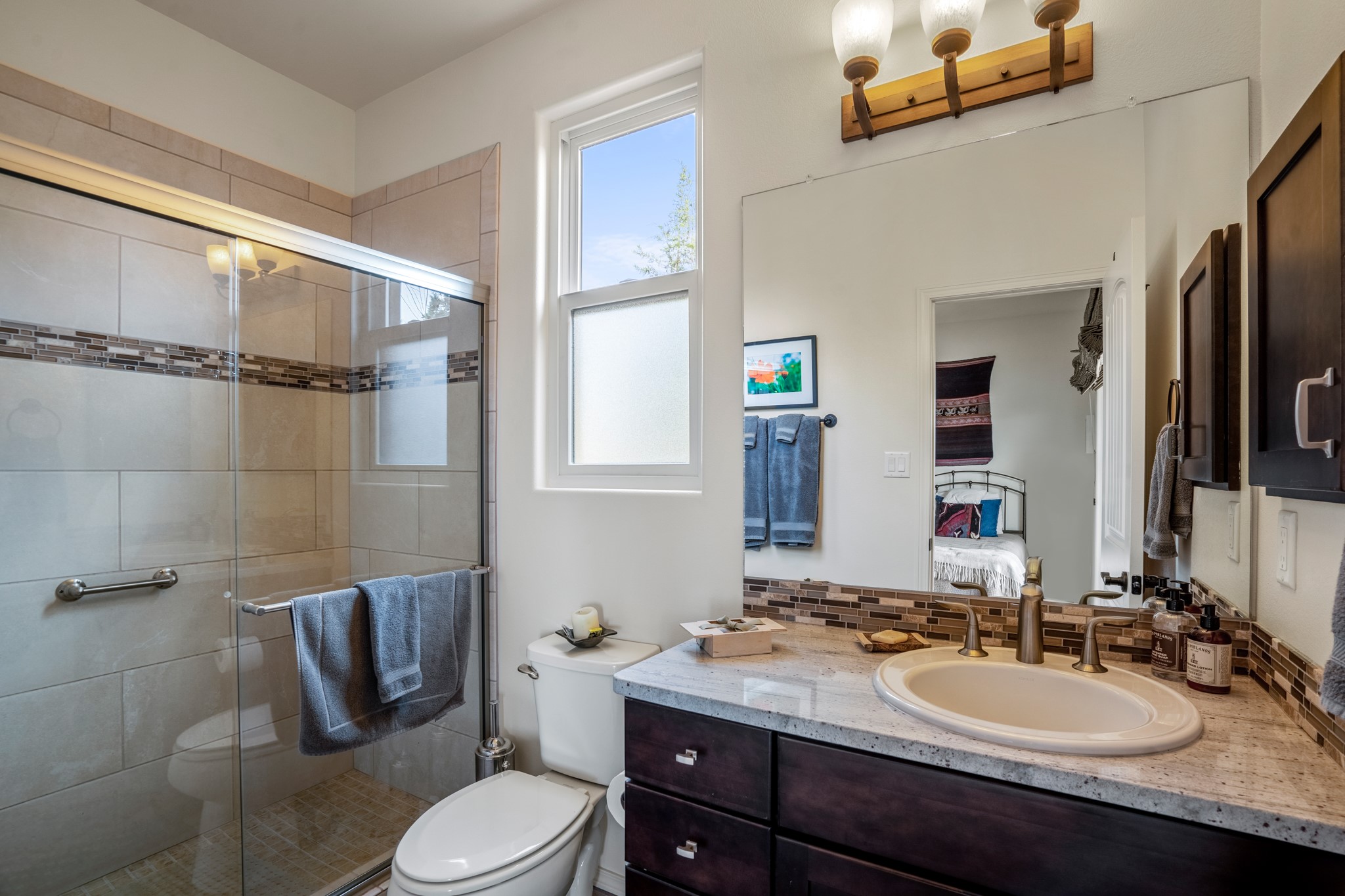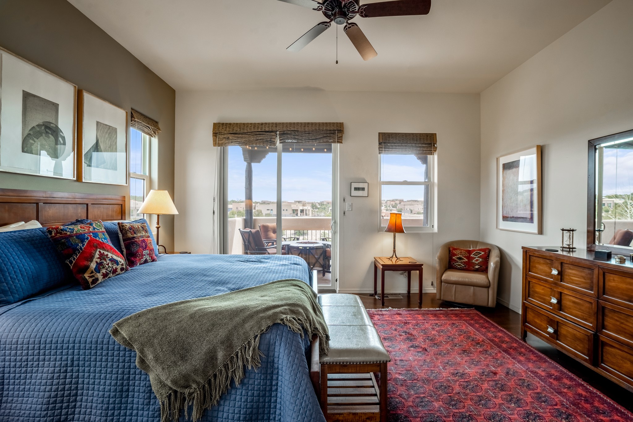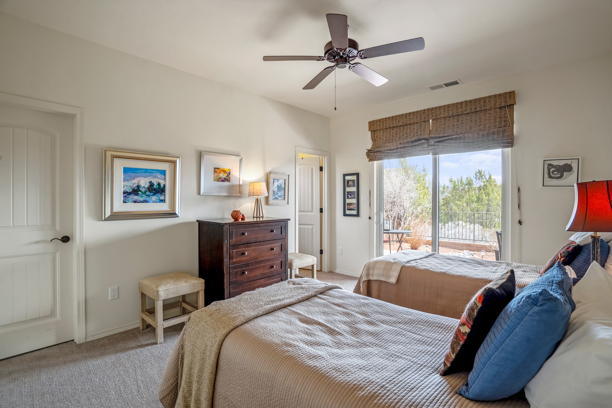 Located in the big-view neighborhood of Tessera on the west side of Santa Fe, this landscaped 3 bedroom, 4 bath home is move-in ready and is nicely situated at the end of a quiet cul de sac. At just under 2500 square feet of living space, this Aspen model floor plan provides plenty of room and privacy for you and your family and guests. The split-level design allows its owners to live on one level with the primary bedroom suite, the living/dining, kitchen, garage and a lovely, covered portal all on the entry level. Downstairs, you will find a large den or office space and two generously-sized bedrooms. Each has their own full bathroom as well as direct access to the rear patio/portal. The kitchen features a large island, stainless appliances, a generous pantry and bar seating. The main-level covered deck is an upgraded feature of this home with beautiful dark wood vigas, posts and string lighting. This space allows you to enjoy the outdoors day or evening with grand views of the Sangre de Cristo mountains. Other upgrades include beautiful grass-cloth window treatments throughout the home, engineered wood floors and paint colors with specialized lighting that accentuate your Santa Fe art collection. Built in 2015, this home is ready for its new owners to move right in. The Tessera subdivision offers walking trails, beautiful 360 degree views and a short 10 minute drive to town.