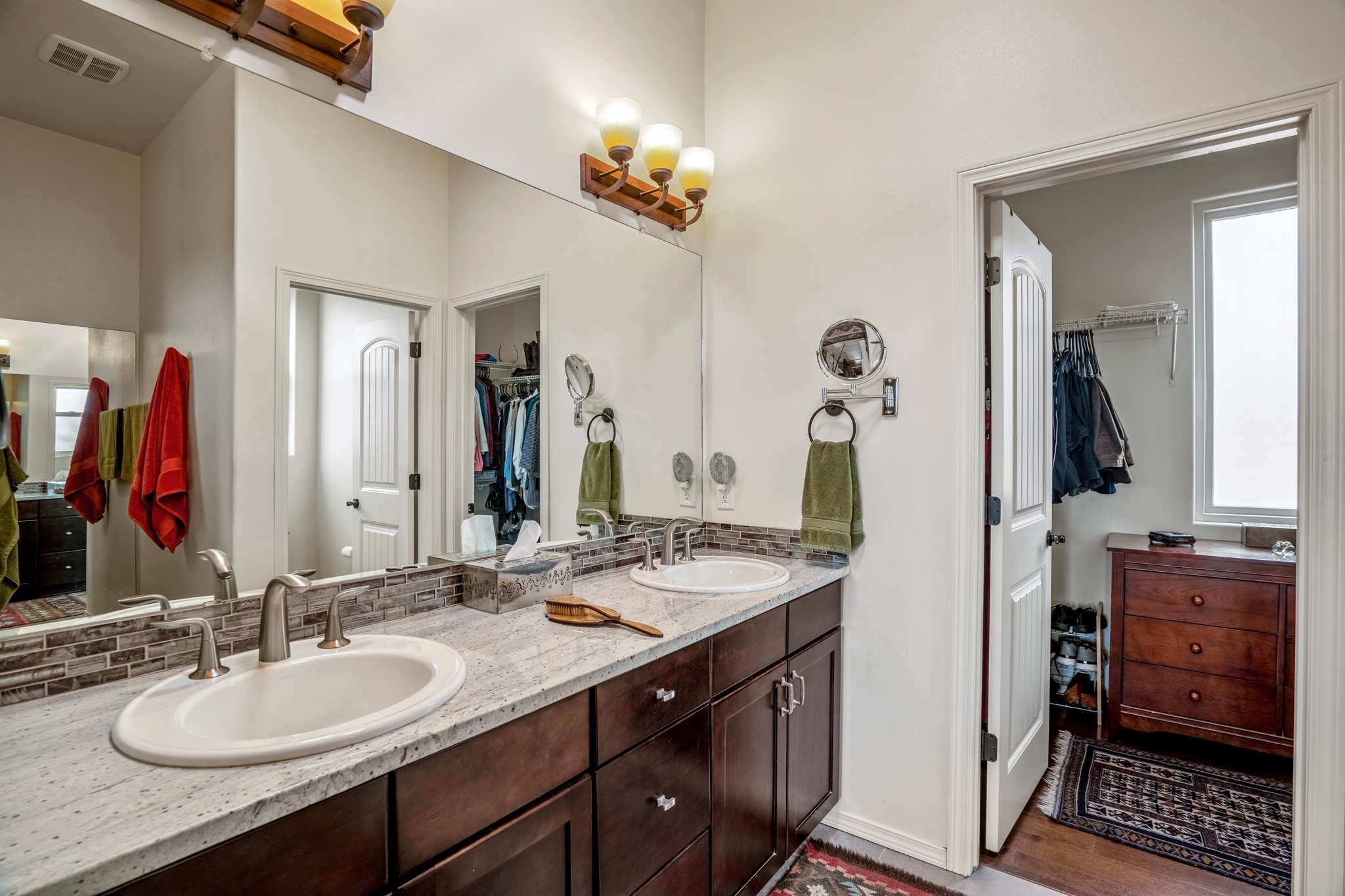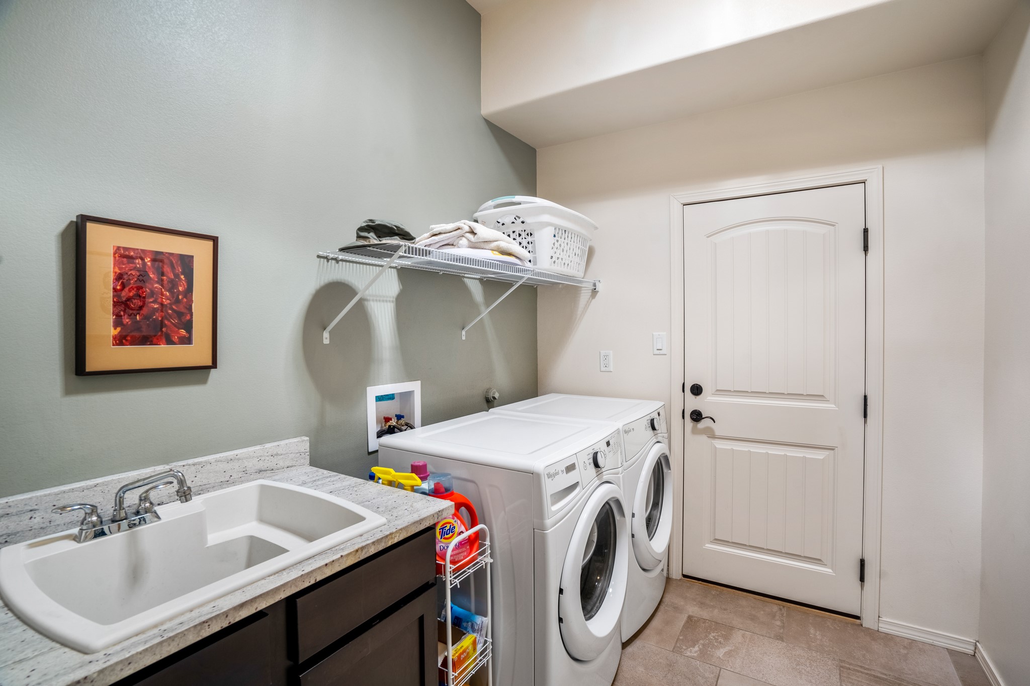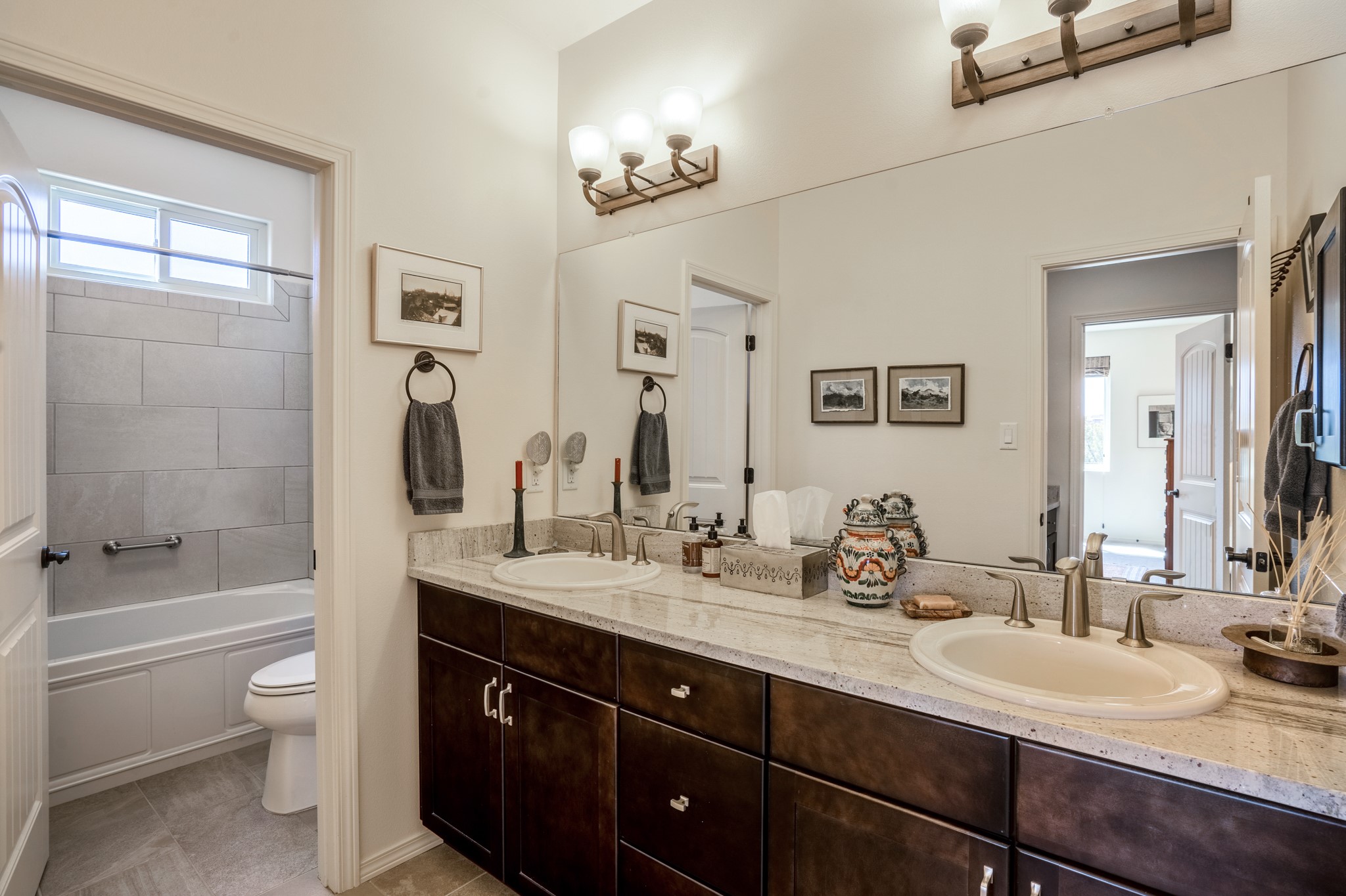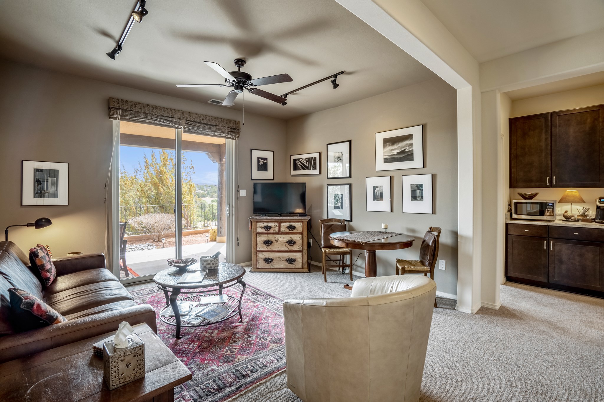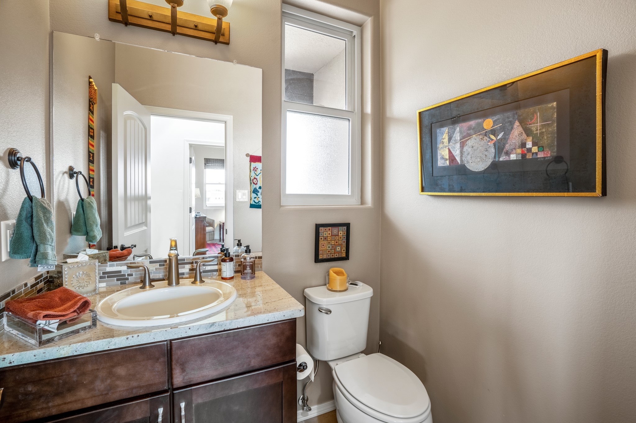 Located in the big-view neighborhood of Tessera on the west side of Santa Fe, this landscaped 3 bedroom, 4 bath home is move-in ready and is nicely situated at the end of a quiet cul de sac. At just under 2500 square feet of living space, this Aspen model floor plan provides plenty of room and privacy for you and your family and guests. The split-level design allows its owners to live on one level with the primary bedroom suite, the living/dining, kitchen, garage and a lovely, covered portal all on the entry level. Downstairs, you will find a large den or office space and two generously-sized bedrooms. Each has their own full bathroom as well as direct access to the rear patio/portal. The kitchen features a large island, stainless appliances, a generous pantry and bar seating. The main-level covered deck is an upgraded feature of this home with beautiful dark wood vigas, posts and string lighting. This space allows you to enjoy the outdoors day or evening with grand views of the Sangre de Cristo mountains. Other upgrades include beautiful grass-cloth window treatments throughout the home, engineered wood floors and paint colors with specialized lighting that accentuate your Santa Fe art collection. Built in 2015, this home is ready for its new owners to move right in. The Tessera subdivision offers walking trails, beautiful 360 degree views and a short 10 minute drive to town.