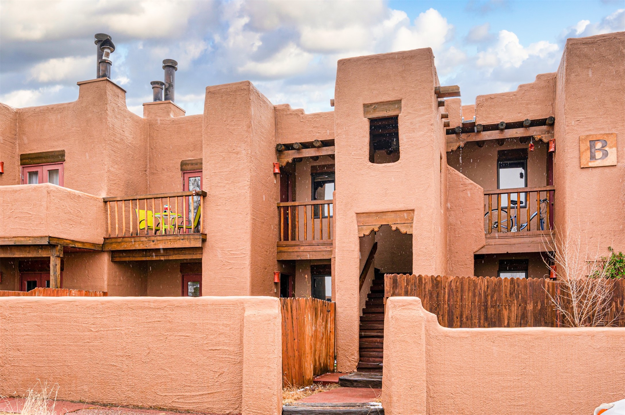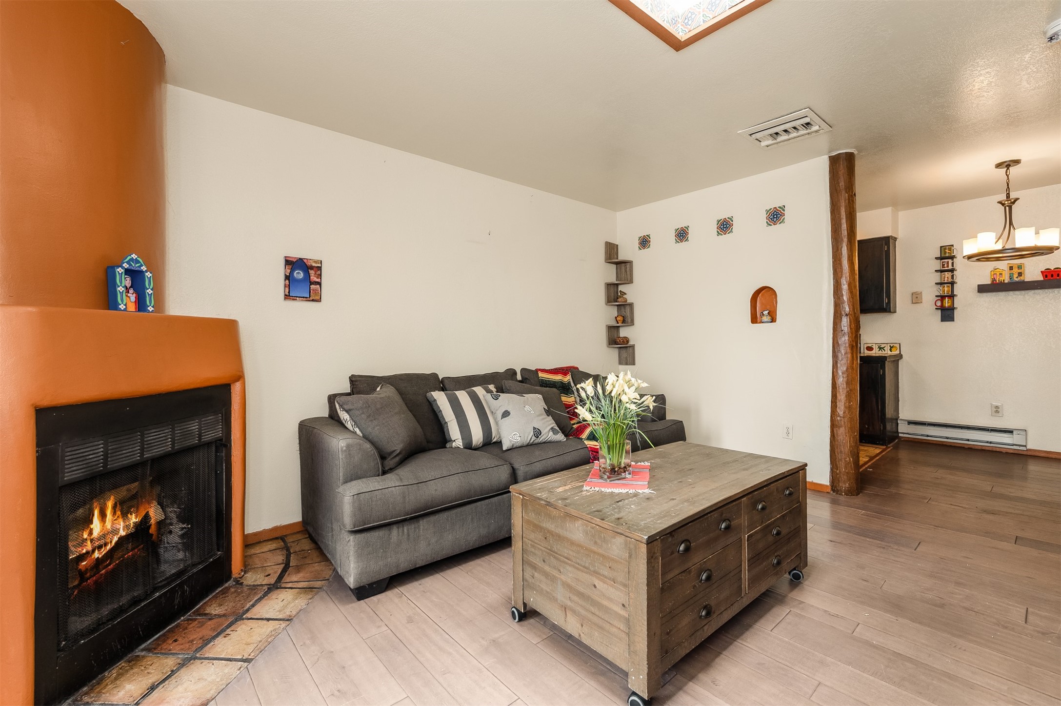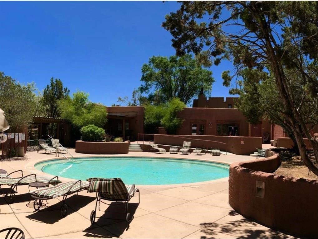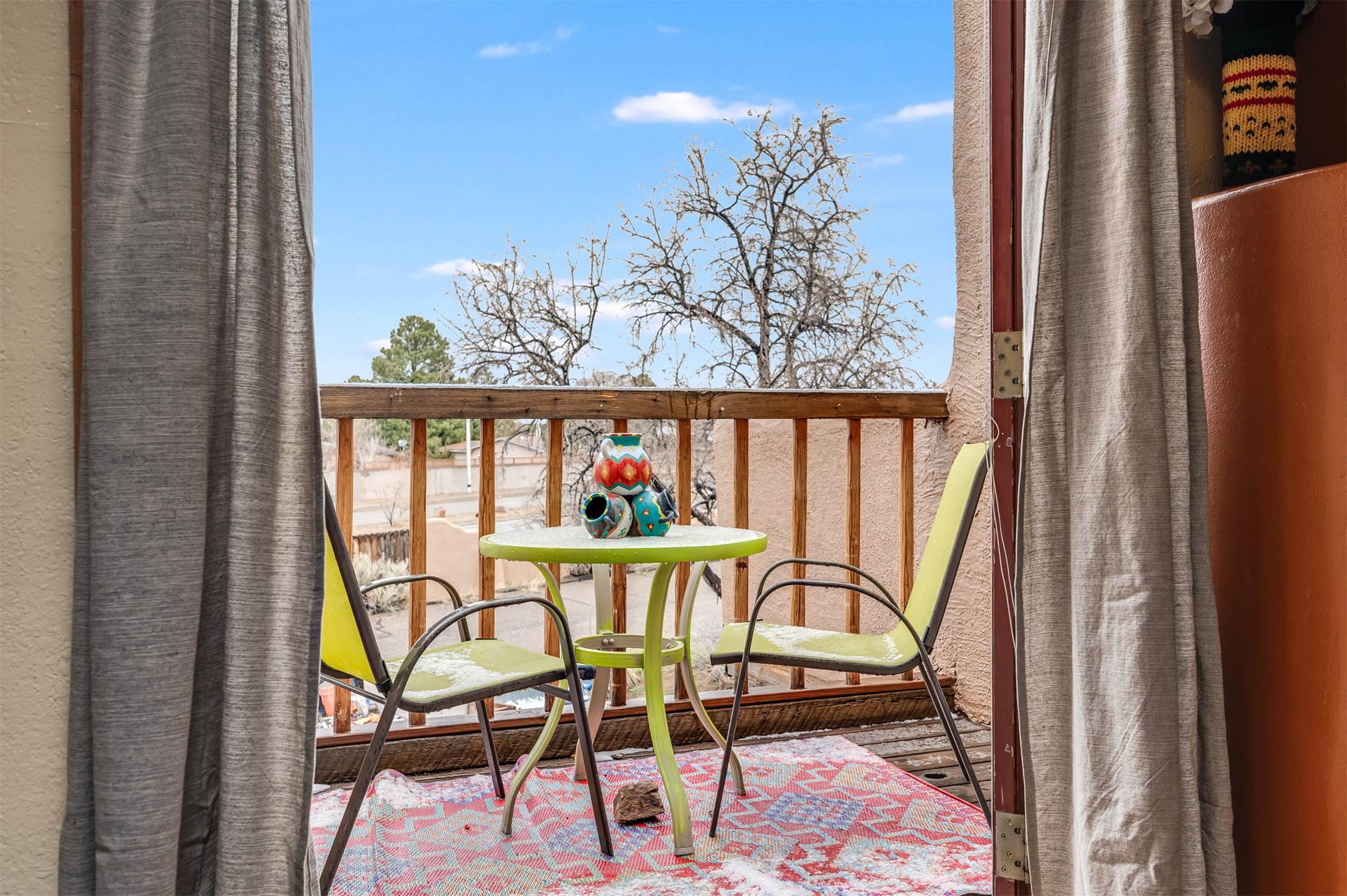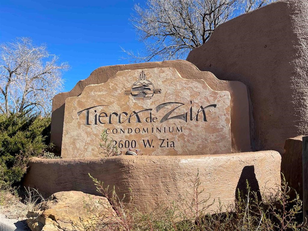 This 2nd floor, 1 bedroom, 1 bath unit is the perfect pied-a-terre or sweet small home with rustic, country-life finishes. Kitchen features newer stainless steel appliances and counters with cheerful, vintage tropical fruit-themed tile. The living room features a beautiful kiva fireplace and a large skylight which brightens the entire unit. Nichos and display shelves adorn the walls. Laminate wood floors throughout the unit except for tile in the bath and kitchen. The unit has a large walk-in closet with lots of vertical storage and another large closet in the living room that you can outfit to your specific needs. French doors open onto a sweet balcony perfect for outdoor dining or lounging. The unit has one assigned parking space located directly in front of the staircase. Tierra de Zia Condominiums comprise 149 units and condos spread over 13.5 acres of native plantings and trees, arroyos, fish ponds, and wooden bridges. Further amenities include a heated swimming pool, sauna, BBQ area, fully equipped laundry facility, community room and a planned dog run. Tierra de Zia is gated for additional privacy and security and is a non-smoking community.