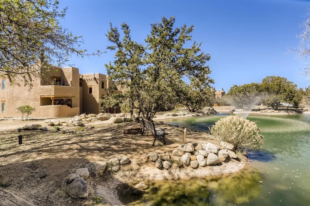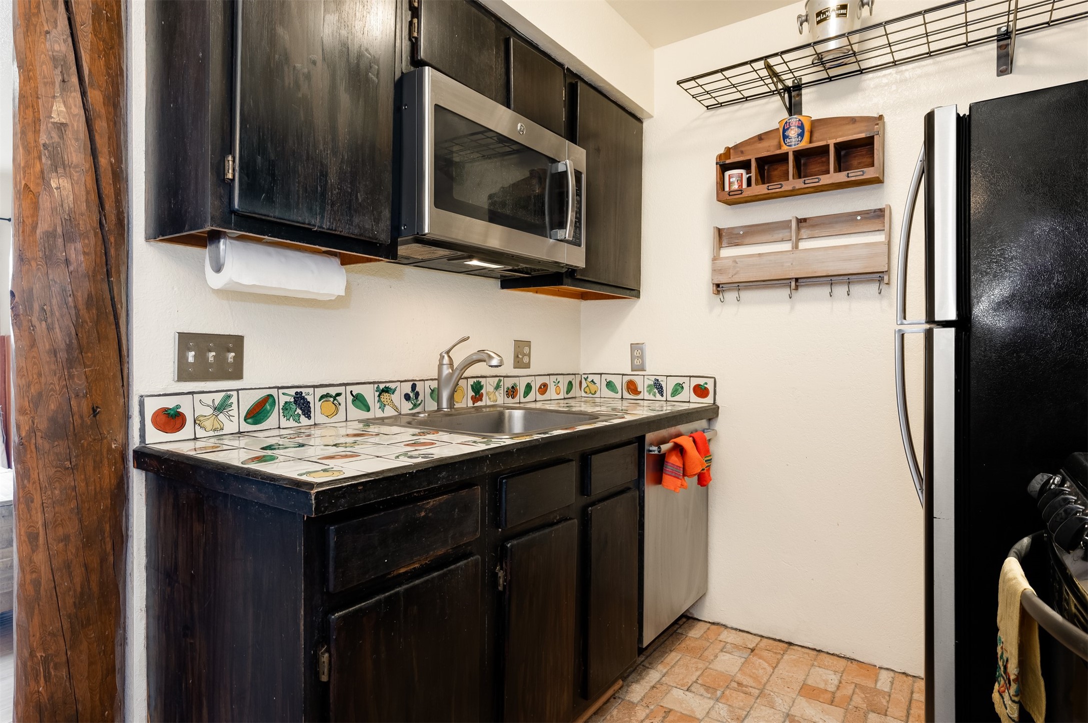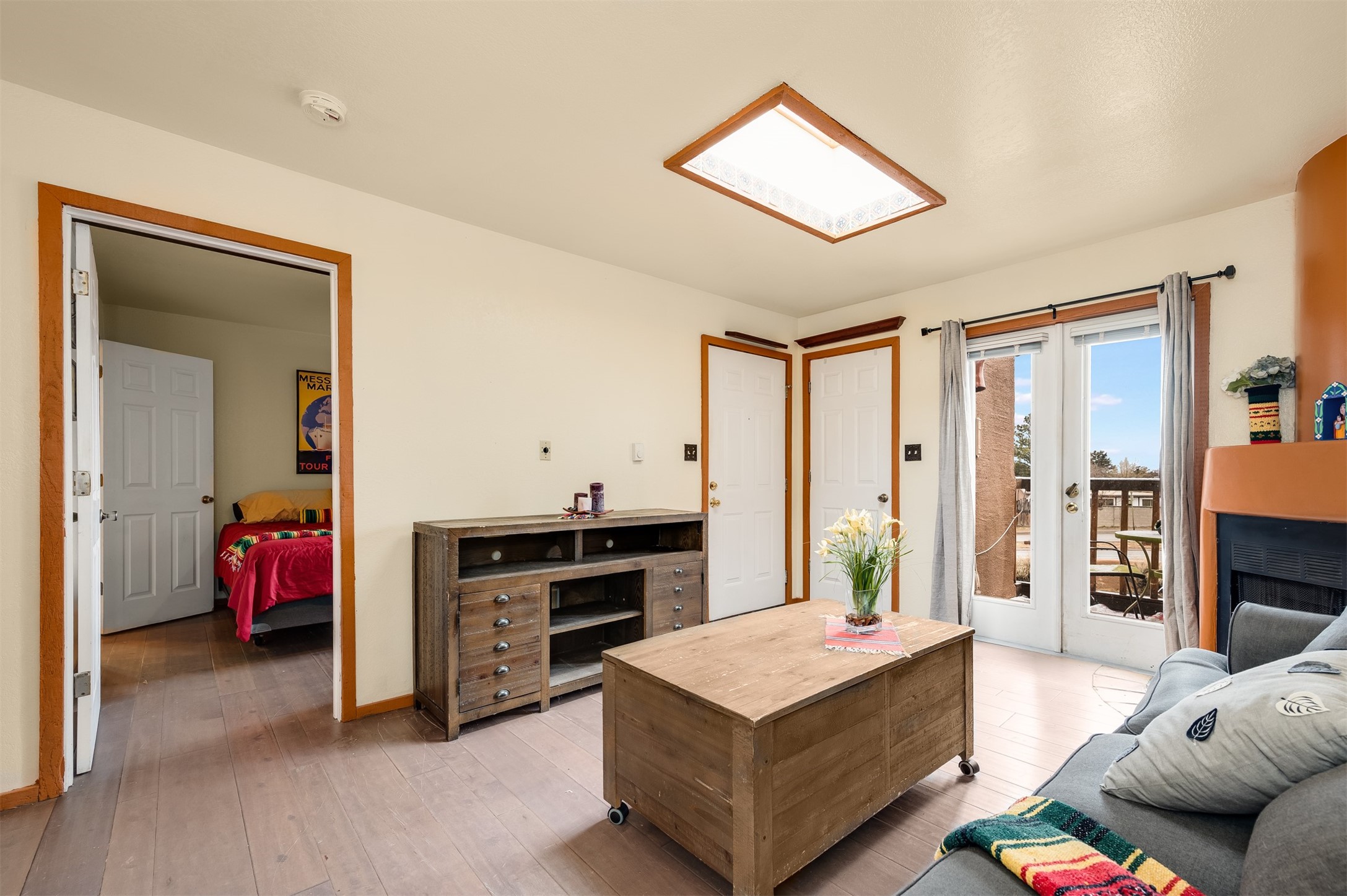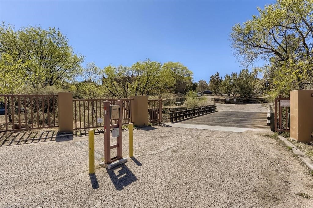 This 2nd floor, 1 bedroom, 1 bath unit is the perfect pied-a-terre or sweet small home with rustic, country-life finishes. Kitchen features newer stainless steel appliances and counters with cheerful, vintage tropical fruit-themed tile. The living room features a beautiful kiva fireplace and a large skylight which brightens the entire unit. Nichos and display shelves adorn the walls. Laminate wood floors throughout the unit except for tile in the bath and kitchen. The unit has a large walk-in closet with lots of vertical storage and another large closet in the living room that you can outfit to your specific needs. French doors open onto a sweet balcony perfect for outdoor dining or lounging. The unit has one assigned parking space located directly in front of the staircase. Tierra de Zia Condominiums comprise 149 units and condos spread over 13.5 acres of native plantings and trees, arroyos, fish ponds, and wooden bridges. Further amenities include a heated swimming pool, sauna, BBQ area, fully equipped laundry facility, community room and a planned dog run. Tierra de Zia is gated for additional privacy and security and is a non-smoking community.