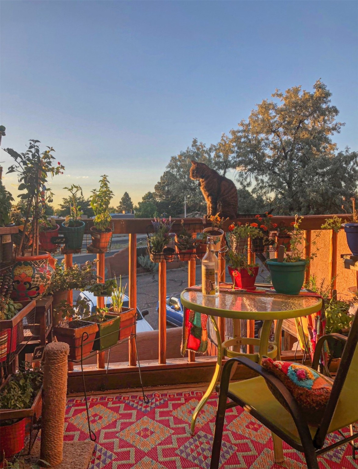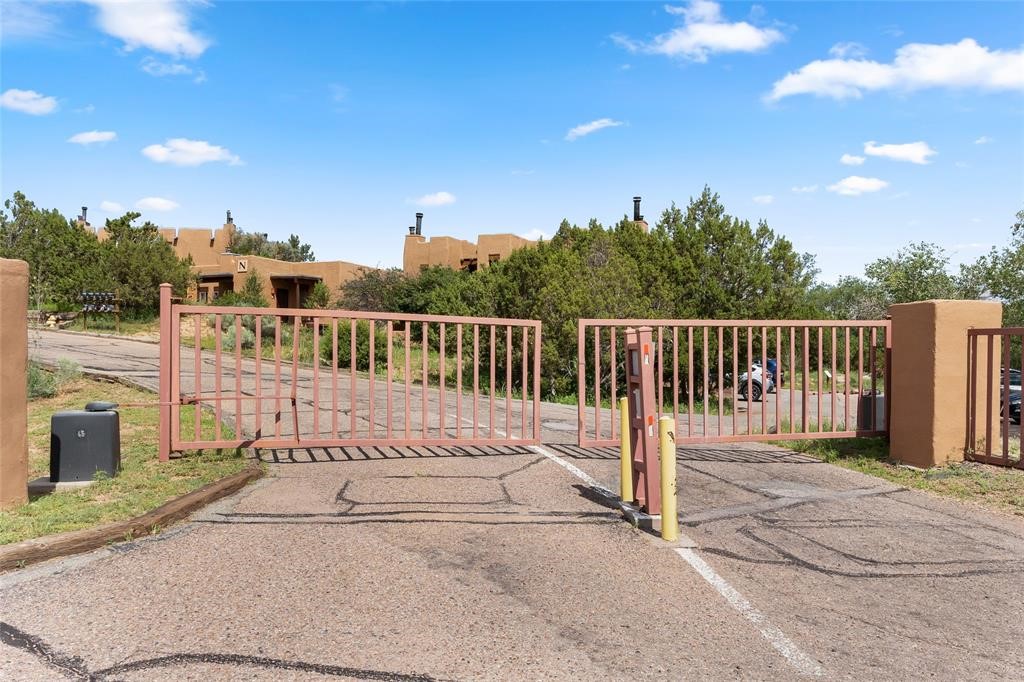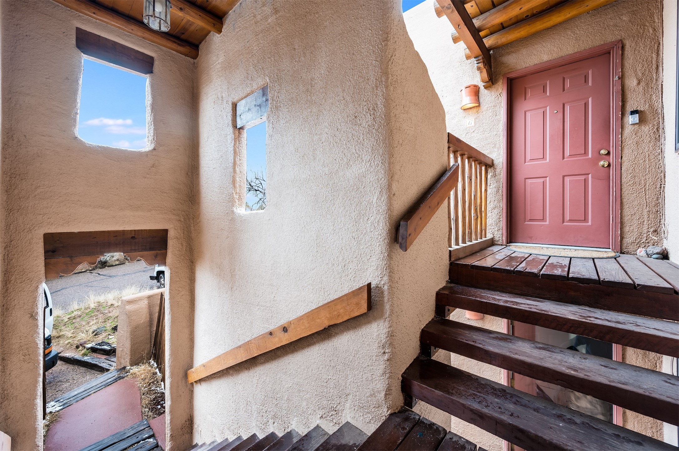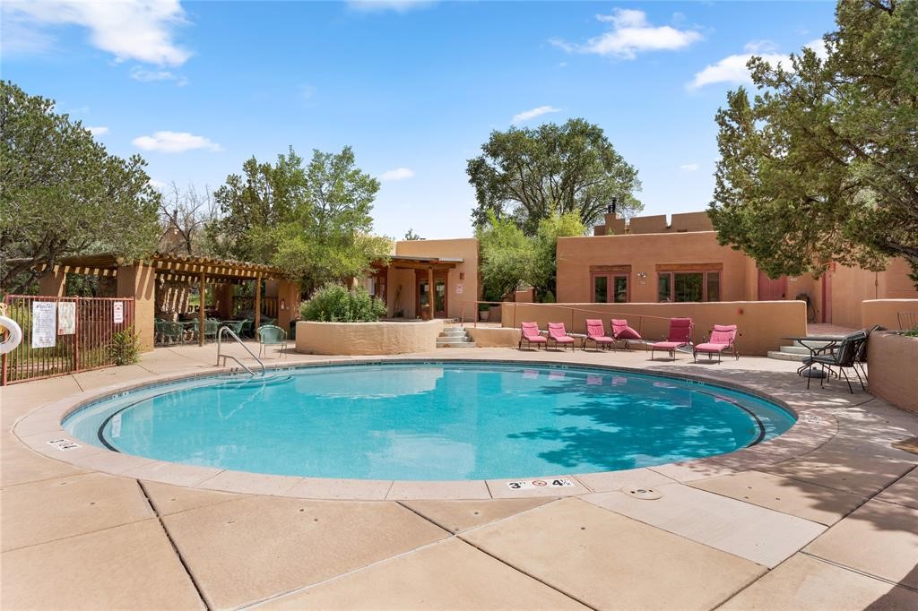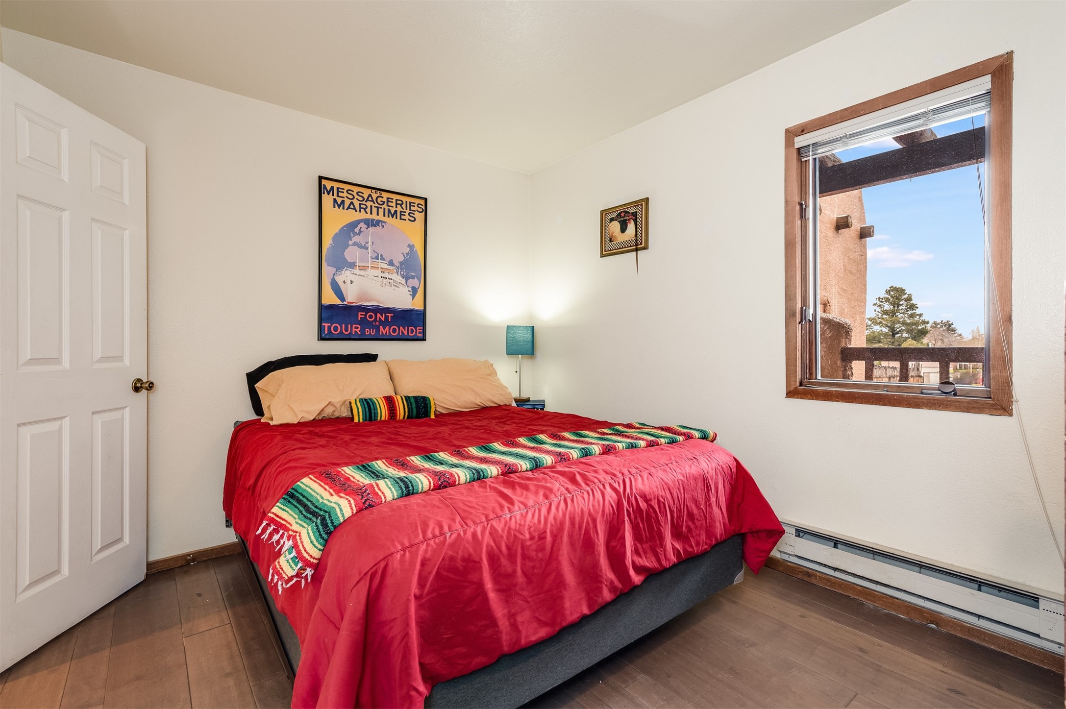This 2nd floor, 1 bedroom, 1 bath unit is the perfect pied-a-terre or sweet small home with rustic, country-life finishes. Kitchen features newer stainless steel appliances and counters with cheerful, vintage tropical fruit-themed tile. The living room features a beautiful kiva fireplace and a large skylight which brightens the entire unit. Nichos and display shelves adorn the walls. Laminate wood floors throughout the unit except for tile in the bath and kitchen. The unit has a large walk-in closet with lots of vertical storage and another large closet in the living room that you can outfit to your specific needs. French doors open onto a sweet balcony perfect for outdoor dining or lounging. The unit has one assigned parking space located directly in front of the staircase. Tierra de Zia Condominiums comprise 149 units and condos spread over 13.5 acres of native plantings and trees, arroyos, fish ponds, and wooden bridges. Further amenities include a heated swimming pool, sauna, BBQ area, fully equipped laundry facility, community room and a planned dog run. Tierra de Zia is gated for additional privacy and security and is a non-smoking community.