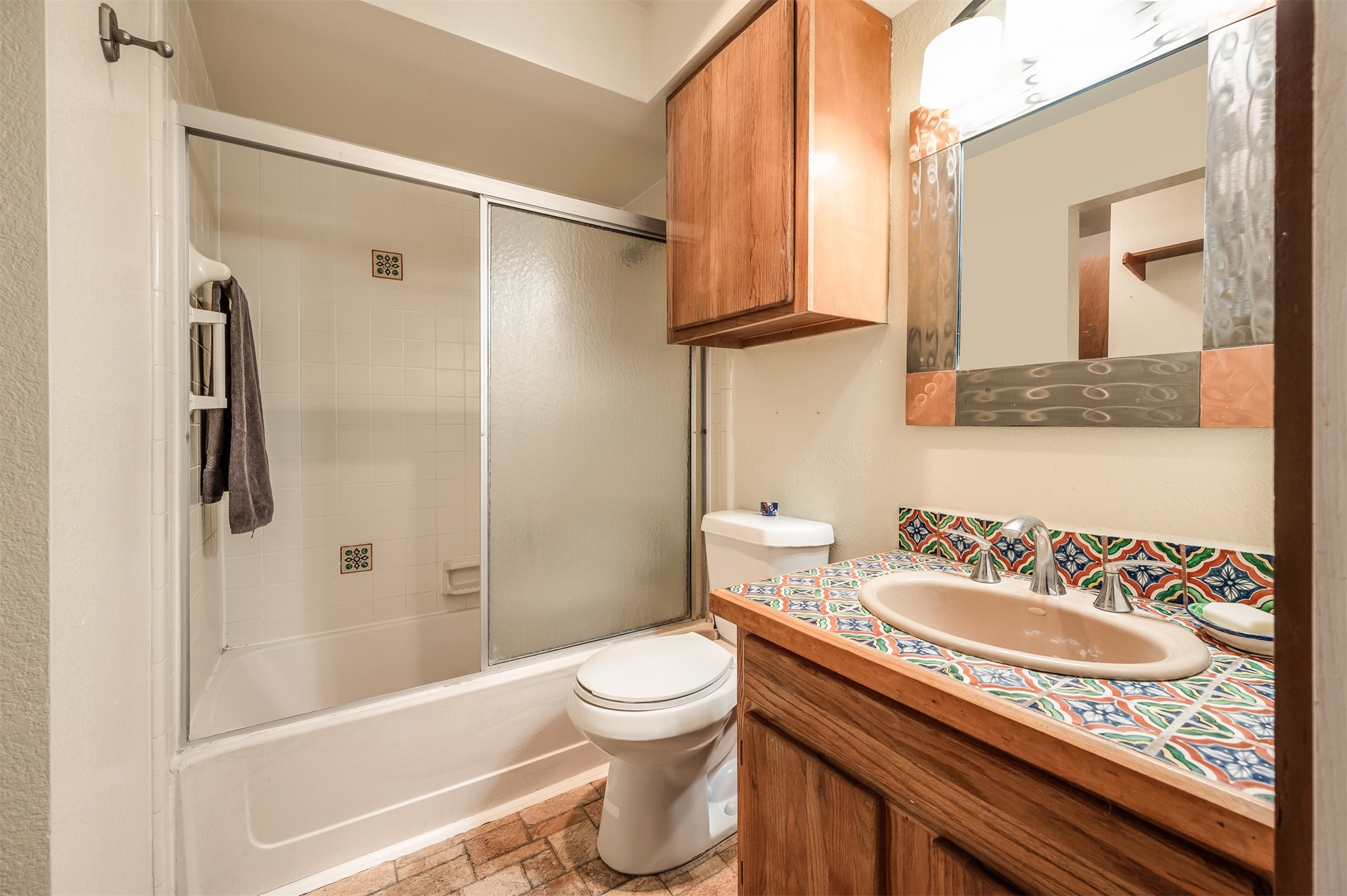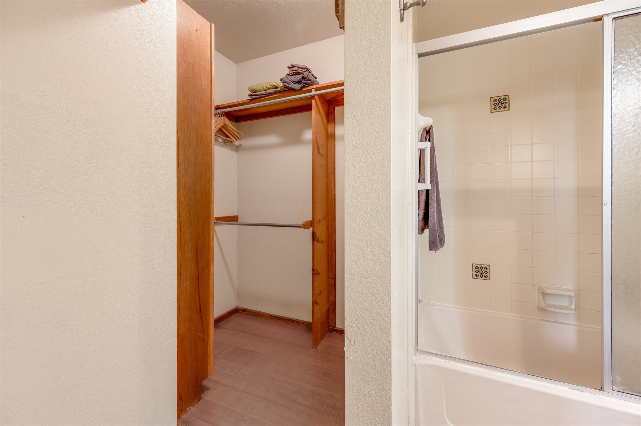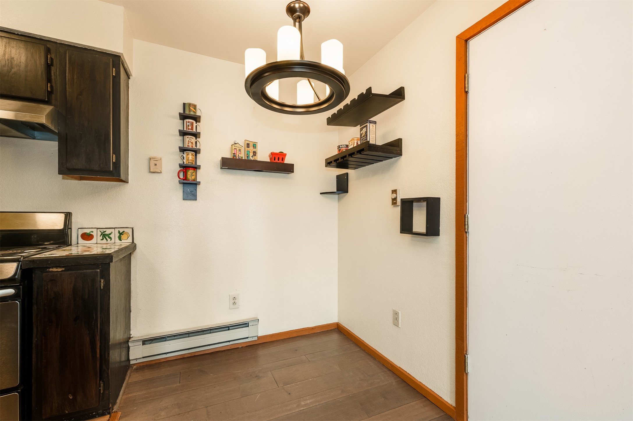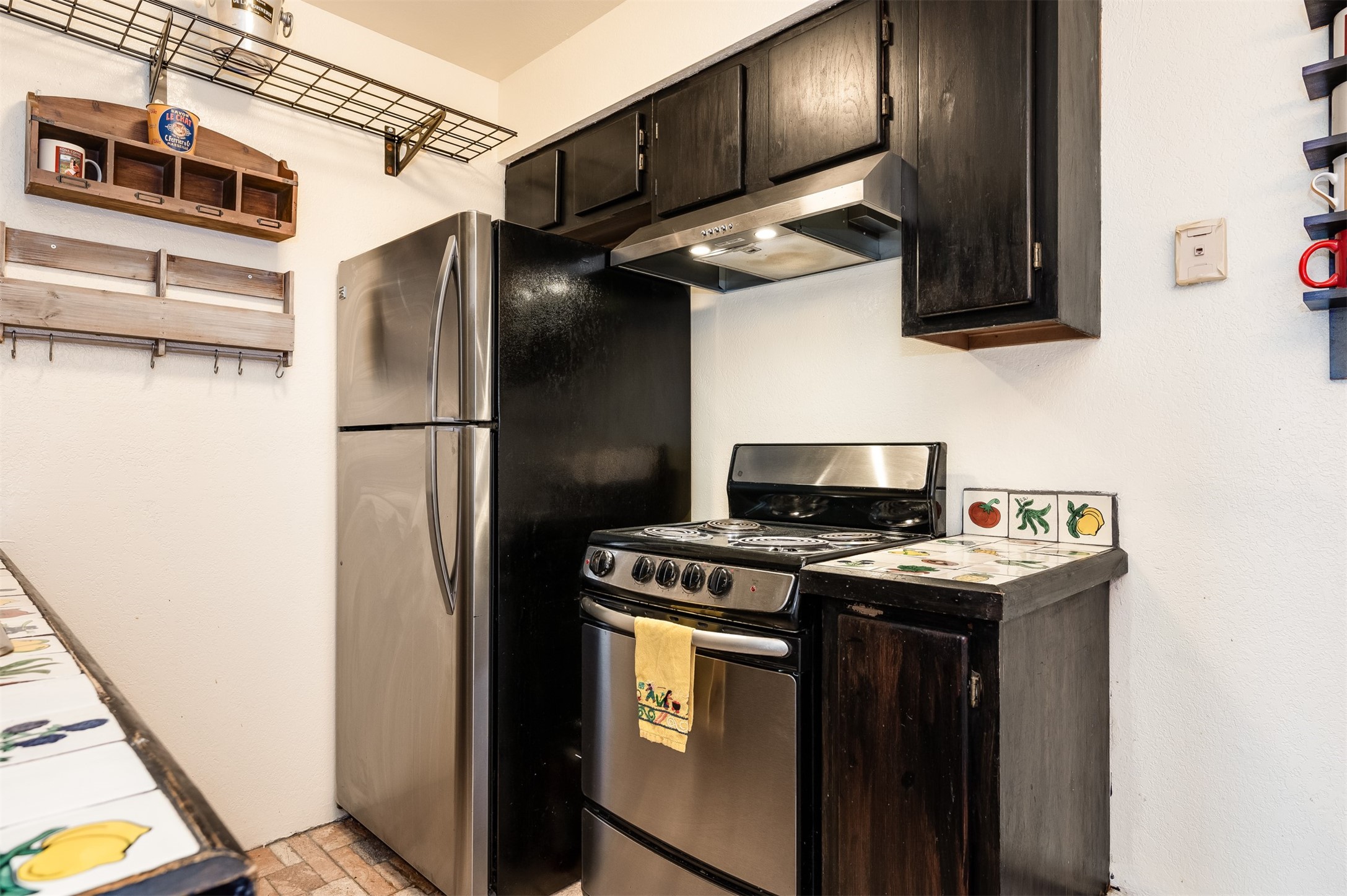 This 2nd floor, 1 bedroom, 1 bath unit is the perfect pied-a-terre or sweet small home with rustic, country-life finishes. Kitchen features newer stainless steel appliances and counters with cheerful, vintage tropical fruit-themed tile. The living room features a beautiful kiva fireplace and a large skylight which brightens the entire unit. Nichos and display shelves adorn the walls. Laminate wood floors throughout the unit except for tile in the bath and kitchen. The unit has a large walk-in closet with lots of vertical storage and another large closet in the living room that you can outfit to your specific needs. French doors open onto a sweet balcony perfect for outdoor dining or lounging. The unit has one assigned parking space located directly in front of the staircase. Tierra de Zia Condominiums comprise 149 units and condos spread over 13.5 acres of native plantings and trees, arroyos, fish ponds, and wooden bridges. Further amenities include a heated swimming pool, sauna, BBQ area, fully equipped laundry facility, community room and a planned dog run. Tierra de Zia is gated for additional privacy and security and is a non-smoking community.