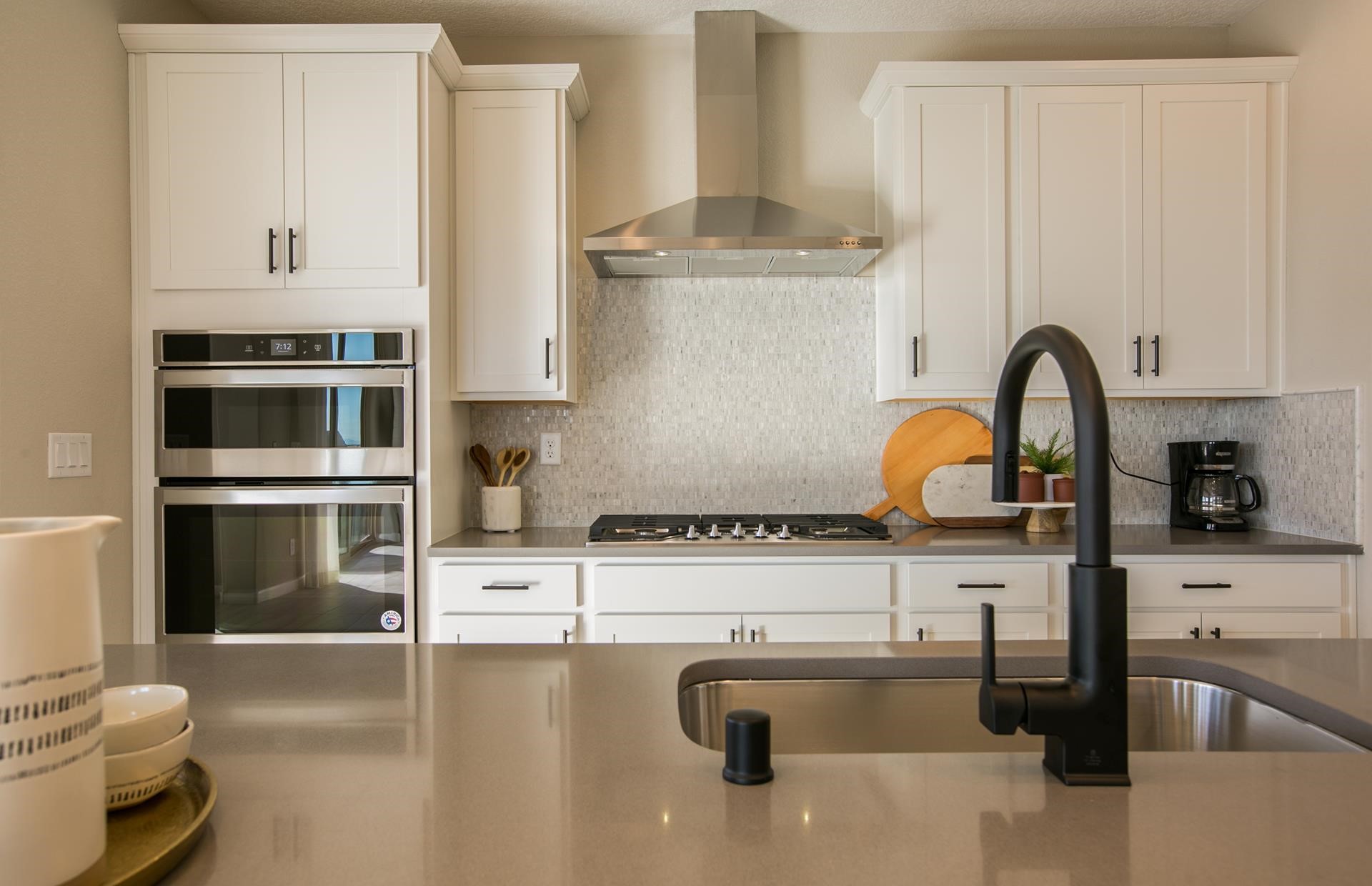 This "Tifton Walk" home layout features a long entry way with the secondary bedrooms in the front of the home and the owner's suite in the back. A full two car garage with a garage hobby package that includes additional outlets and fluorescent lights, and a garage service door that connects to the backyard. This home is located on a private home site and includes an extended covered patio that makes enjoying the outdoors even better! The owner's suite features a bay window, a door separating the bedroom and bathroom, large walk-in closet, double sink vanity, and a separate freestanding white tub with a walk-in shower. The kitchen will have white cabinets with quartz countertops and upgraded grey tile flooring. This upgraded chef kitchen package includes a built-in gas cooktop, hood vent, built in microwave and oven. The kitchen island is a spacious and multifunctional space with plenty of room to enjoy! This home is in the Pulte Homes community Colibri that has easy access to HWY 599 and I25. Colibri features community parks, walking trails, and beautifully landscaped common areas maintained by the HOA