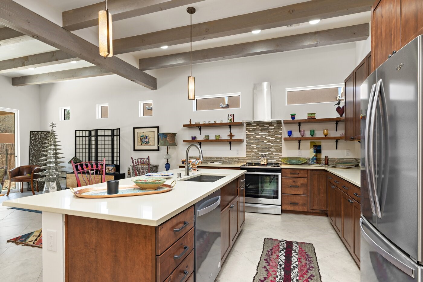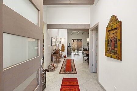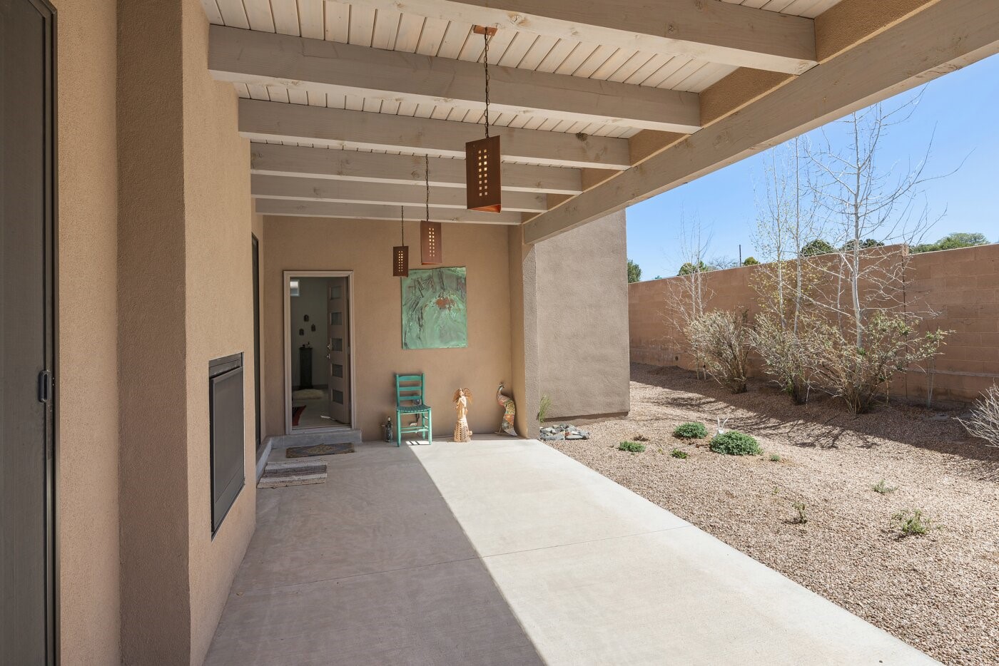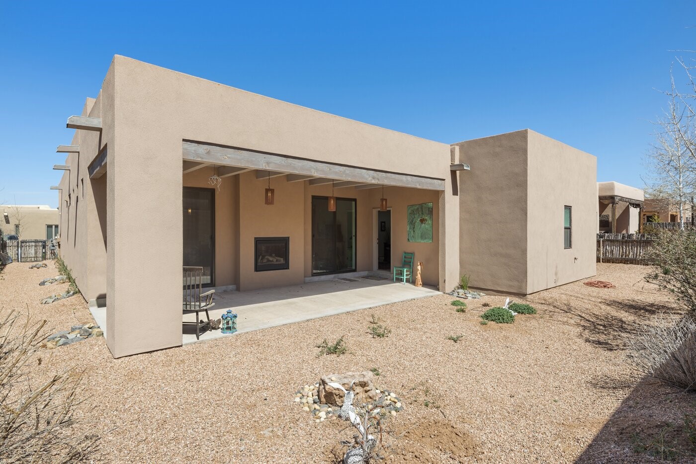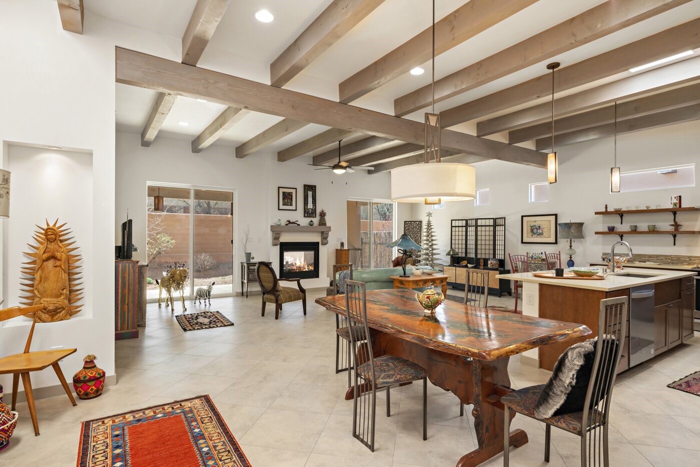 Beautiful open concept home that was rarely used since it's completion in 2018 and only minutes to downtown Santa Fe. Natural light is in abundance in this open concept home with multiple skylights and double glass doors leading to an inviting back courtyard. Multiple luxury features are an added bonus to this centrally located home. You are so close to many of Santa Fe's restaurants, fitness facilities, shopping, and only blocks from major hospital and medical facilities. Wonderful separation of the large main suite and the guestrooms for added privacy. A dual sided fireplace brings relaxing enjoyment inside the home and in the back courtyard.