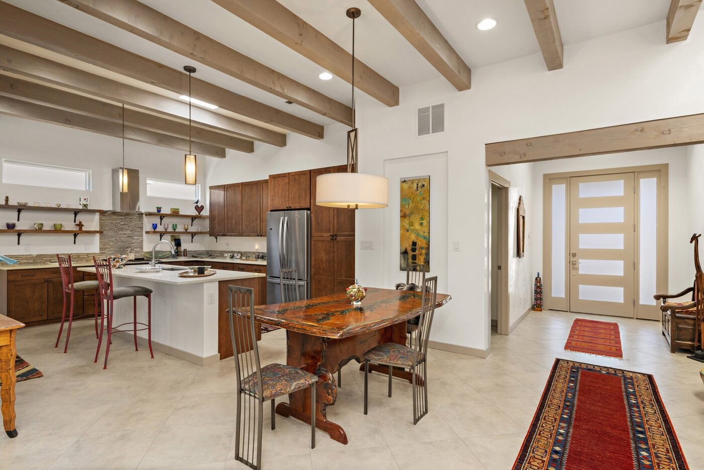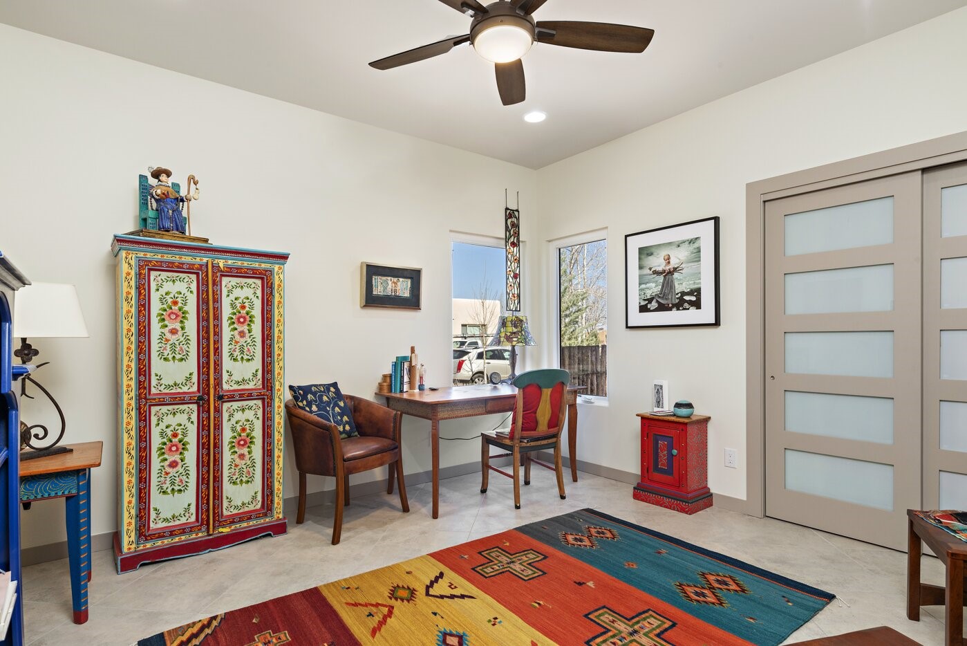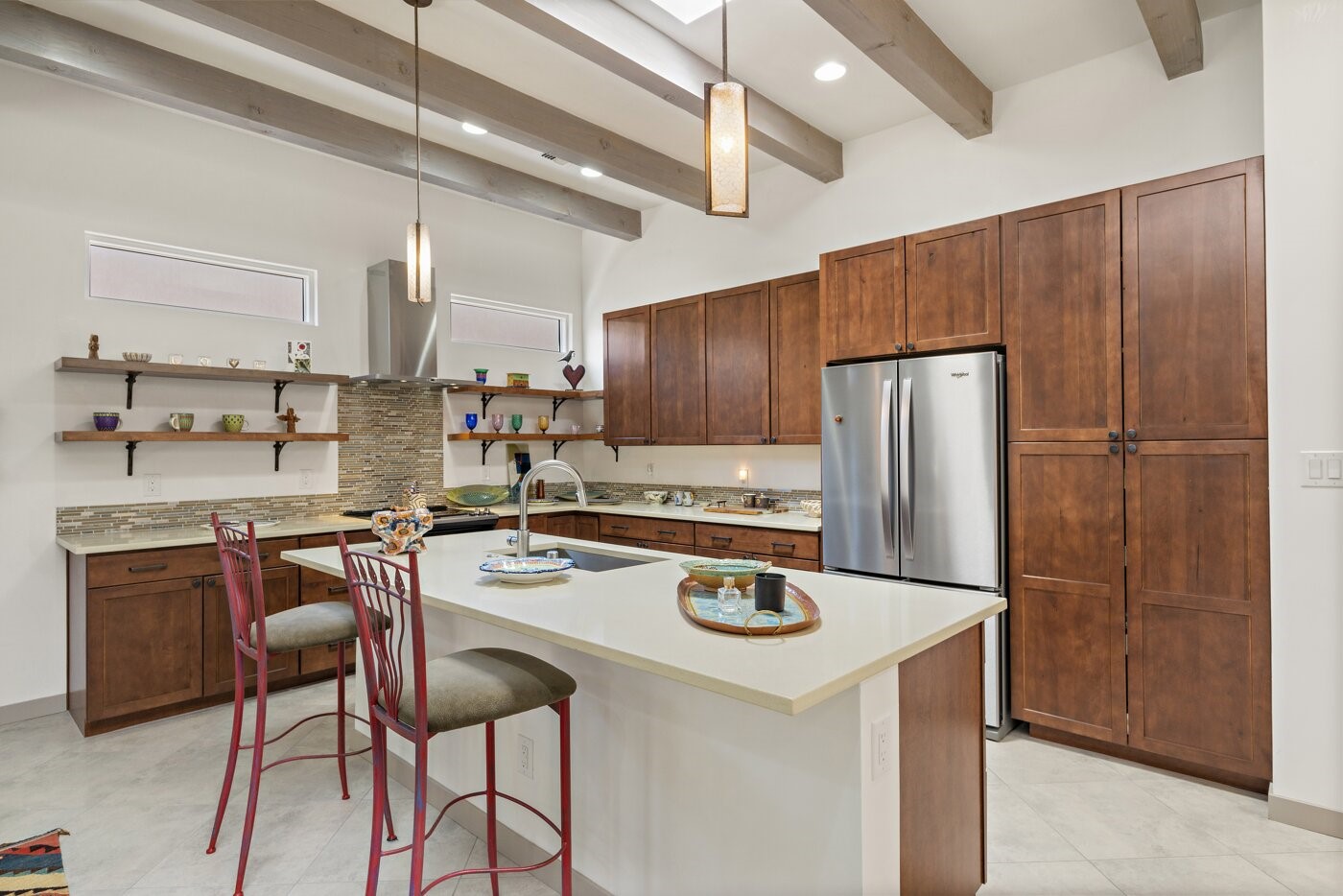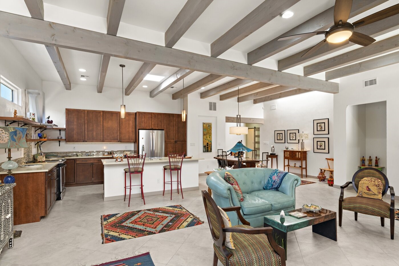 Beautiful open concept home that was rarely used since it's completion in 2018 and only minutes to downtown Santa Fe. Natural light is in abundance in this open concept home with multiple skylights and double glass doors leading to an inviting back courtyard. Multiple luxury features are an added bonus to this centrally located home. You are so close to many of Santa Fe's restaurants, fitness facilities, shopping, and only blocks from major hospital and medical facilities. Wonderful separation of the large main suite and the guestrooms for added privacy. A dual sided fireplace brings relaxing enjoyment inside the home and in the back courtyard.