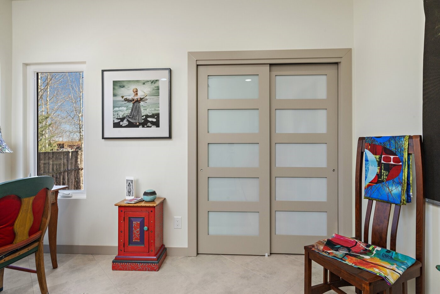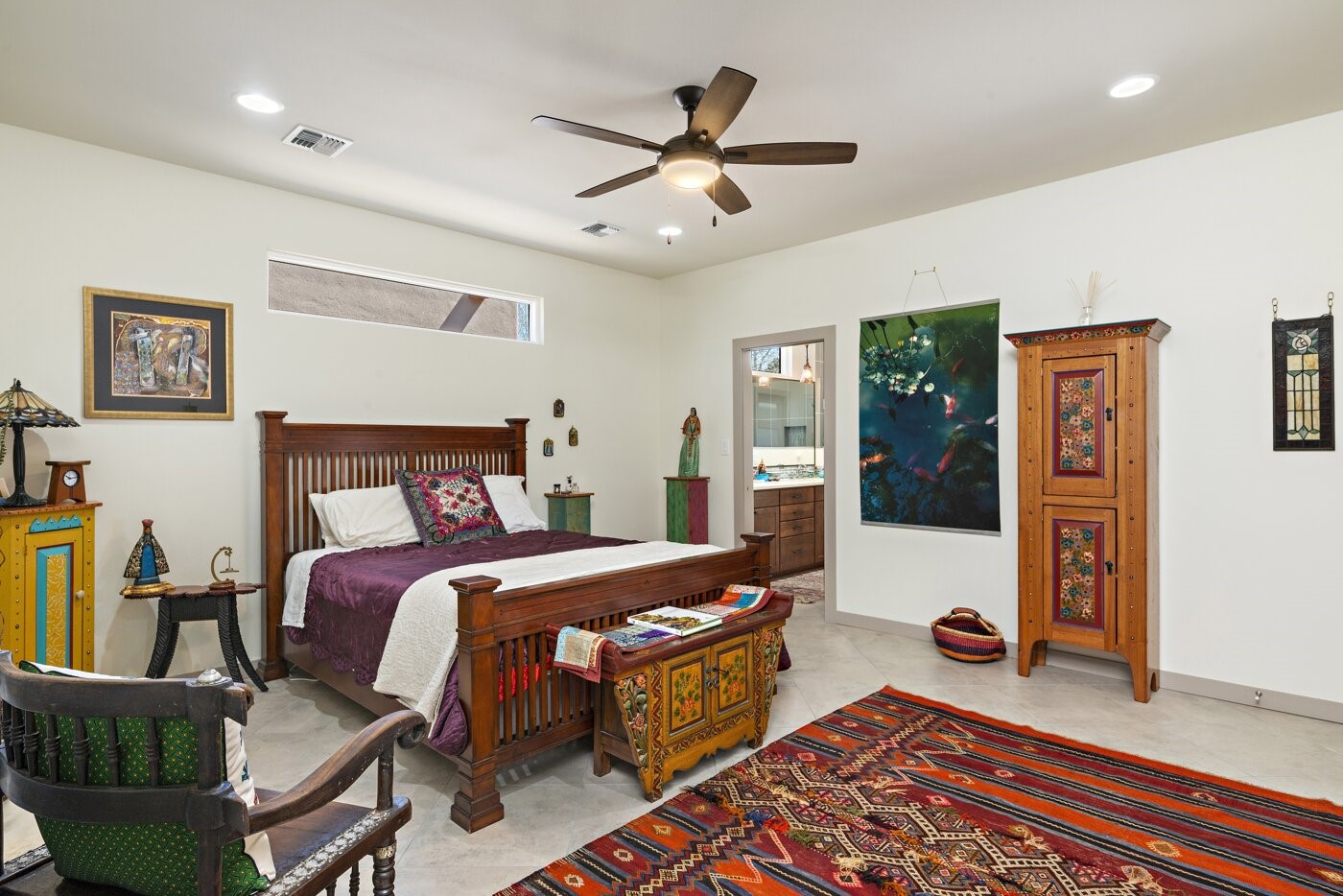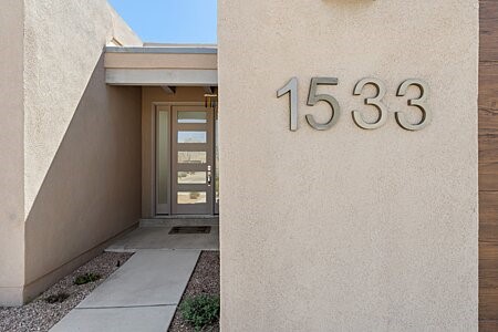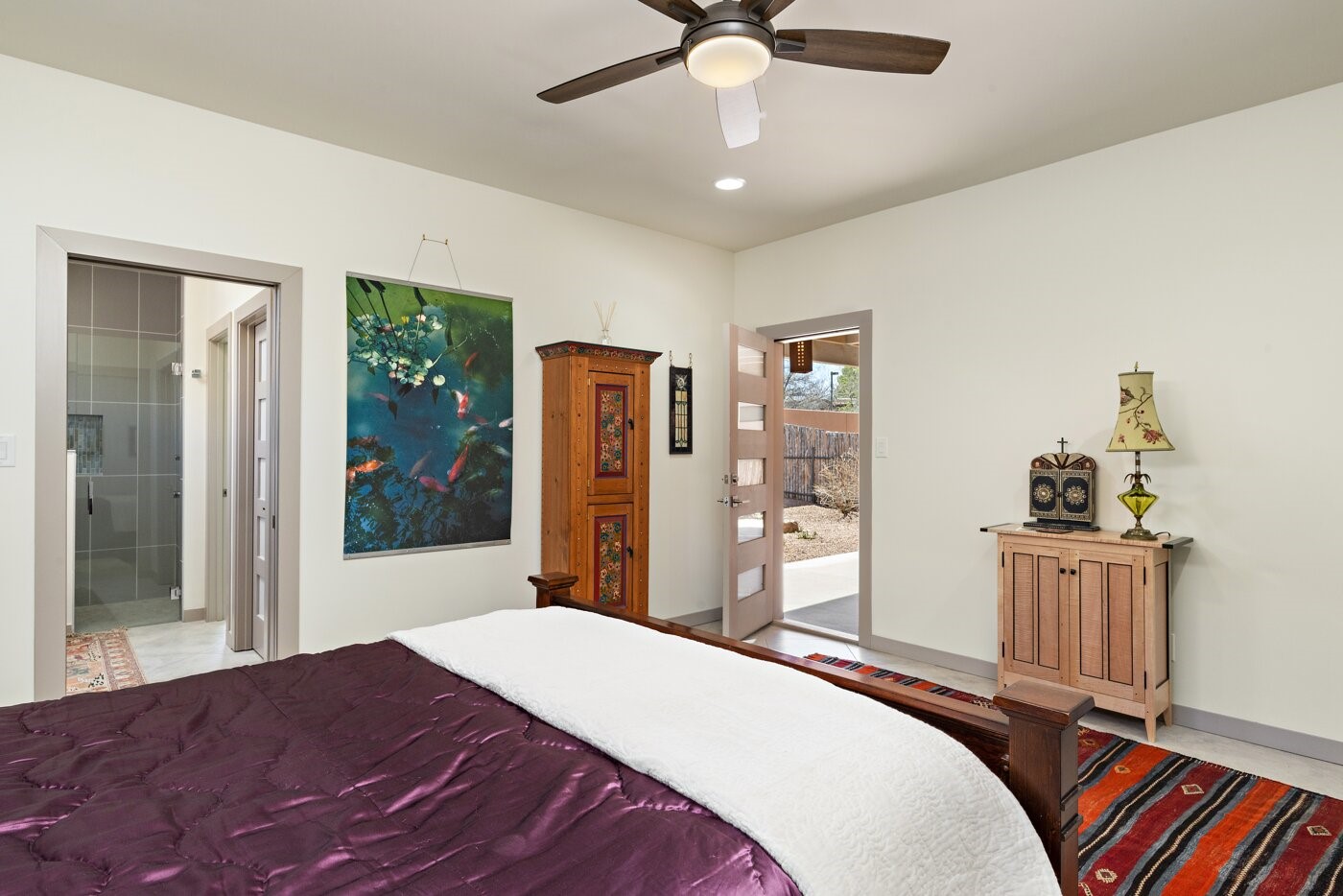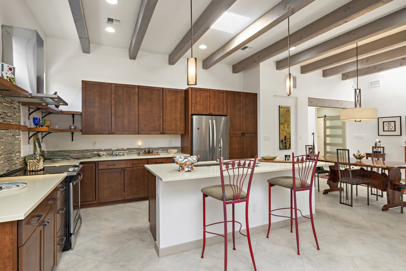 Beautiful open concept home that was rarely used since it's completion in 2018 and only minutes to downtown Santa Fe. Natural light is in abundance in this open concept home with multiple skylights and double glass doors leading to an inviting back courtyard. Multiple luxury features are an added bonus to this centrally located home. You are so close to many of Santa Fe's restaurants, fitness facilities, shopping, and only blocks from major hospital and medical facilities. Wonderful separation of the large main suite and the guestrooms for added privacy. A dual sided fireplace brings relaxing enjoyment inside the home and in the back courtyard.
