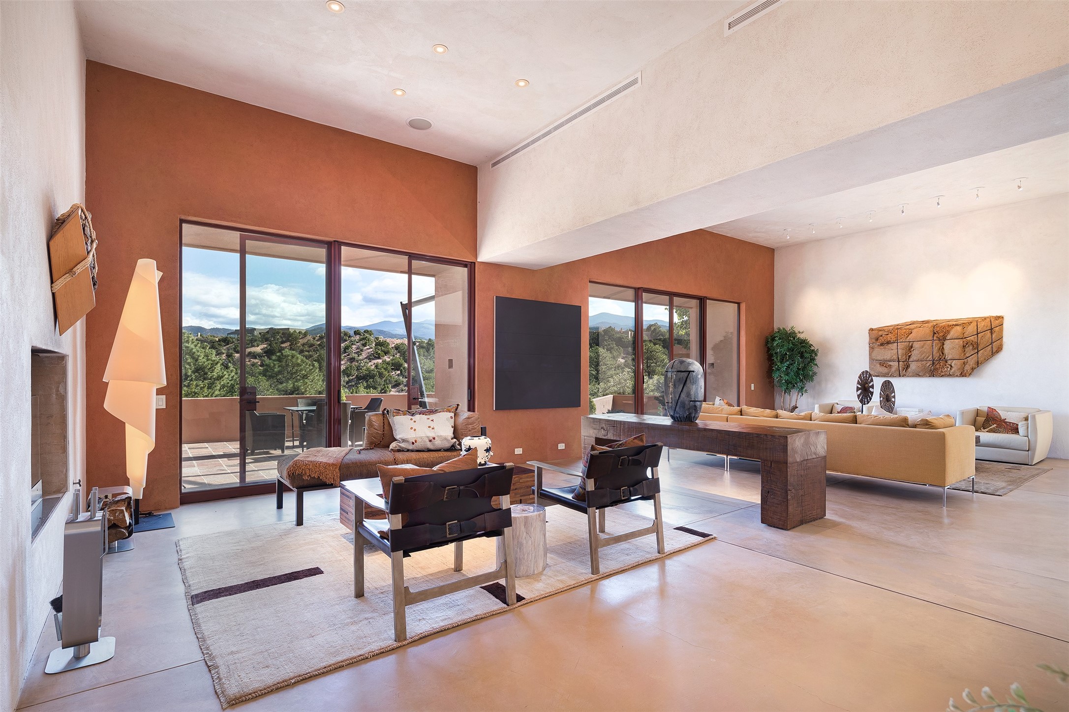 This stunning contemporary home combines the beautiful lines of renowned architect, Ricardo Legorreta, and the beautiful mountain views of Santa Fe. Located in the exclusive gated Circle Drive Compound, this home offers world-class luxury and privacy, perfect for relaxation and enjoyment. The generous open floor plan provides options for gatherings of any size. Large terraces create a perfect platform for cocktails, entertainment, and outdoor dining. Chefs will appreciate the well-stocked kitchen and the pantry/household management office. Interior walls juxtapose between expanses of glass and the exterior views and large walls perfect for an art collection on the interior. The main house has an opulent owner's suite while the separate but attached guest suite has two additional bedroom suites. Built by Doug McDowell with Rastra construction, stained concrete and marble floors, American Clay wall surfaces throughout. Community Tennis/Pickleball court.