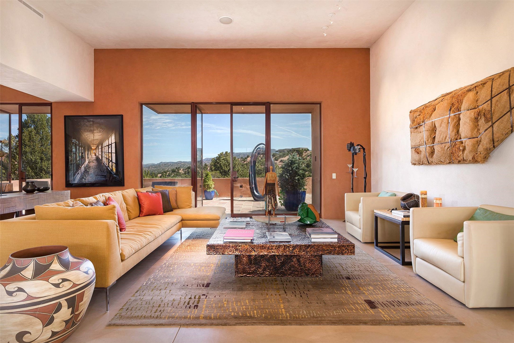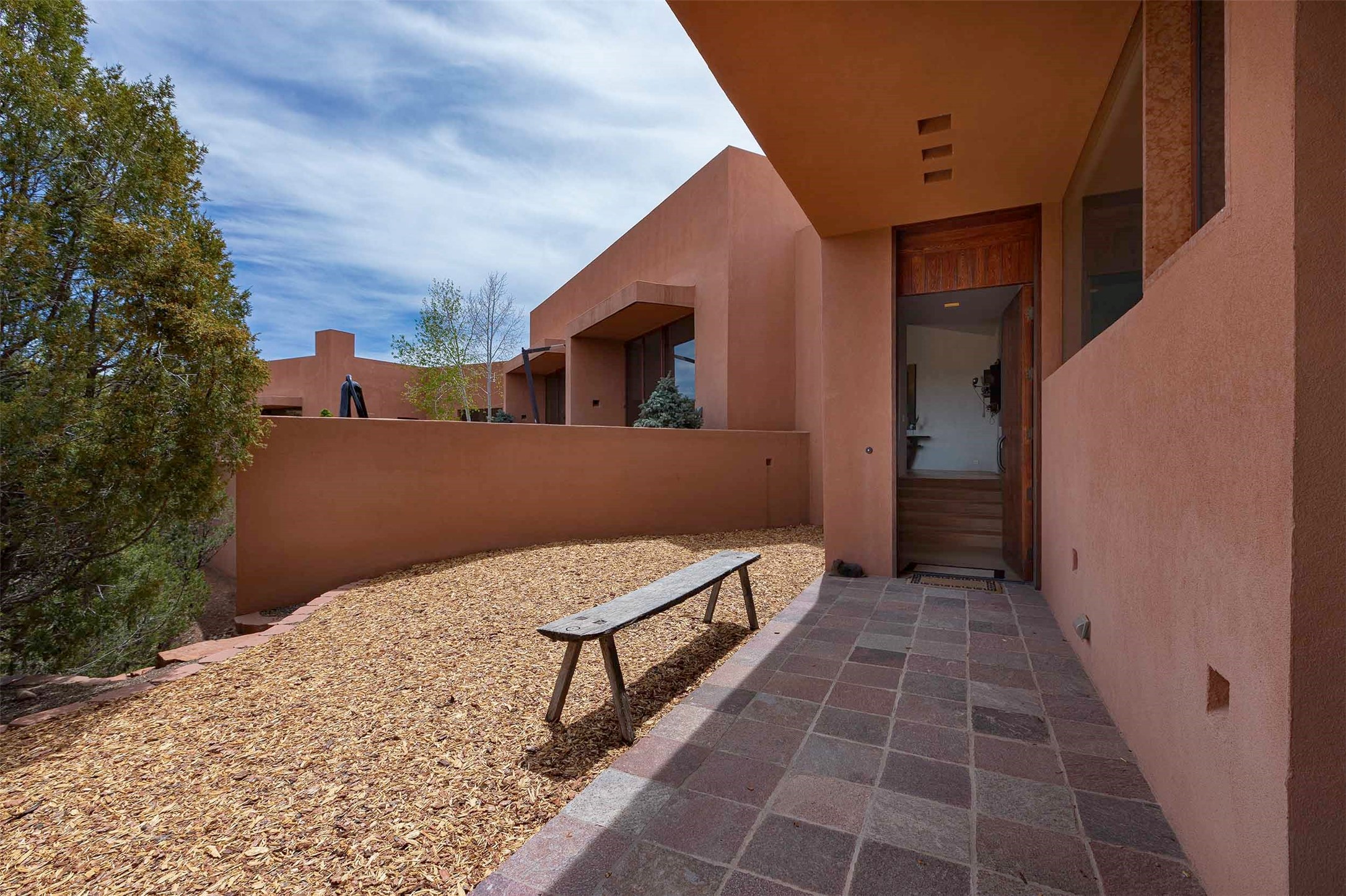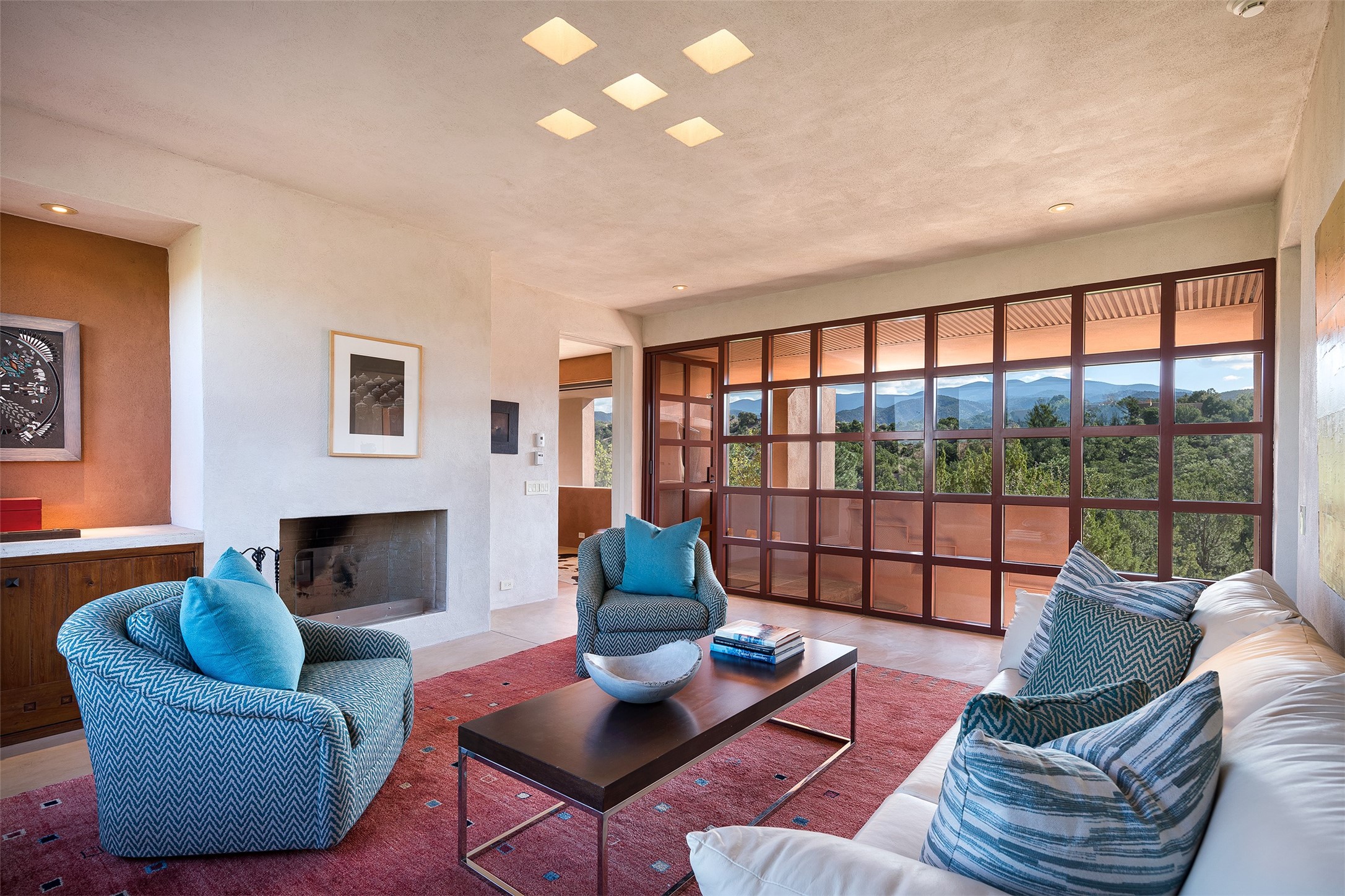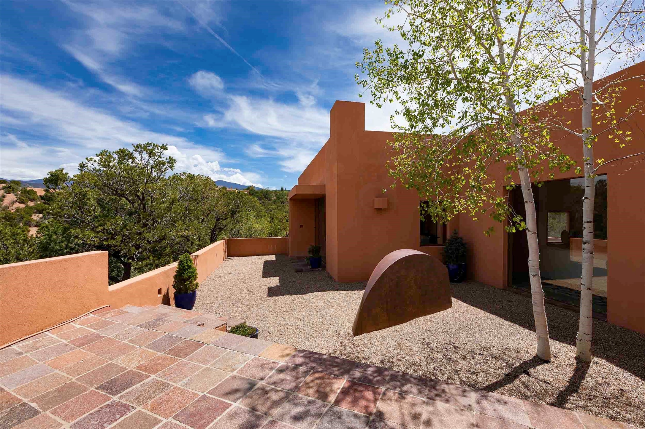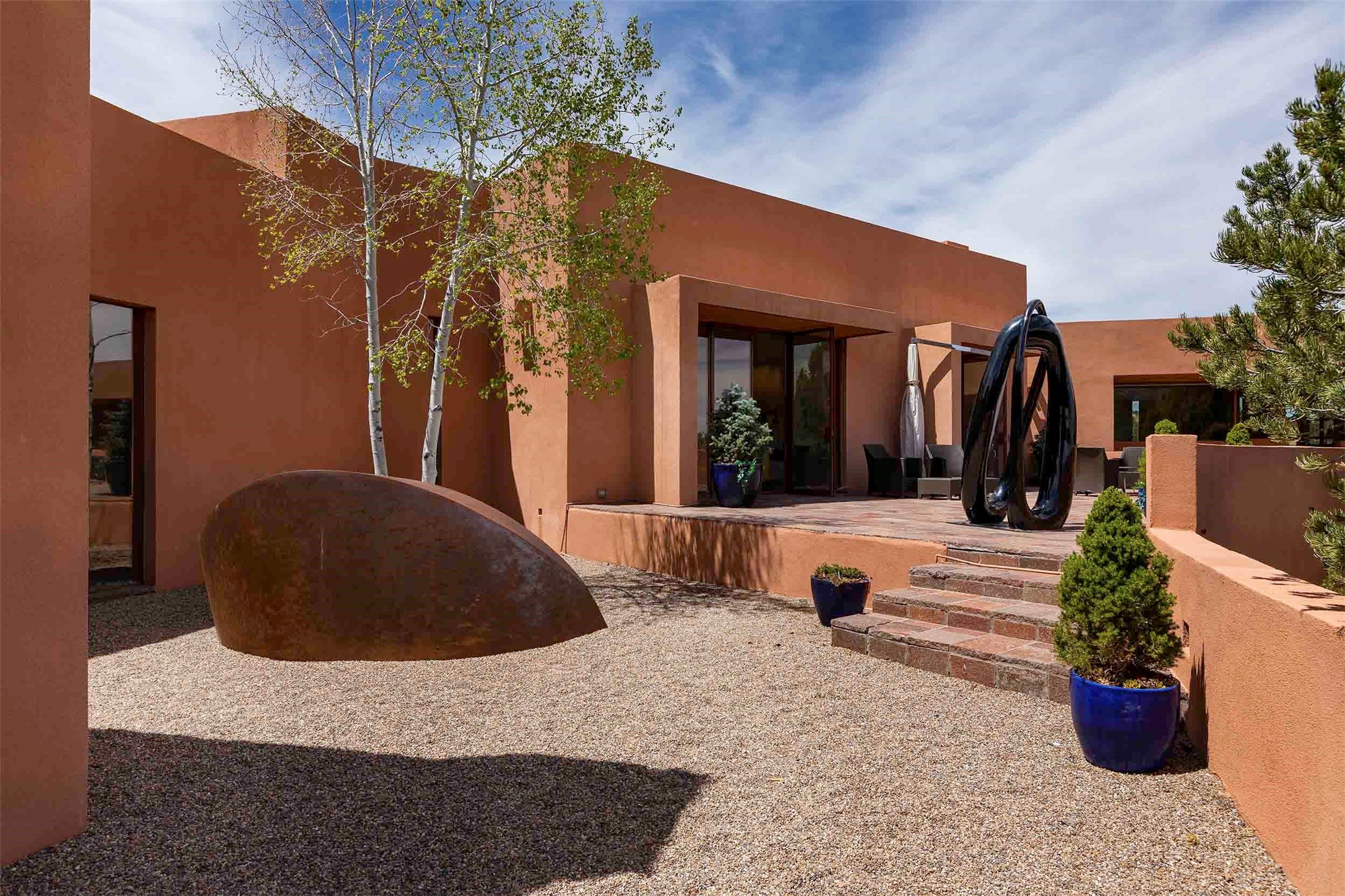 This stunning contemporary home combines the beautiful lines of renowned architect, Ricardo Legorreta, and the beautiful mountain views of Santa Fe. Located in the exclusive gated Circle Drive Compound, this home offers world-class luxury and privacy, perfect for relaxation and enjoyment. The generous open floor plan provides options for gatherings of any size. Large terraces create a perfect platform for cocktails, entertainment, and outdoor dining. Chefs will appreciate the well-stocked kitchen and the pantry/household management office. Interior walls juxtapose between expanses of glass and the exterior views and large walls perfect for an art collection on the interior. The main house has an opulent owner's suite while the separate but attached guest suite has two additional bedroom suites. Built by Doug McDowell with Rastra construction, stained concrete and marble floors, American Clay wall surfaces throughout. Community Tennis/Pickleball court.