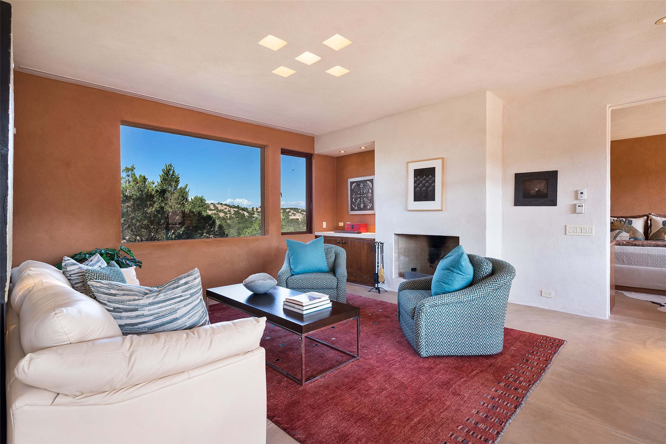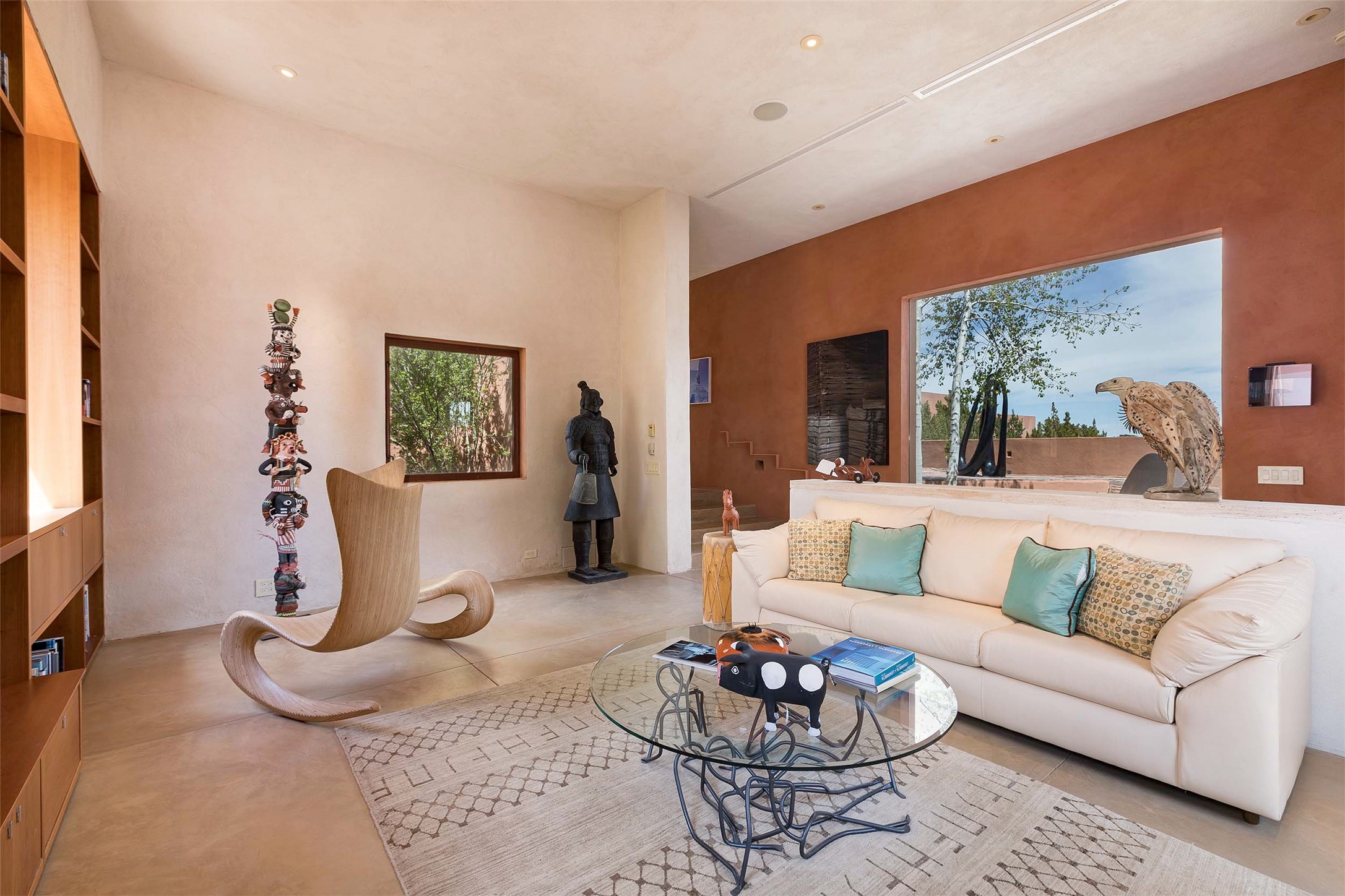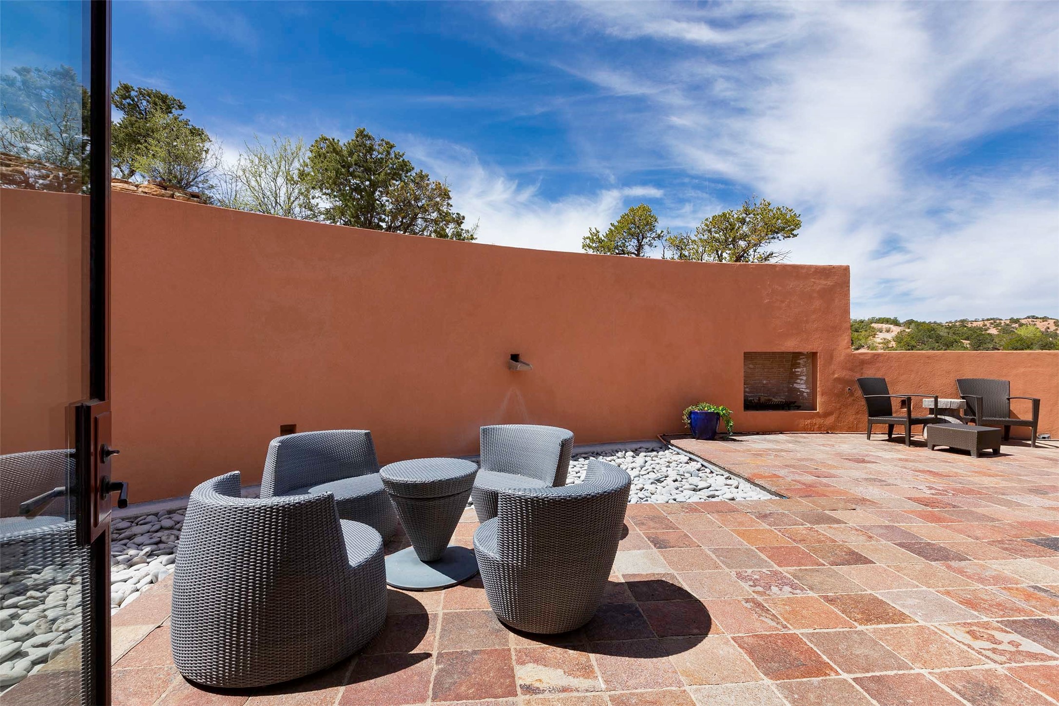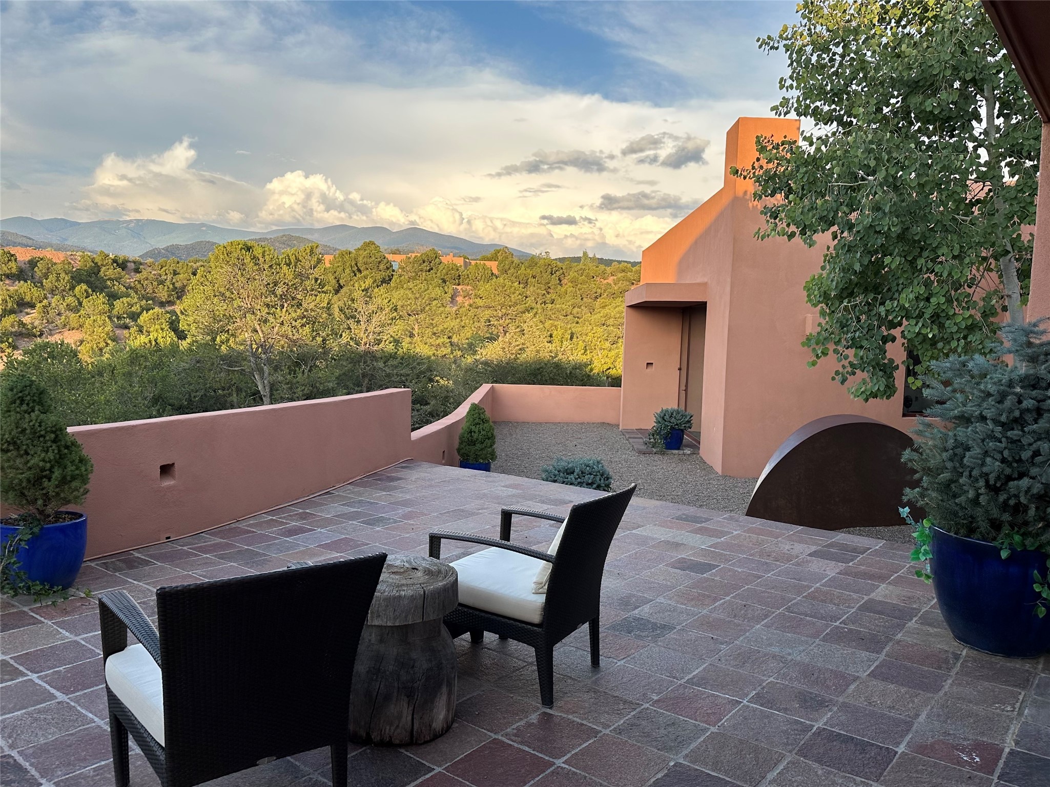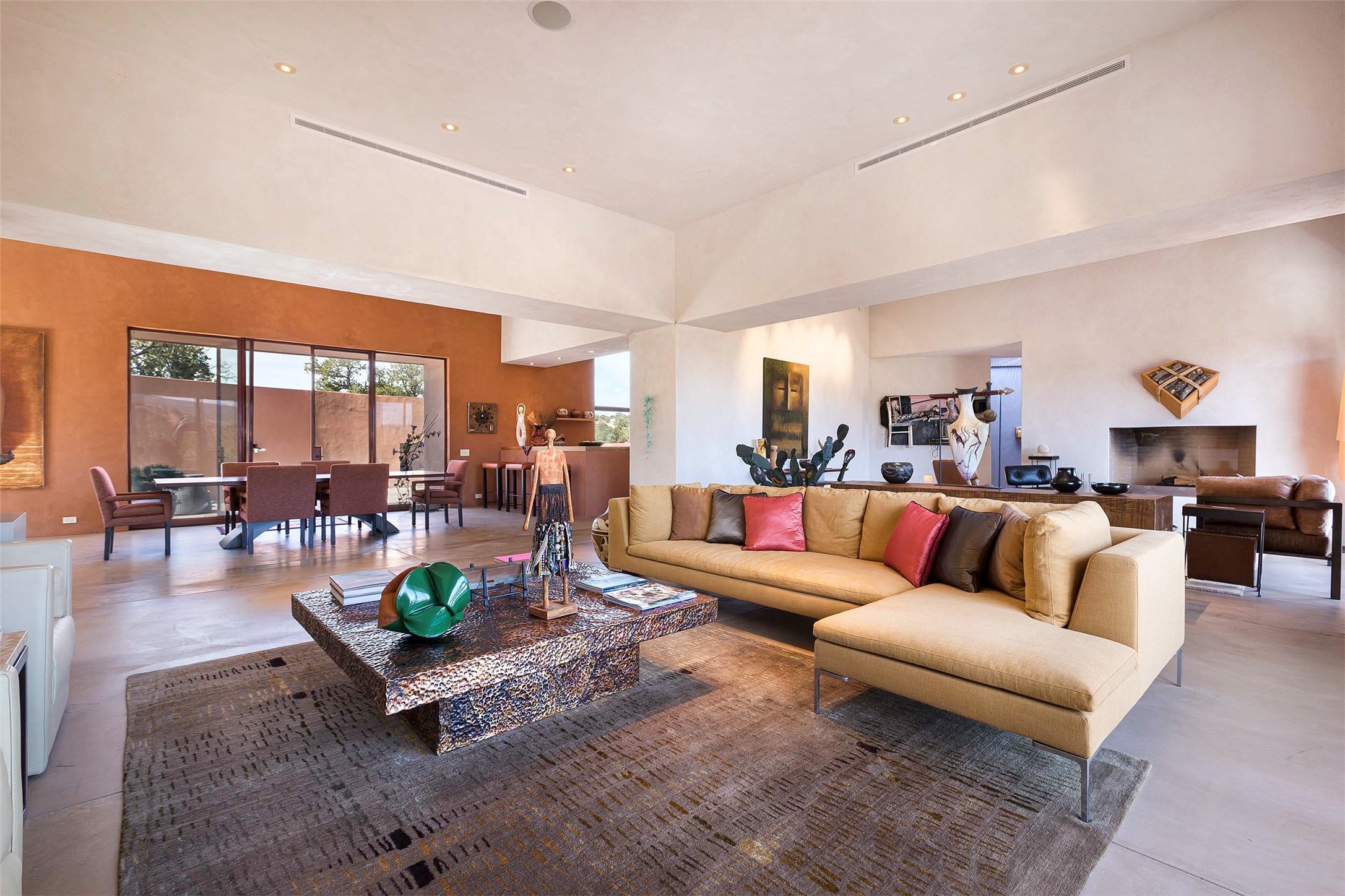 This stunning contemporary home combines the beautiful lines of renowned architect, Ricardo Legorreta, and the beautiful mountain views of Santa Fe. Located in the exclusive gated Circle Drive Compound, this home offers world-class luxury and privacy, perfect for relaxation and enjoyment. The generous open floor plan provides options for gatherings of any size. Large terraces create a perfect platform for cocktails, entertainment, and outdoor dining. Chefs will appreciate the well-stocked kitchen and the pantry/household management office. Interior walls juxtapose between expanses of glass and the exterior views and large walls perfect for an art collection on the interior. The main house has an opulent owner's suite while the separate but attached guest suite has two additional bedroom suites. Built by Doug McDowell with Rastra construction, stained concrete and marble floors, American Clay wall surfaces throughout. Community Tennis/Pickleball court.