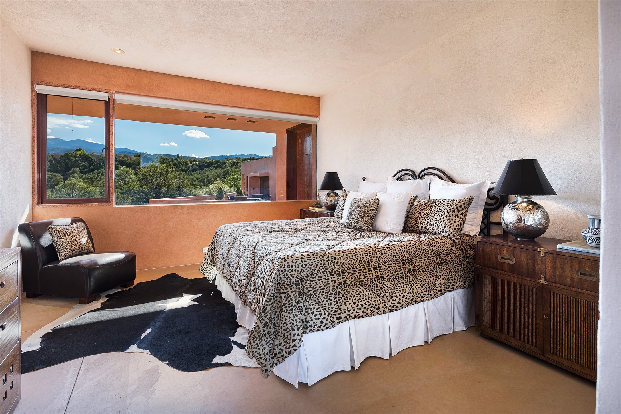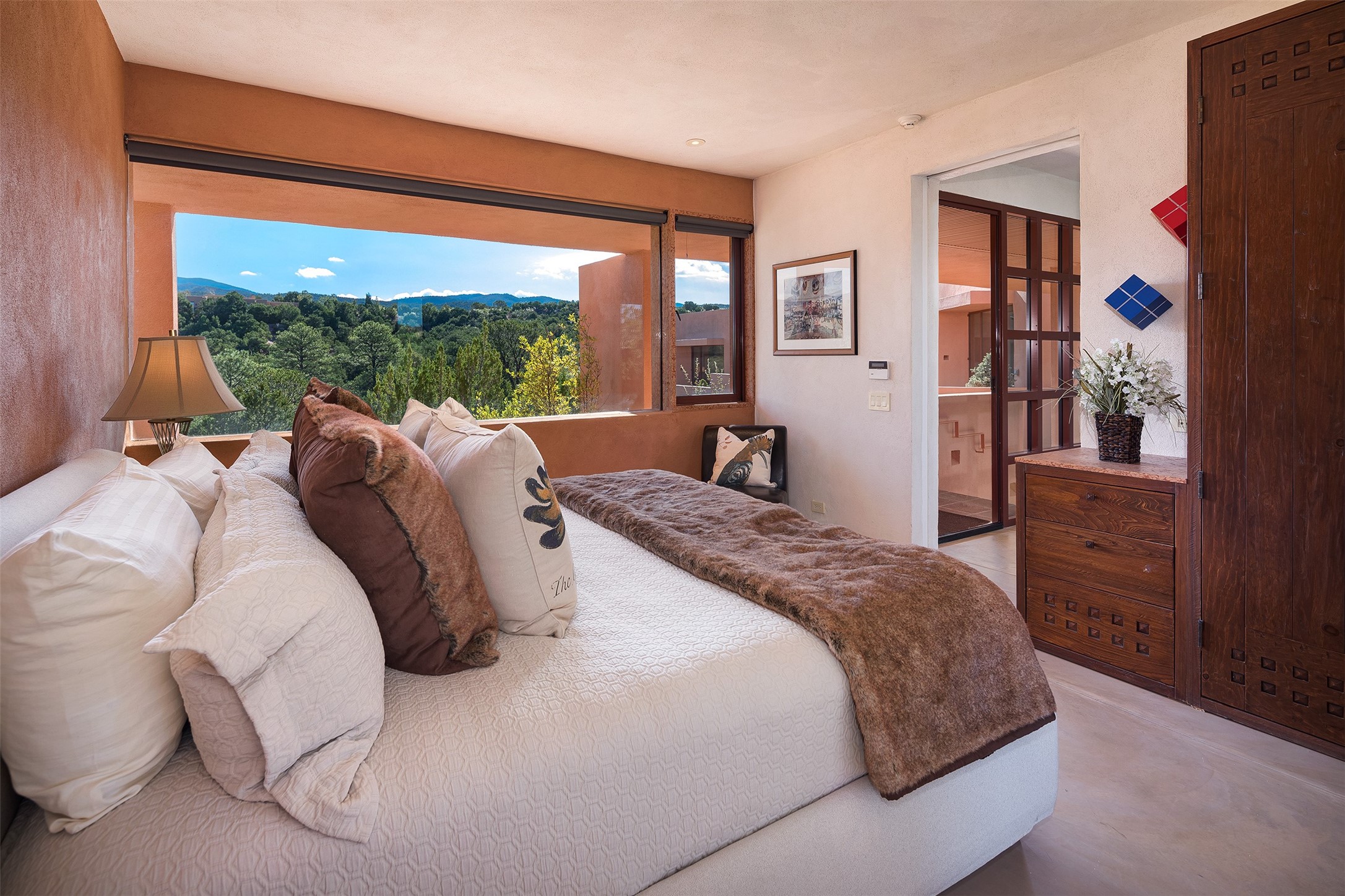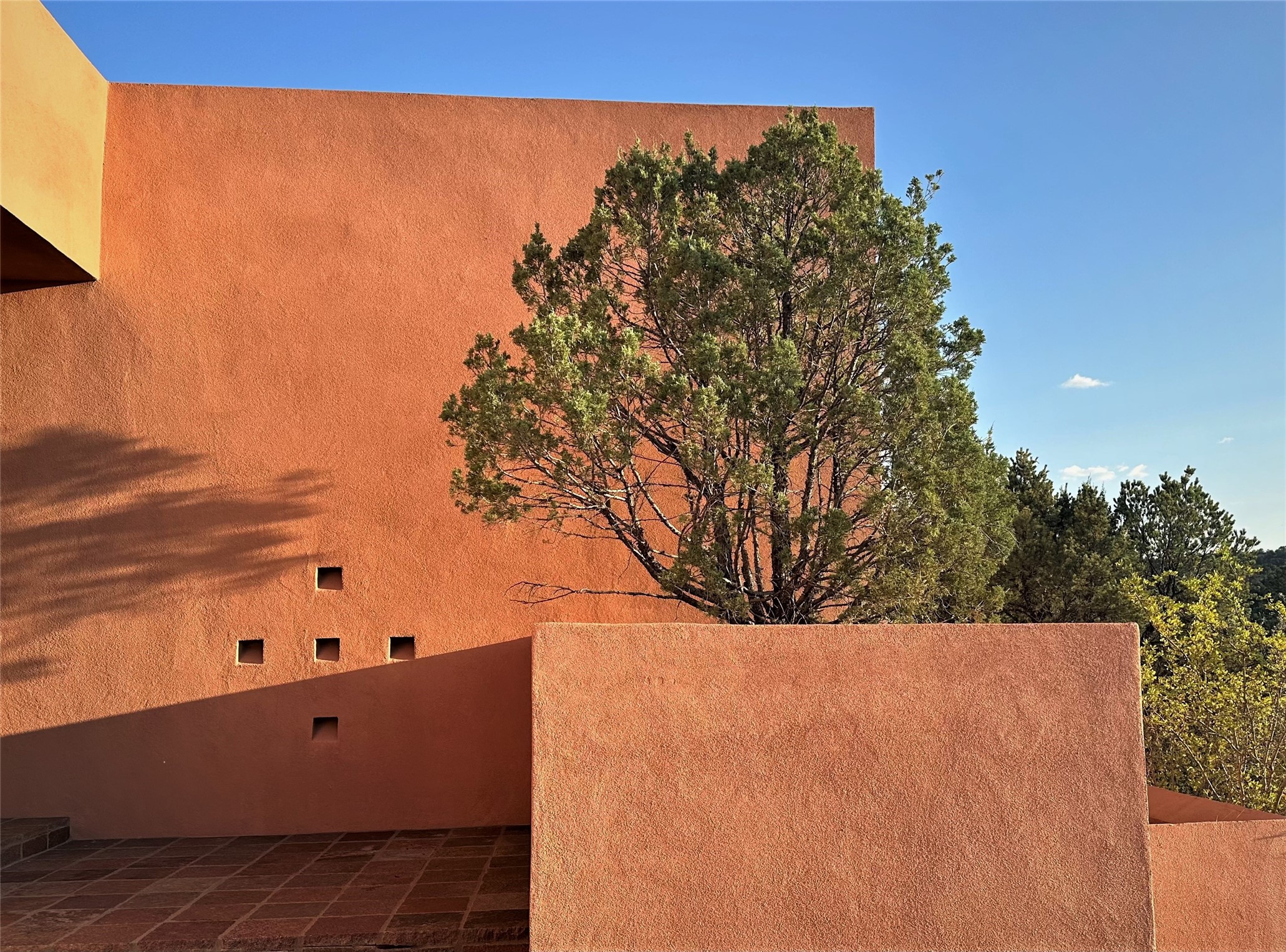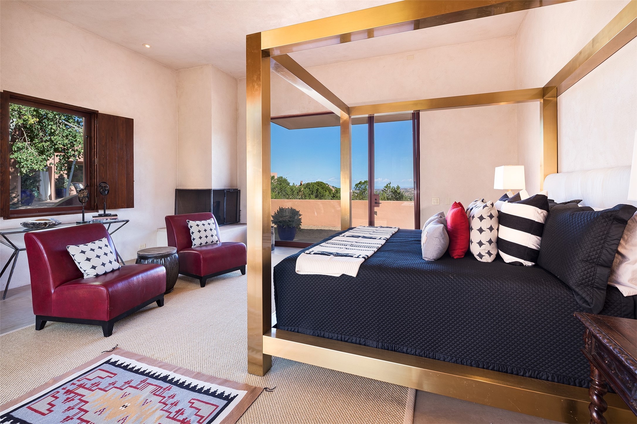 This stunning contemporary home combines the beautiful lines of renowned architect, Ricardo Legorreta, and the beautiful mountain views of Santa Fe. Located in the exclusive gated Circle Drive Compound, this home offers world-class luxury and privacy, perfect for relaxation and enjoyment. The generous open floor plan provides options for gatherings of any size. Large terraces create a perfect platform for cocktails, entertainment, and outdoor dining. Chefs will appreciate the well-stocked kitchen and the pantry/household management office. Interior walls juxtapose between expanses of glass and the exterior views and large walls perfect for an art collection on the interior. The main house has an opulent owner's suite while the separate but attached guest suite has two additional bedroom suites. Built by Doug McDowell with Rastra construction, stained concrete and marble floors, American Clay wall surfaces throughout. Community Tennis/Pickleball court.