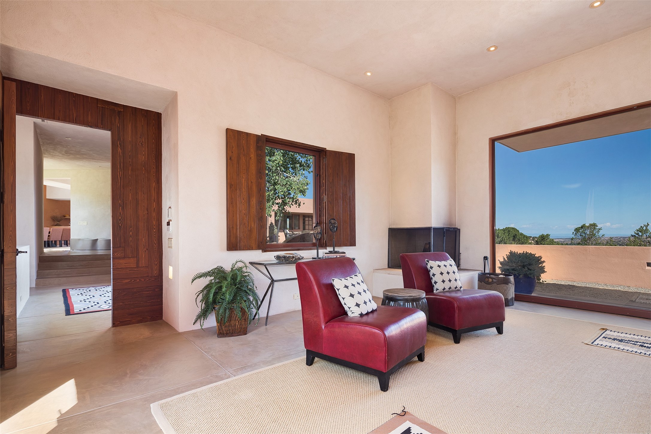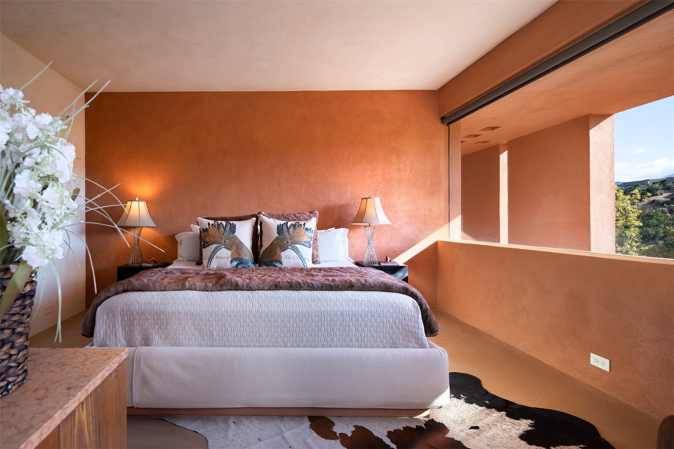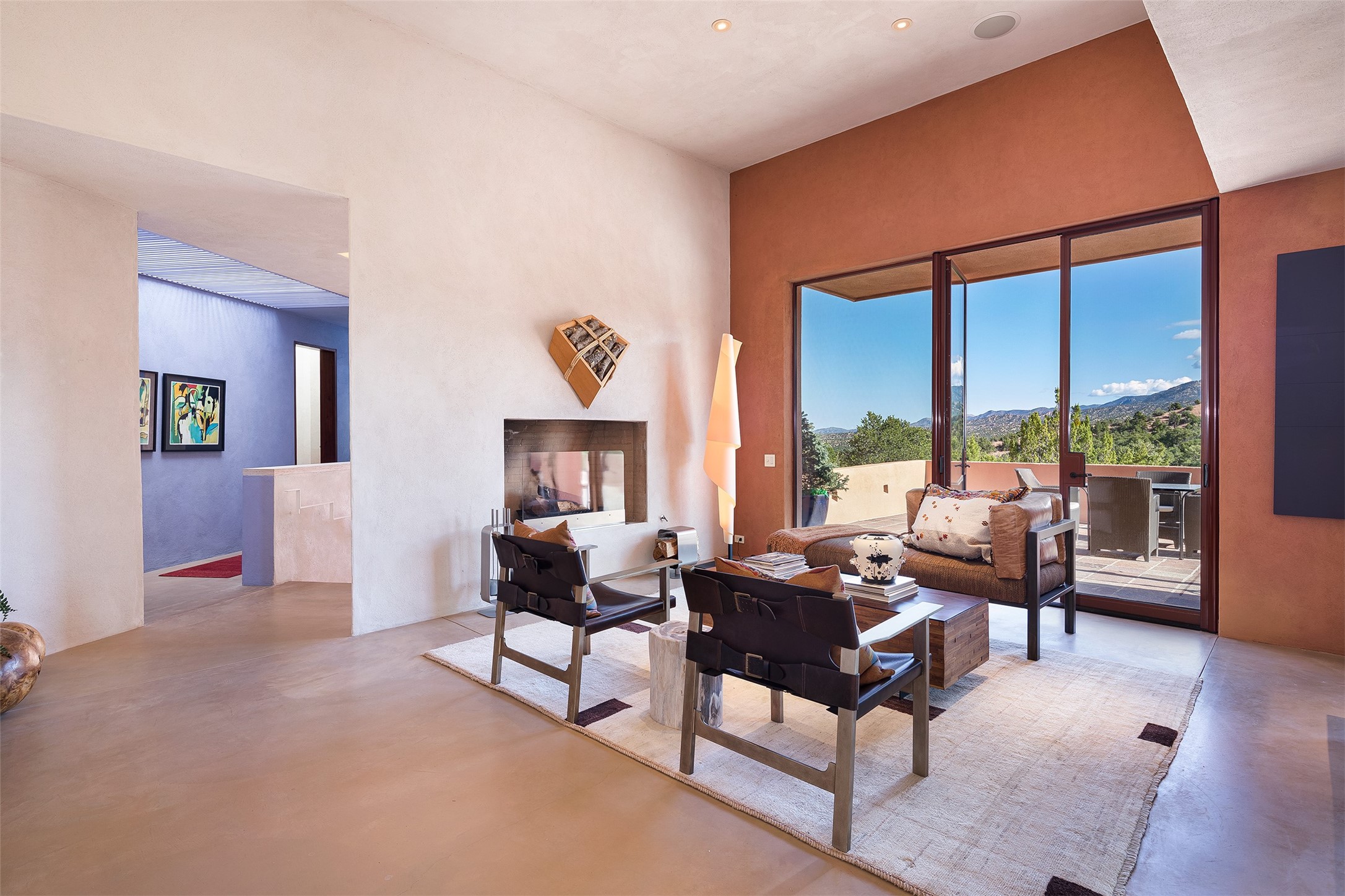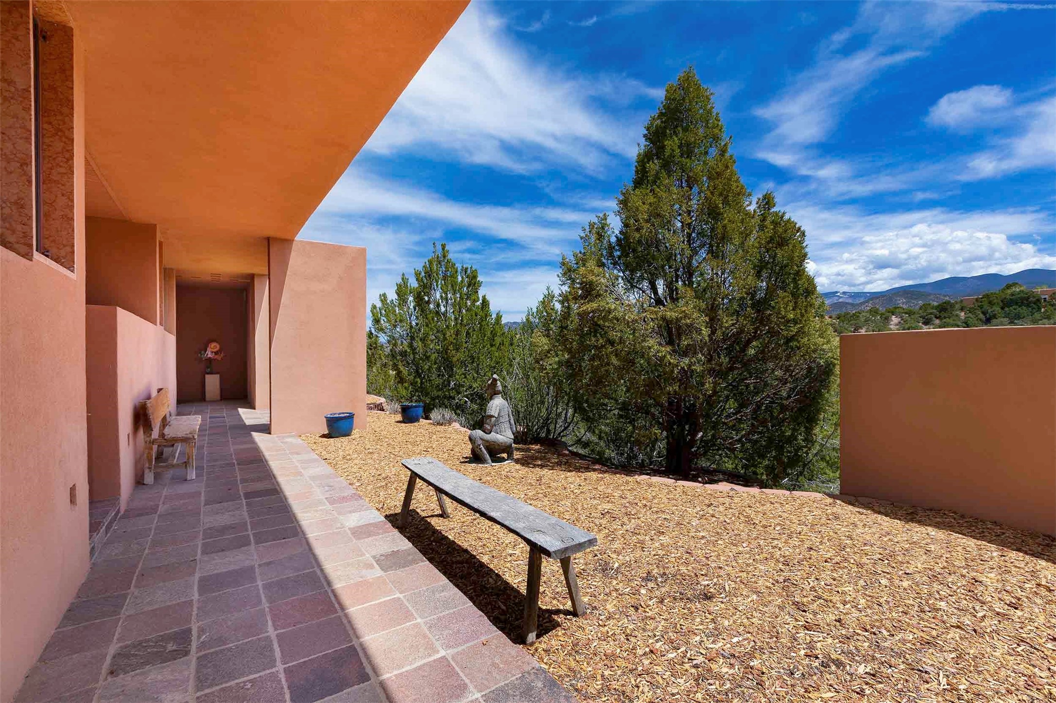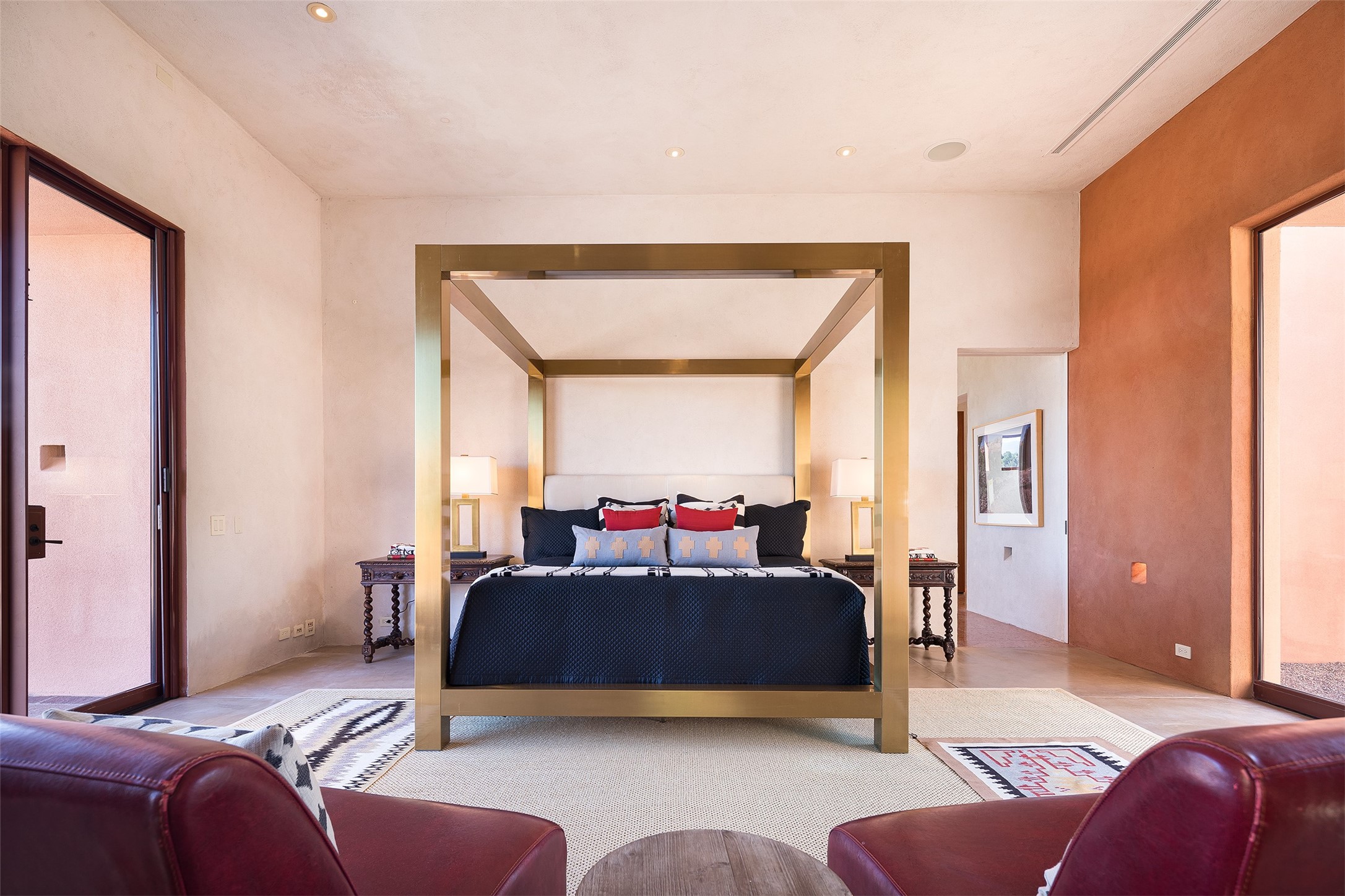 This stunning contemporary home combines the beautiful lines of renowned architect, Ricardo Legorreta, and the beautiful mountain views of Santa Fe. Located in the exclusive gated Circle Drive Compound, this home offers world-class luxury and privacy, perfect for relaxation and enjoyment. The generous open floor plan provides options for gatherings of any size. Large terraces create a perfect platform for cocktails, entertainment, and outdoor dining. Chefs will appreciate the well-stocked kitchen and the pantry/household management office. Interior walls juxtapose between expanses of glass and the exterior views and large walls perfect for an art collection on the interior. The main house has an opulent owner's suite while the separate but attached guest suite has two additional bedroom suites. Built by Doug McDowell with Rastra construction, stained concrete and marble floors, American Clay wall surfaces throughout. Community Tennis/Pickleball court.