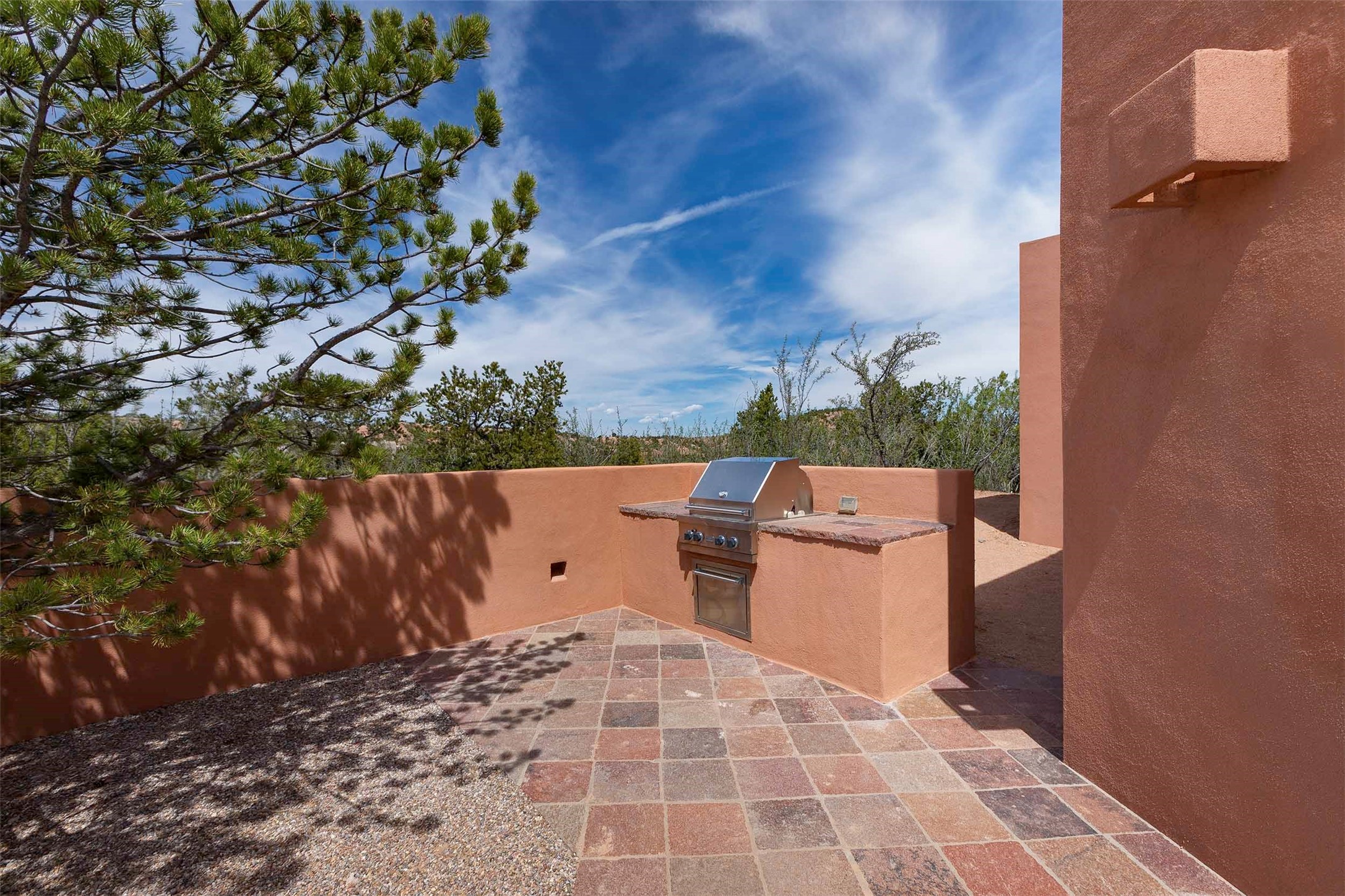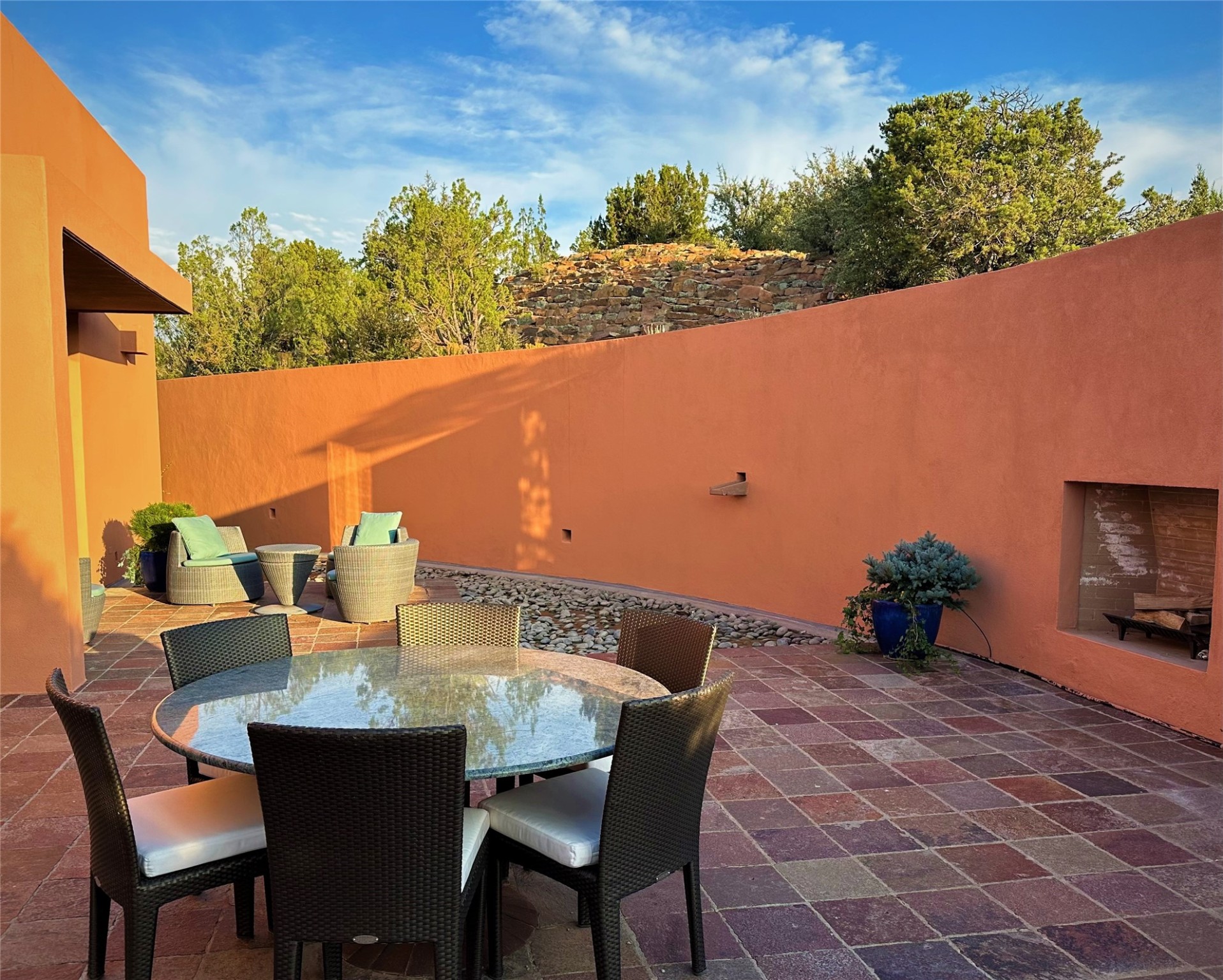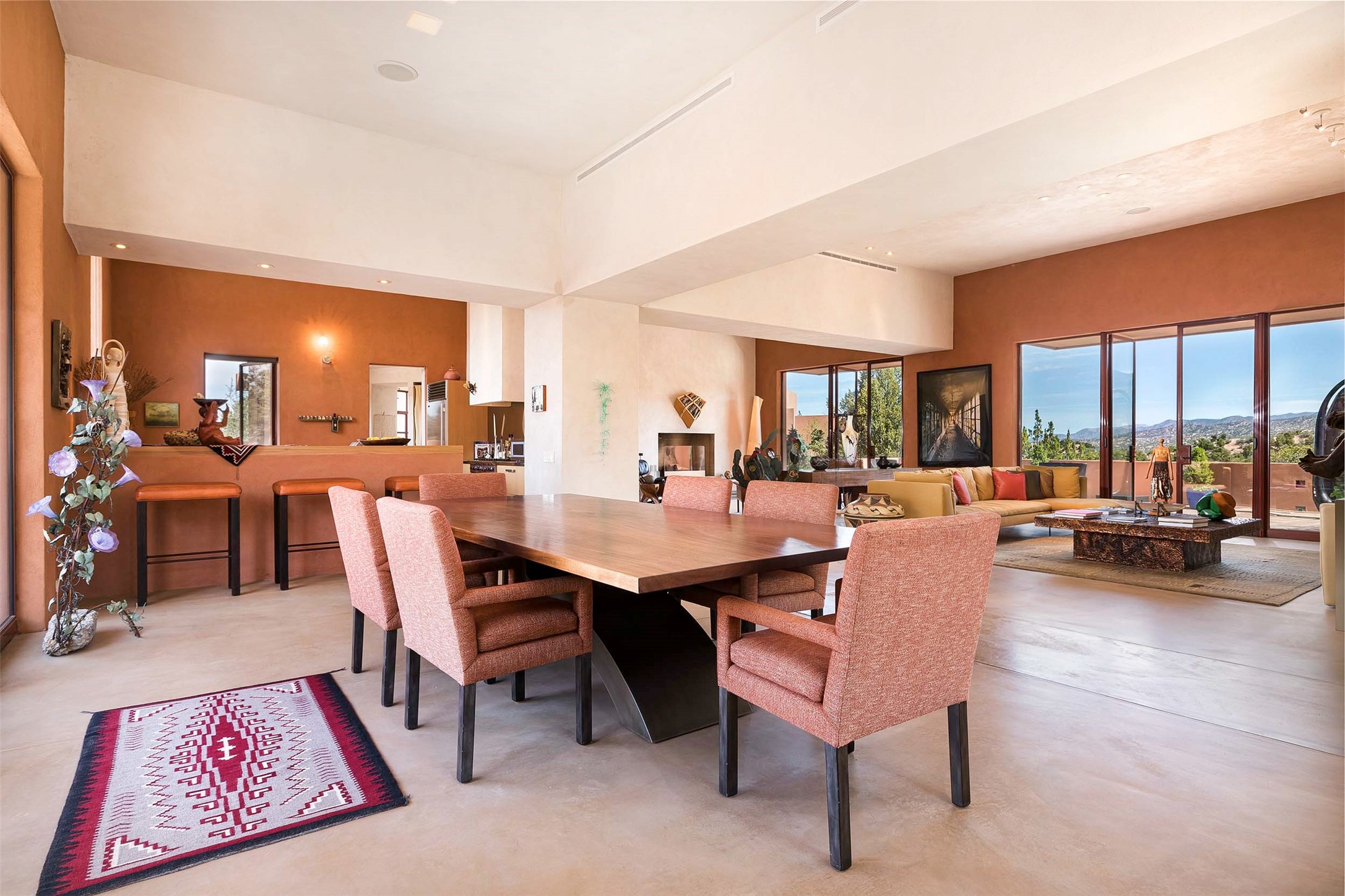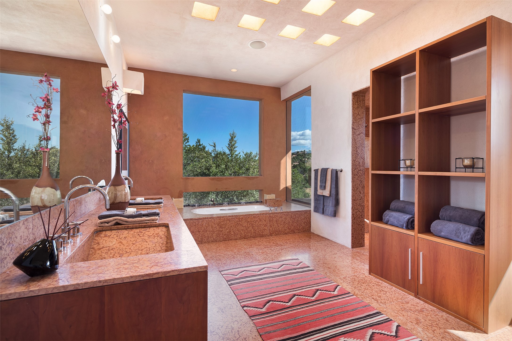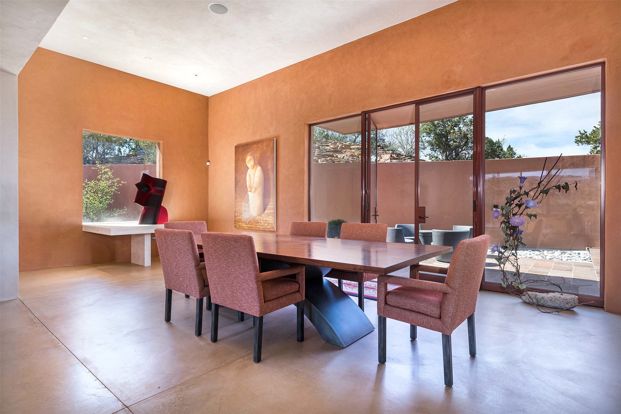This stunning contemporary home combines the beautiful lines of renowned architect, Ricardo Legorreta, and the beautiful mountain views of Santa Fe. Located in the exclusive gated Circle Drive Compound, this home offers world-class luxury and privacy, perfect for relaxation and enjoyment. The generous open floor plan provides options for gatherings of any size. Large terraces create a perfect platform for cocktails, entertainment, and outdoor dining. Chefs will appreciate the well-stocked kitchen and the pantry/household management office. Interior walls juxtapose between expanses of glass and the exterior views and large walls perfect for an art collection on the interior. The main house has an opulent owner's suite while the separate but attached guest suite has two additional bedroom suites. Built by Doug McDowell with Rastra construction, stained concrete and marble floors, American Clay wall surfaces throughout. Community Tennis/Pickleball court.