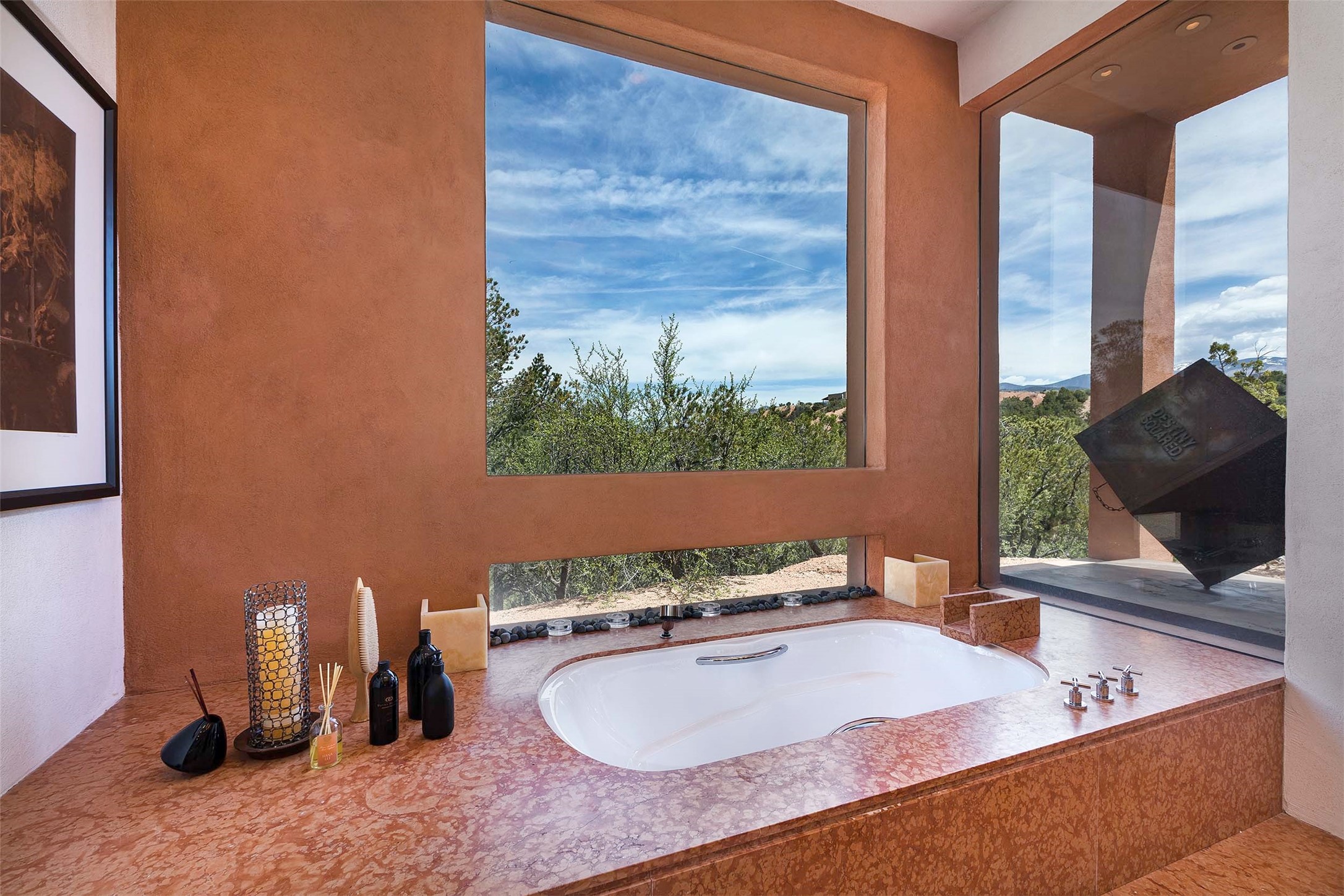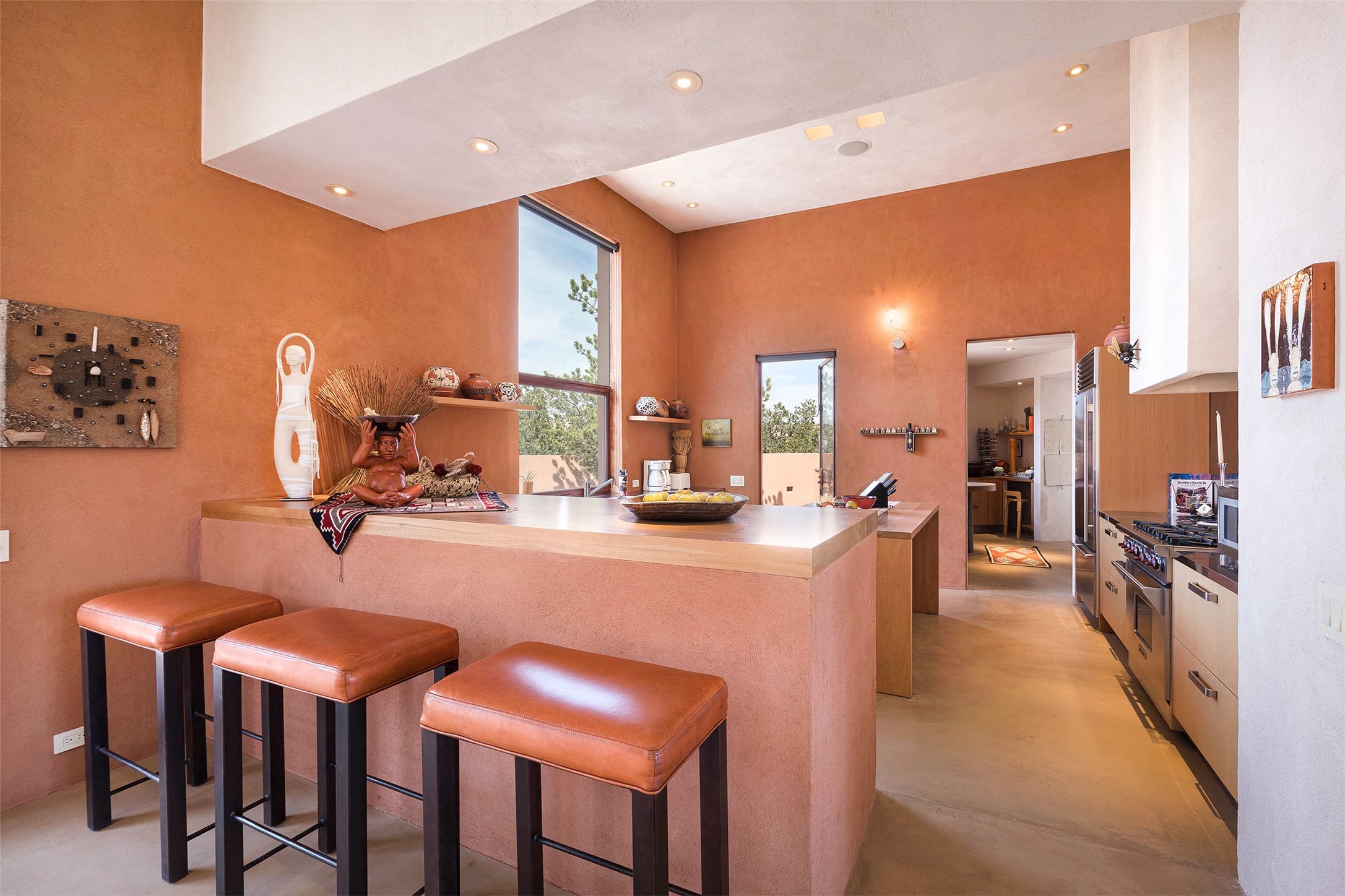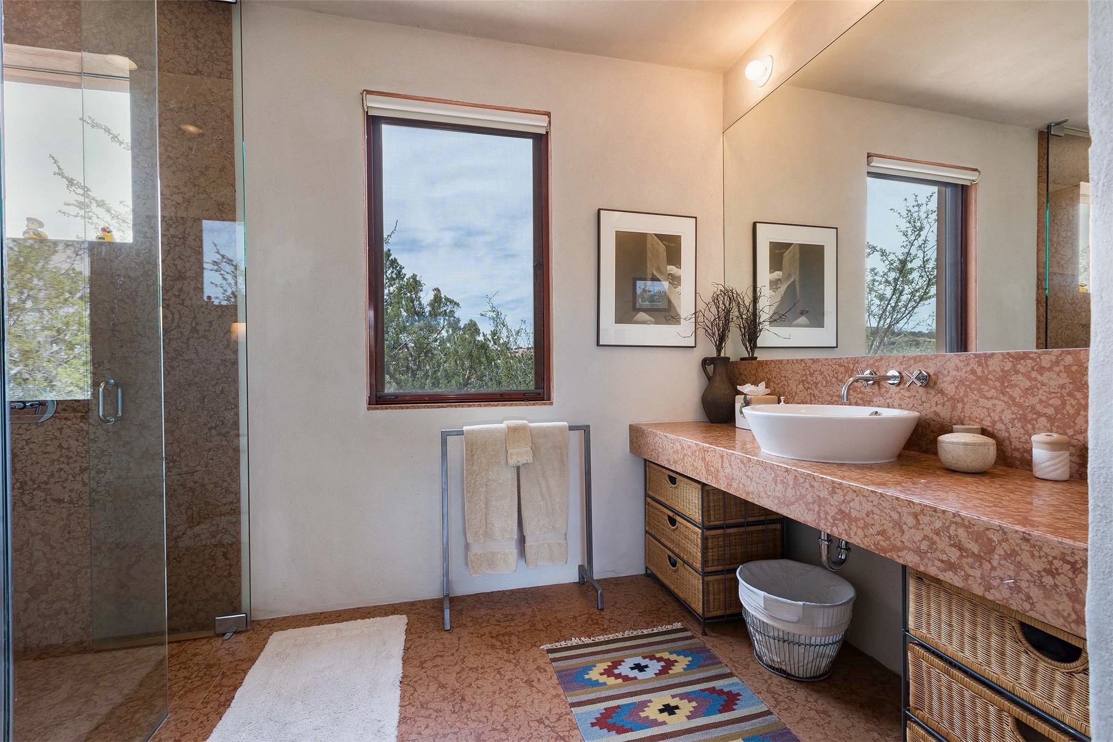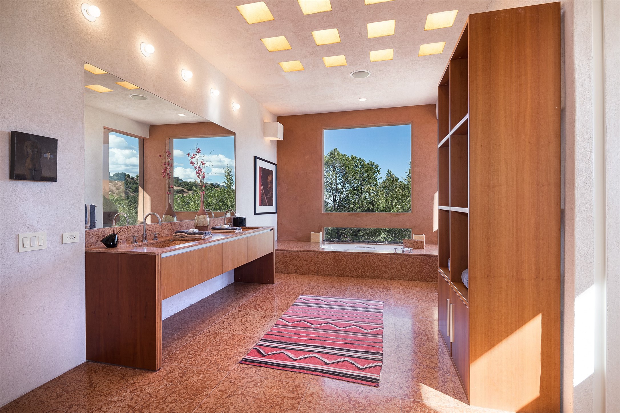 This stunning contemporary home combines the beautiful lines of renowned architect, Ricardo Legorreta, and the beautiful mountain views of Santa Fe. Located in the exclusive gated Circle Drive Compound, this home offers world-class luxury and privacy, perfect for relaxation and enjoyment. The generous open floor plan provides options for gatherings of any size. Large terraces create a perfect platform for cocktails, entertainment, and outdoor dining. Chefs will appreciate the well-stocked kitchen and the pantry/household management office. Interior walls juxtapose between expanses of glass and the exterior views and large walls perfect for an art collection on the interior. The main house has an opulent owner's suite while the separate but attached guest suite has two additional bedroom suites. Built by Doug McDowell with Rastra construction, stained concrete and marble floors, American Clay wall surfaces throughout. Community Tennis/Pickleball court.