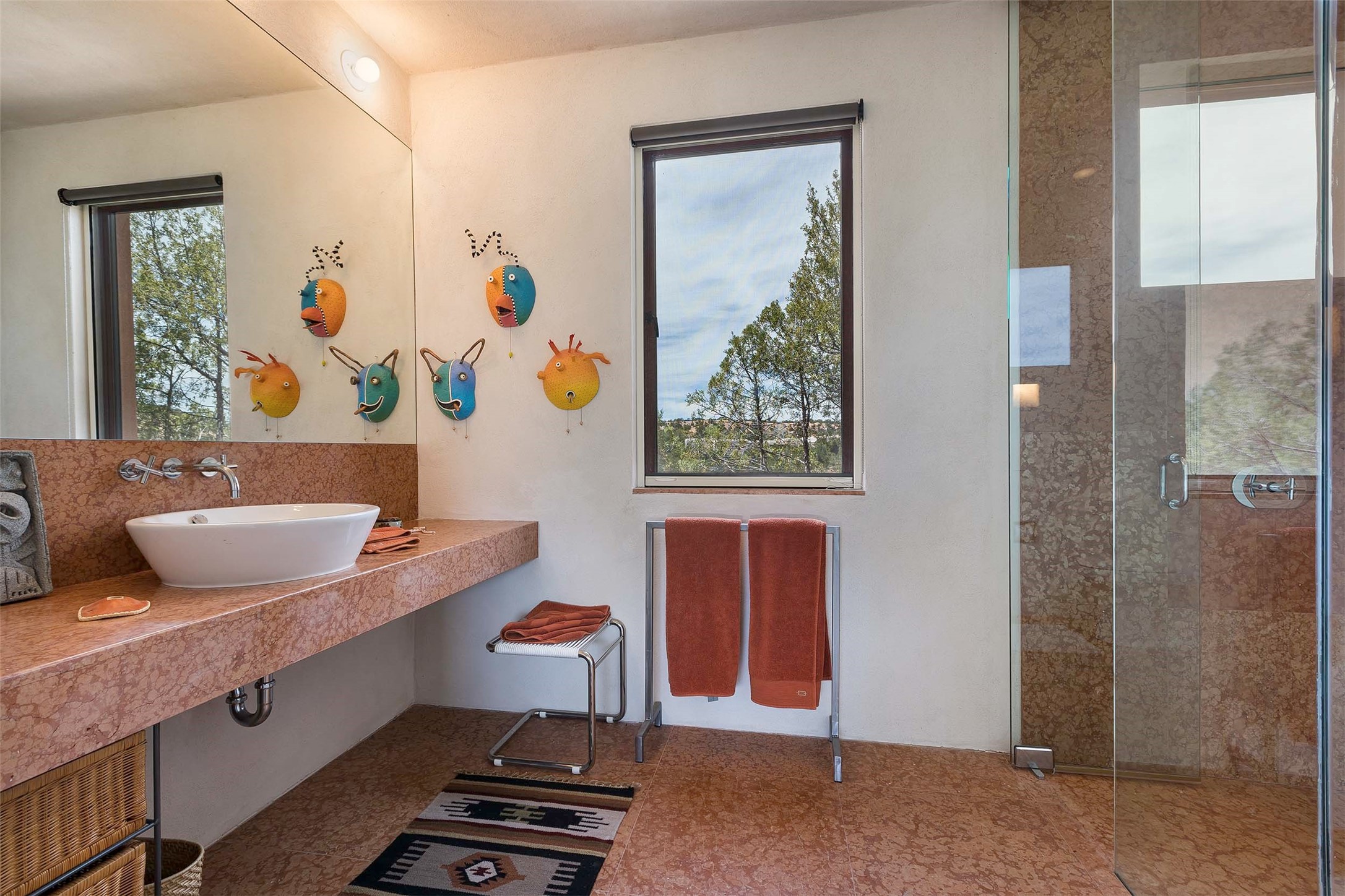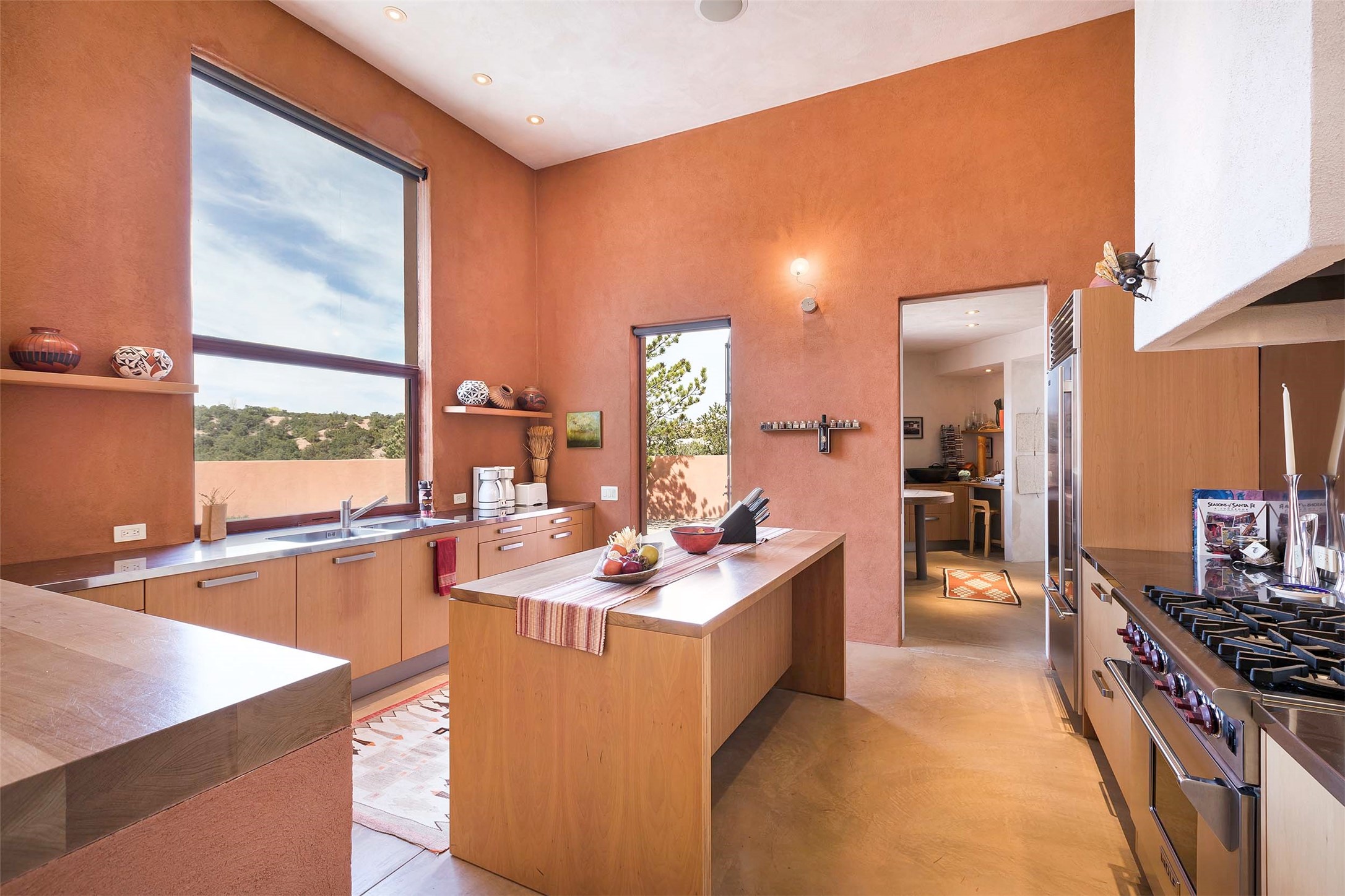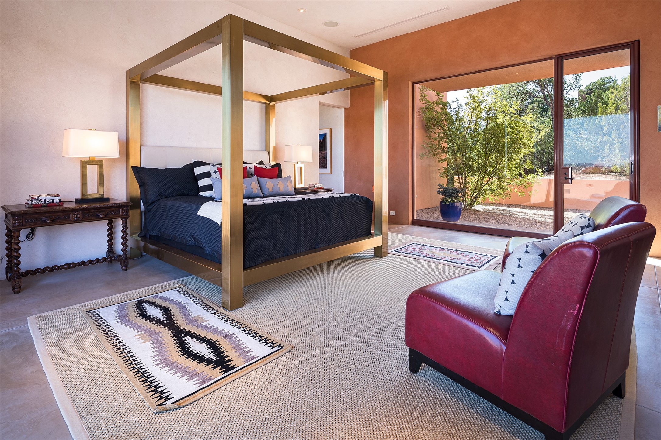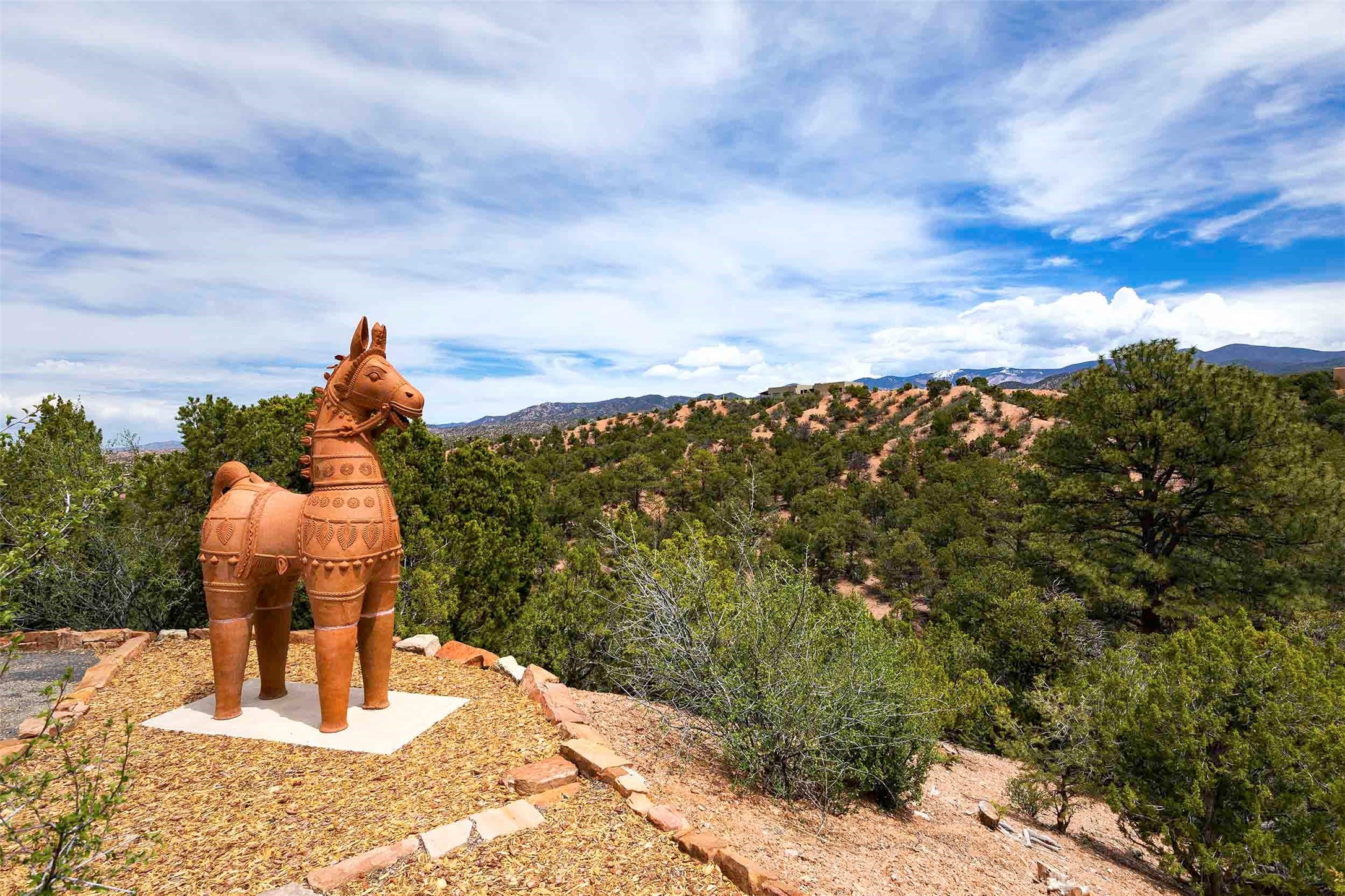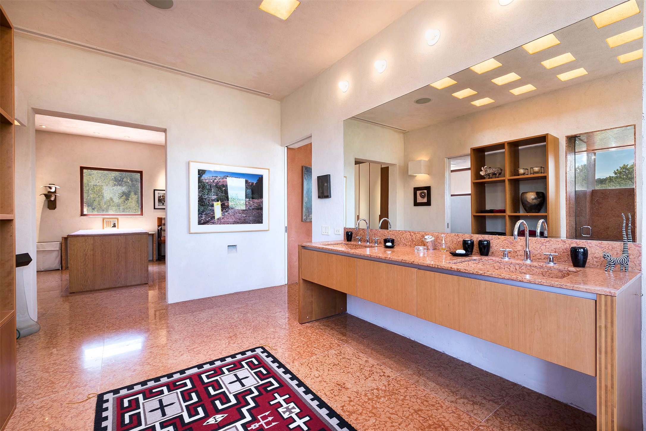 This stunning contemporary home combines the beautiful lines of renowned architect, Ricardo Legorreta, and the beautiful mountain views of Santa Fe. Located in the exclusive gated Circle Drive Compound, this home offers world-class luxury and privacy, perfect for relaxation and enjoyment. The generous open floor plan provides options for gatherings of any size. Large terraces create a perfect platform for cocktails, entertainment, and outdoor dining. Chefs will appreciate the well-stocked kitchen and the pantry/household management office. Interior walls juxtapose between expanses of glass and the exterior views and large walls perfect for an art collection on the interior. The main house has an opulent owner's suite while the separate but attached guest suite has two additional bedroom suites. Built by Doug McDowell with Rastra construction, stained concrete and marble floors, American Clay wall surfaces throughout. Community Tennis/Pickleball court.