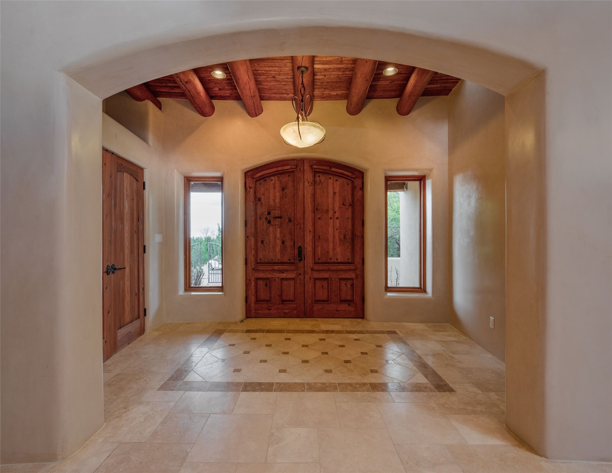 Minutes to downtown Santa Fe, this 4393 sqft single level 4 bedroom 3 1/2 bath home is sited on 2.5 acres. The open floor plan, plaster walls, vigas, and high ceilings welcome you into this traditional Santa Fe style home. A wine room, 4 interior and 2 exterior gas viga fireplaces, as well as skylights throughout, add to its charm. The covered portal is designed as an extension of the living areas and is accessible through multiple glass doors along the north side of the home. It includes a kiva fireplace, built-in Bar-B-Q, and refrigerator. The kitchen is spacious, open, and bright with a south-facing window that overlooks a private courtyard with forever views. This home also has a 9 ft bar that adjoins the family room with additional beautiful built-in custom cabinetry. The walk-in pantry has floor-to-ceiling shelving and is conveniently located off the kitchen. The primary bedroom suite includes a large bath with his & her vanities, jetted tub, oversized shower and walk-in closet. The suite also has a fully walled courtyard for a private retreat. There are two ensuite bedrooms with private baths and walk-in closets, as well as an additional bedroom that can be used as an office. This solar-powered home includes a 3 car garage, radiant heat and two HVAC units for additional heating and refrigerated air. County Assessor shows the square footage at 4393 which differs from the floor plan provided. Neither Listing Brokers nor Seller warrant the square footage of the home or lot. If size of the home or lot are of material consideration to the Buyer, then the Buyer should have them measured. Tax Levy is from the Assessor website. All fires depicted are photo-shopped. Buyer to verify functionality of the fireplaces.
