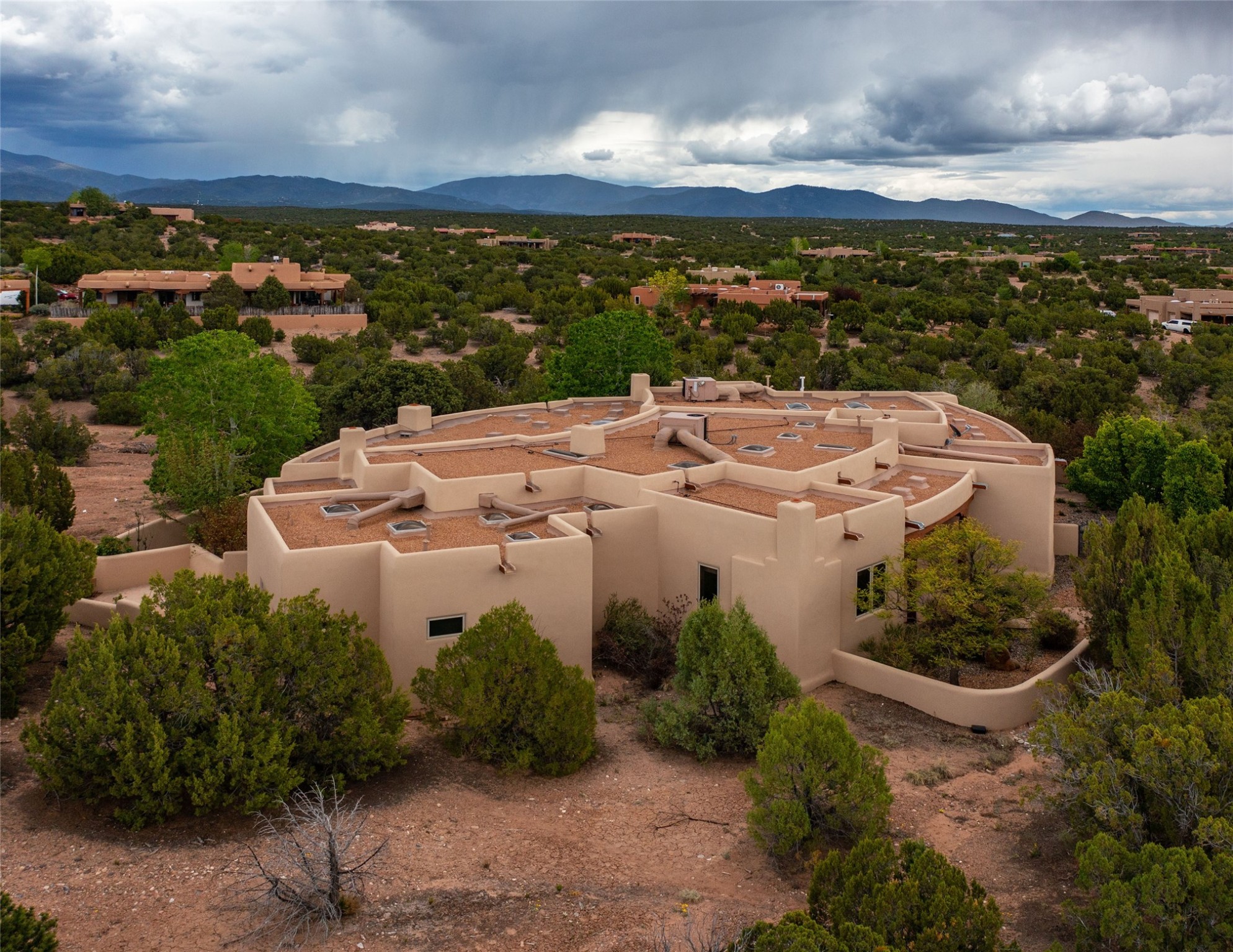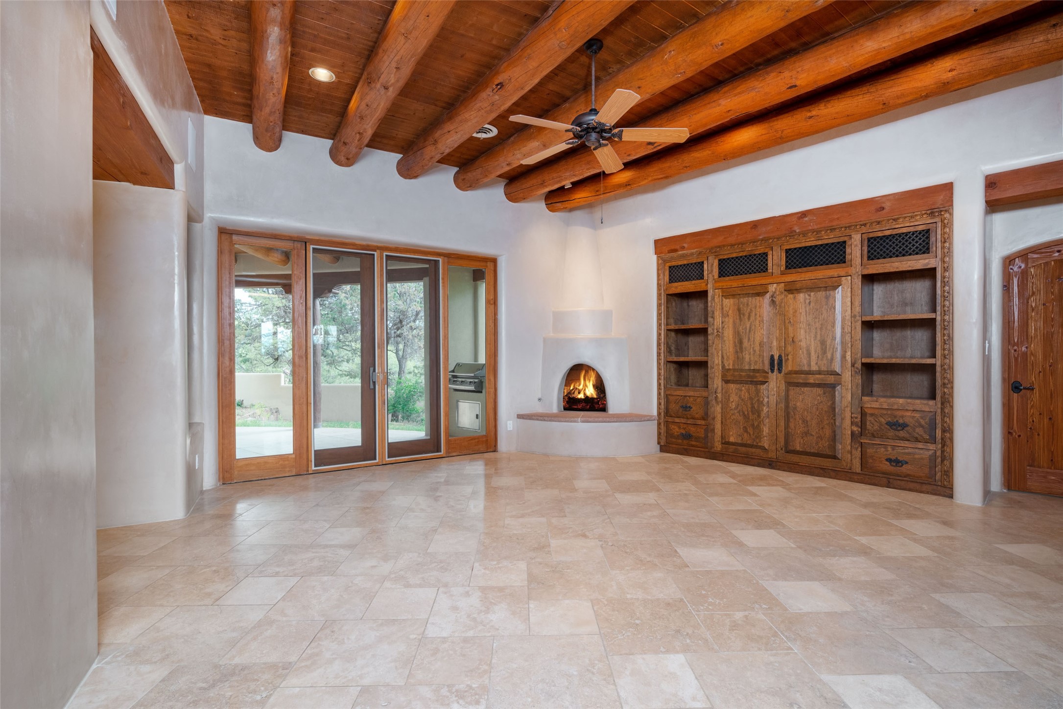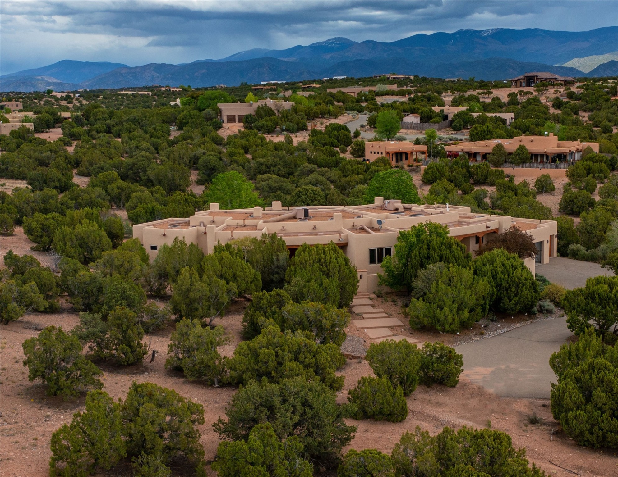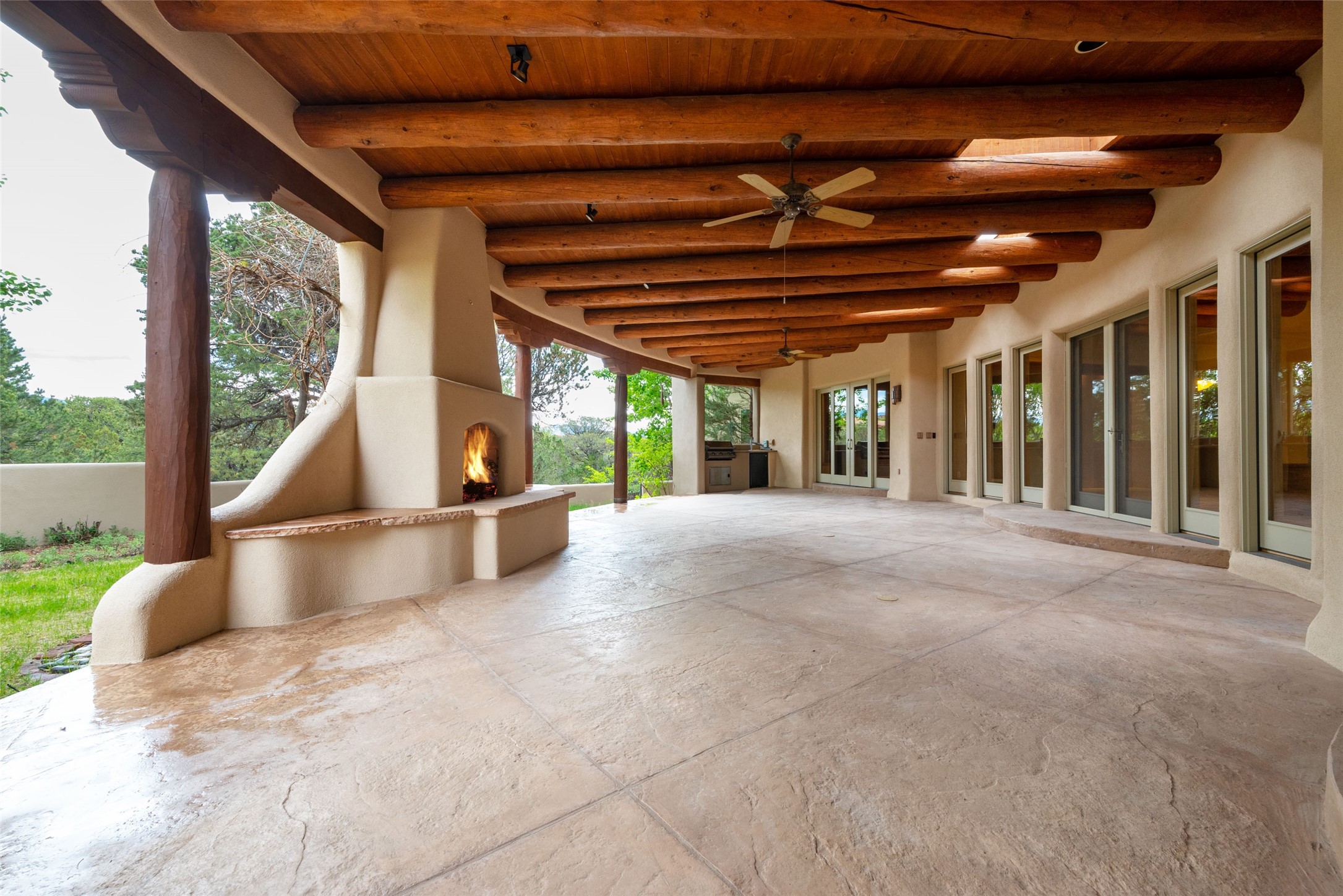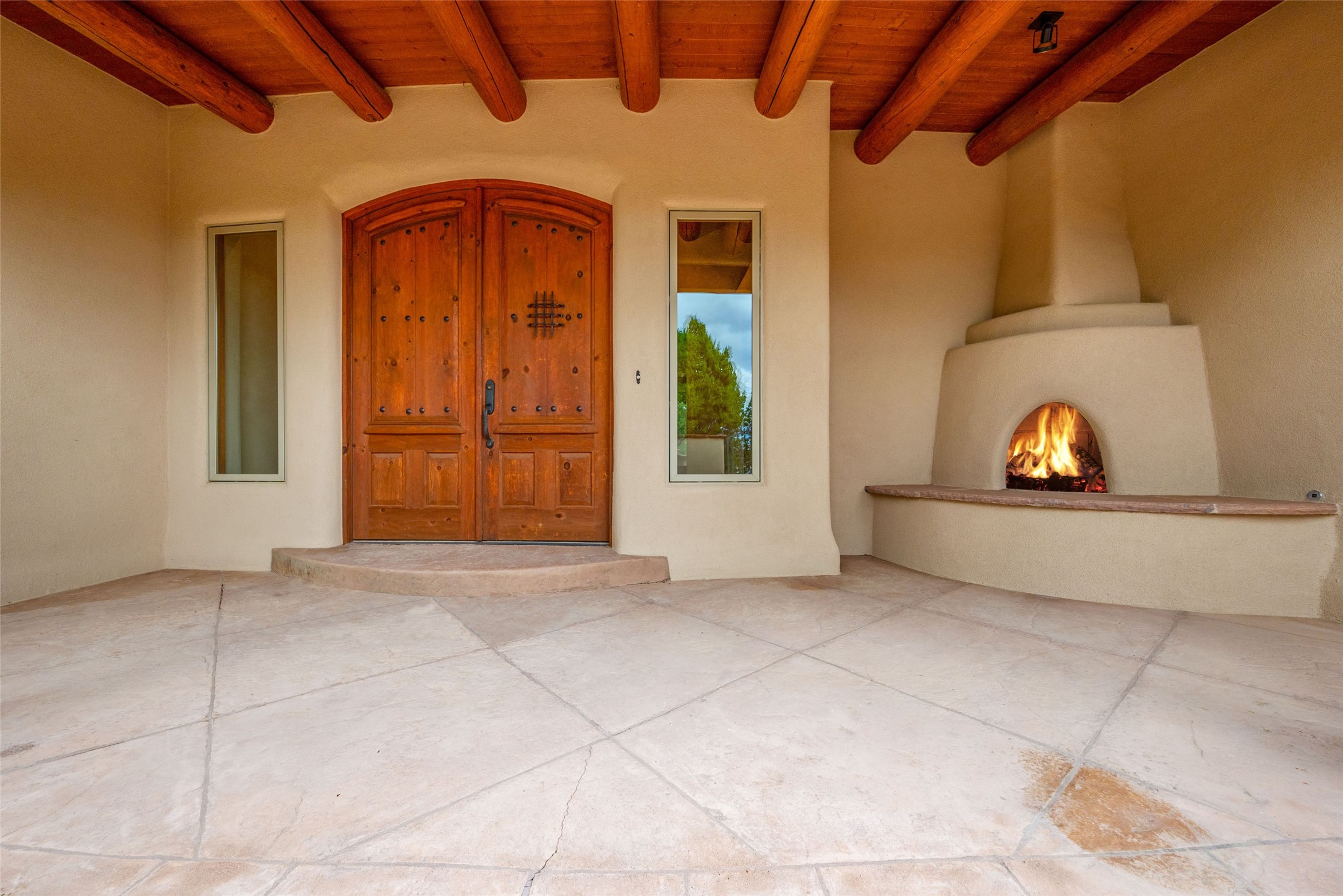 Minutes to downtown Santa Fe, this 4393 sqft single level 4 bedroom 3 1/2 bath home is sited on 2.5 acres. The open floor plan, plaster walls, vigas, and high ceilings welcome you into this traditional Santa Fe style home. A wine room, 4 interior and 2 exterior gas viga fireplaces, as well as skylights throughout, add to its charm. The covered portal is designed as an extension of the living areas and is accessible through multiple glass doors along the north side of the home. It includes a kiva fireplace, built-in Bar-B-Q, and refrigerator. The kitchen is spacious, open, and bright with a south-facing window that overlooks a private courtyard with forever views. This home also has a 9 ft bar that adjoins the family room with additional beautiful built-in custom cabinetry. The walk-in pantry has floor-to-ceiling shelving and is conveniently located off the kitchen. The primary bedroom suite includes a large bath with his & her vanities, jetted tub, oversized shower and walk-in closet. The suite also has a fully walled courtyard for a private retreat. There are two ensuite bedrooms with private baths and walk-in closets, as well as an additional bedroom that can be used as an office. This solar-powered home includes a 3 car garage, radiant heat and two HVAC units for additional heating and refrigerated air. County Assessor shows the square footage at 4393 which differs from the floor plan provided. Neither Listing Brokers nor Seller warrant the square footage of the home or lot. If size of the home or lot are of material consideration to the Buyer, then the Buyer should have them measured. Tax Levy is from the Assessor website. All fires depicted are photo-shopped. Buyer to verify functionality of the fireplaces.