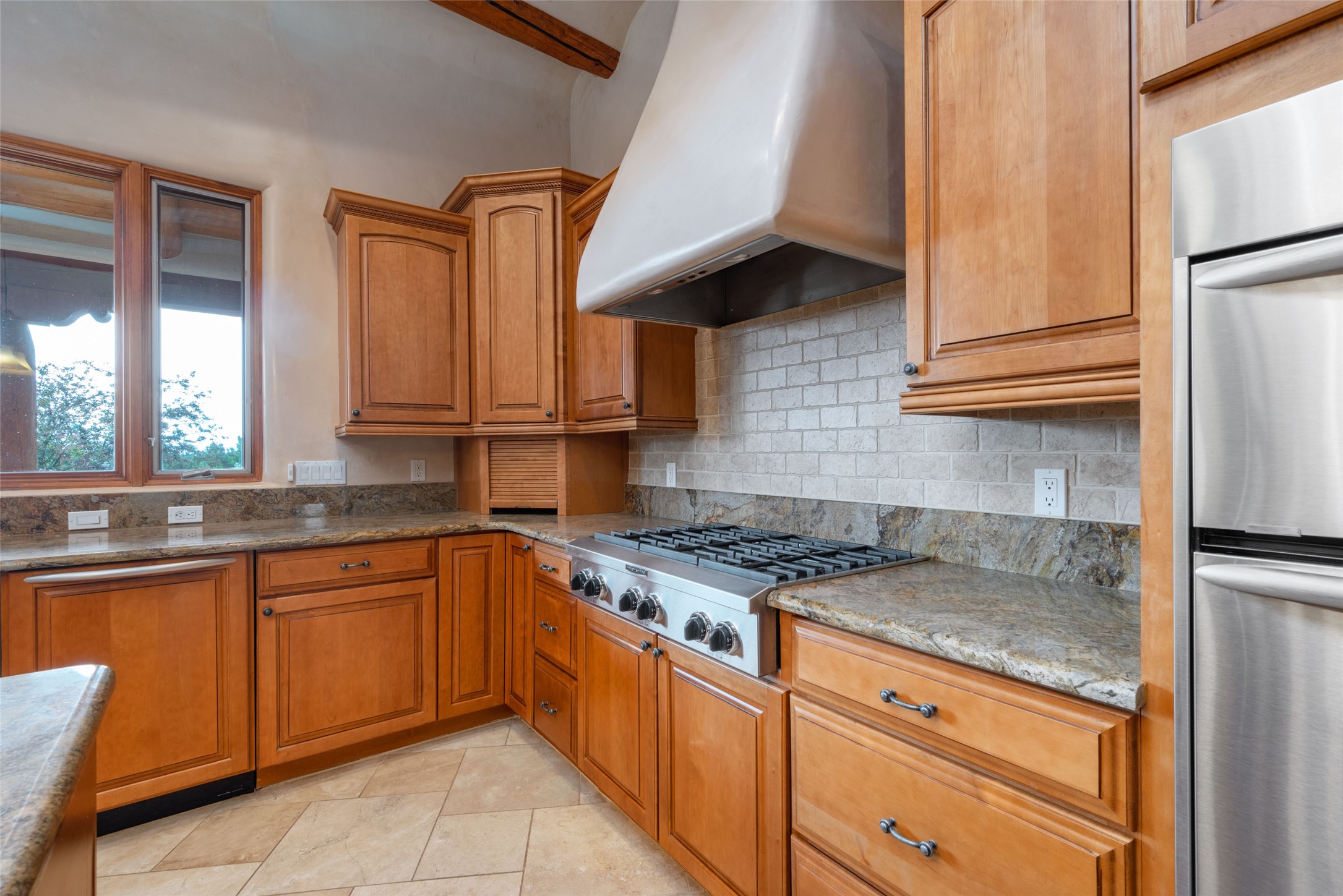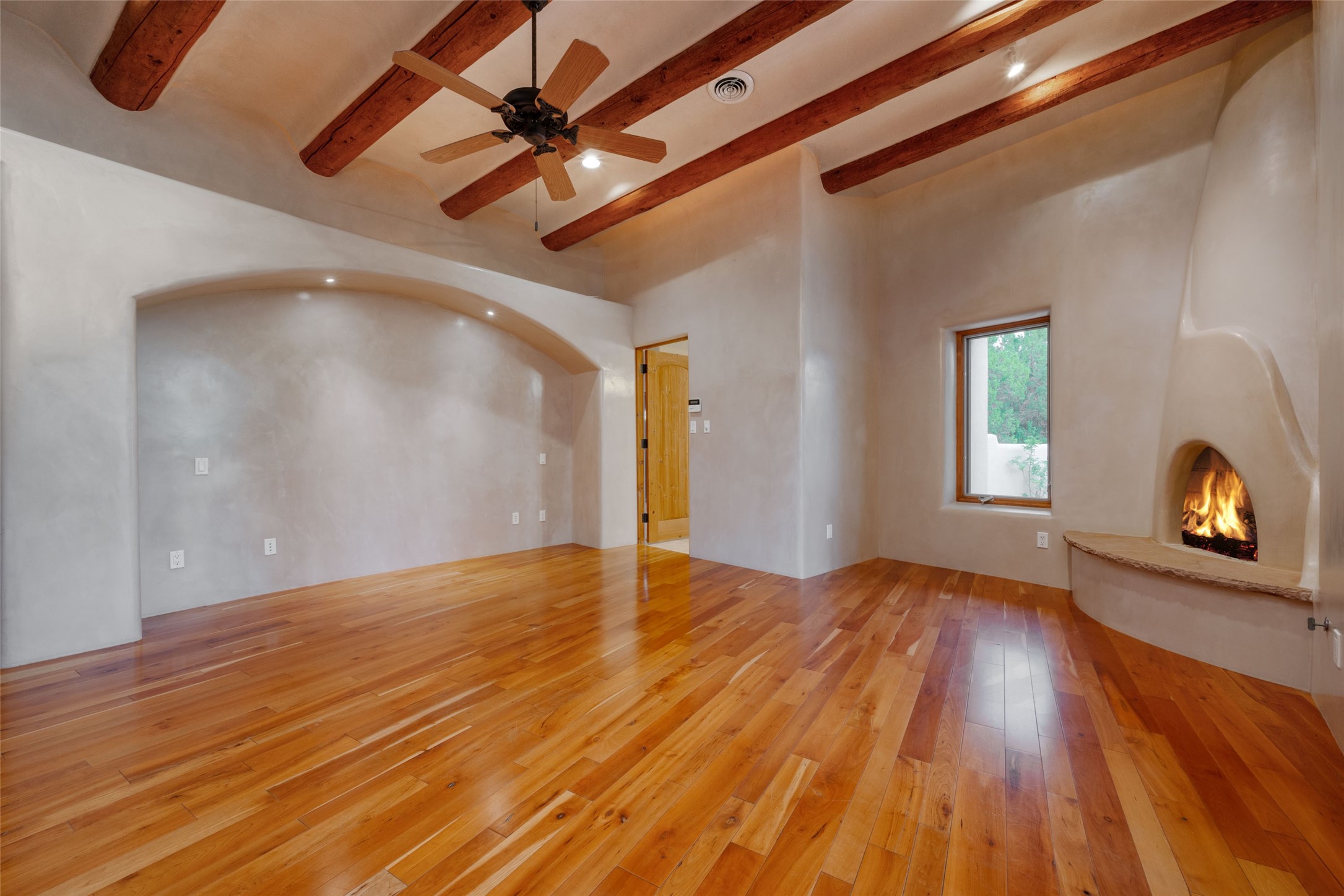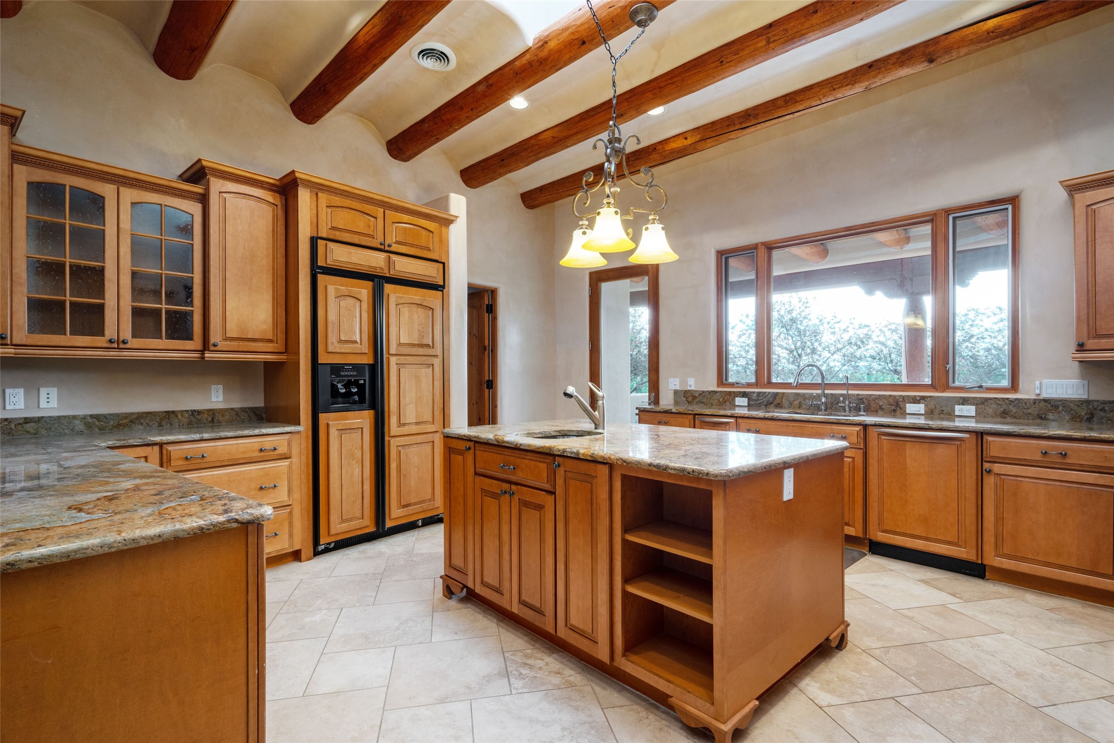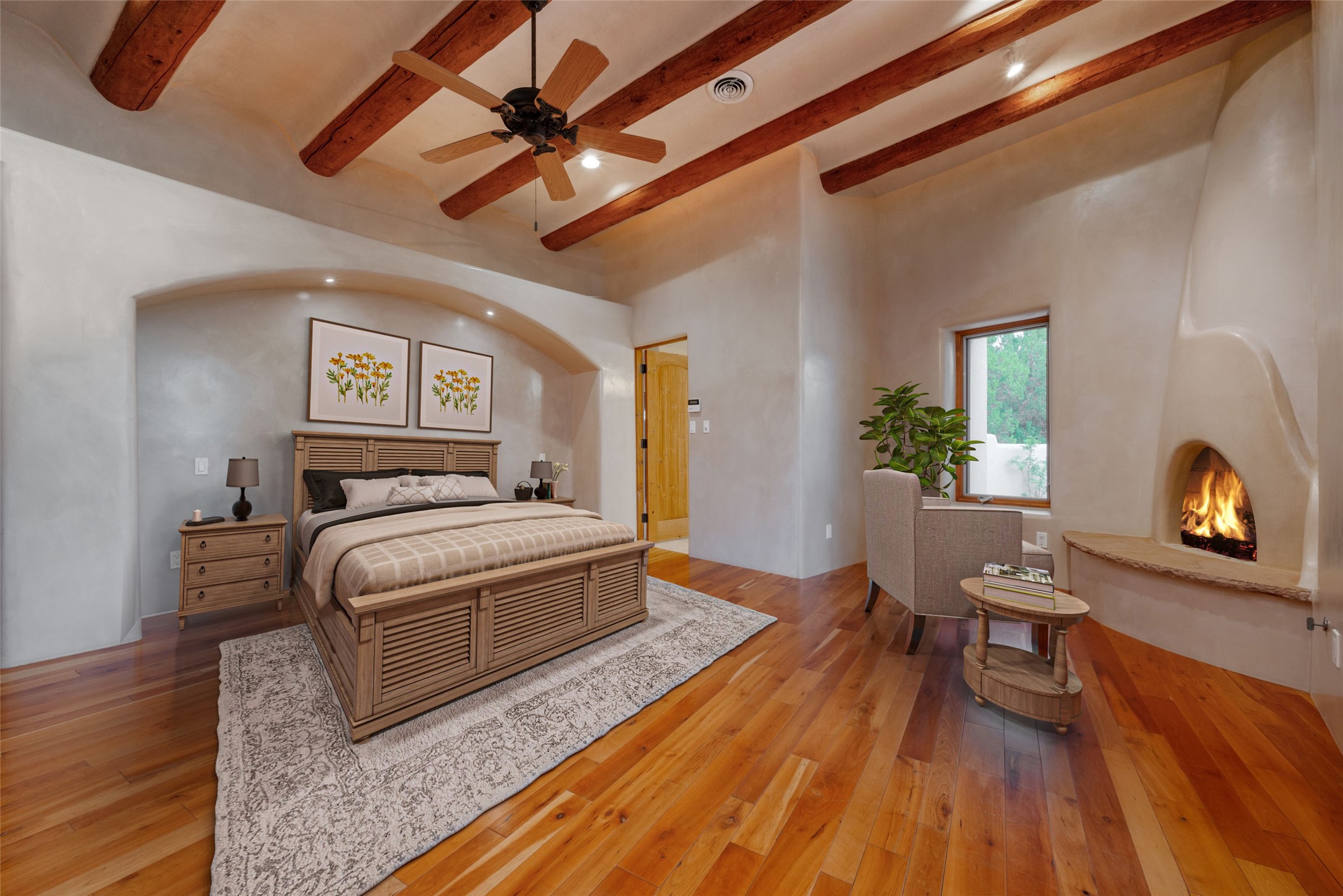 Minutes to downtown Santa Fe, this 4393 sqft single level 4 bedroom 3 1/2 bath home is sited on 2.5 acres. The open floor plan, plaster walls, vigas, and high ceilings welcome you into this traditional Santa Fe style home. A wine room, 4 interior and 2 exterior gas viga fireplaces, as well as skylights throughout, add to its charm. The covered portal is designed as an extension of the living areas and is accessible through multiple glass doors along the north side of the home. It includes a kiva fireplace, built-in Bar-B-Q, and refrigerator. The kitchen is spacious, open, and bright with a south-facing window that overlooks a private courtyard with forever views. This home also has a 9 ft bar that adjoins the family room with additional beautiful built-in custom cabinetry. The walk-in pantry has floor-to-ceiling shelving and is conveniently located off the kitchen. The primary bedroom suite includes a large bath with his & her vanities, jetted tub, oversized shower and walk-in closet. The suite also has a fully walled courtyard for a private retreat. There are two ensuite bedrooms with private baths and walk-in closets, as well as an additional bedroom that can be used as an office. This solar-powered home includes a 3 car garage, radiant heat and two HVAC units for additional heating and refrigerated air. County Assessor shows the square footage at 4393 which differs from the floor plan provided. Neither Listing Brokers nor Seller warrant the square footage of the home or lot. If size of the home or lot are of material consideration to the Buyer, then the Buyer should have them measured. Tax Levy is from the Assessor website. All fires depicted are photo-shopped. Buyer to verify functionality of the fireplaces.