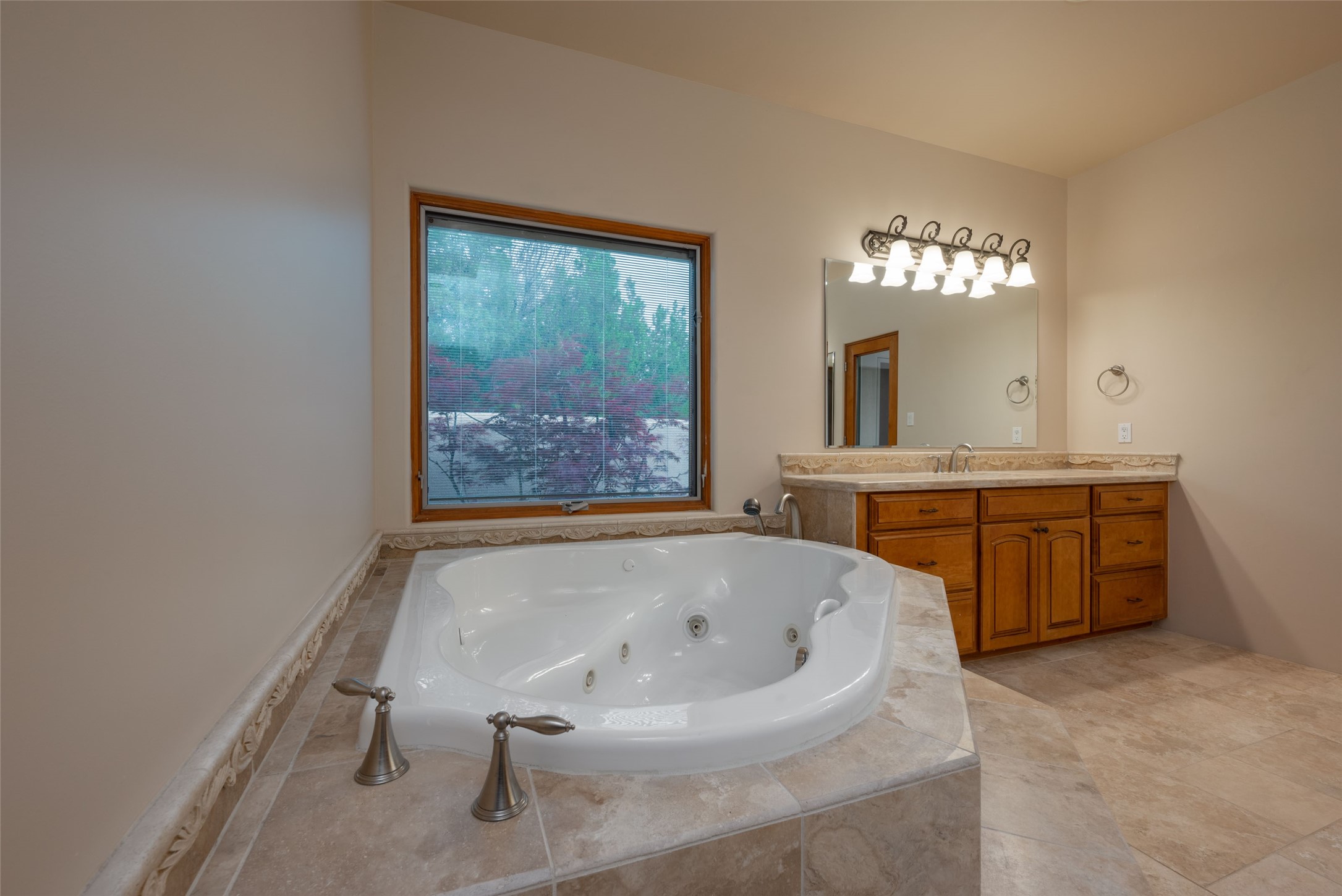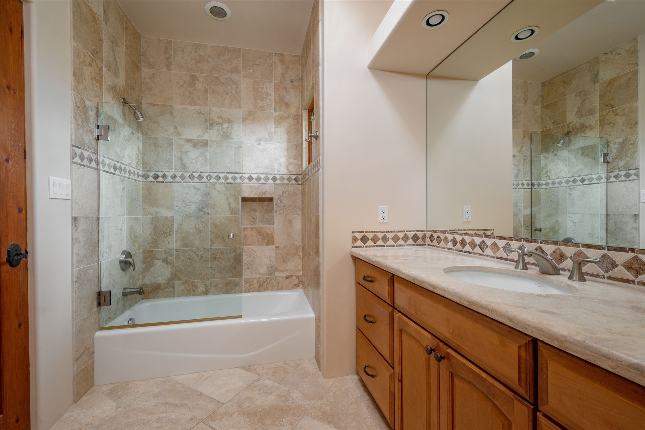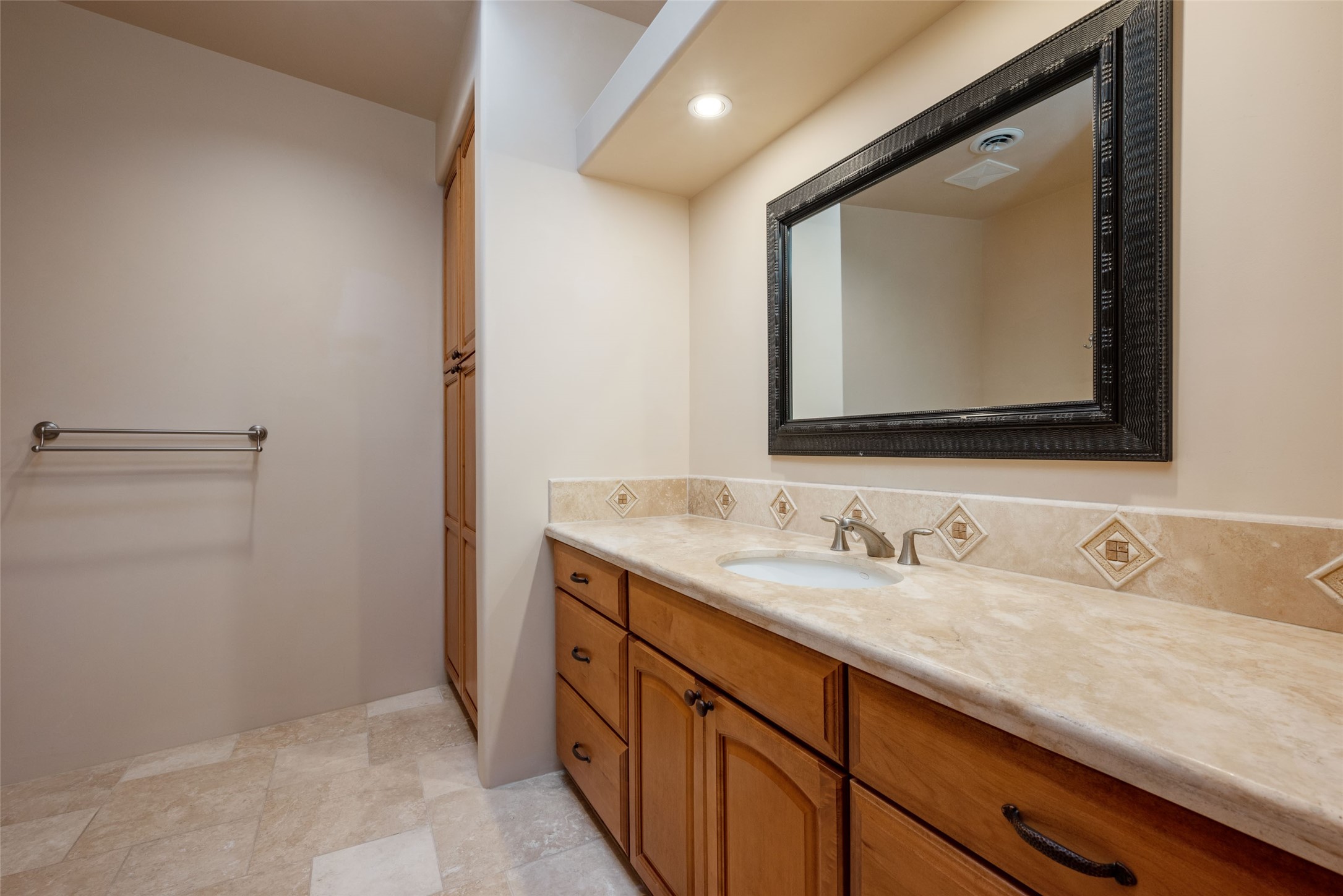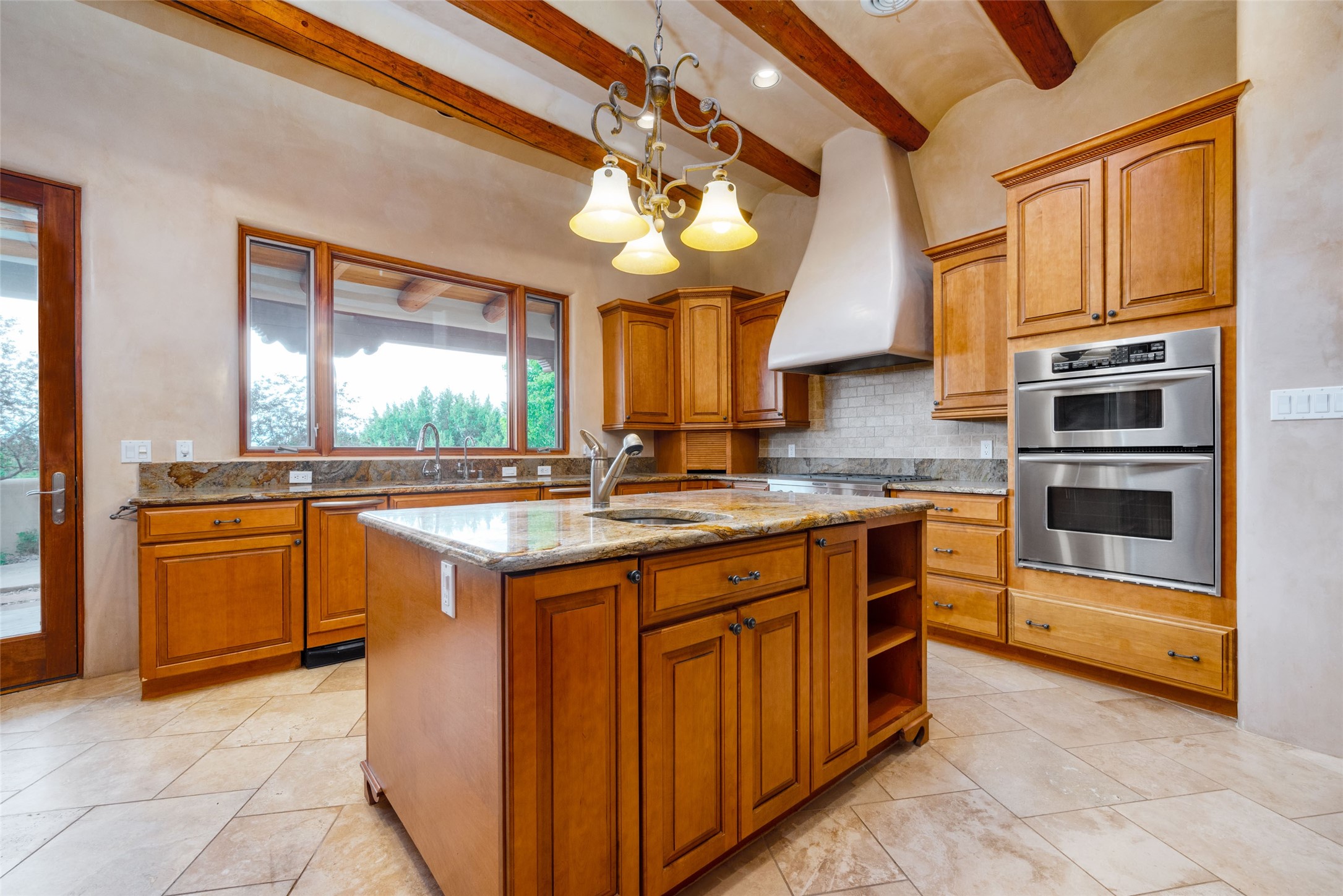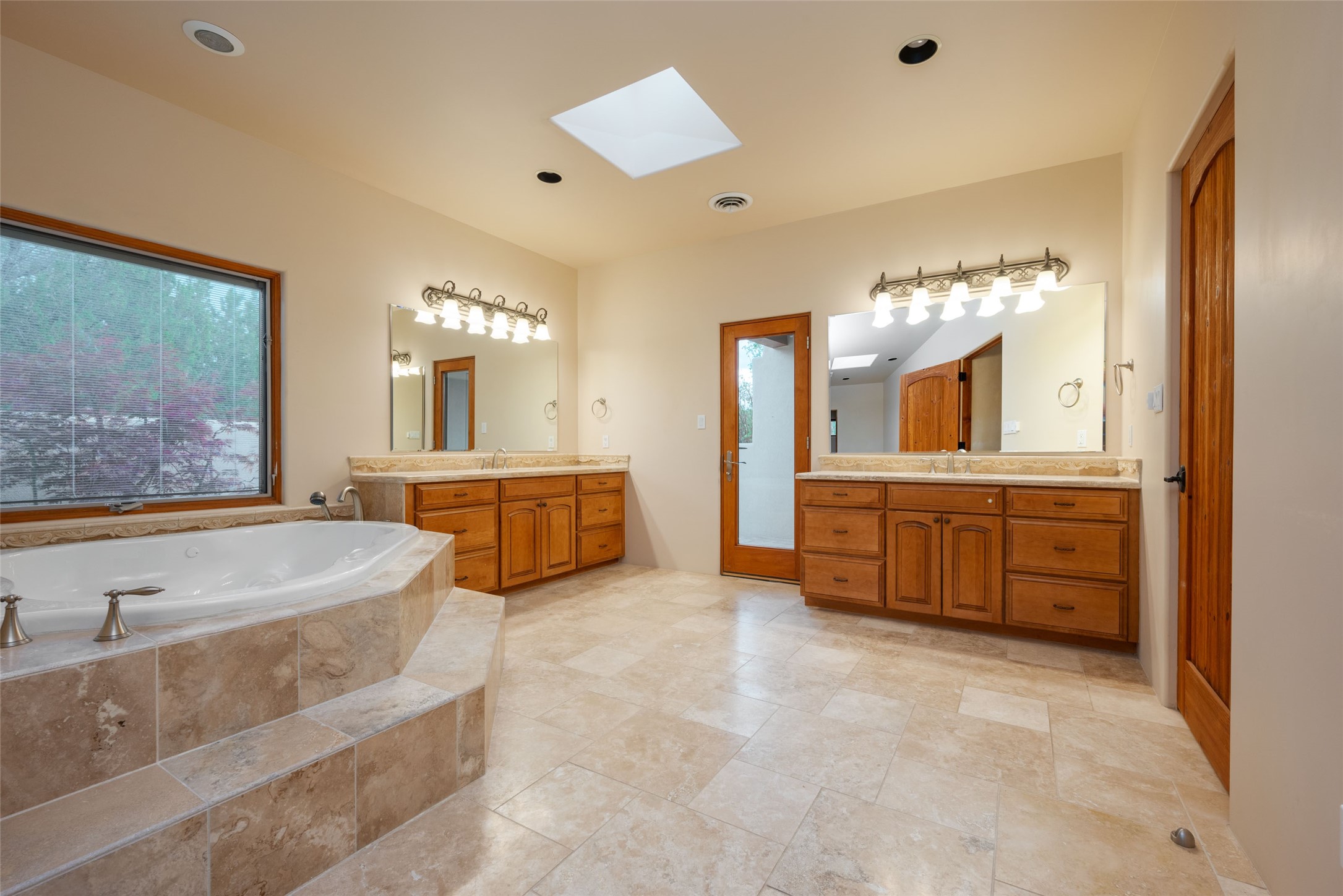 Minutes to downtown Santa Fe, this 4393 sqft single level 4 bedroom 3 1/2 bath home is sited on 2.5 acres. The open floor plan, plaster walls, vigas, and high ceilings welcome you into this traditional Santa Fe style home. A wine room, 4 interior and 2 exterior gas viga fireplaces, as well as skylights throughout, add to its charm. The covered portal is designed as an extension of the living areas and is accessible through multiple glass doors along the north side of the home. It includes a kiva fireplace, built-in Bar-B-Q, and refrigerator. The kitchen is spacious, open, and bright with a south-facing window that overlooks a private courtyard with forever views. This home also has a 9 ft bar that adjoins the family room with additional beautiful built-in custom cabinetry. The walk-in pantry has floor-to-ceiling shelving and is conveniently located off the kitchen. The primary bedroom suite includes a large bath with his & her vanities, jetted tub, oversized shower and walk-in closet. The suite also has a fully walled courtyard for a private retreat. There are two ensuite bedrooms with private baths and walk-in closets, as well as an additional bedroom that can be used as an office. This solar-powered home includes a 3 car garage, radiant heat and two HVAC units for additional heating and refrigerated air. County Assessor shows the square footage at 4393 which differs from the floor plan provided. Neither Listing Brokers nor Seller warrant the square footage of the home or lot. If size of the home or lot are of material consideration to the Buyer, then the Buyer should have them measured. Tax Levy is from the Assessor website. All fires depicted are photo-shopped. Buyer to verify functionality of the fireplaces.