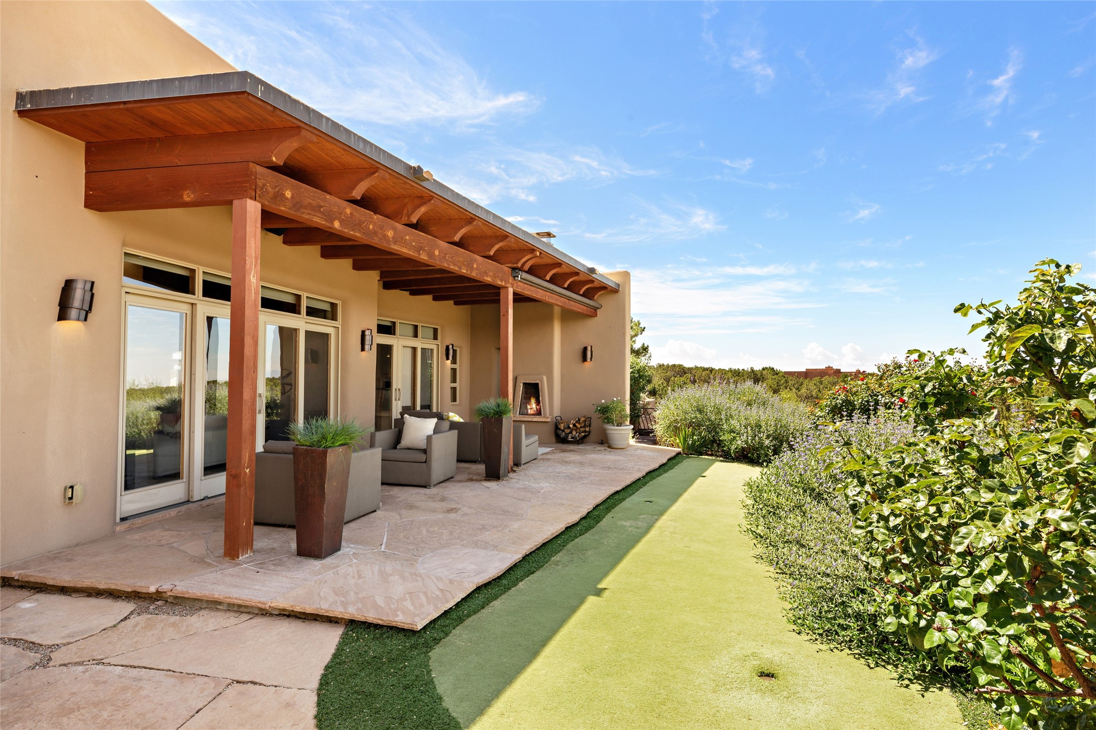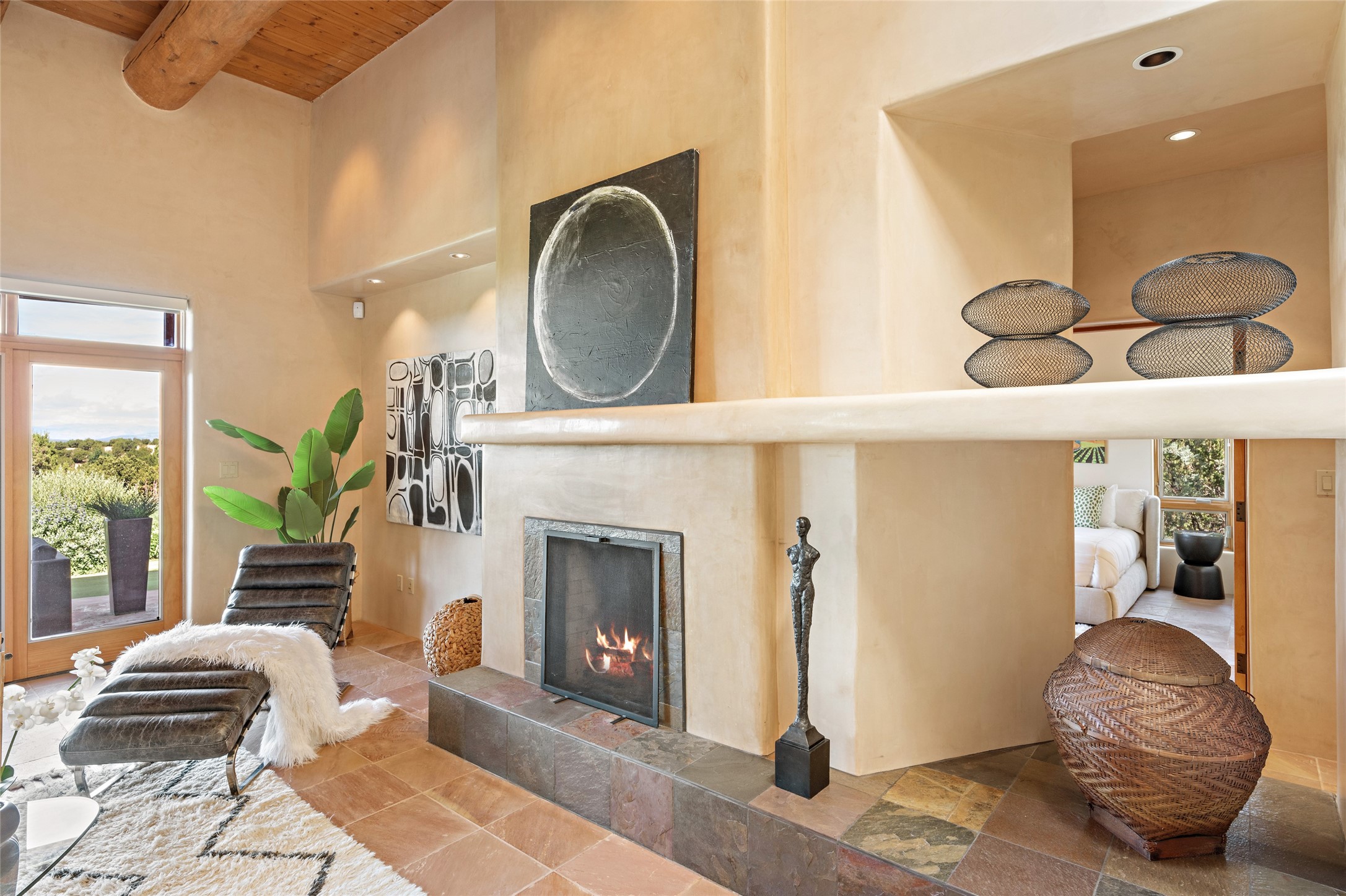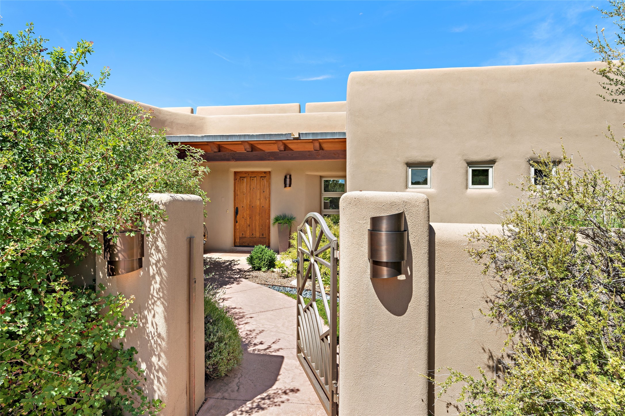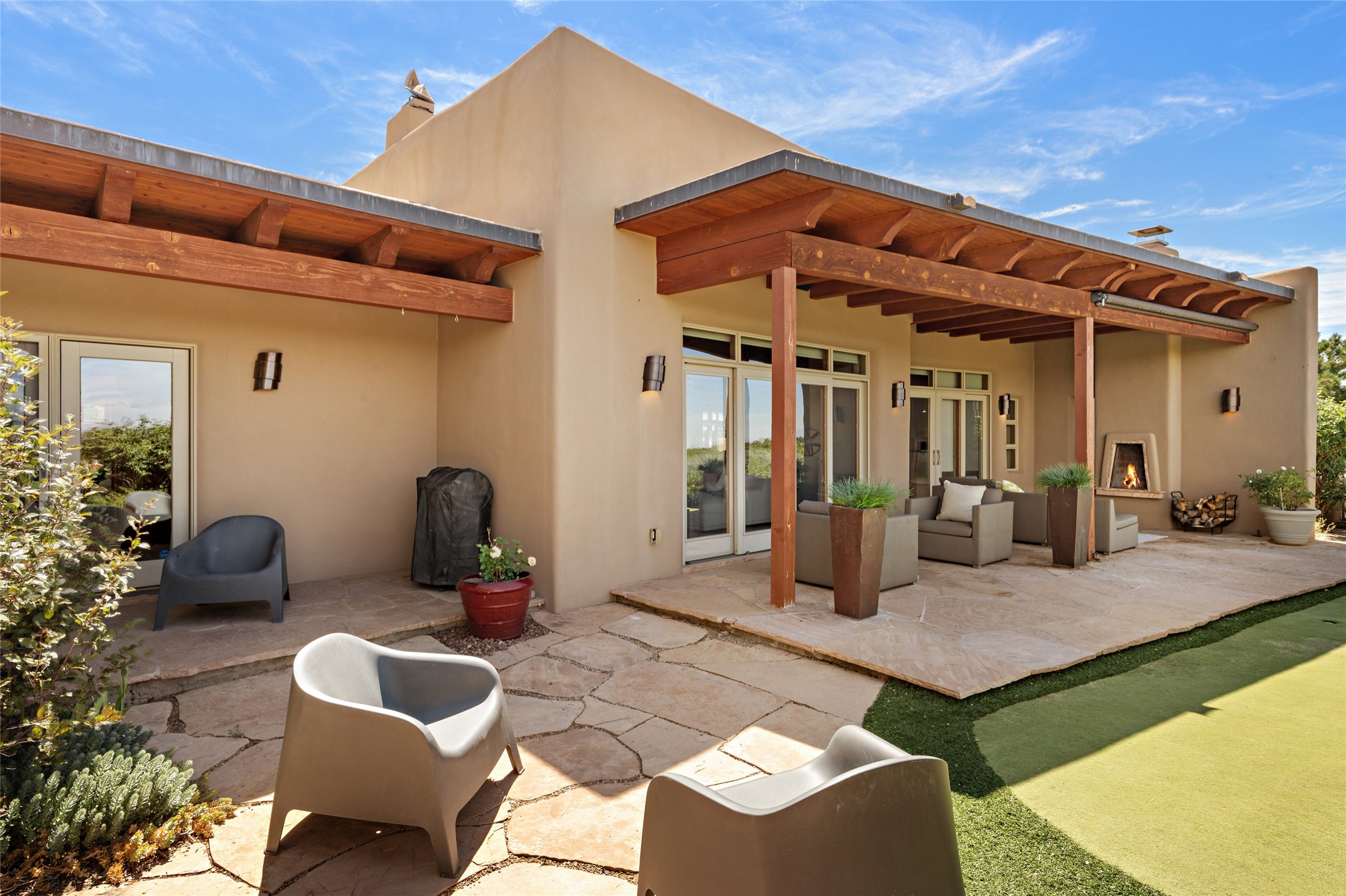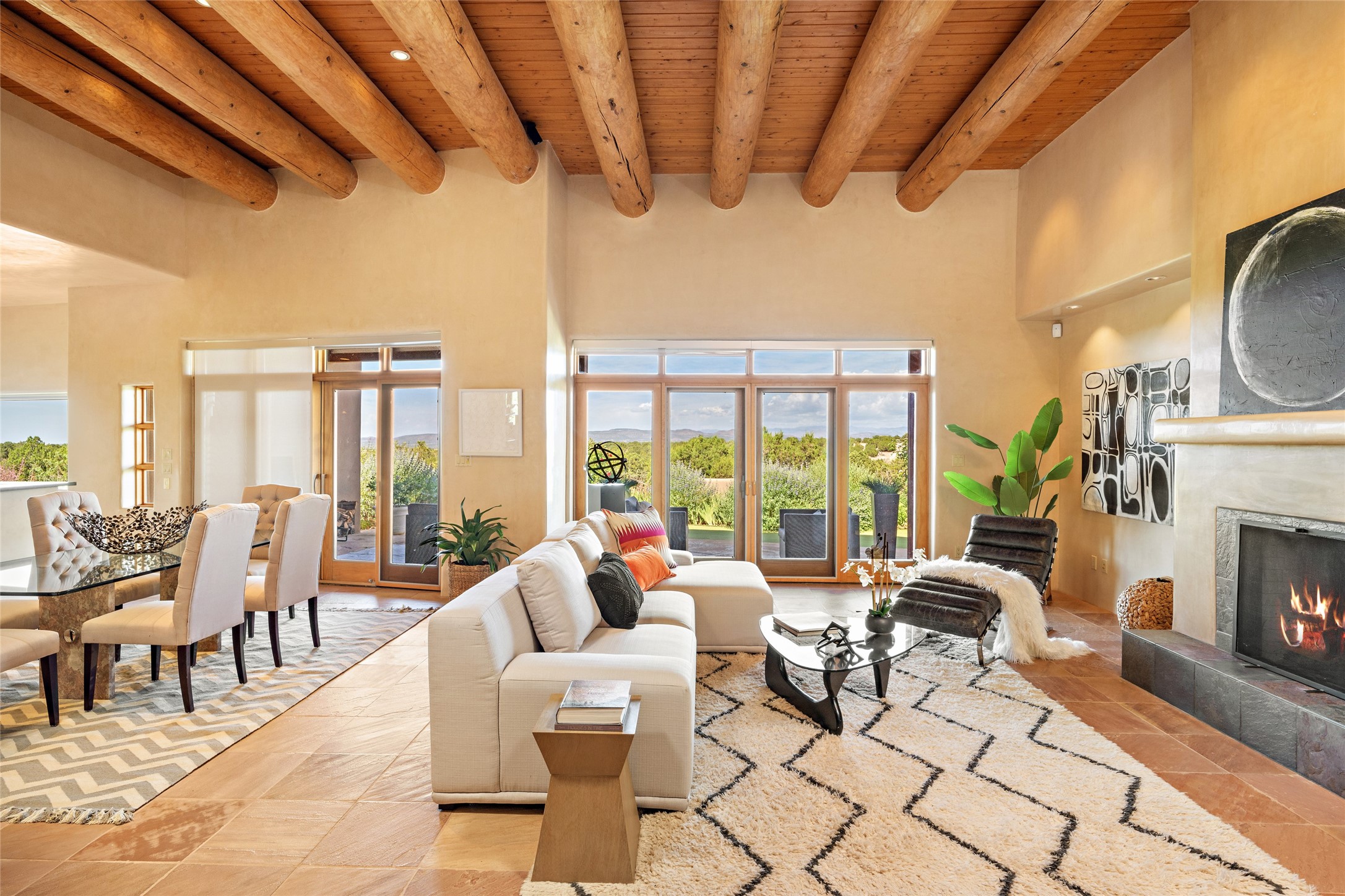 THIS LAS CAMPANAS SINGLE LEVEL HOME OPENS UP TO THE EXPANSIVE JEMEZ VIEWS AND WIDE-OPEN SKY OF SANTA FE! Welcome to the home of sweet dreams in Las Campanas, a prestigious gated community in Santa Fe, New Mexico. This stunning property offers unparalleled views of the Jemez Mountains and the surrounding natural beauty. Situated on a spacious 3-acre lot at the end of a sleepy cul-de-sac, this home is a peaceful oasis that invites you to relax and enjoy the serene lifestyle. This home features 3 bedrooms, a great office and 2.5 bathrooms. The interior design is a perfect blend of contemporary and traditional Santa Fe style, with high ceilings, vigas & beams, plaster walls, stone floors, fireplaces and skylights. The open floor plan allows for easy flow between the living room, dining room, and kitchen, creating a great space for entertaining or family gatherings. The gourmet kitchen is equipped with stainless steel appliances, granite countertops and a walk-in pantry. The master suite is a luxurious retreat with a fireplace, a walk-in closet and a spa-like bathroom with a soaking tub, a separate shower and dual sinks. The other two bedrooms are spacious and share a full bathroom. The outdoor living space is equally impressive, with a covered portal featuring a cozy seating area with a fireplace and an outdoor dining area that provides shade and comfort for the perfect indoor/outdoor lifestyle. The backyard is landscaped with native plants and trees that blend seamlessly with the natural surroundings. Walk for miles on the nearby trail system. From here, you can enjoy the spectacular views of the mountains and sunset. This home is truly a gem in Las Campanas, where members can enjoy the amenities of the private club - arranged separately and by invitation with the club - which offers 2 Jack Nicholus golf courses, the equestrian center, spa and tennis. Don't miss this opportunity to own this exquisite property that combines luxury, comfort and elegance.