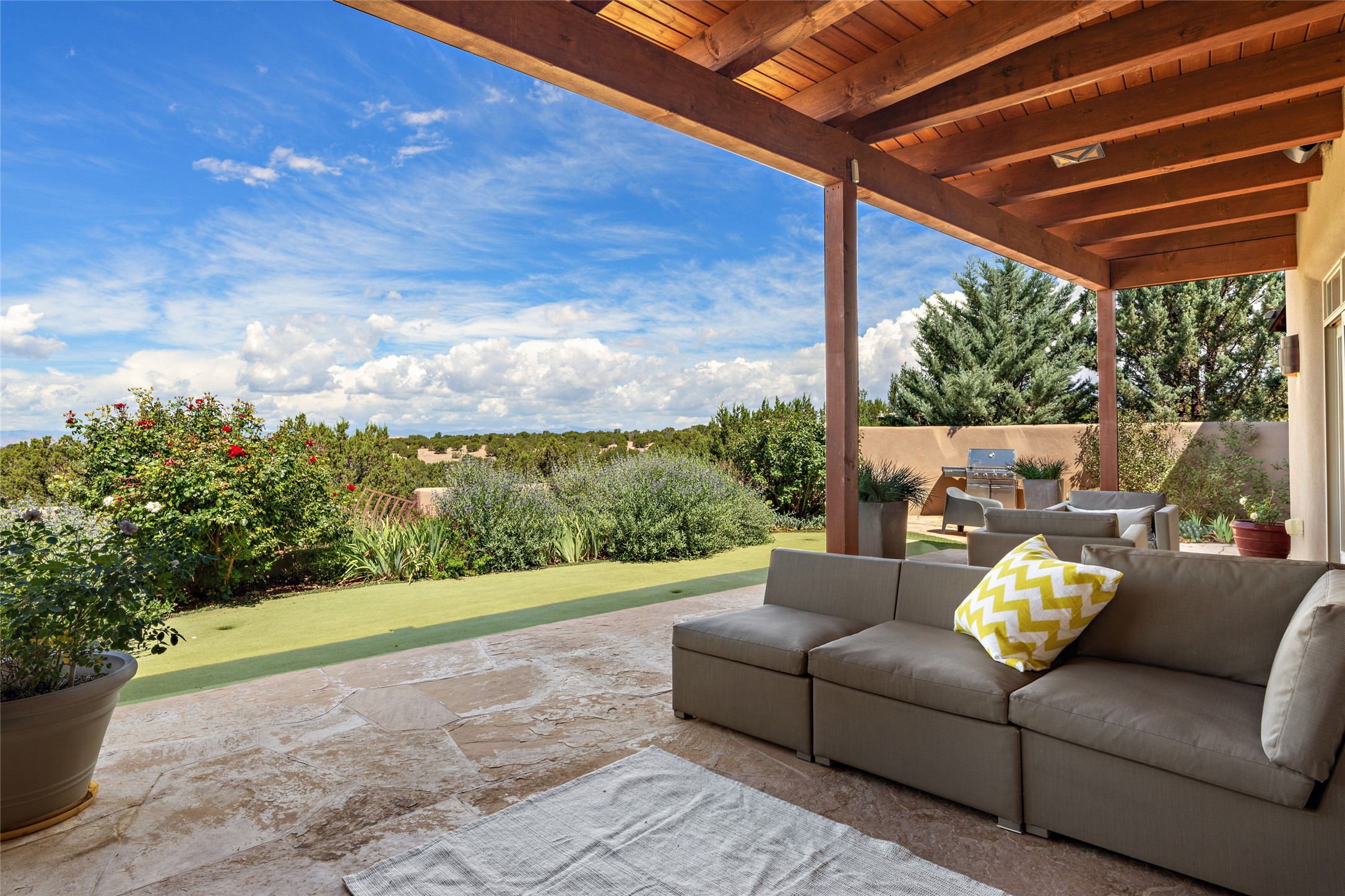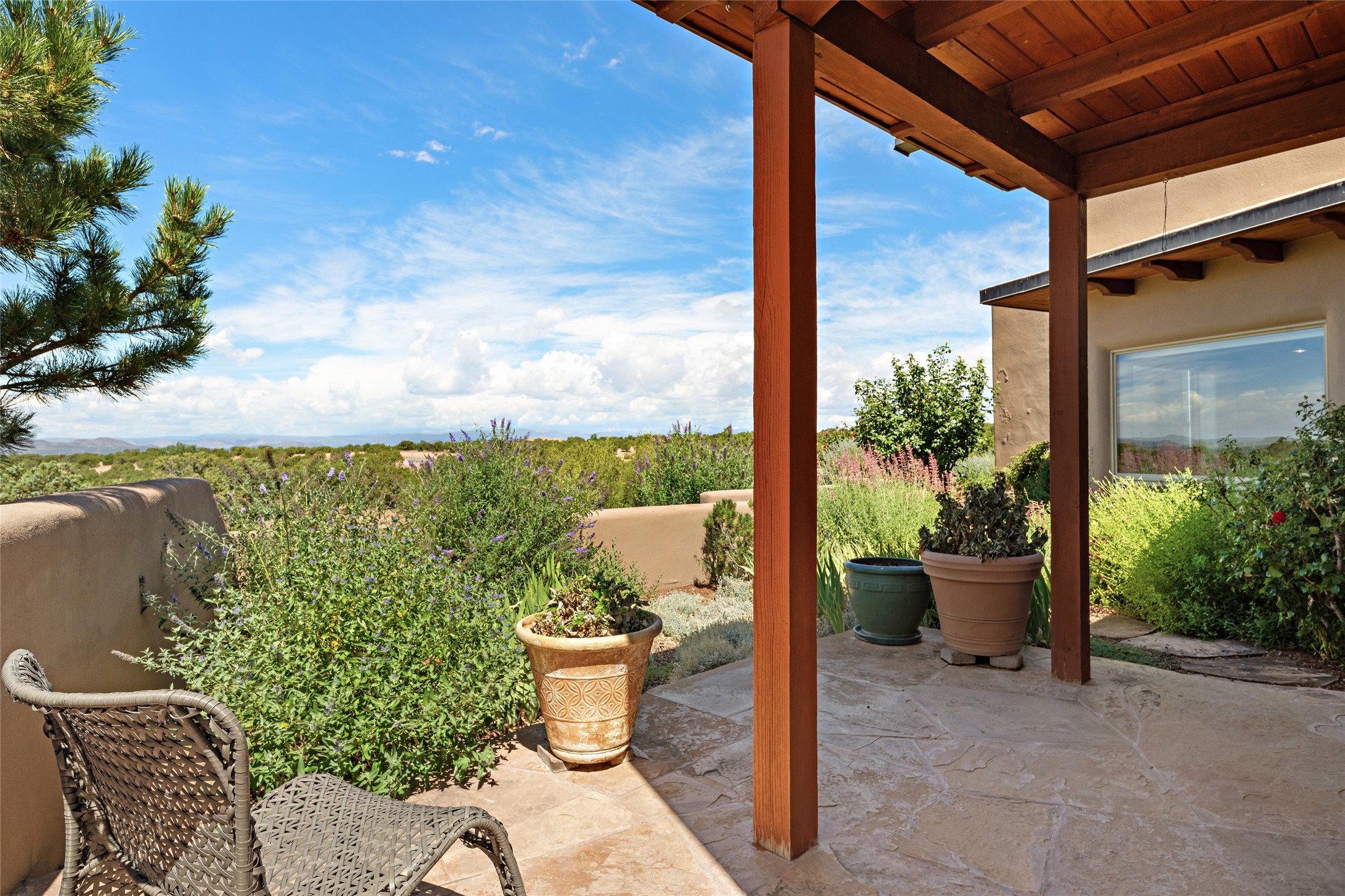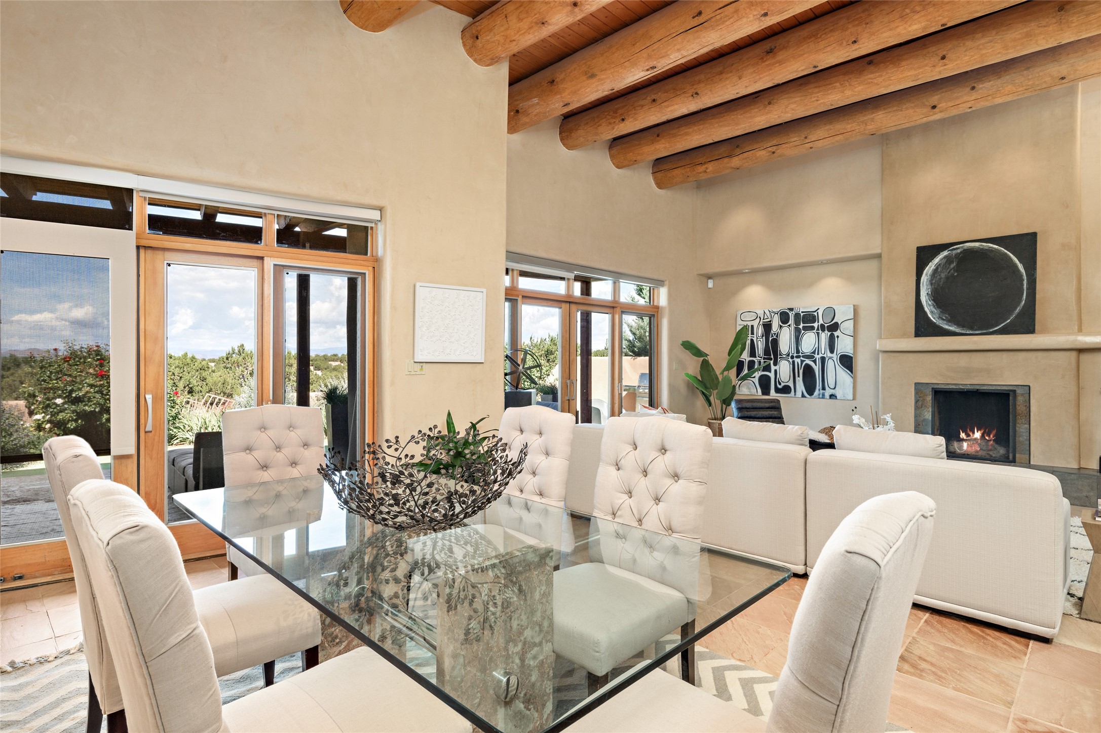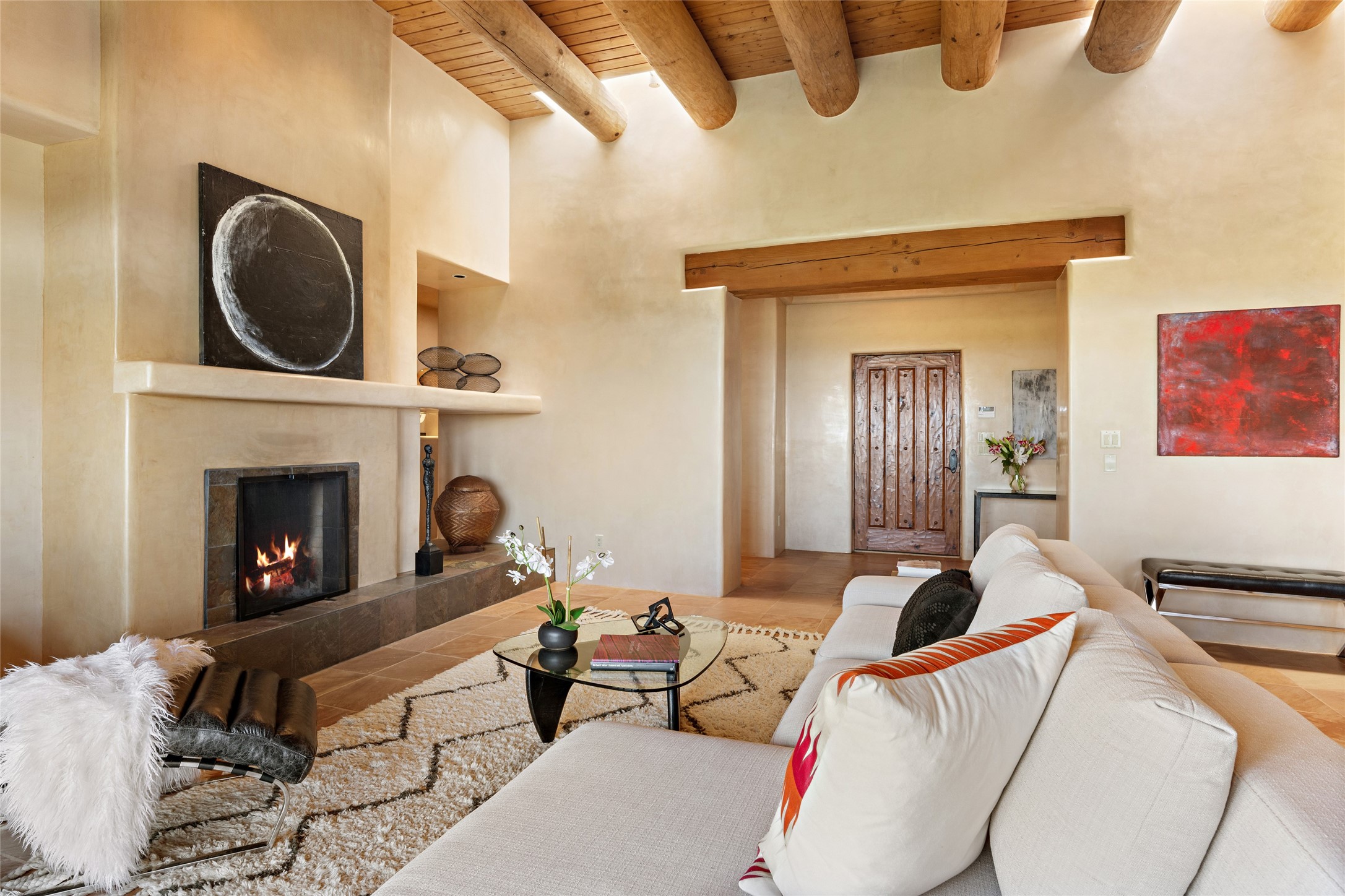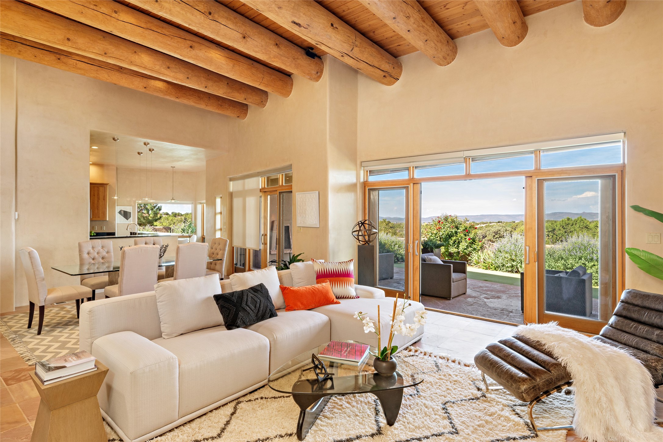 THIS LAS CAMPANAS SINGLE LEVEL HOME OPENS UP TO THE EXPANSIVE JEMEZ VIEWS AND WIDE-OPEN SKY OF SANTA FE! Welcome to the home of sweet dreams in Las Campanas, a prestigious gated community in Santa Fe, New Mexico. This stunning property offers unparalleled views of the Jemez Mountains and the surrounding natural beauty. Situated on a spacious 3-acre lot at the end of a sleepy cul-de-sac, this home is a peaceful oasis that invites you to relax and enjoy the serene lifestyle. This home features 3 bedrooms, a great office and 2.5 bathrooms. The interior design is a perfect blend of contemporary and traditional Santa Fe style, with high ceilings, vigas & beams, plaster walls, stone floors, fireplaces and skylights. The open floor plan allows for easy flow between the living room, dining room, and kitchen, creating a great space for entertaining or family gatherings. The gourmet kitchen is equipped with stainless steel appliances, granite countertops and a walk-in pantry. The master suite is a luxurious retreat with a fireplace, a walk-in closet and a spa-like bathroom with a soaking tub, a separate shower and dual sinks. The other two bedrooms are spacious and share a full bathroom. The outdoor living space is equally impressive, with a covered portal featuring a cozy seating area with a fireplace and an outdoor dining area that provides shade and comfort for the perfect indoor/outdoor lifestyle. The backyard is landscaped with native plants and trees that blend seamlessly with the natural surroundings. Walk for miles on the nearby trail system. From here, you can enjoy the spectacular views of the mountains and sunset. This home is truly a gem in Las Campanas, where members can enjoy the amenities of the private club - arranged separately and by invitation with the club - which offers 2 Jack Nicholus golf courses, the equestrian center, spa and tennis. Don't miss this opportunity to own this exquisite property that combines luxury, comfort and elegance.