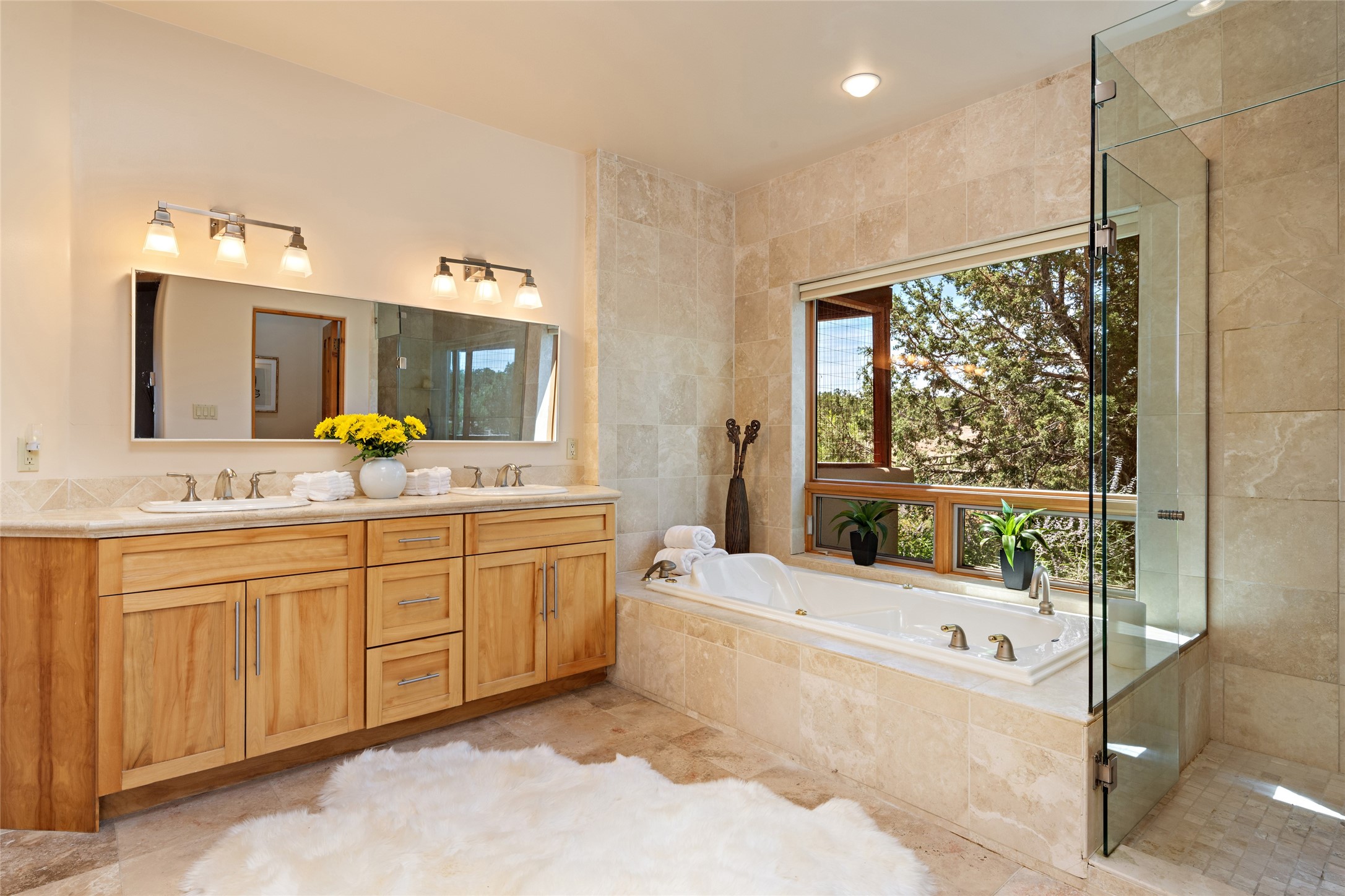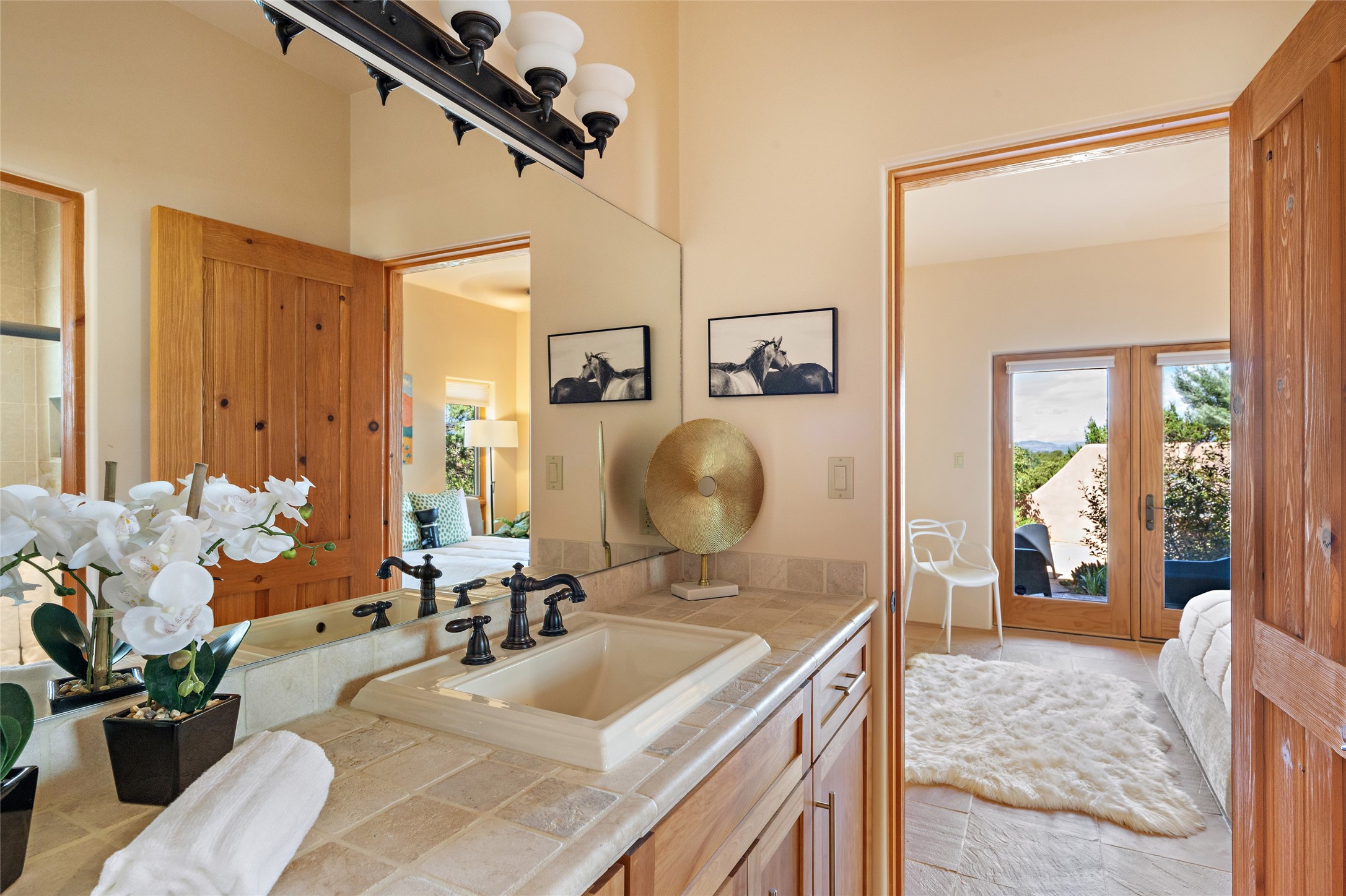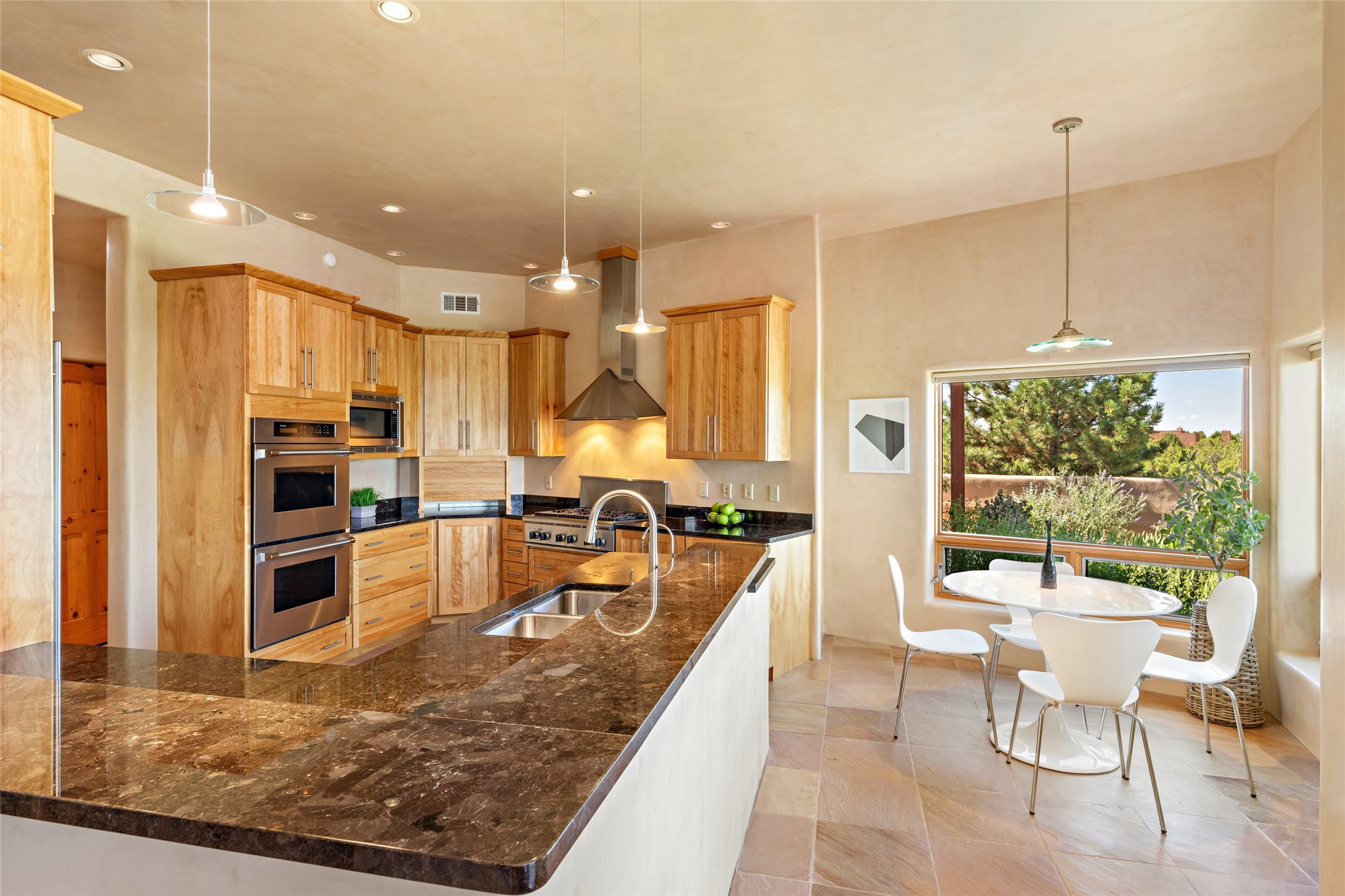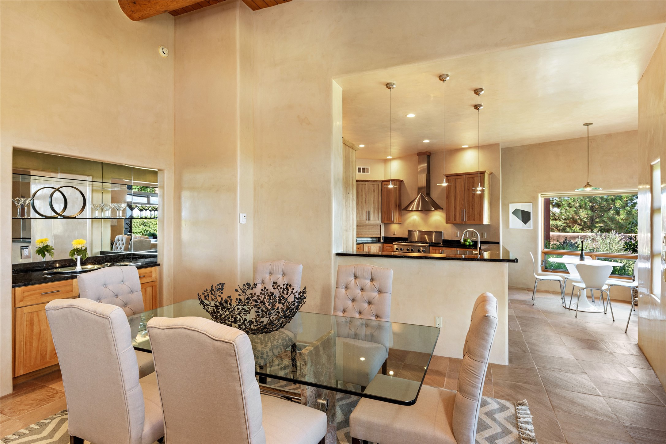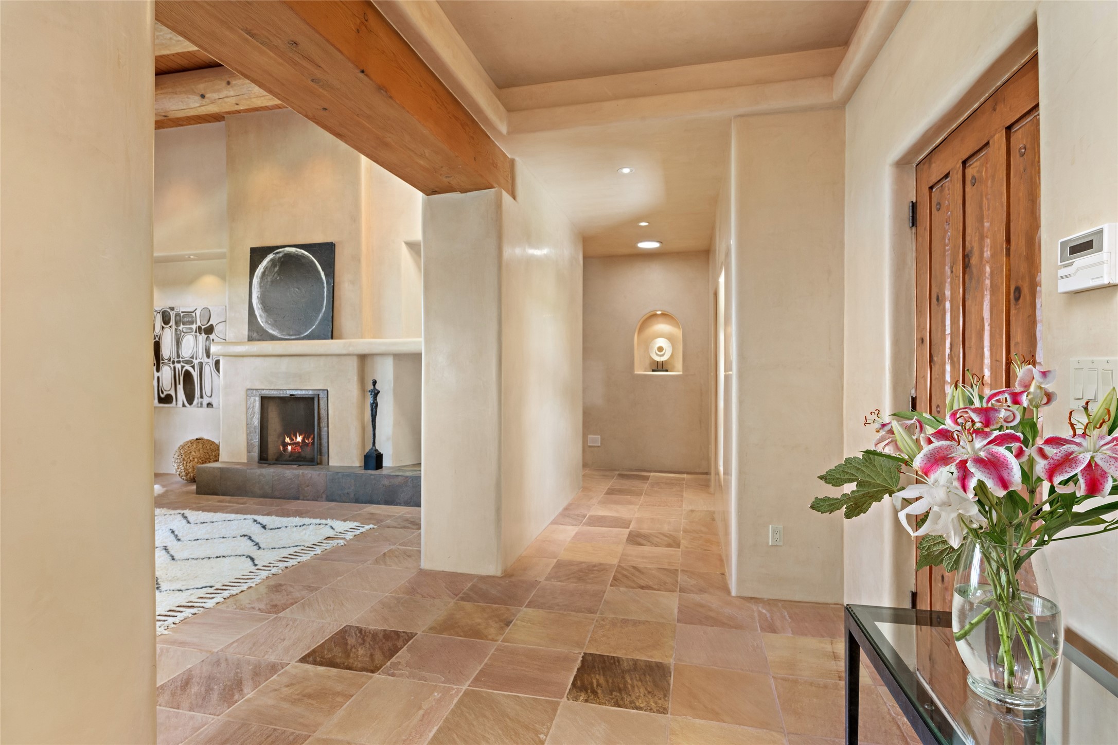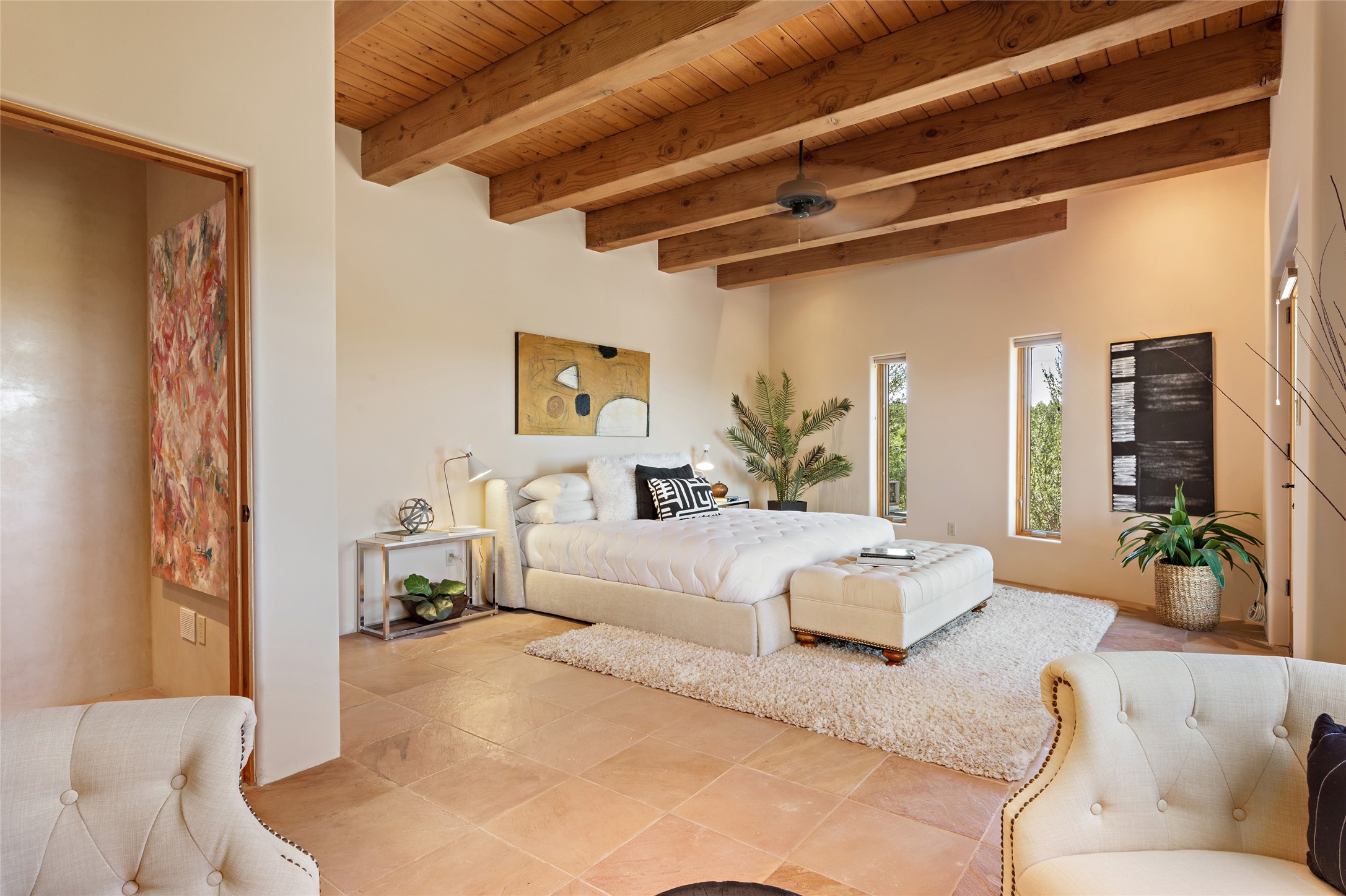 THIS LAS CAMPANAS SINGLE LEVEL HOME OPENS UP TO THE EXPANSIVE JEMEZ VIEWS AND WIDE-OPEN SKY OF SANTA FE! Welcome to the home of sweet dreams in Las Campanas, a prestigious gated community in Santa Fe, New Mexico. This stunning property offers unparalleled views of the Jemez Mountains and the surrounding natural beauty. Situated on a spacious 3-acre lot at the end of a sleepy cul-de-sac, this home is a peaceful oasis that invites you to relax and enjoy the serene lifestyle. This home features 3 bedrooms, a great office and 2.5 bathrooms. The interior design is a perfect blend of contemporary and traditional Santa Fe style, with high ceilings, vigas & beams, plaster walls, stone floors, fireplaces and skylights. The open floor plan allows for easy flow between the living room, dining room, and kitchen, creating a great space for entertaining or family gatherings. The gourmet kitchen is equipped with stainless steel appliances, granite countertops and a walk-in pantry. The master suite is a luxurious retreat with a fireplace, a walk-in closet and a spa-like bathroom with a soaking tub, a separate shower and dual sinks. The other two bedrooms are spacious and share a full bathroom. The outdoor living space is equally impressive, with a covered portal featuring a cozy seating area with a fireplace and an outdoor dining area that provides shade and comfort for the perfect indoor/outdoor lifestyle. The backyard is landscaped with native plants and trees that blend seamlessly with the natural surroundings. Walk for miles on the nearby trail system. From here, you can enjoy the spectacular views of the mountains and sunset. This home is truly a gem in Las Campanas, where members can enjoy the amenities of the private club - arranged separately and by invitation with the club - which offers 2 Jack Nicholus golf courses, the equestrian center, spa and tennis. Don't miss this opportunity to own this exquisite property that combines luxury, comfort and elegance.