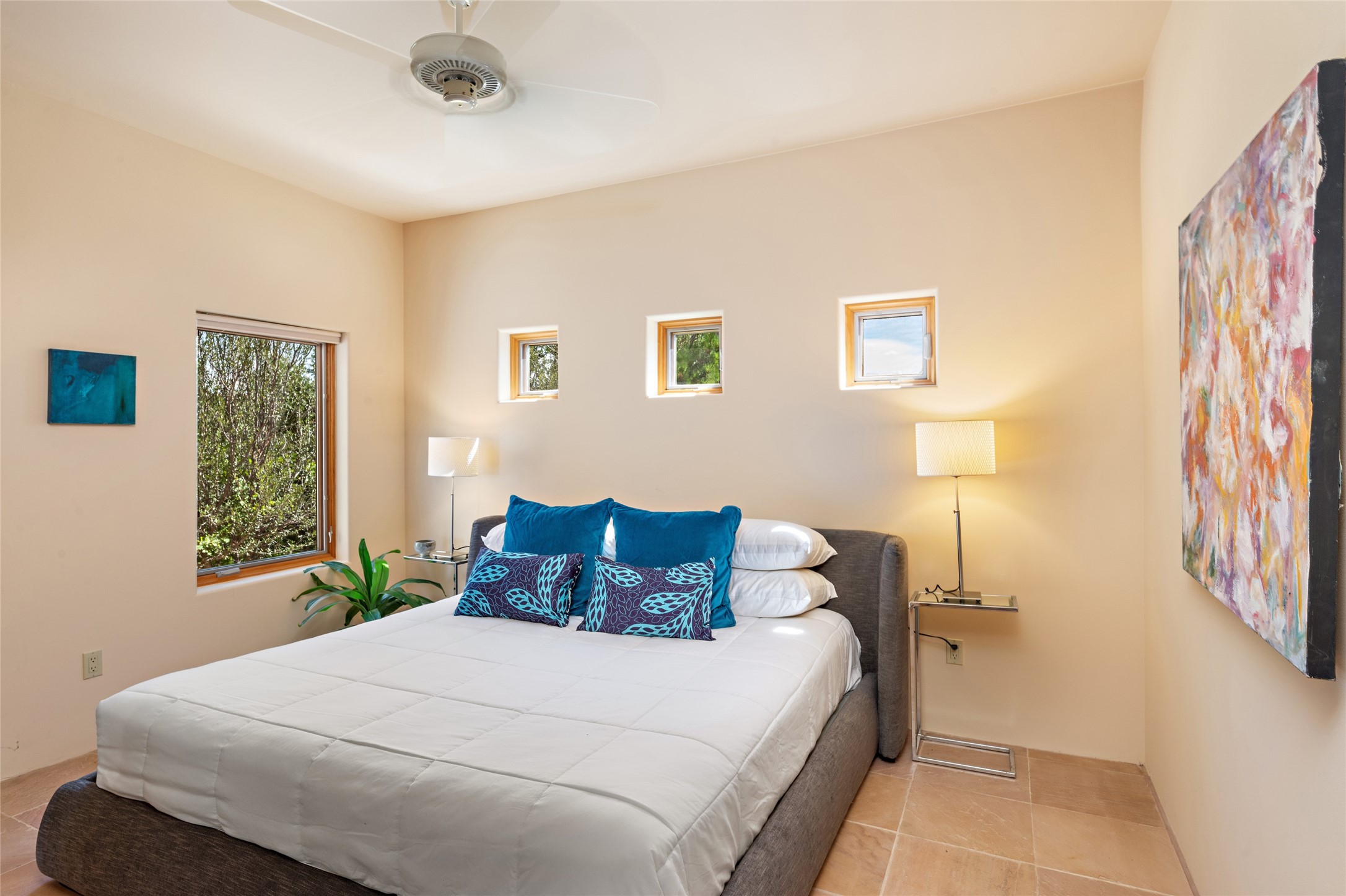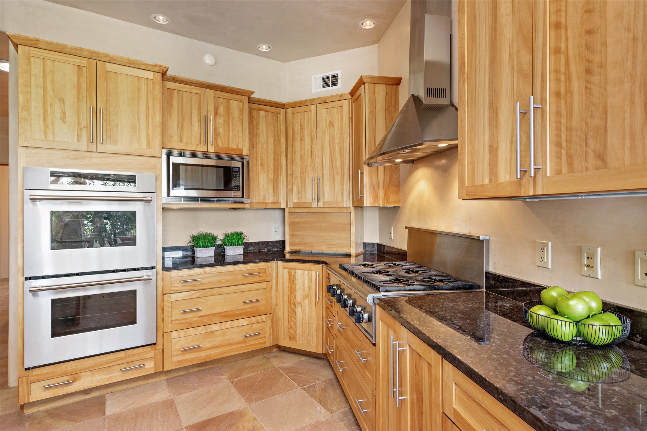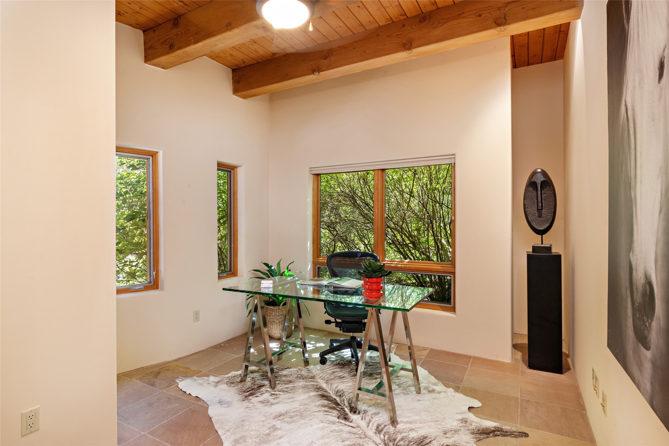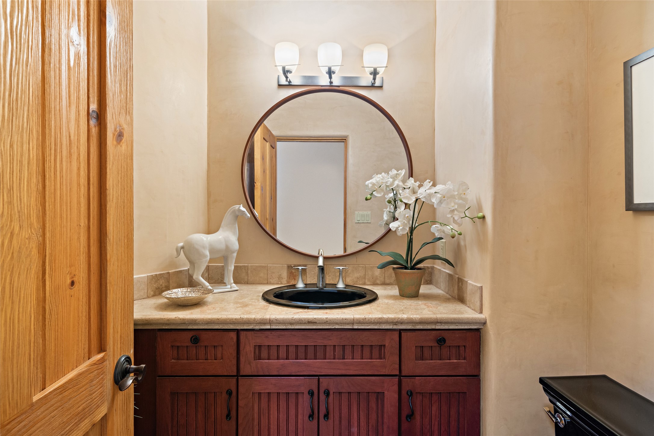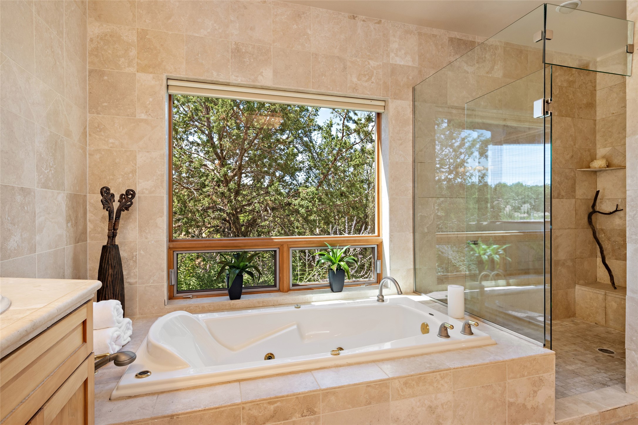 THIS LAS CAMPANAS SINGLE LEVEL HOME OPENS UP TO THE EXPANSIVE JEMEZ VIEWS AND WIDE-OPEN SKY OF SANTA FE! Welcome to the home of sweet dreams in Las Campanas, a prestigious gated community in Santa Fe, New Mexico. This stunning property offers unparalleled views of the Jemez Mountains and the surrounding natural beauty. Situated on a spacious 3-acre lot at the end of a sleepy cul-de-sac, this home is a peaceful oasis that invites you to relax and enjoy the serene lifestyle. This home features 3 bedrooms, a great office and 2.5 bathrooms. The interior design is a perfect blend of contemporary and traditional Santa Fe style, with high ceilings, vigas & beams, plaster walls, stone floors, fireplaces and skylights. The open floor plan allows for easy flow between the living room, dining room, and kitchen, creating a great space for entertaining or family gatherings. The gourmet kitchen is equipped with stainless steel appliances, granite countertops and a walk-in pantry. The master suite is a luxurious retreat with a fireplace, a walk-in closet and a spa-like bathroom with a soaking tub, a separate shower and dual sinks. The other two bedrooms are spacious and share a full bathroom. The outdoor living space is equally impressive, with a covered portal featuring a cozy seating area with a fireplace and an outdoor dining area that provides shade and comfort for the perfect indoor/outdoor lifestyle. The backyard is landscaped with native plants and trees that blend seamlessly with the natural surroundings. Walk for miles on the nearby trail system. From here, you can enjoy the spectacular views of the mountains and sunset. This home is truly a gem in Las Campanas, where members can enjoy the amenities of the private club - arranged separately and by invitation with the club - which offers 2 Jack Nicholus golf courses, the equestrian center, spa and tennis. Don't miss this opportunity to own this exquisite property that combines luxury, comfort and elegance.