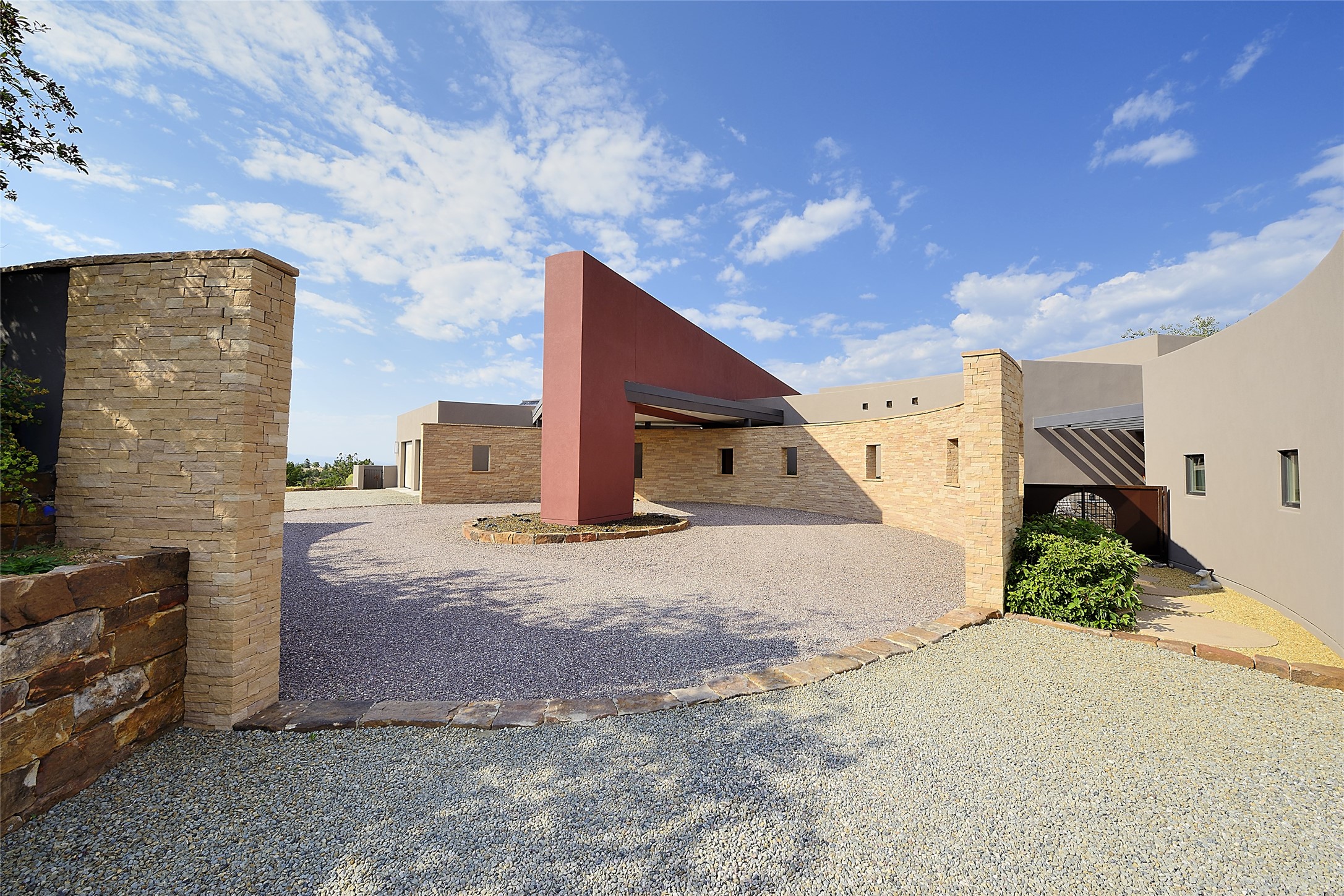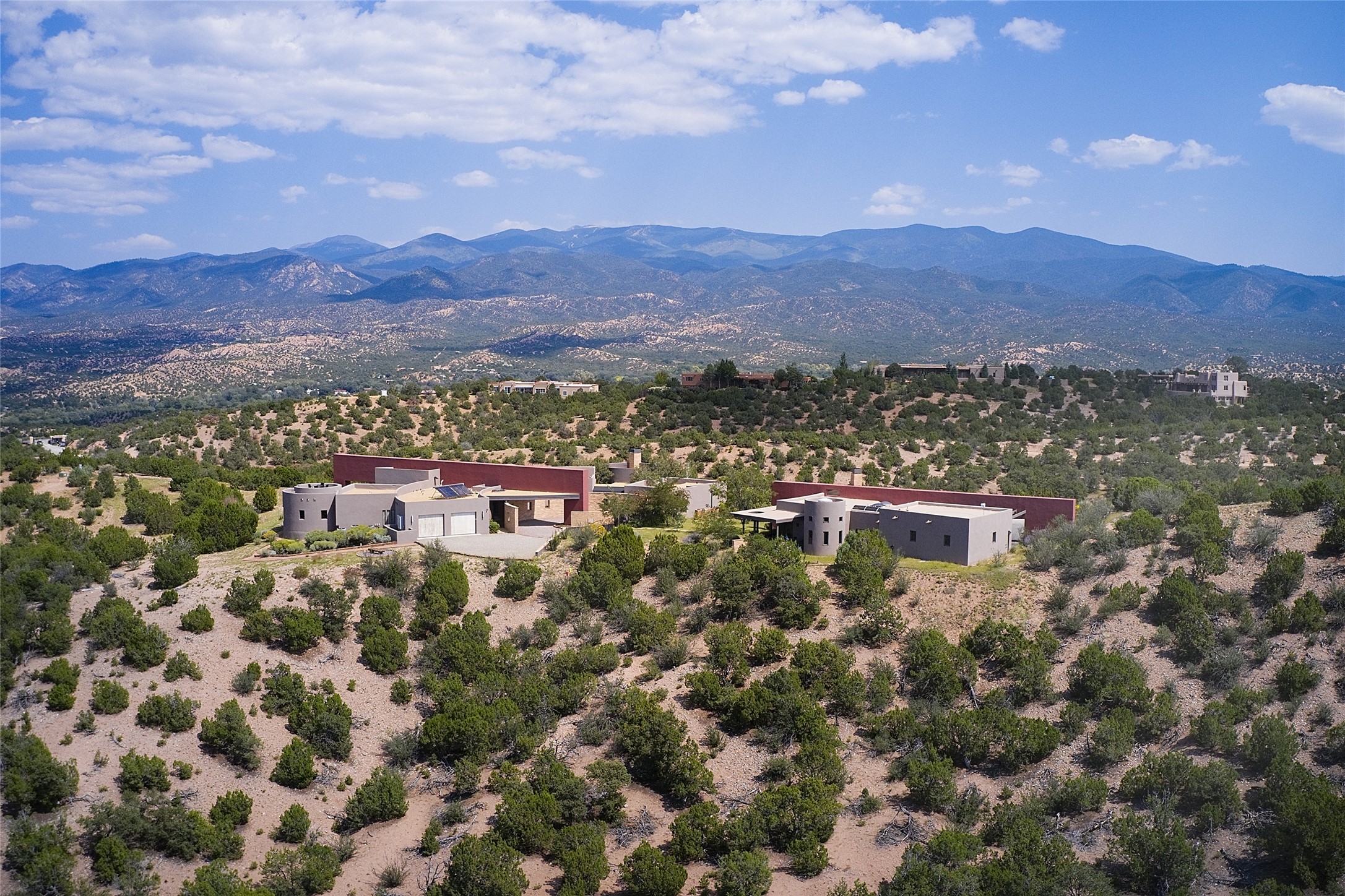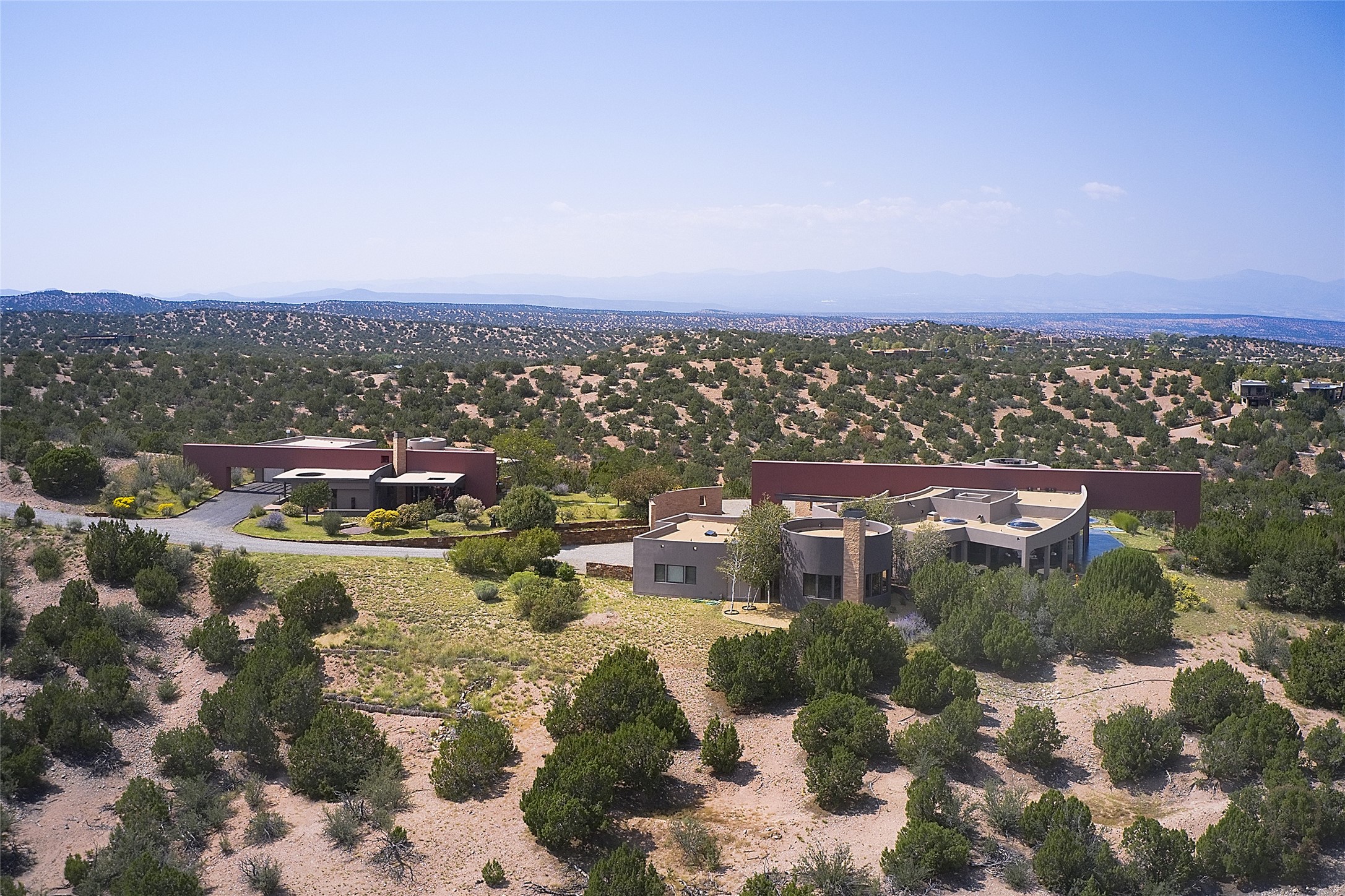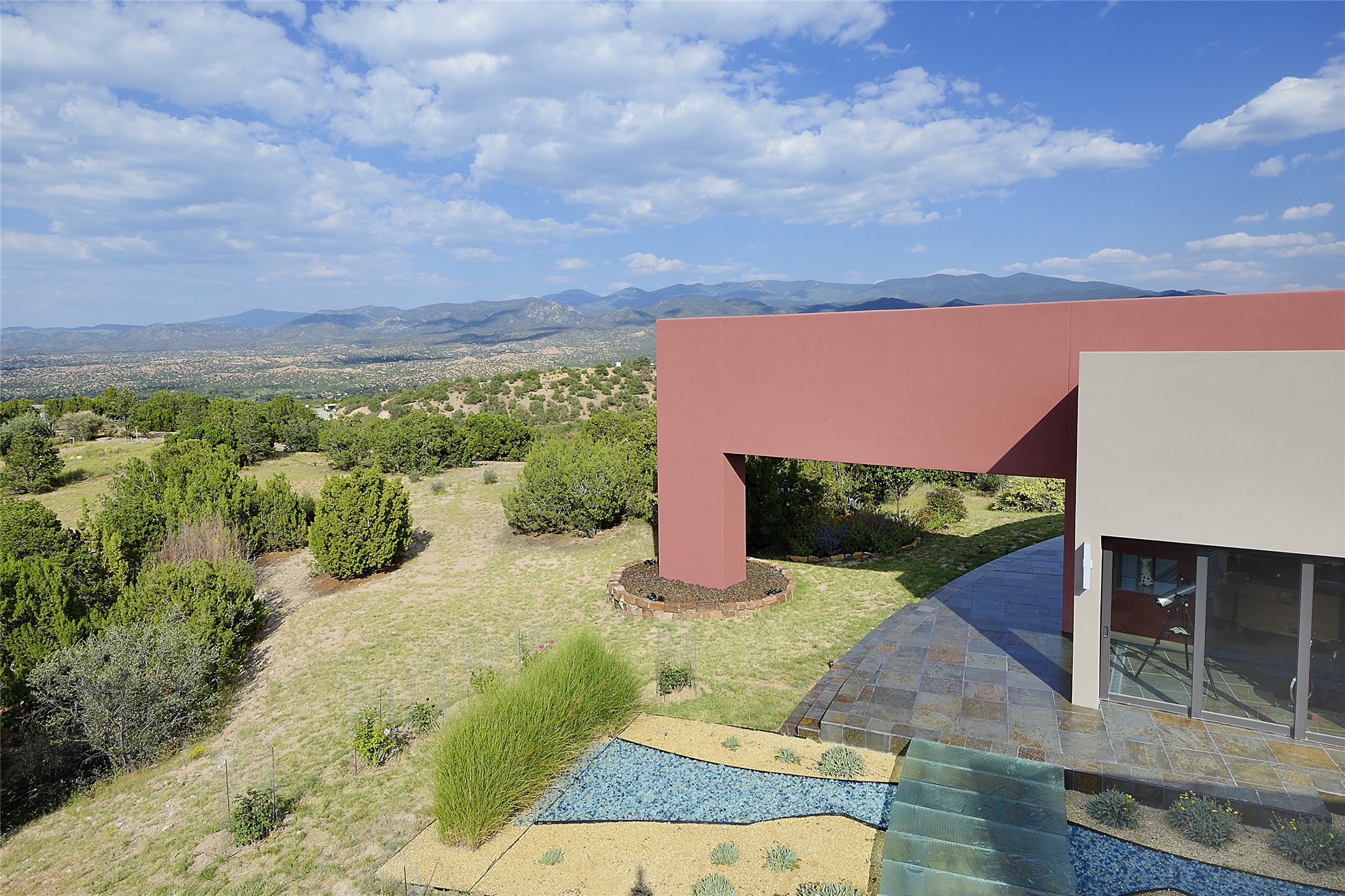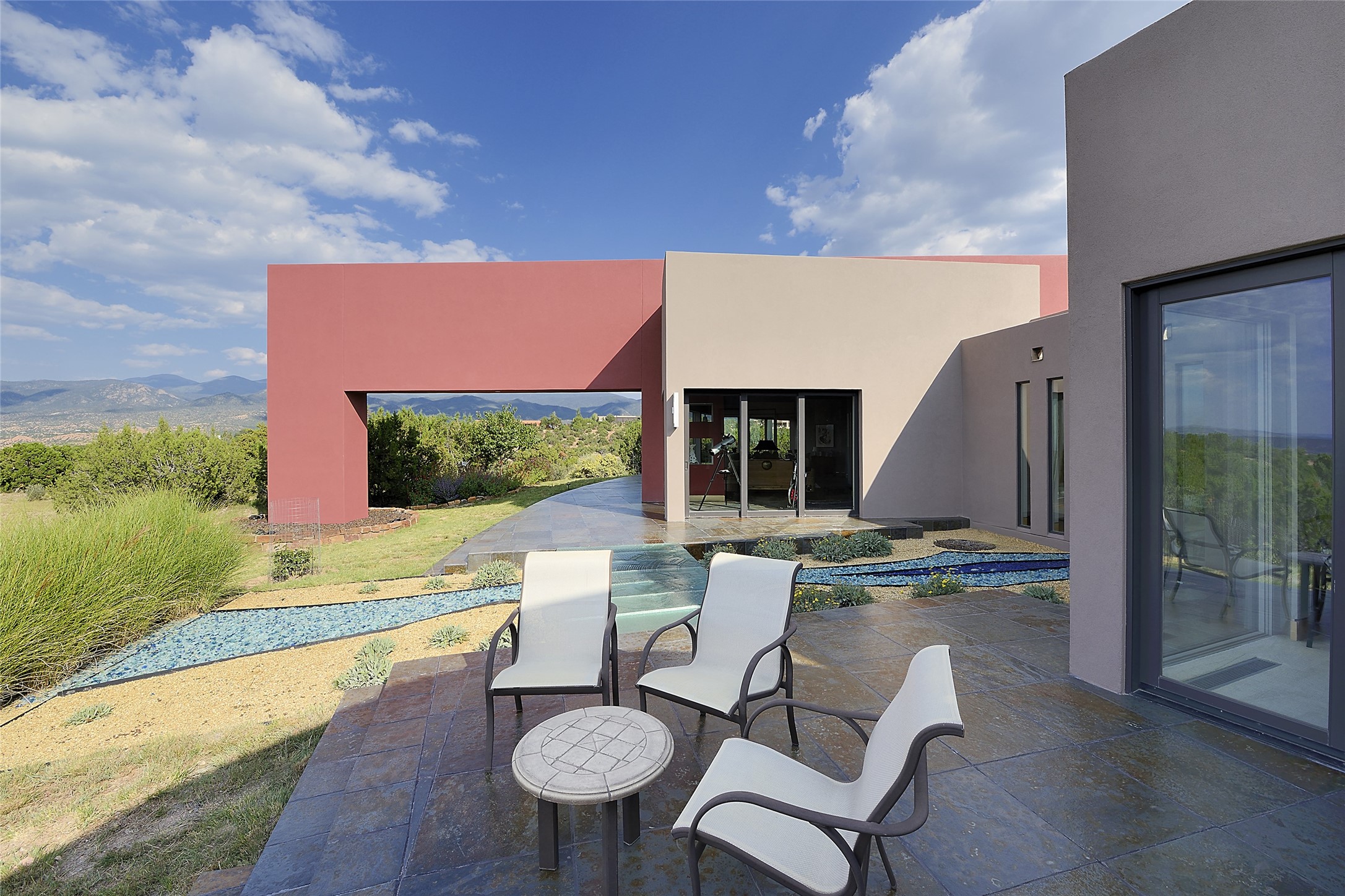 Casa de Vidrio (House of Glass), an extraordinary, gated contemporary estate, overlooks the world-renowned Santa Fe Opera with panoramic views of distant valleys and the Sangre de Cristo and Jemez Mountain ranges. The 5,600-square-foot main home and 1,600-square-foot guest house command 8.43 acres in the prestigious northside Tesuque area. Designed by Aaron Bohrer to emulate the architectural spirit of Chaco Canyon's Pueblo Bonito, Casa de Vidrio provides an enormous entry glass door, an observation deck, slate and bamboo floors, sliding pocket doors, multiple water features, a home theatre, unmatched art display facilities, an outdoor hot tub, and numerous patios and portals. The color-filled art and architecture, floor-to-ceiling windows, multiple outdoor living spaces, and native landscaping--along with nearby skiing, hiking, and biking--all combine to fulfill the dream of living the enchanting Santa Fe lifestyle.