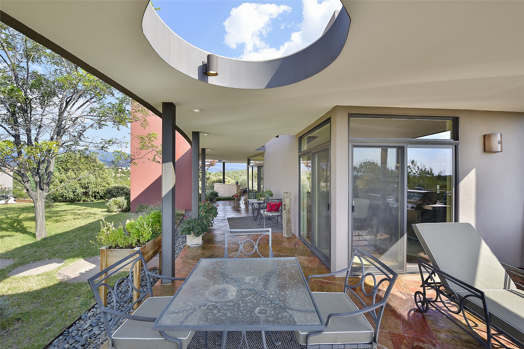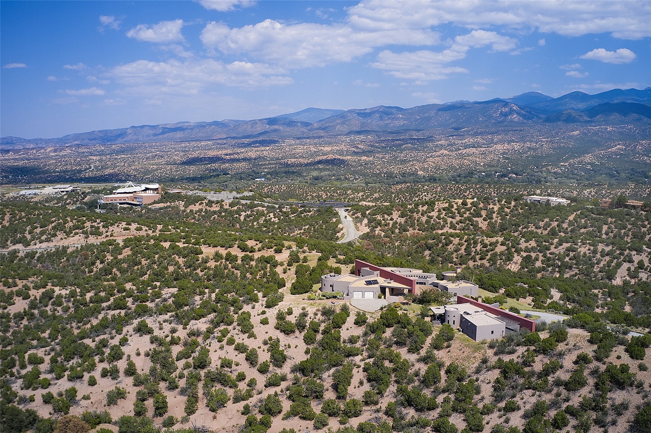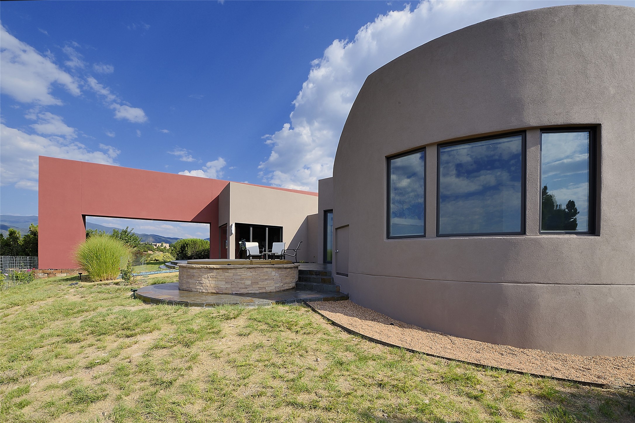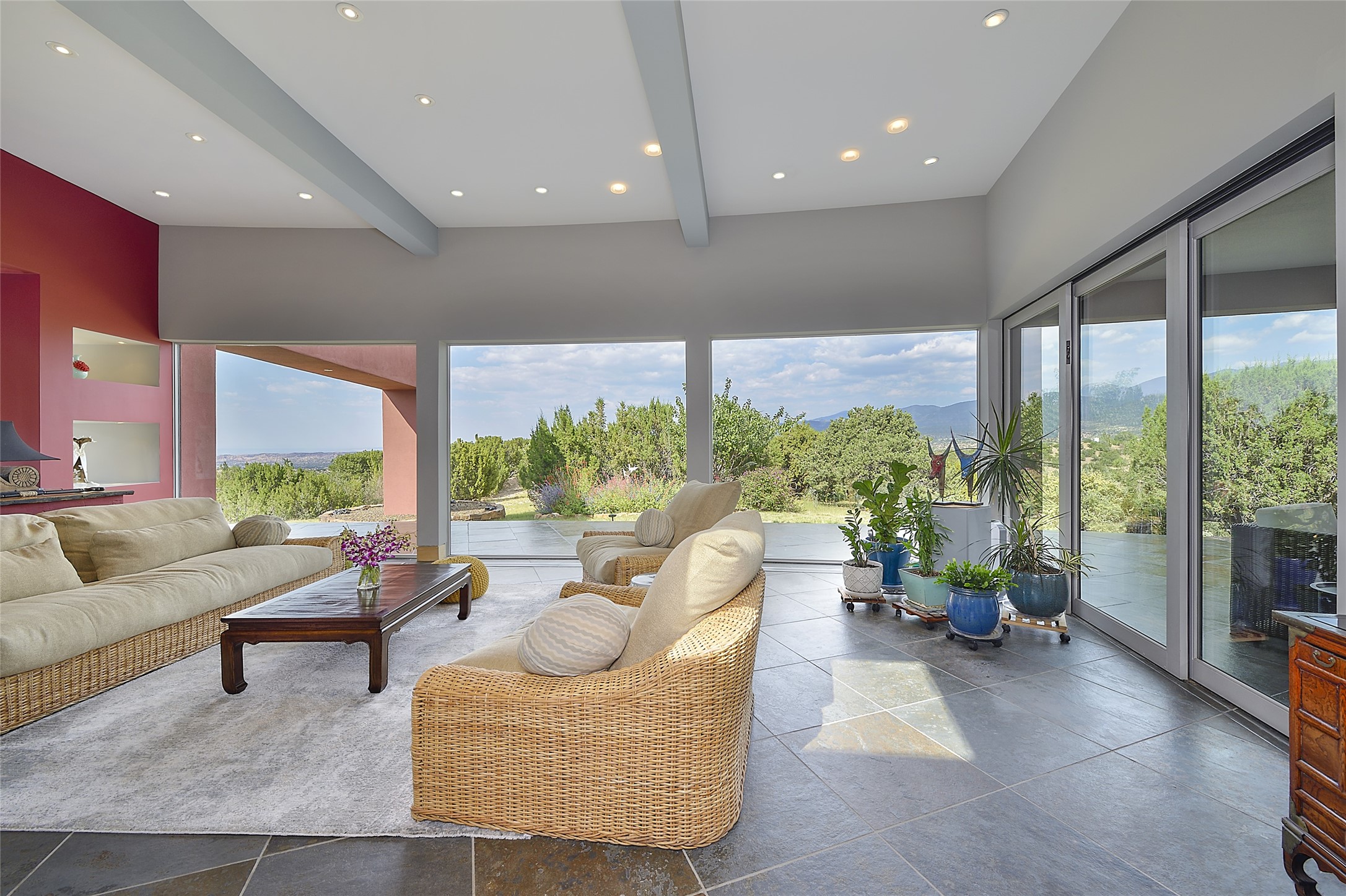 Casa de Vidrio (House of Glass), an extraordinary, gated contemporary estate, overlooks the world-renowned Santa Fe Opera with panoramic views of distant valleys and the Sangre de Cristo and Jemez Mountain ranges. The 5,600-square-foot main home and 1,600-square-foot guest house command 8.43 acres in the prestigious northside Tesuque area. Designed by Aaron Bohrer to emulate the architectural spirit of Chaco Canyon's Pueblo Bonito, Casa de Vidrio provides an enormous entry glass door, an observation deck, slate and bamboo floors, sliding pocket doors, multiple water features, a home theatre, unmatched art display facilities, an outdoor hot tub, and numerous patios and portals. The color-filled art and architecture, floor-to-ceiling windows, multiple outdoor living spaces, and native landscaping--along with nearby skiing, hiking, and biking--all combine to fulfill the dream of living the enchanting Santa Fe lifestyle.