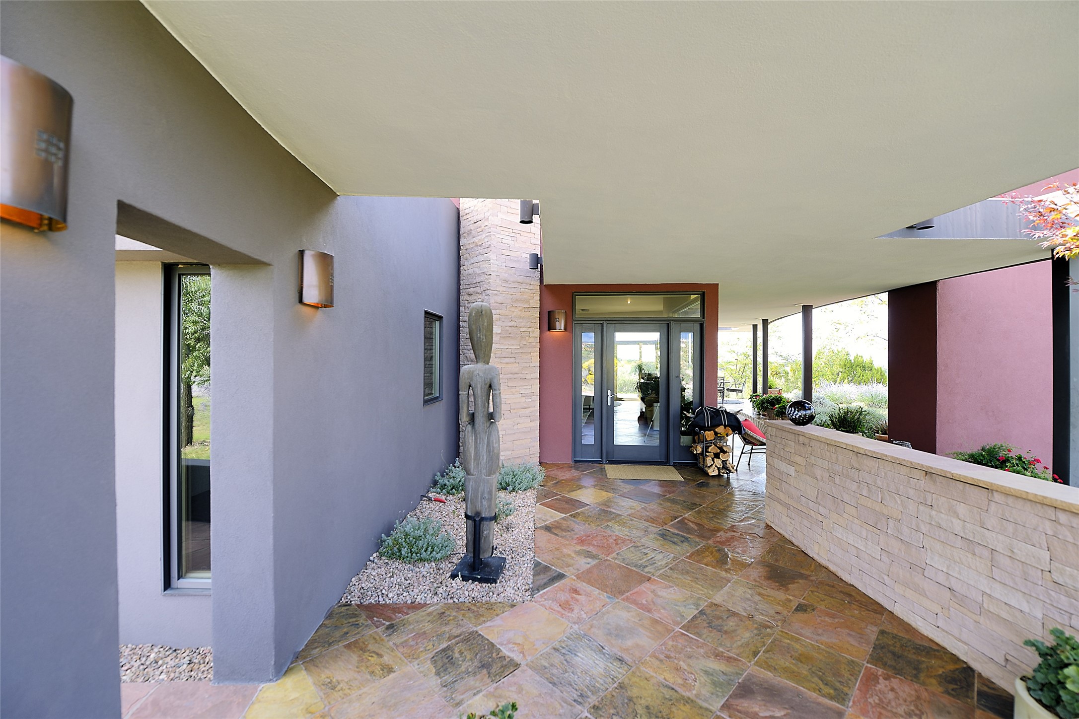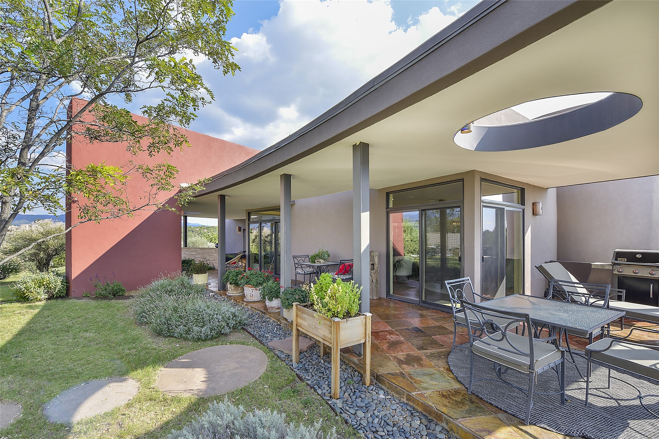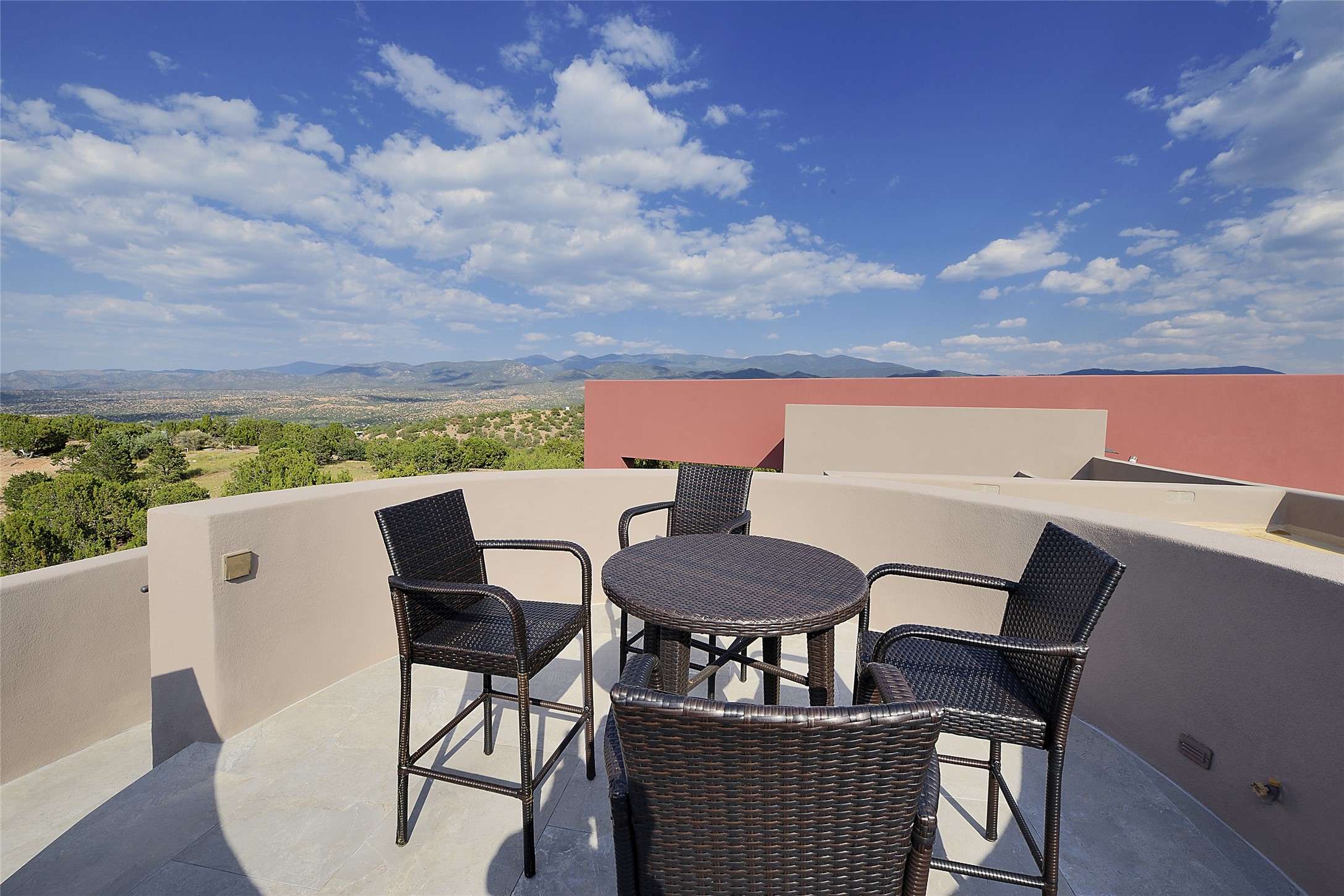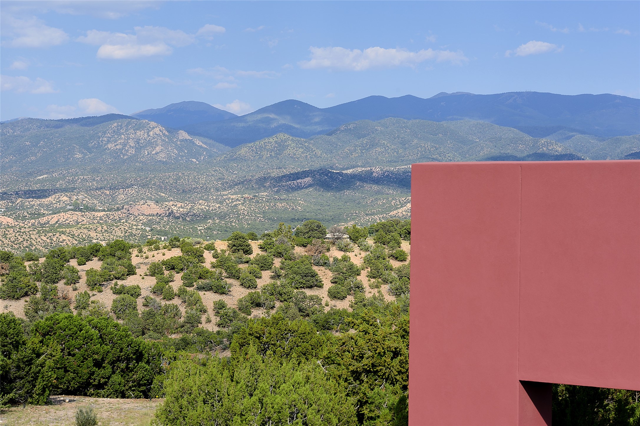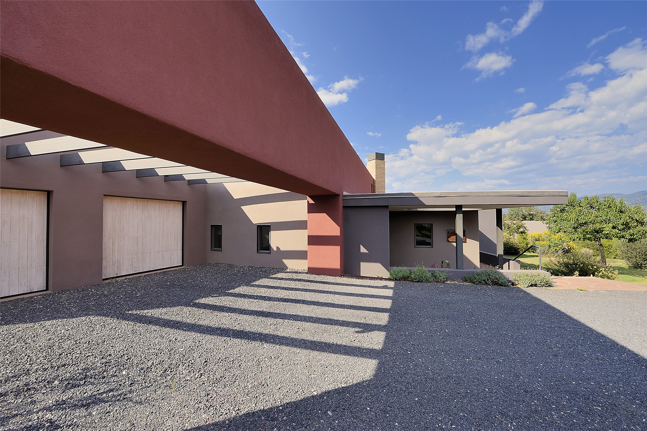 Casa de Vidrio (House of Glass), an extraordinary, gated contemporary estate, overlooks the world-renowned Santa Fe Opera with panoramic views of distant valleys and the Sangre de Cristo and Jemez Mountain ranges. The 5,600-square-foot main home and 1,600-square-foot guest house command 8.43 acres in the prestigious northside Tesuque area. Designed by Aaron Bohrer to emulate the architectural spirit of Chaco Canyon's Pueblo Bonito, Casa de Vidrio provides an enormous entry glass door, an observation deck, slate and bamboo floors, sliding pocket doors, multiple water features, a home theatre, unmatched art display facilities, an outdoor hot tub, and numerous patios and portals. The color-filled art and architecture, floor-to-ceiling windows, multiple outdoor living spaces, and native landscaping--along with nearby skiing, hiking, and biking--all combine to fulfill the dream of living the enchanting Santa Fe lifestyle.