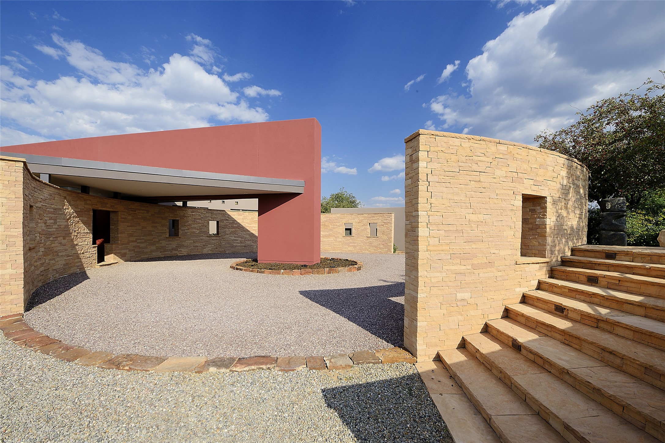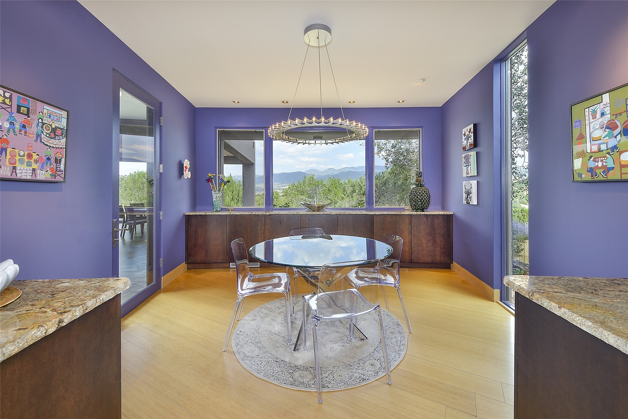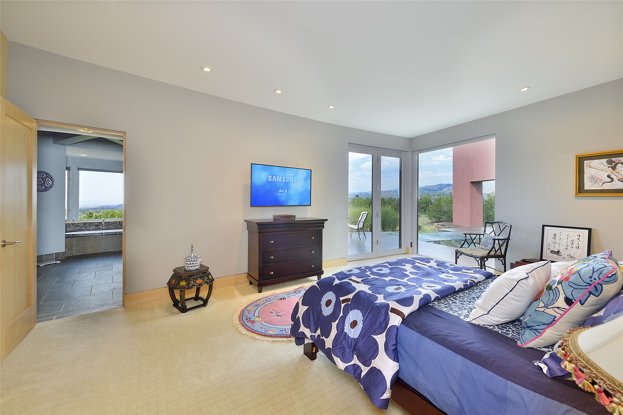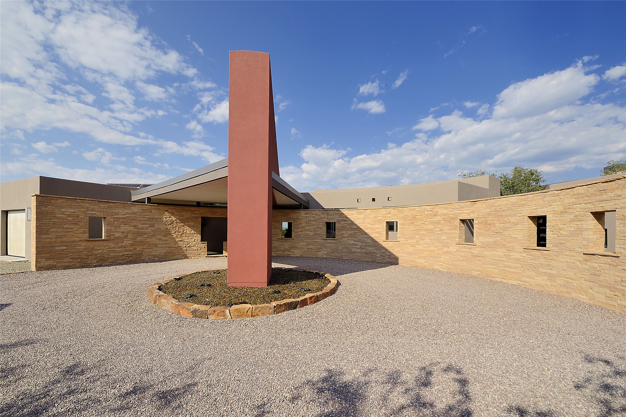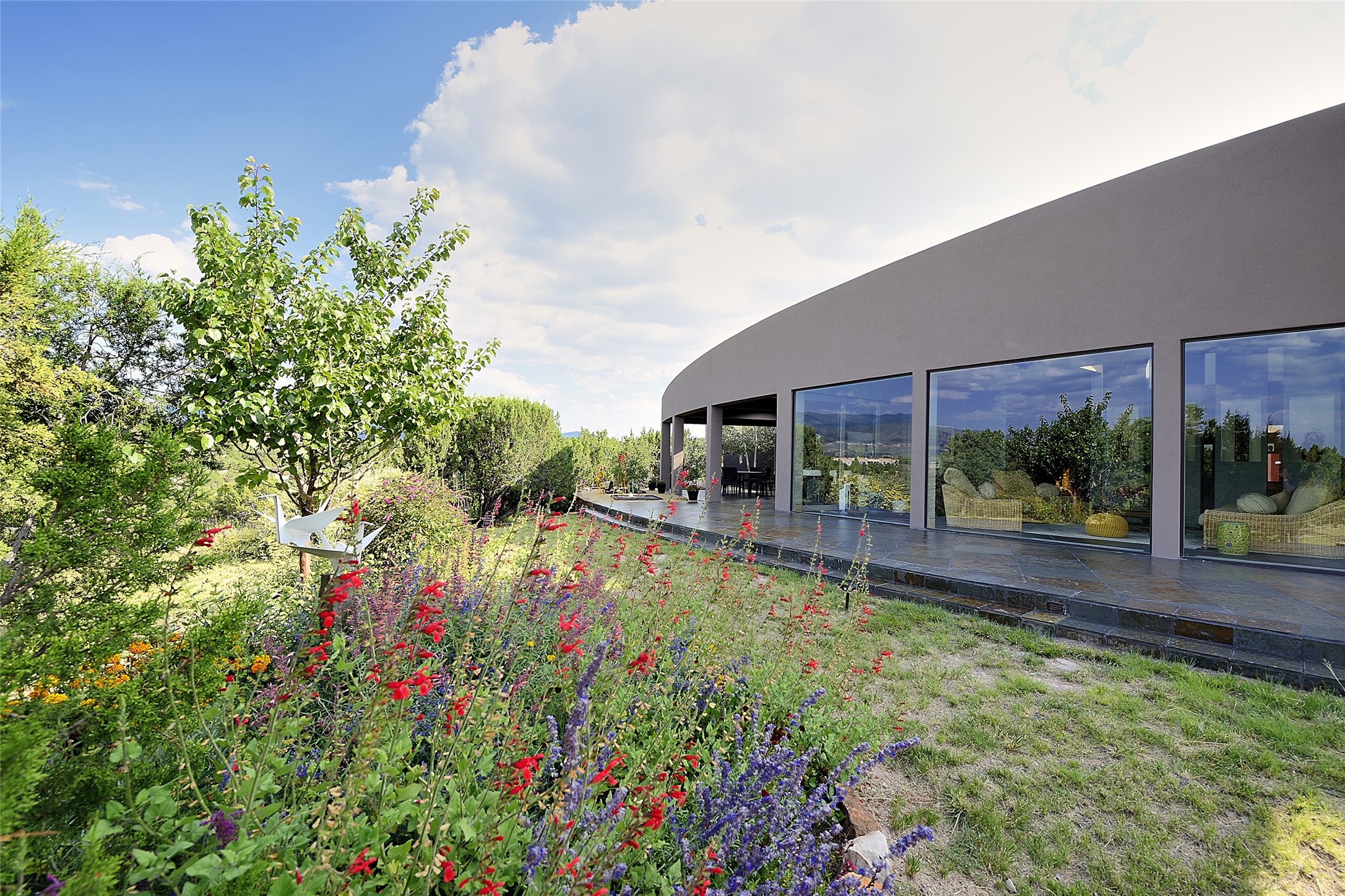 Casa de Vidrio (House of Glass), an extraordinary, gated contemporary estate, overlooks the world-renowned Santa Fe Opera with panoramic views of distant valleys and the Sangre de Cristo and Jemez Mountain ranges. The 5,600-square-foot main home and 1,600-square-foot guest house command 8.43 acres in the prestigious northside Tesuque area. Designed by Aaron Bohrer to emulate the architectural spirit of Chaco Canyon's Pueblo Bonito, Casa de Vidrio provides an enormous entry glass door, an observation deck, slate and bamboo floors, sliding pocket doors, multiple water features, a home theatre, unmatched art display facilities, an outdoor hot tub, and numerous patios and portals. The color-filled art and architecture, floor-to-ceiling windows, multiple outdoor living spaces, and native landscaping--along with nearby skiing, hiking, and biking--all combine to fulfill the dream of living the enchanting Santa Fe lifestyle.