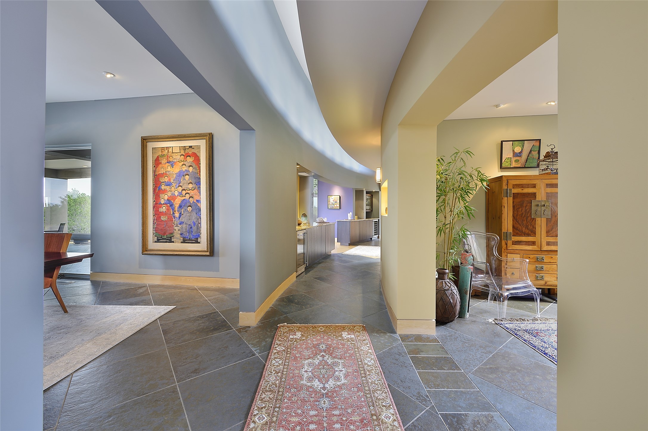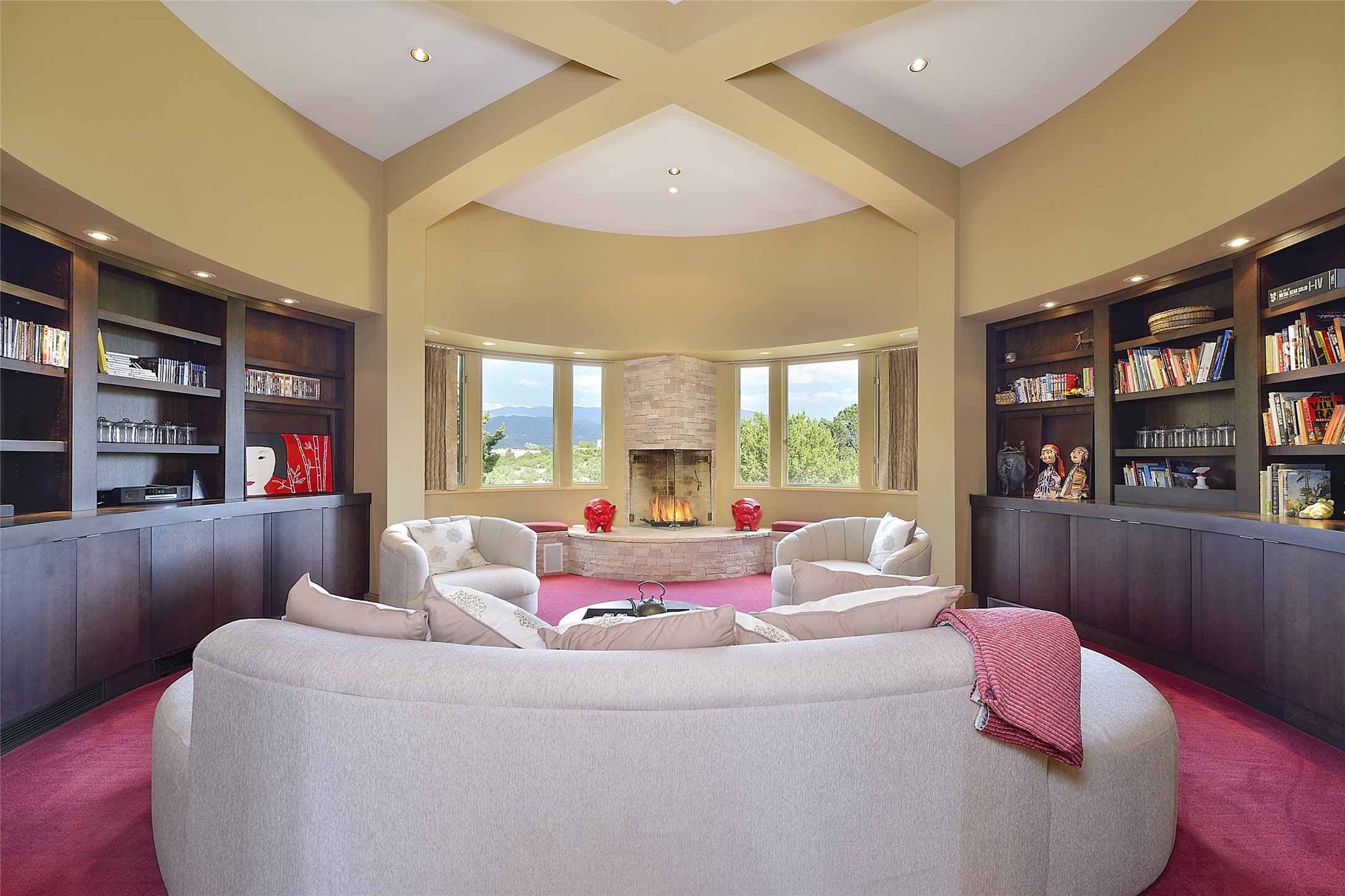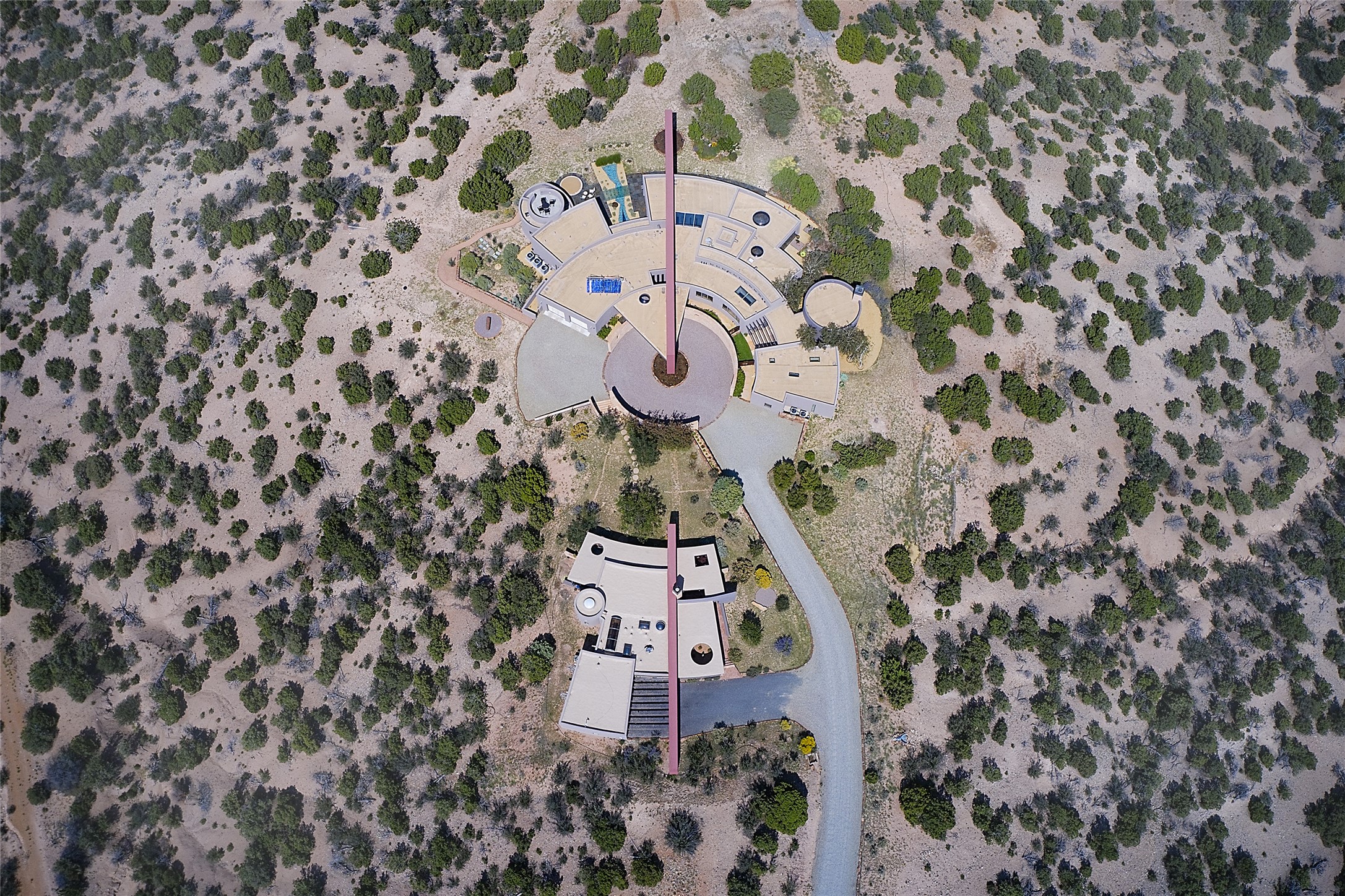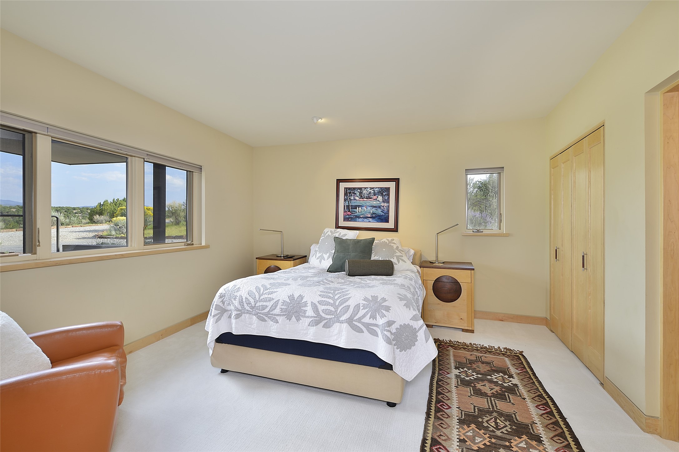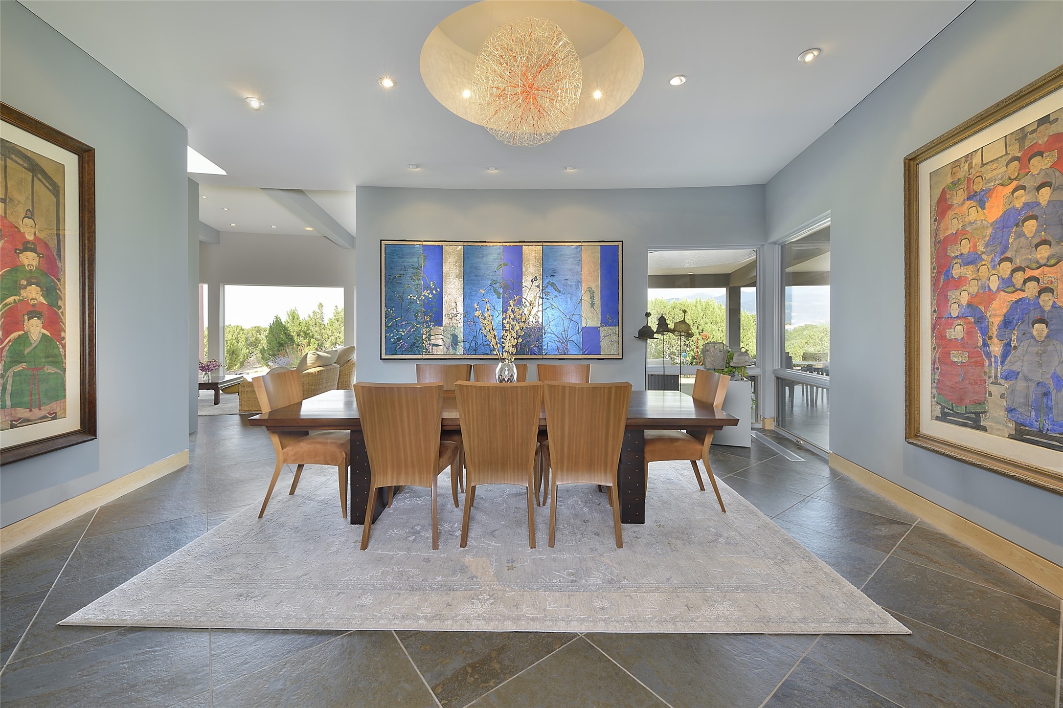 Casa de Vidrio (House of Glass), an extraordinary, gated contemporary estate, overlooks the world-renowned Santa Fe Opera with panoramic views of distant valleys and the Sangre de Cristo and Jemez Mountain ranges. The 5,600-square-foot main home and 1,600-square-foot guest house command 8.43 acres in the prestigious northside Tesuque area. Designed by Aaron Bohrer to emulate the architectural spirit of Chaco Canyon's Pueblo Bonito, Casa de Vidrio provides an enormous entry glass door, an observation deck, slate and bamboo floors, sliding pocket doors, multiple water features, a home theatre, unmatched art display facilities, an outdoor hot tub, and numerous patios and portals. The color-filled art and architecture, floor-to-ceiling windows, multiple outdoor living spaces, and native landscaping--along with nearby skiing, hiking, and biking--all combine to fulfill the dream of living the enchanting Santa Fe lifestyle.