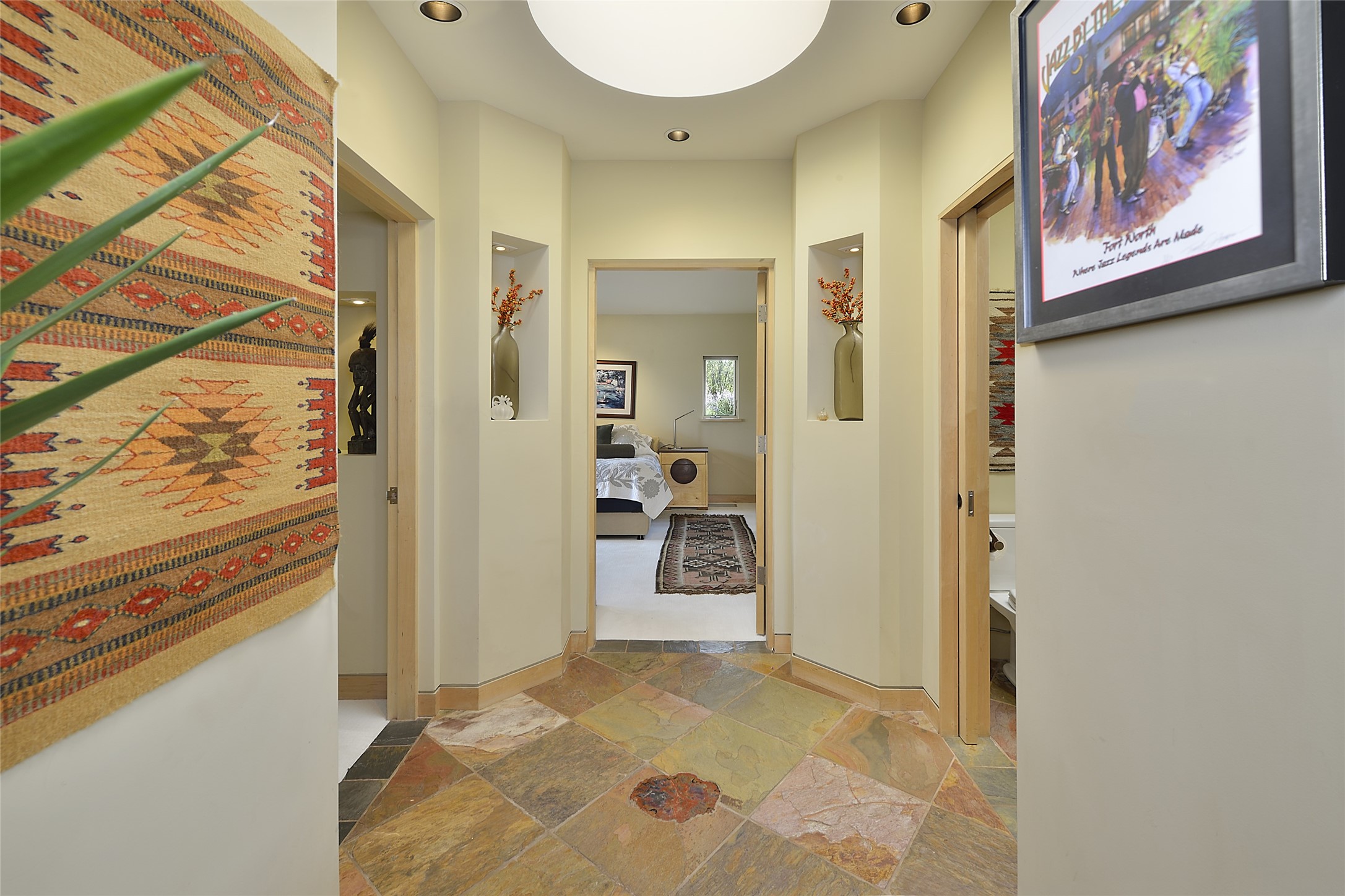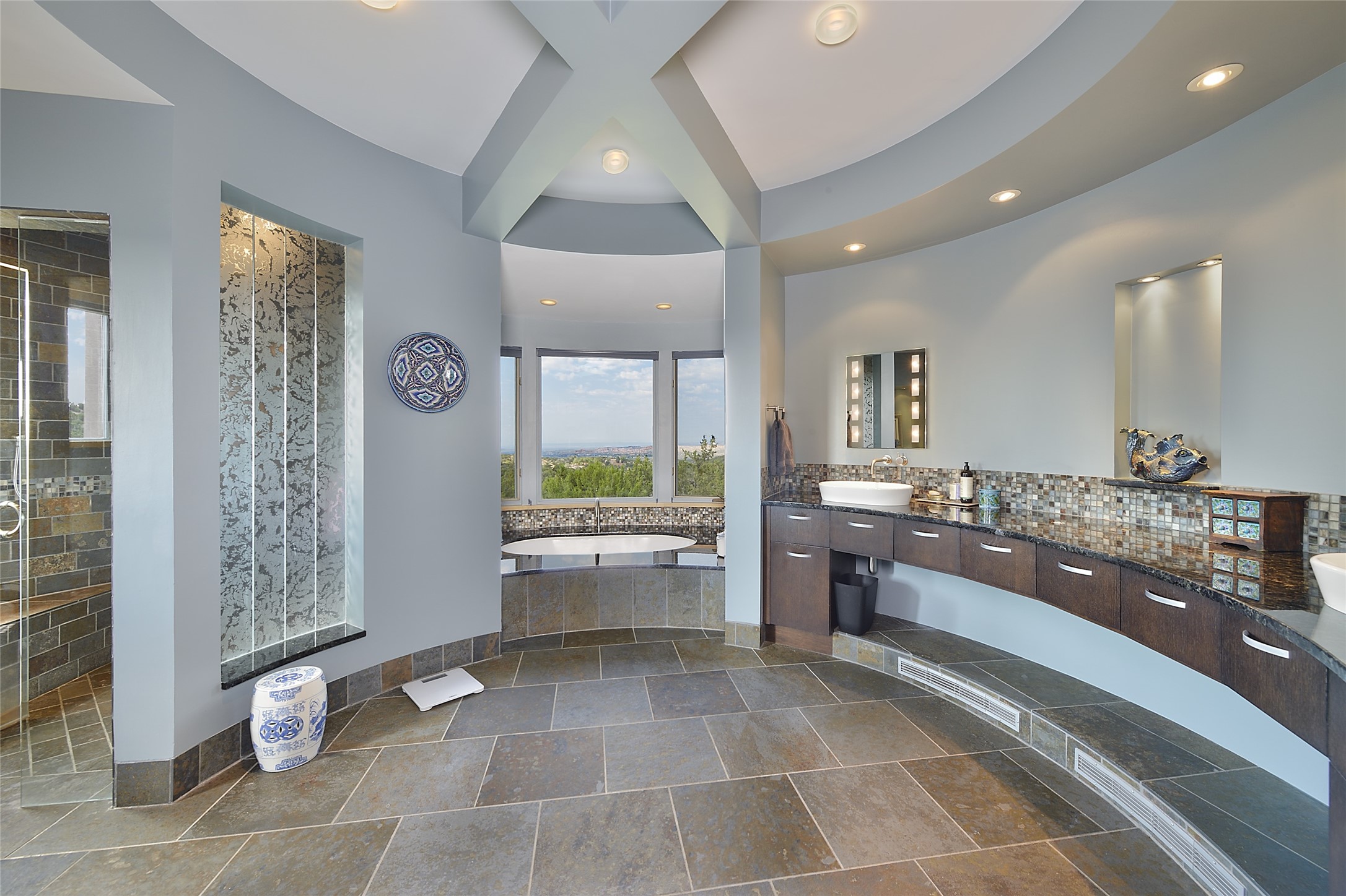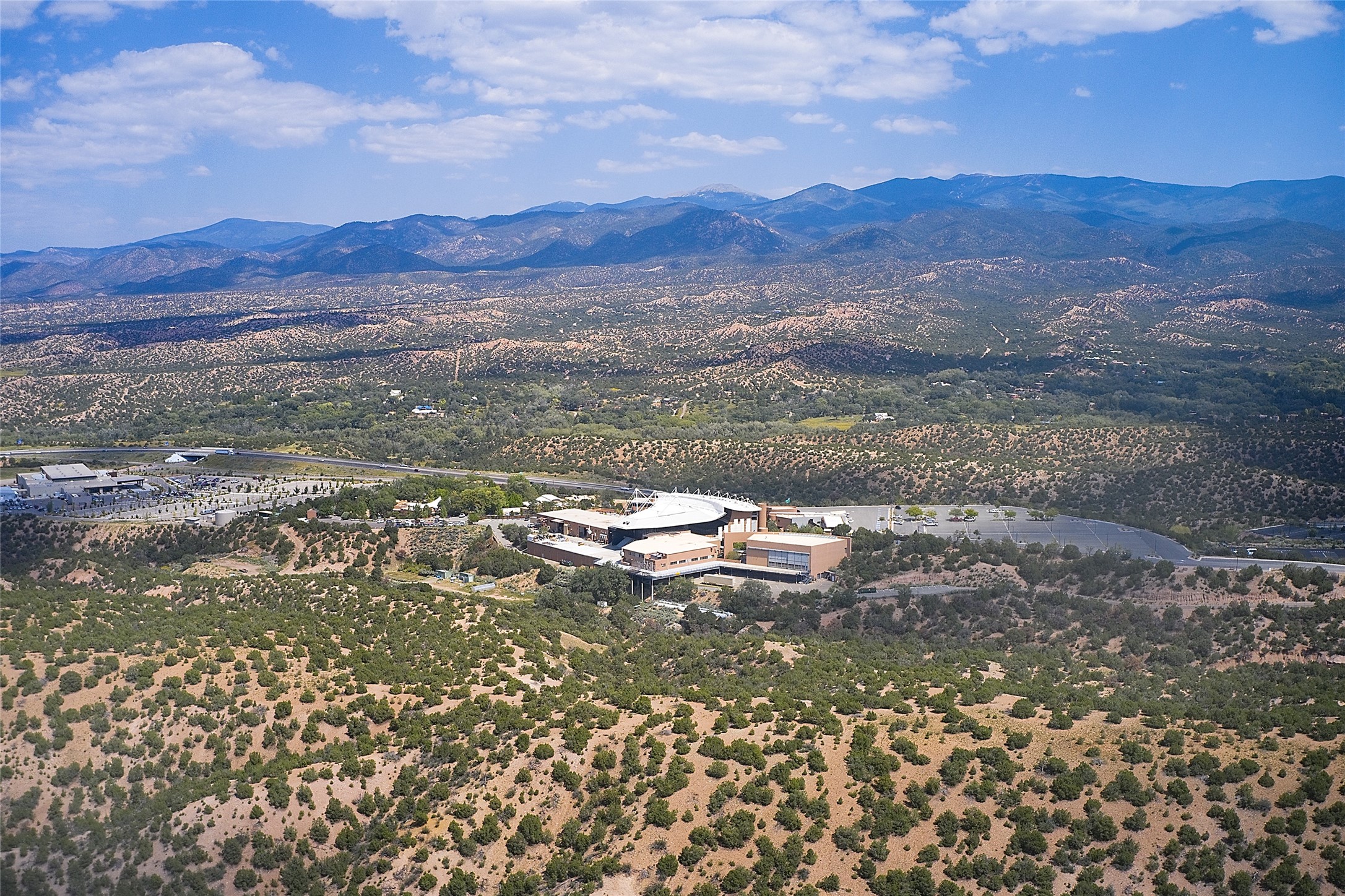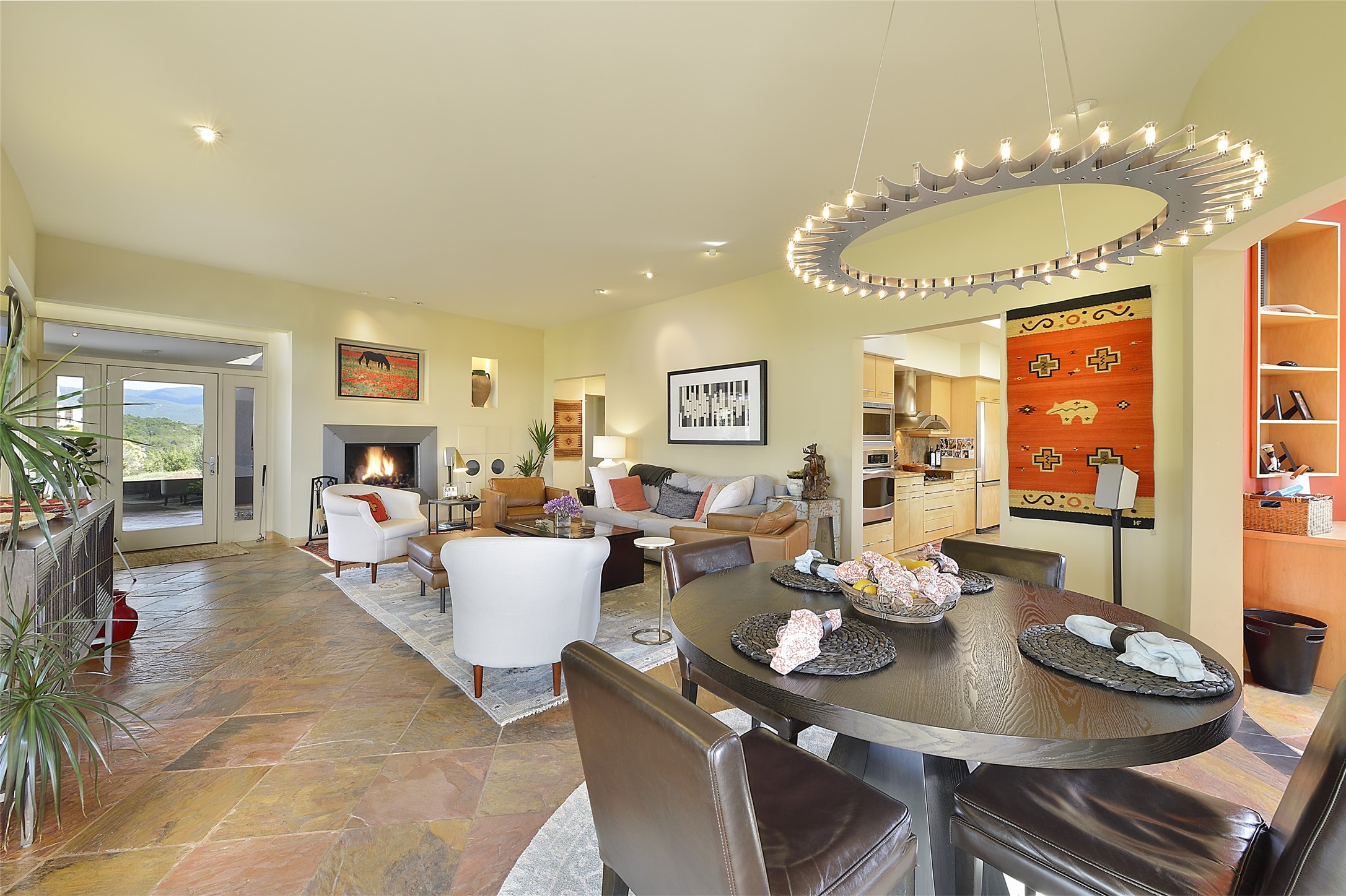 Casa de Vidrio (House of Glass), an extraordinary, gated contemporary estate, overlooks the world-renowned Santa Fe Opera with panoramic views of distant valleys and the Sangre de Cristo and Jemez Mountain ranges. The 5,600-square-foot main home and 1,600-square-foot guest house command 8.43 acres in the prestigious northside Tesuque area. Designed by Aaron Bohrer to emulate the architectural spirit of Chaco Canyon's Pueblo Bonito, Casa de Vidrio provides an enormous entry glass door, an observation deck, slate and bamboo floors, sliding pocket doors, multiple water features, a home theatre, unmatched art display facilities, an outdoor hot tub, and numerous patios and portals. The color-filled art and architecture, floor-to-ceiling windows, multiple outdoor living spaces, and native landscaping--along with nearby skiing, hiking, and biking--all combine to fulfill the dream of living the enchanting Santa Fe lifestyle.