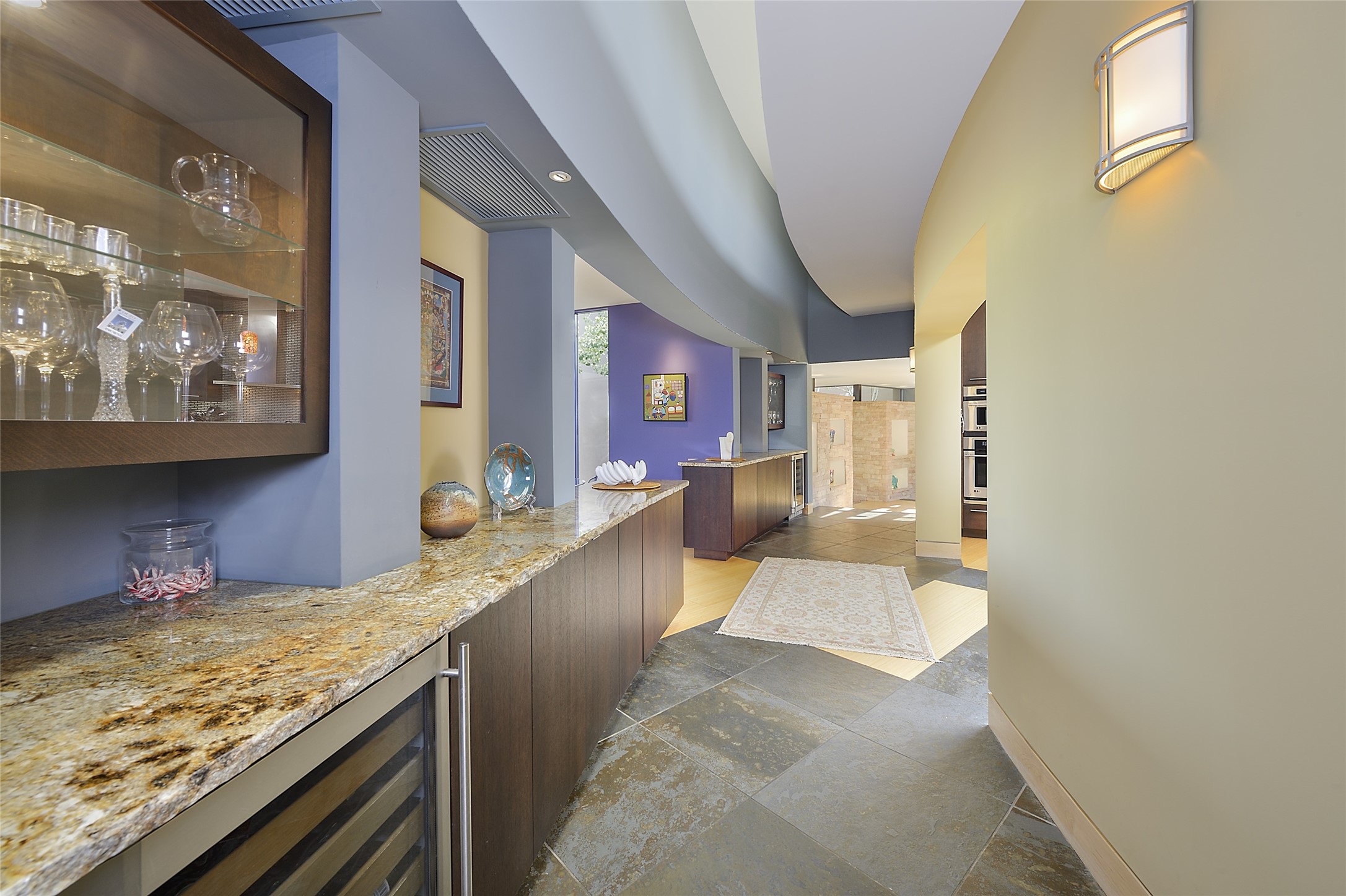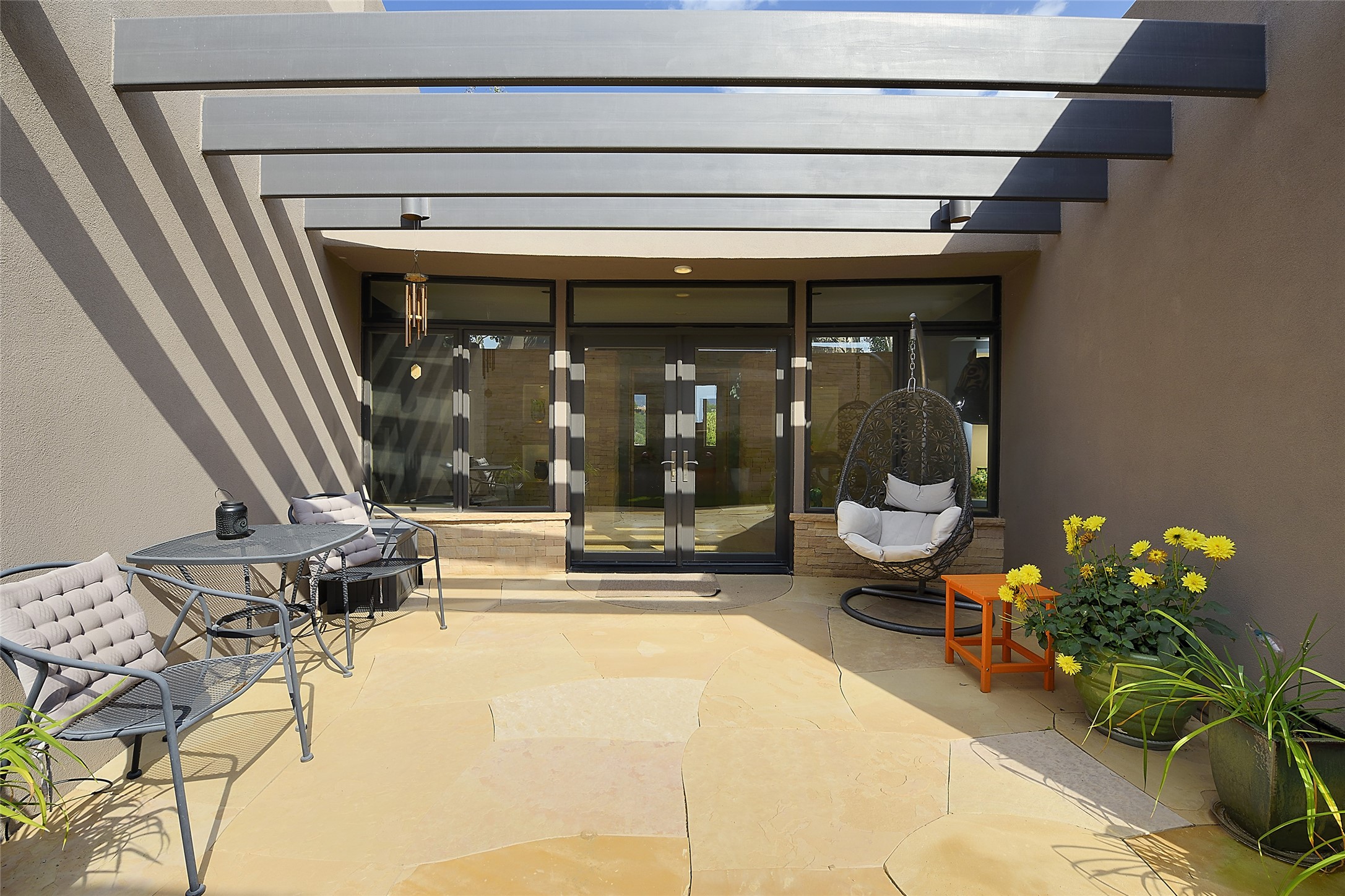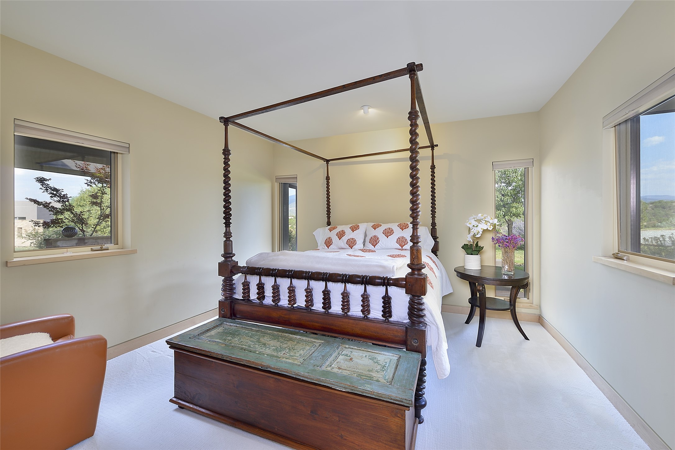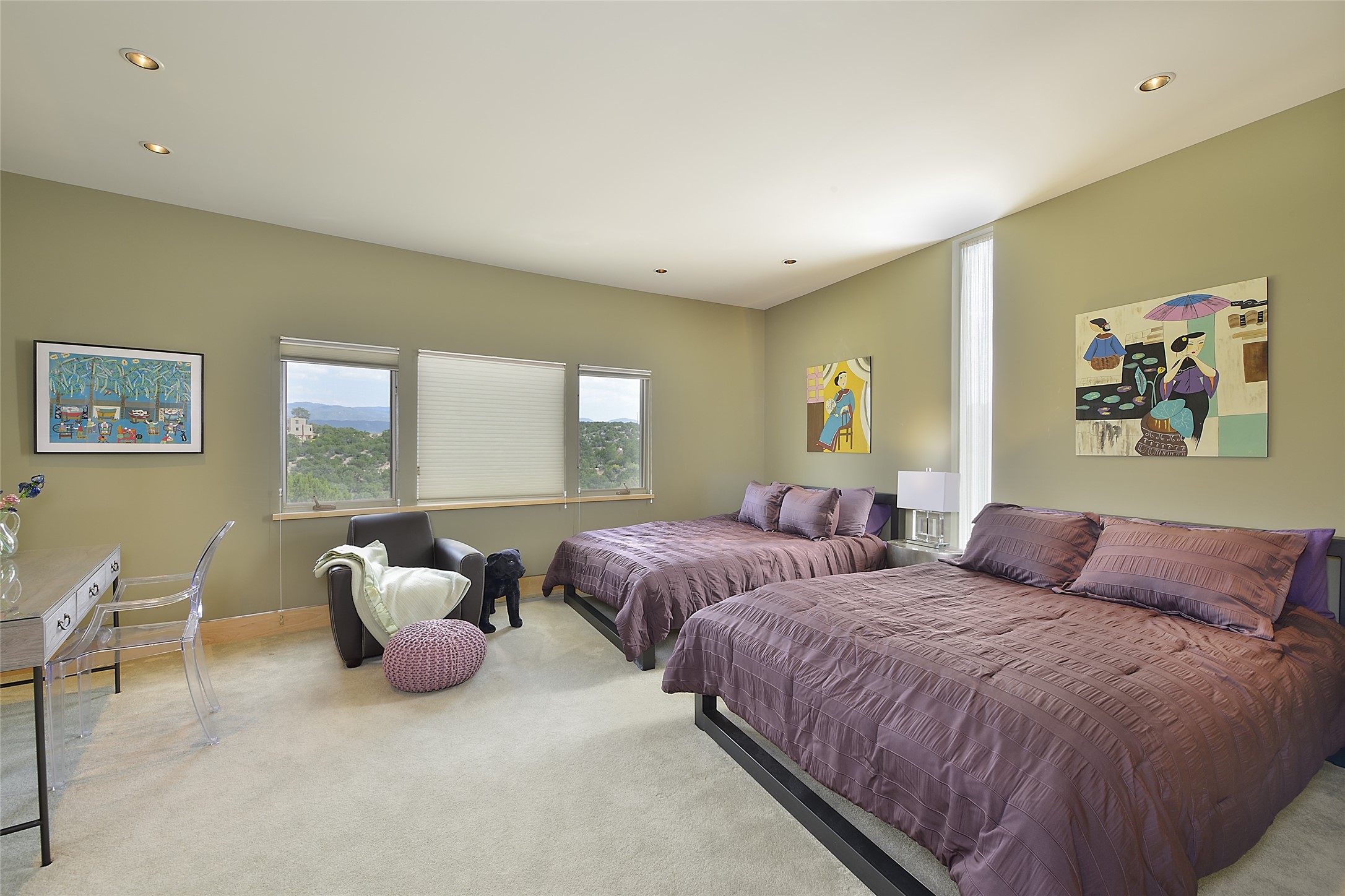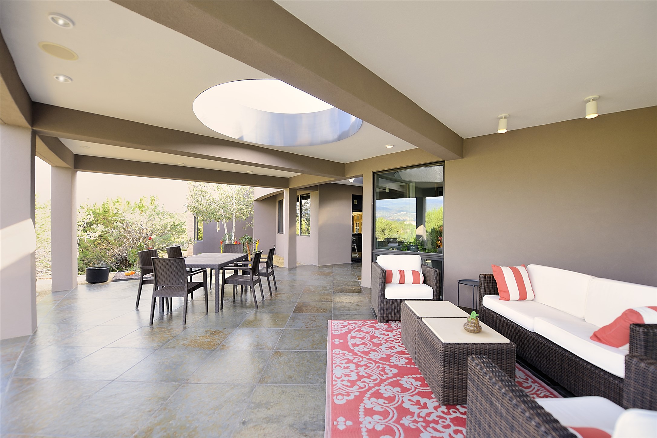 Casa de Vidrio (House of Glass), an extraordinary, gated contemporary estate, overlooks the world-renowned Santa Fe Opera with panoramic views of distant valleys and the Sangre de Cristo and Jemez Mountain ranges. The 5,600-square-foot main home and 1,600-square-foot guest house command 8.43 acres in the prestigious northside Tesuque area. Designed by Aaron Bohrer to emulate the architectural spirit of Chaco Canyon's Pueblo Bonito, Casa de Vidrio provides an enormous entry glass door, an observation deck, slate and bamboo floors, sliding pocket doors, multiple water features, a home theatre, unmatched art display facilities, an outdoor hot tub, and numerous patios and portals. The color-filled art and architecture, floor-to-ceiling windows, multiple outdoor living spaces, and native landscaping--along with nearby skiing, hiking, and biking--all combine to fulfill the dream of living the enchanting Santa Fe lifestyle.