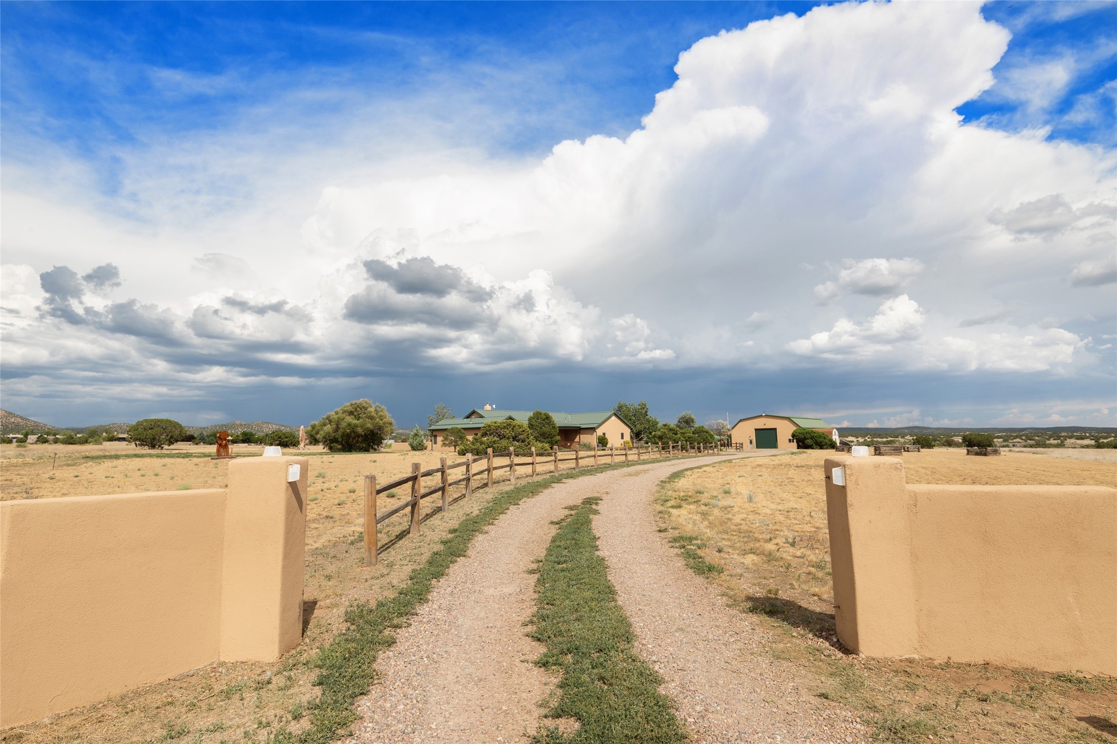 Vistas in every direction can be enjoyed from this lovely ranchette located on 10 acres in desirable Los Caballos. The 1,816 SqFt home lives large due to its open floor plan, gracious bedroom separation and beautiful finish quality throughout including brick floors, beamed & planked ceilings, elegant fireplaces and numerous windows filling the spaces with natural light. The primary bedroom opens onto the north-facing portal and hosts a double vanity and walk-in closet. A separate 1,700 SqFt. 1 bed/1 bath casita is privately sited and includes a spacious, multi-purpose living room, plus a kitchen/dining area. Ample storage and hobby space are available in both the heated 3-car garage and the 3,000 SqFt studio/shop/garage which includes a heated office and half bath, two EV chargers and three RV hookups. This well-maintained property has the advantages of solar power, water catchment, two septic systems and a pitched metal roof. Located near the amenities offered in the Agora shopping center, the trails in the Galisteo Basin Preserve and only 20 minutes to Historic Santa Fe.