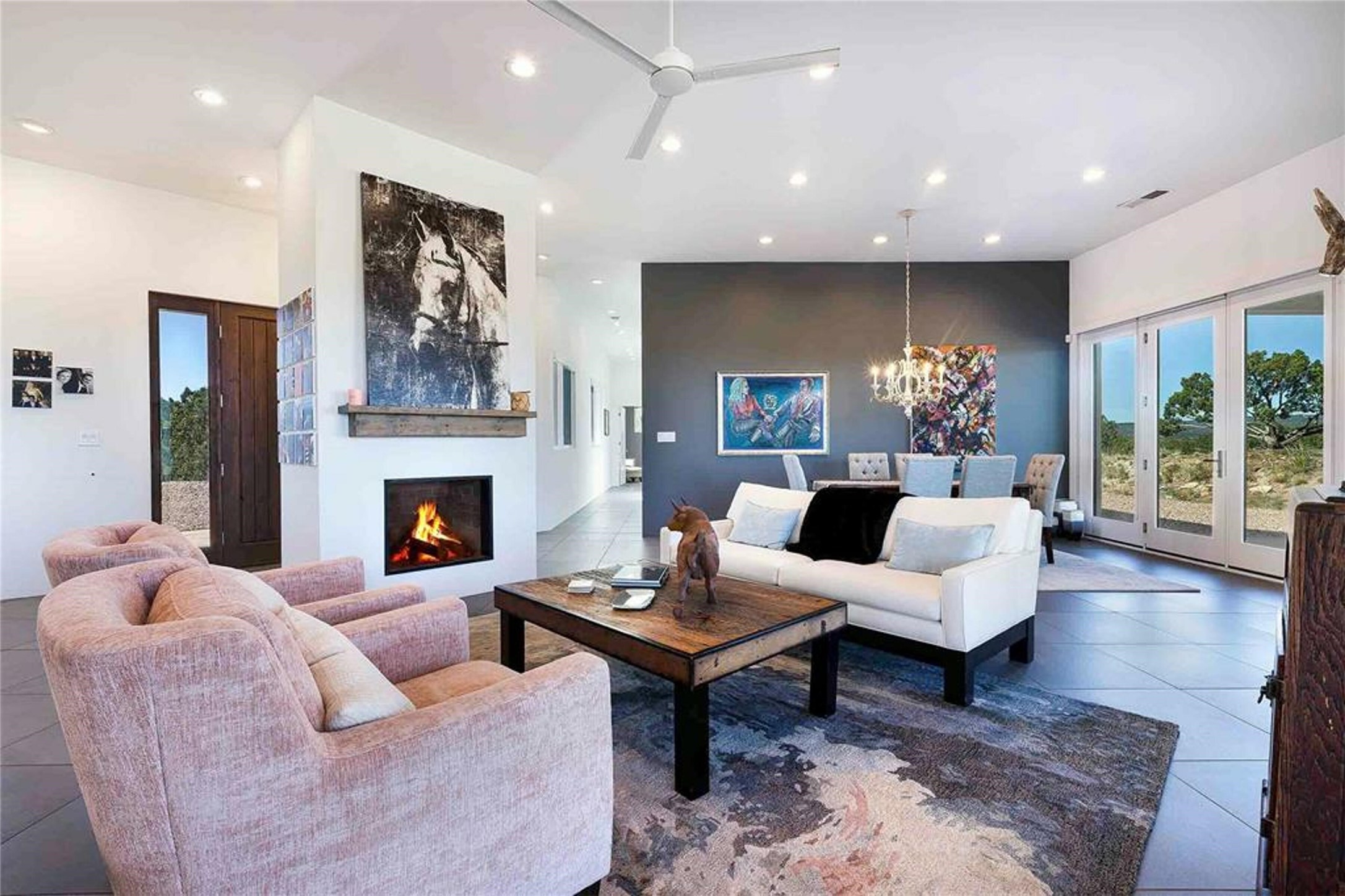 One of the rarest homes in all of Las Campanas, this exceptional contemporary, 2019-built home by Zachary & Sons, captivates with sophisticated log cabin architecture and stunning surround mountain views. Located within the Estancias of Las Campanas, this fabulous, single level home backs directly to BLM land and borders nearly 68,000 acres of open space, with endless Jemez Mountain and Sangre de Cristo Mountain views, and celebrates the true essence of the ultimate Santa Fe lifestyle. Design features include an open concept living room and dining room, ideal for entertaining with stunning views, back portal access through three sets of French doors, and a fireplace, all of which opens directly to the designer island kitchen with state of the art appliances, breakfast bar, views, and pantry. The owner's suite delights with portal access, Jemez views, an intimate seating area, and a modern bath complete with a walk-in shower, soaking tub, dual vanities and walk-in closet. Guests enjoy independence with a private ensuite bedroom and a secondary guest bedroom which is currently utilized as both a media room and office. Exceptional features include quality neutral finishes and soft natural light throughout, a generous two car garage with built-in storage, surround portals ideal for enjoying the ultimate outdoor living experience, and central air conditioning. Sited within close proximity to The Club at Las Campanas Clubhouse, (2) Jack Nicklaus Signature Golf Courses, Spa, Fitness and Tennis Center, and Equestrian Center, in addition to hiking trails and Diablo Canyon, this unique offering is truly a special opportunity. The owner's equity golf membership is available for purchase on a separate bill of sale.