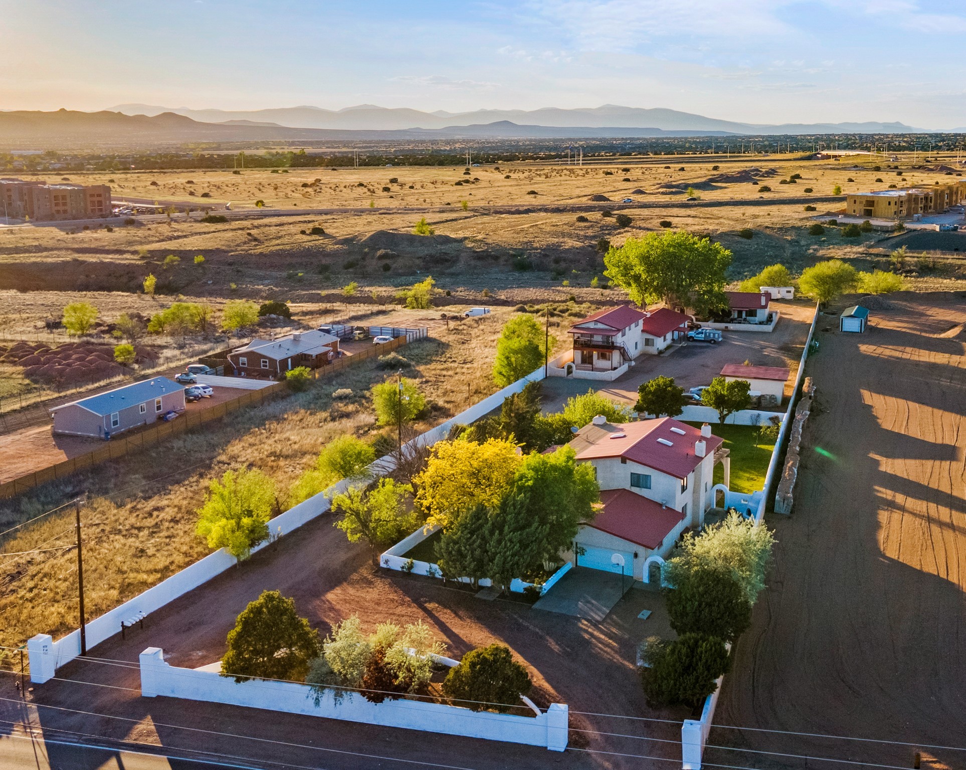Seller Financing Considered. Main home and 5 rental units on a long 1.48 acre lot backing up to the Santa Fe River. NEW CITY SEWER LINE AND AGUA FRIA VILLAGE WATER LINE FOR THE WHOLE PROPERTY JUST INSTALLED, AN OVER $100K IMPROVEMENT. Existing well for watering the landscaping with 4 spickets in various spots. The main home features three levels with four bedrooms, three baths, two living rooms, dining room, finished basement, a two car garage, walled backyard, front yard, side patio, and a large redwood deck off the master bedroom that was just rebuilt. The interior features skylights, beams, tongue and groove ceilings in a herringbone pattern, and custom carved wood staircases. The finished basement contains a huge family room with a kiva fireplace, windows all around, one bedroom with a sitting area and stairwell to access the backyard. The large backyard has lush grass, grape vines, and fruit trees including peach, cherry, green apple, red apple, apricot. Duplex with matching 2 bed 1 bath units with front yard and fireplace. The triplex consists of a 1 bed 1 bath unit with a front yard, a 1 bed 1 bath unit with a balcony, and a 2 bed 1 bath with a two car a garage. On the property there is also a separate detached oversized one car garage. Main house is approximately 3,226 sq ft. Units in the duplex are approximately 987 sq ft each. The triplex has two 936 sq ft units and one 1,033 sq ft unit. All square footages are according to an appraisal done in 1996, buyer to verify. This property has character, large square footage, and high-income producing potential!