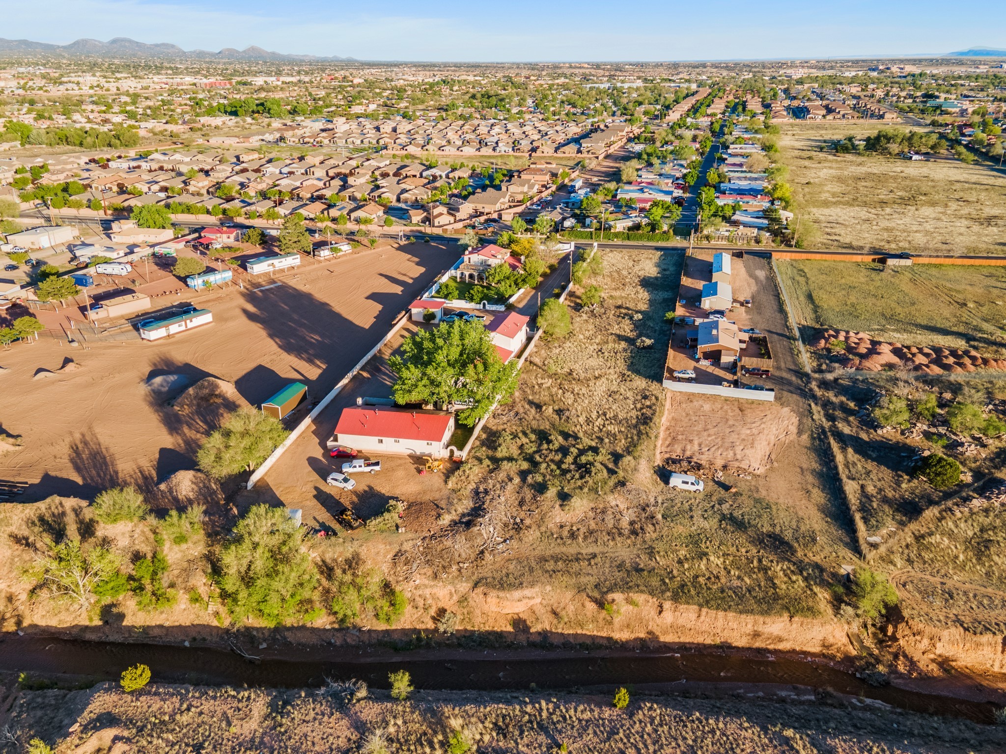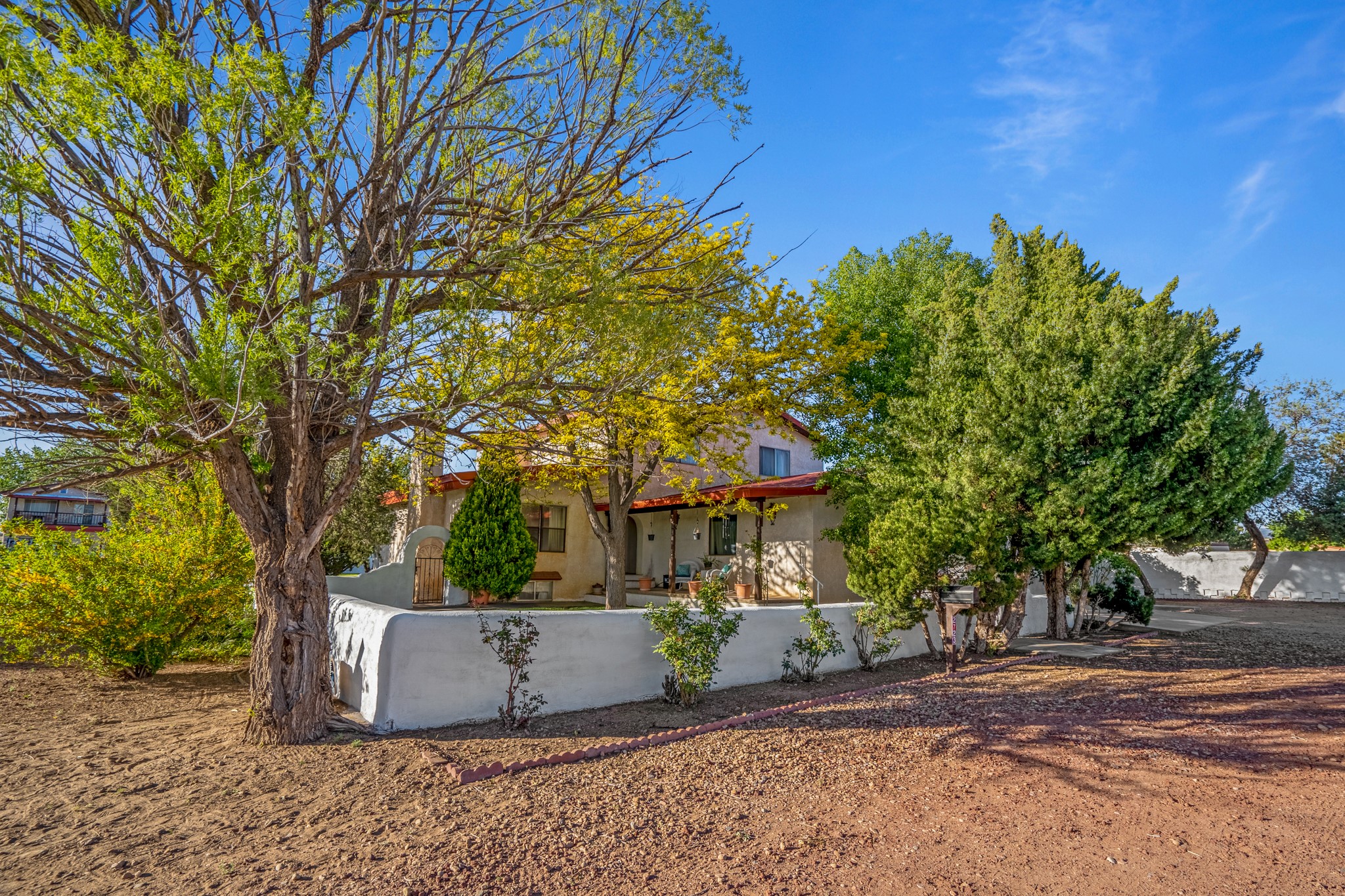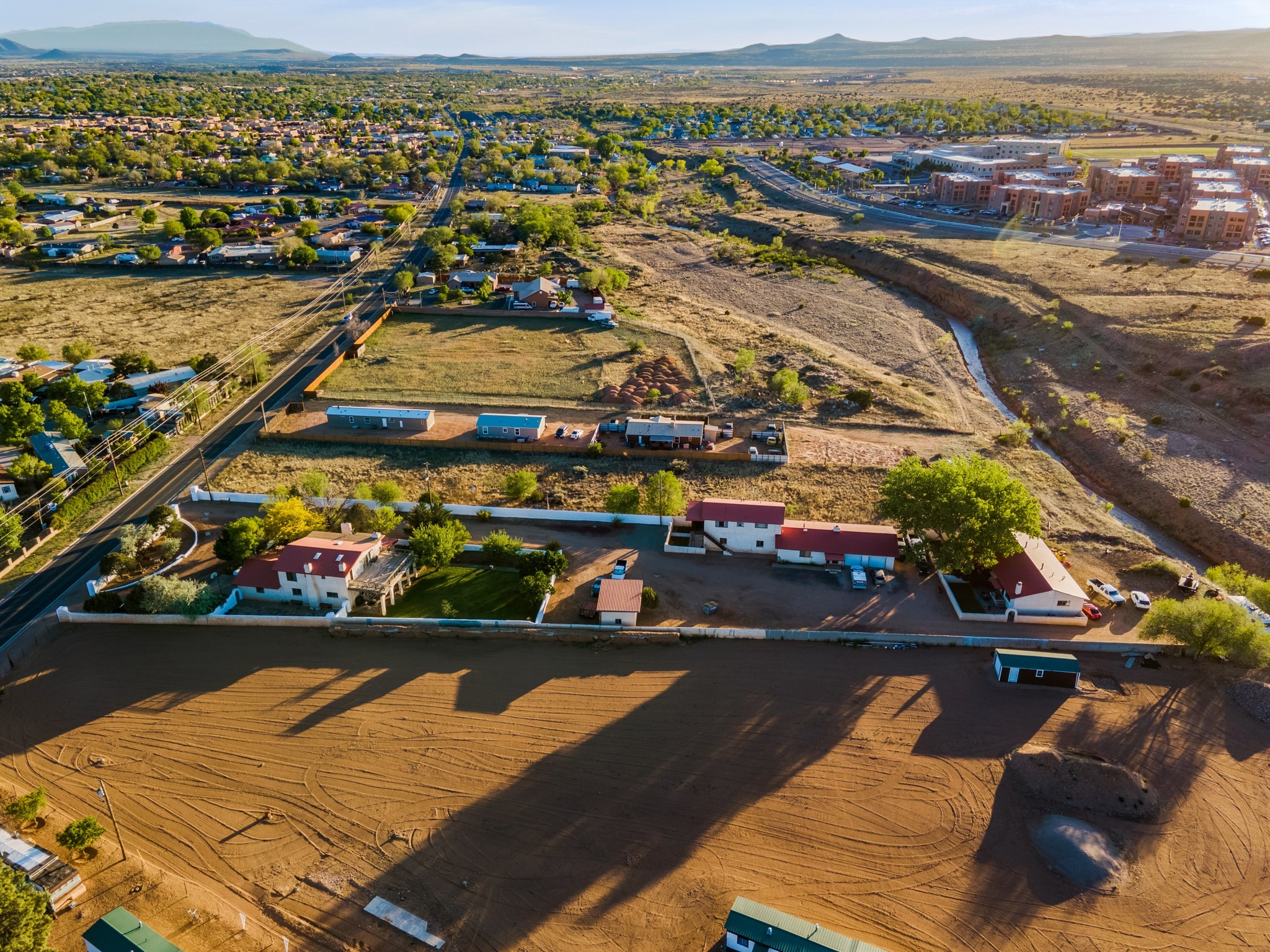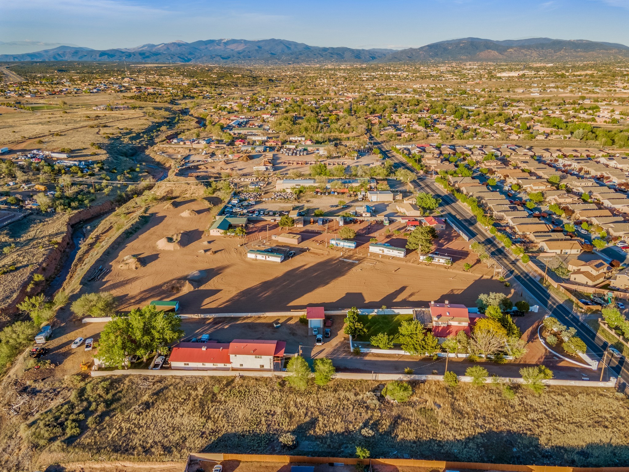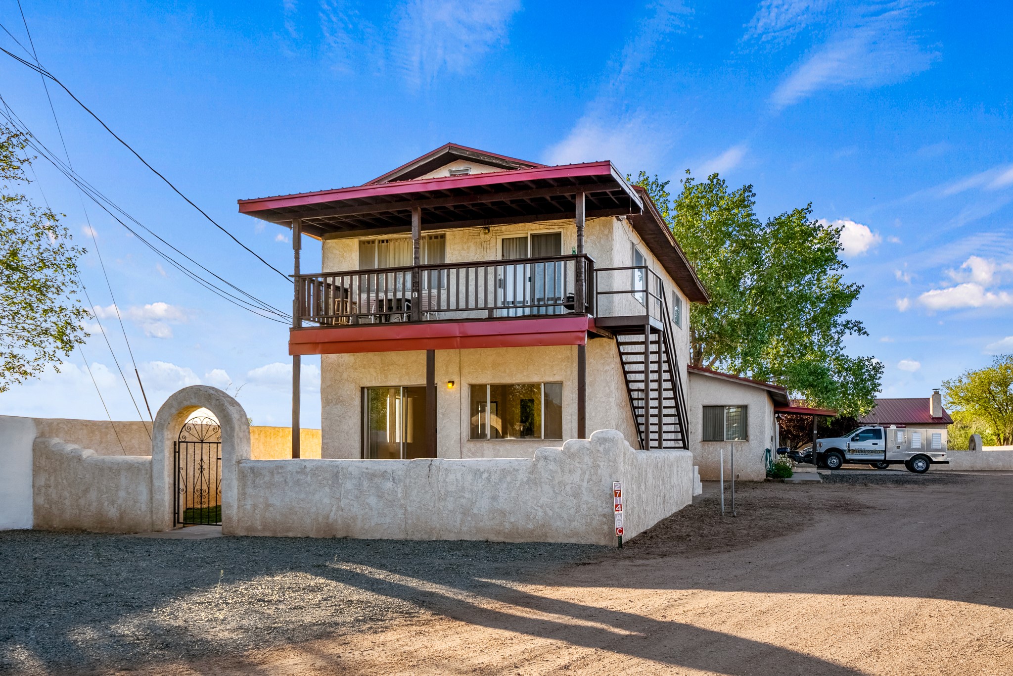 Seller Financing Considered. Main home and 5 rental units on a long 1.48 acre lot backing up to the Santa Fe River. NEW CITY SEWER LINE AND AGUA FRIA VILLAGE WATER LINE FOR THE WHOLE PROPERTY JUST INSTALLED, AN OVER $100K IMPROVEMENT. Existing well for watering the landscaping with 4 spickets in various spots. The main home features three levels with four bedrooms, three baths, two living rooms, dining room, finished basement, a two car garage, walled backyard, front yard, side patio, and a large redwood deck off the master bedroom that was just rebuilt. The interior features skylights, beams, tongue and groove ceilings in a herringbone pattern, and custom carved wood staircases. The finished basement contains a huge family room with a kiva fireplace, windows all around, one bedroom with a sitting area and stairwell to access the backyard. The large backyard has lush grass, grape vines, and fruit trees including peach, cherry, green apple, red apple, apricot. Duplex with matching 2 bed 1 bath units with front yard and fireplace. The triplex consists of a 1 bed 1 bath unit with a front yard, a 1 bed 1 bath unit with a balcony, and a 2 bed 1 bath with a two car a garage. On the property there is also a separate detached oversized one car garage. Main house is approximately 3,226 sq ft. Units in the duplex are approximately 987 sq ft each. The triplex has two 936 sq ft units and one 1,033 sq ft unit. All square footages are according to an appraisal done in 1996, buyer to verify. This property has character, large square footage, and high-income producing potential!