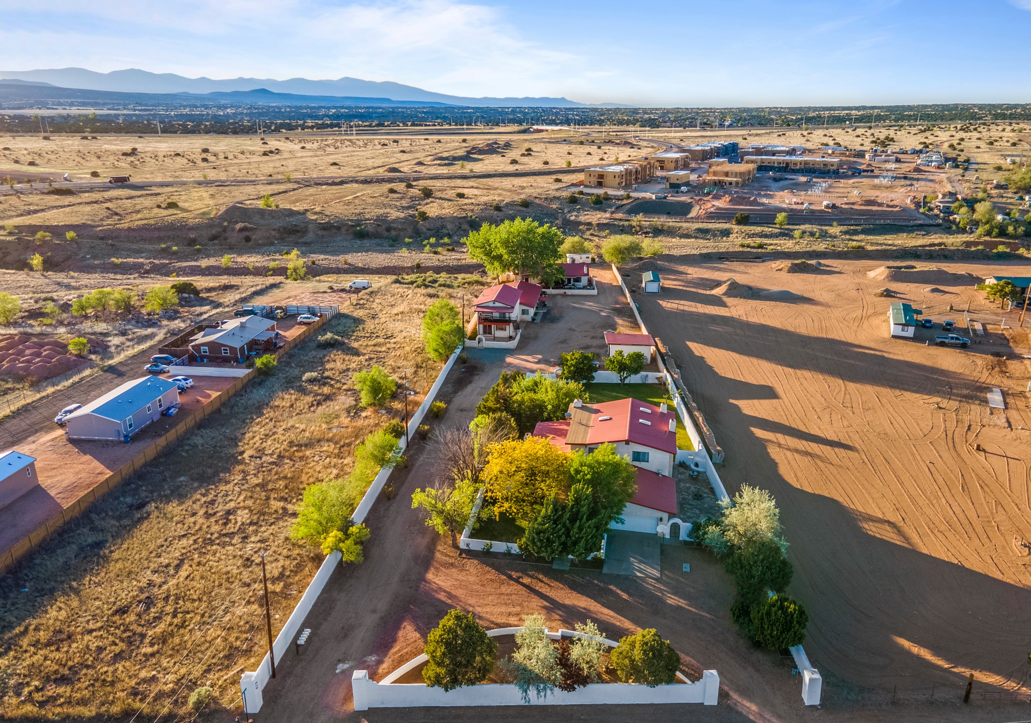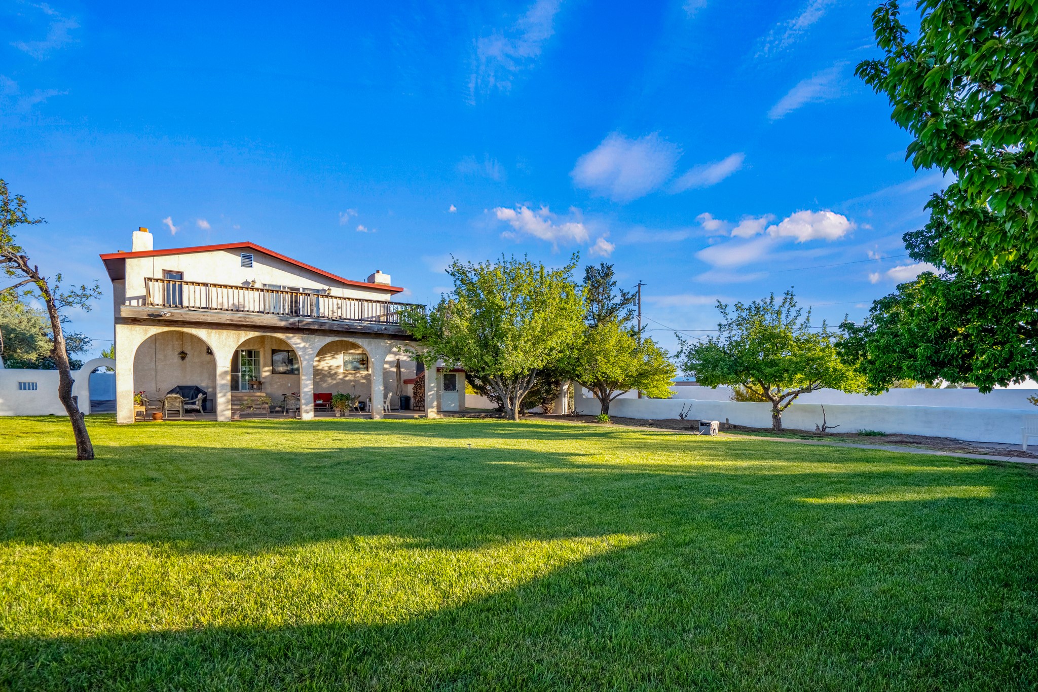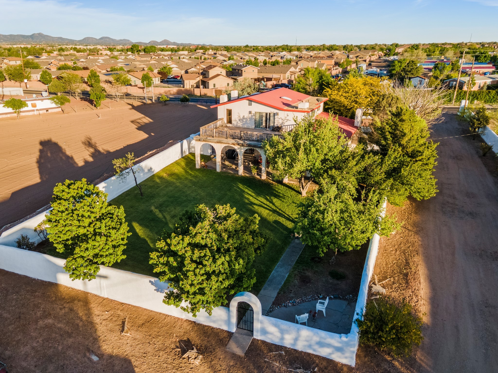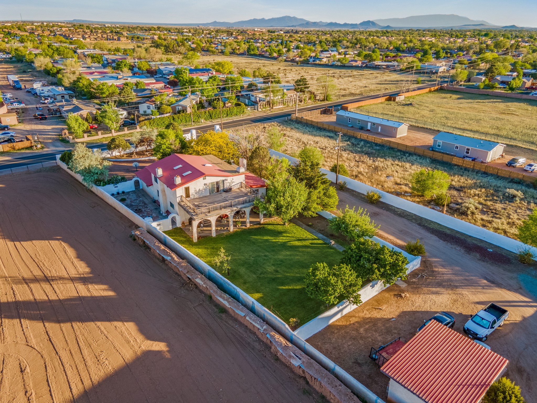 Seller Financing Considered. Main home and 5 rental units on a long 1.48 acre lot backing up to the Santa Fe River. NEW CITY SEWER LINE AND AGUA FRIA VILLAGE WATER LINE FOR THE WHOLE PROPERTY JUST INSTALLED, AN OVER $100K IMPROVEMENT. Existing well for watering the landscaping with 4 spickets in various spots. The main home features three levels with four bedrooms, three baths, two living rooms, dining room, finished basement, a two car garage, walled backyard, front yard, side patio, and a large redwood deck off the master bedroom that was just rebuilt. The interior features skylights, beams, tongue and groove ceilings in a herringbone pattern, and custom carved wood staircases. The finished basement contains a huge family room with a kiva fireplace, windows all around, one bedroom with a sitting area and stairwell to access the backyard. The large backyard has lush grass, grape vines, and fruit trees including peach, cherry, green apple, red apple, apricot. Duplex with matching 2 bed 1 bath units with front yard and fireplace. The triplex consists of a 1 bed 1 bath unit with a front yard, a 1 bed 1 bath unit with a balcony, and a 2 bed 1 bath with a two car a garage. On the property there is also a separate detached oversized one car garage. Main house is approximately 3,226 sq ft. Units in the duplex are approximately 987 sq ft each. The triplex has two 936 sq ft units and one 1,033 sq ft unit. All square footages are according to an appraisal done in 1996, buyer to verify. This property has character, large square footage, and high-income producing potential!