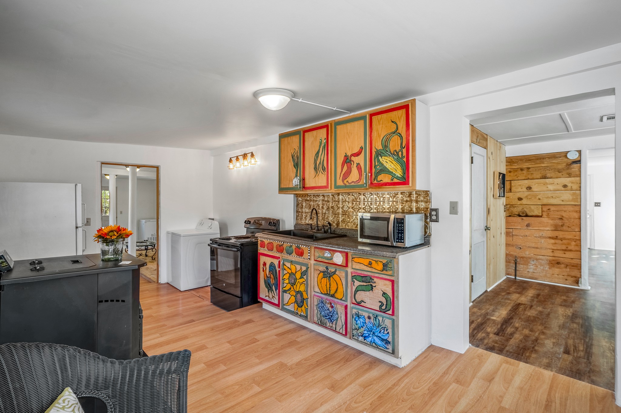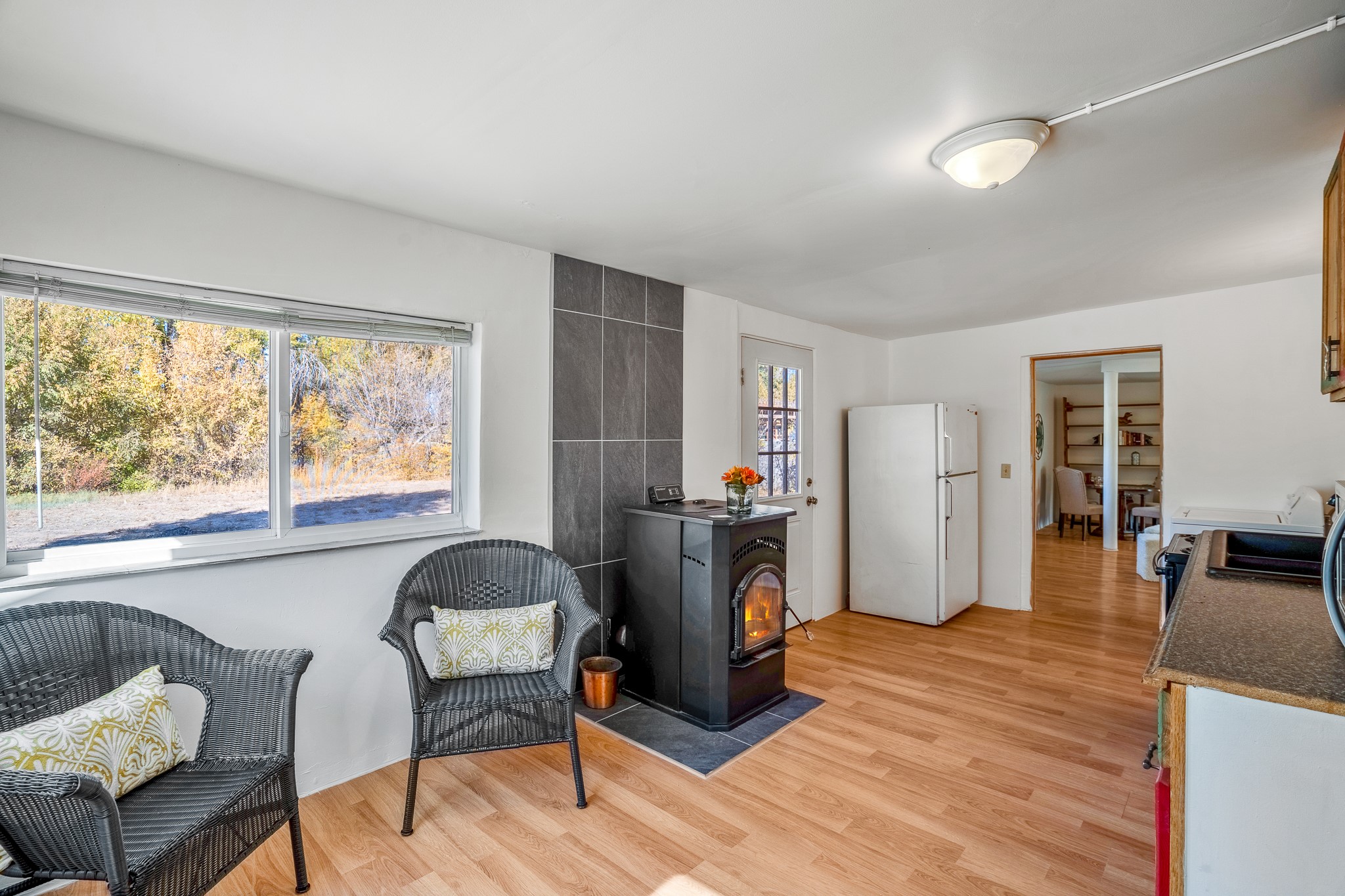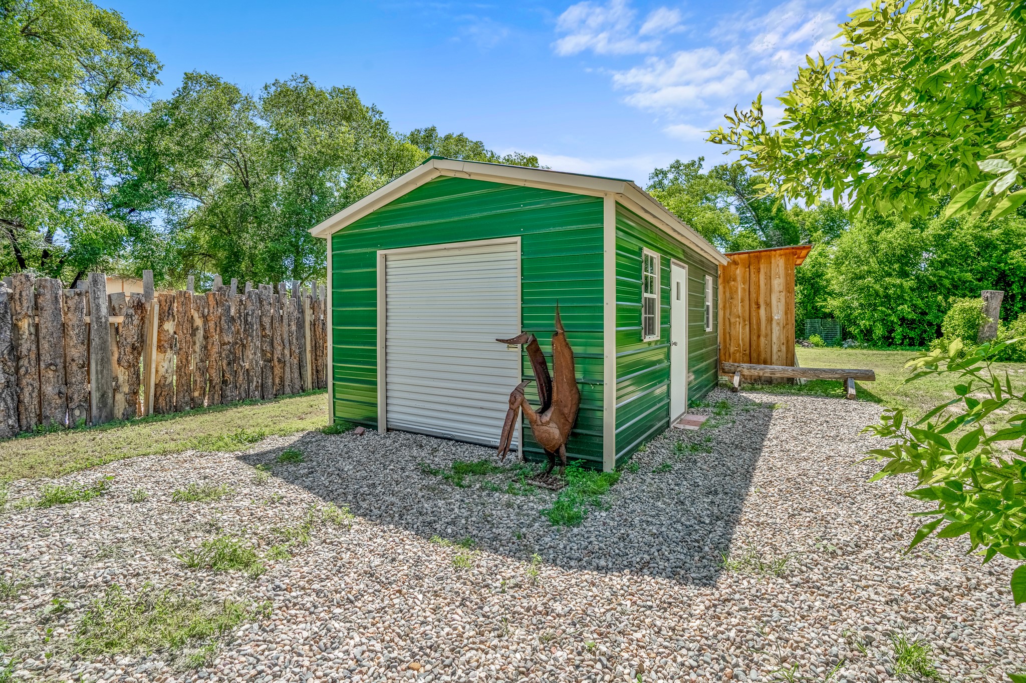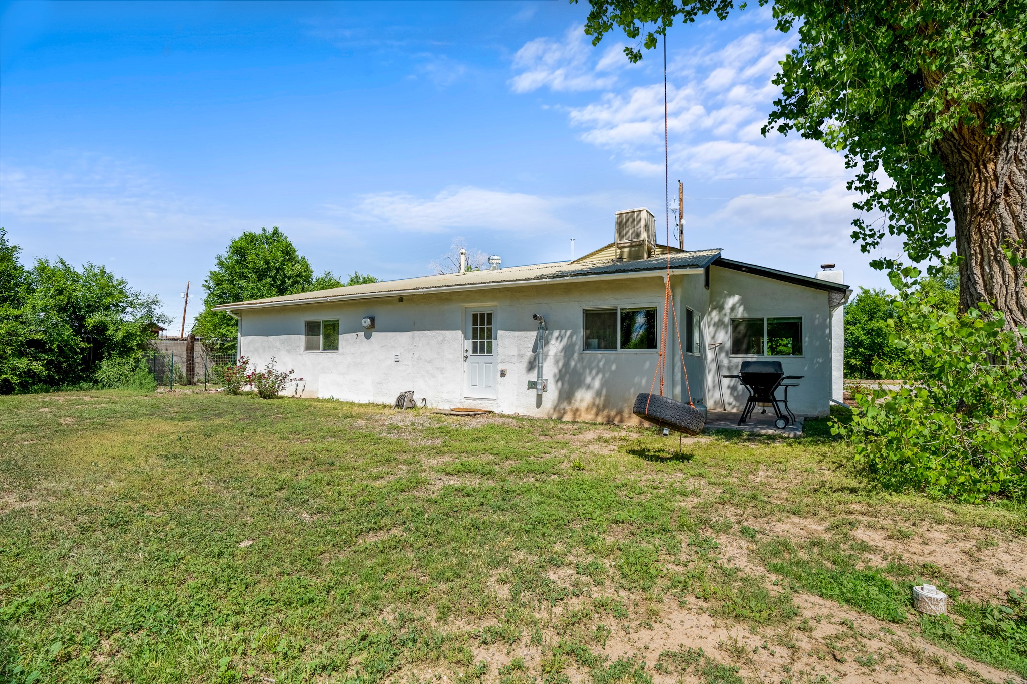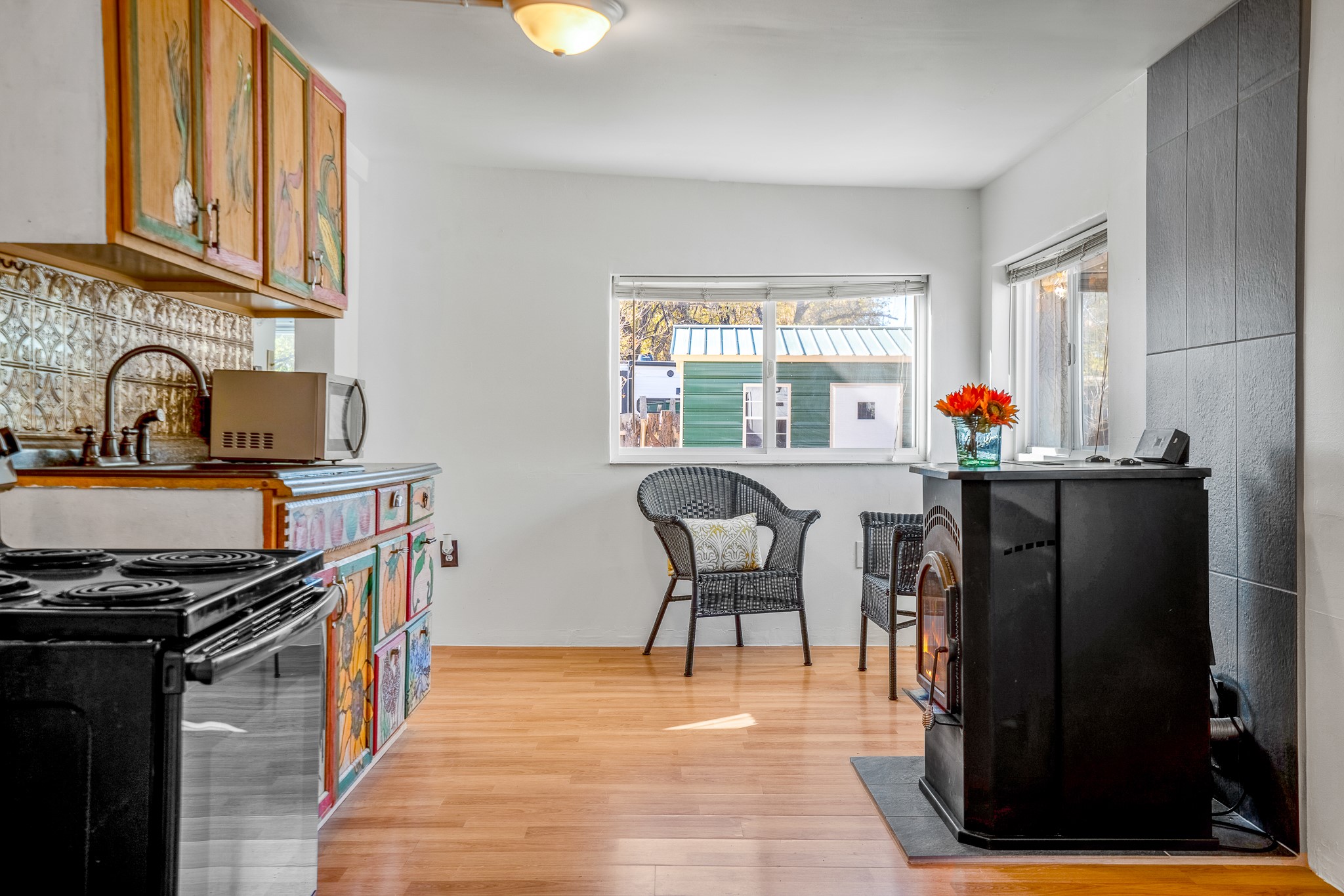 Price Reduction and Move-in ready, WOW! Mature trees surround the sweet home for privacy. With over 1700+/- square feet, three bedrooms, two baths, plenty of storage, a woodburning fireplace, and a pellet stove, this home is move-in ready, with public utilities, acequia water rights, and plenty of room for gardening and outdoor enjoyment. This is genuinely a lovely lot. The backyard backs to Hacienda Home Improvement Center, and bob-wire fencing between the two properties is a plus for security. The home needs some updating. The heating source is the pellet stove in the kitchen. This home's location is very desirable. The time to buy is now! Schedule a showing today. The home is being sold "as is."
